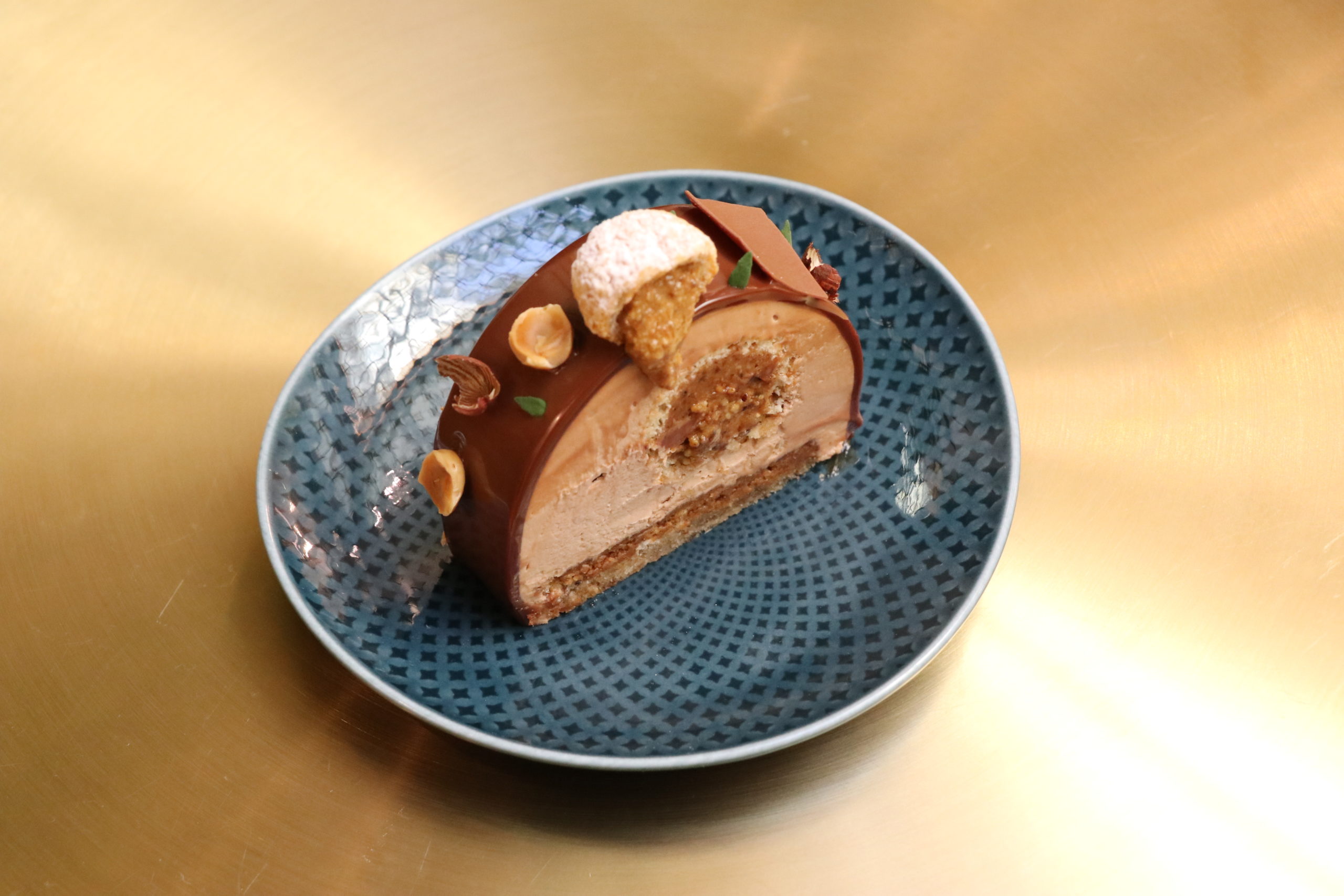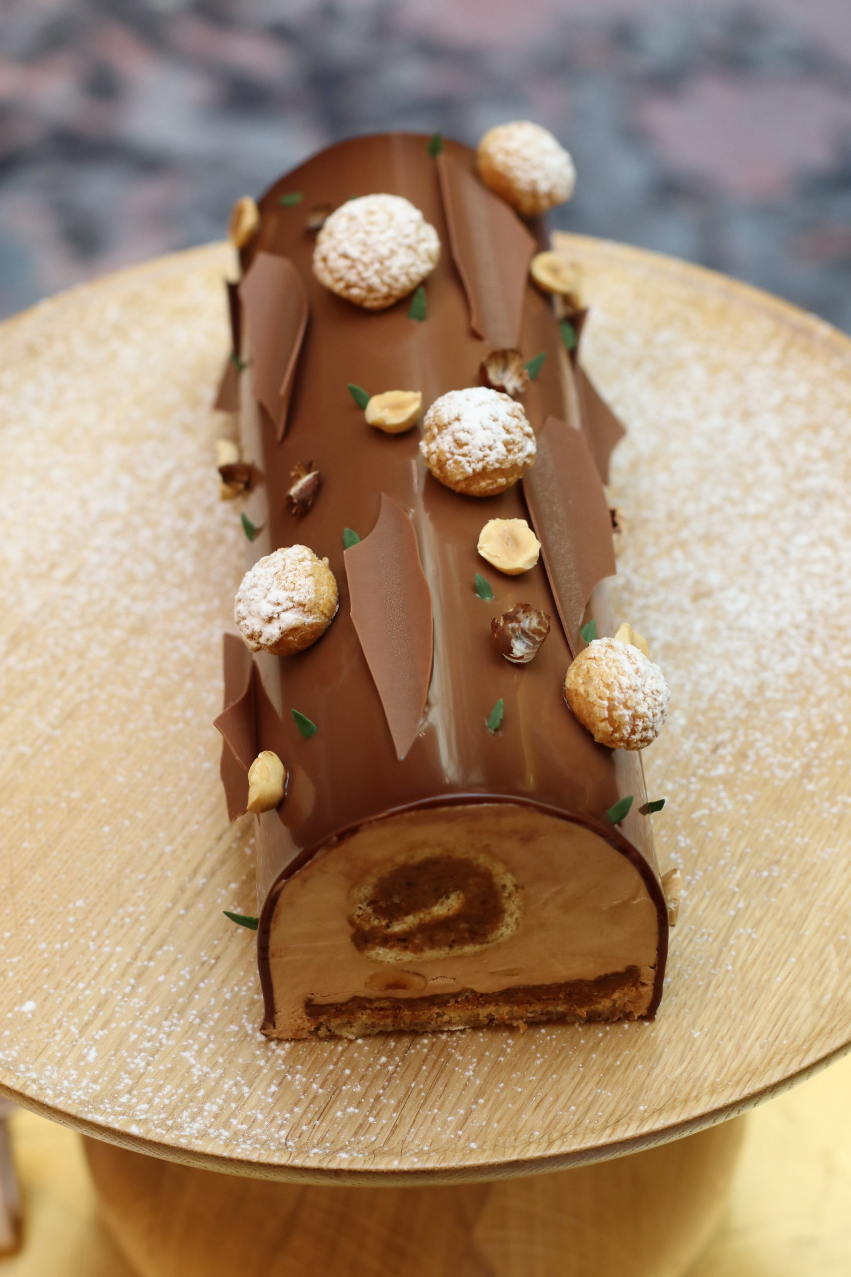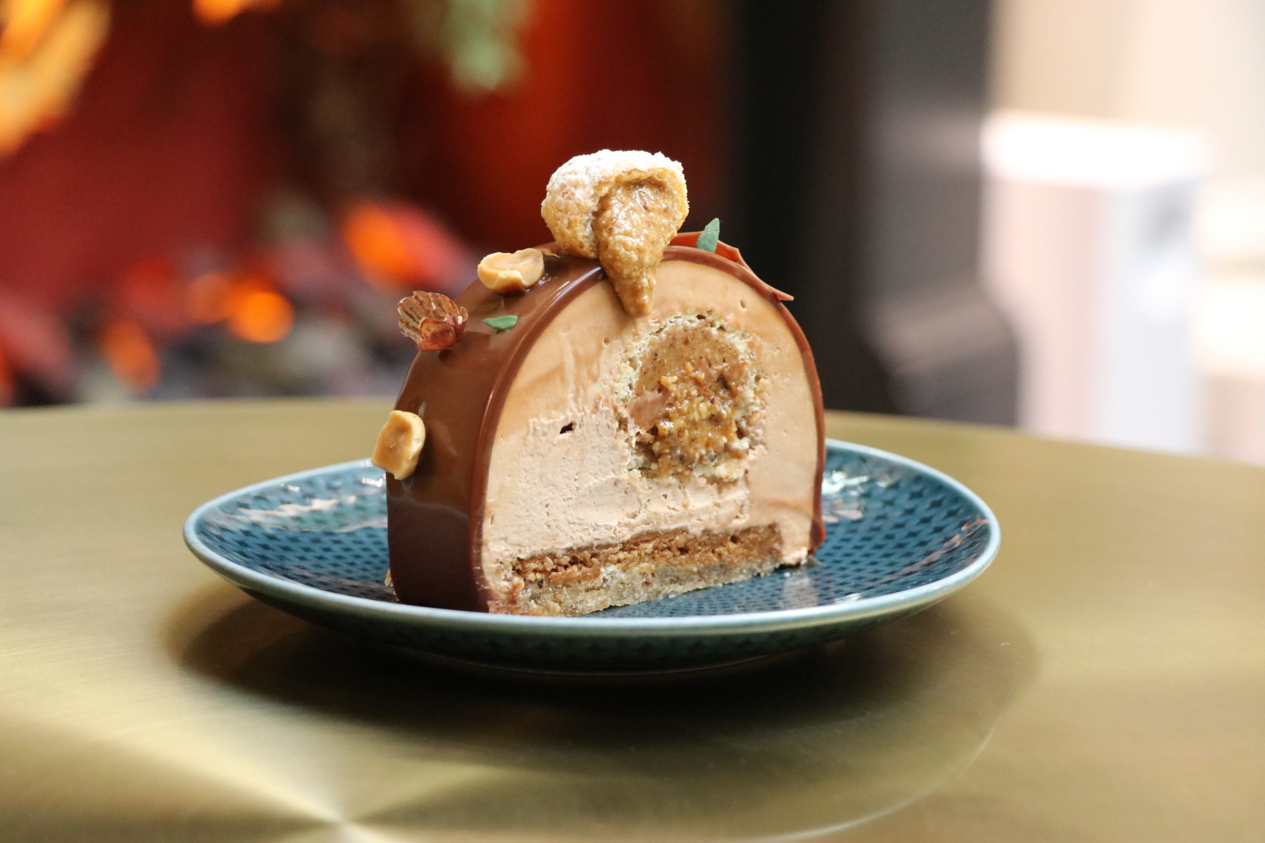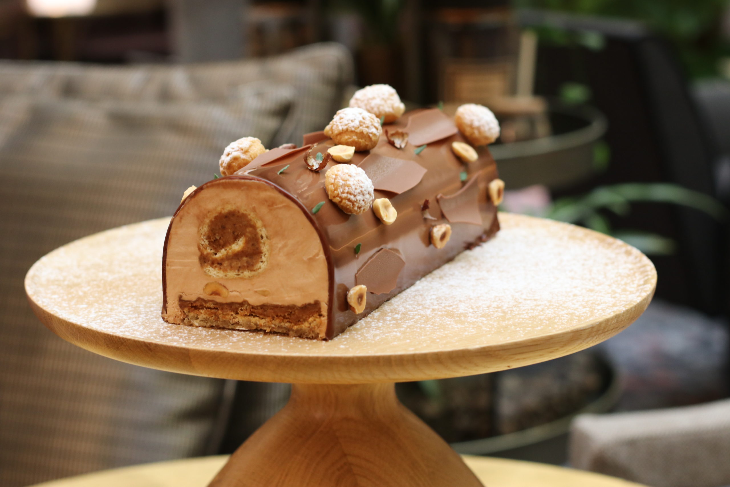 Composé d’un biscuit moelleux noisette au miel de Châtaignier, d’un croustillant noisette, d’un biscuit roulé aux praliné thym-citron, d’une mousse au chocolat lait onctueuse ainsi que d’un glaçage Gianduja, le dessert emblématique est inspiré de la saison hivernale.