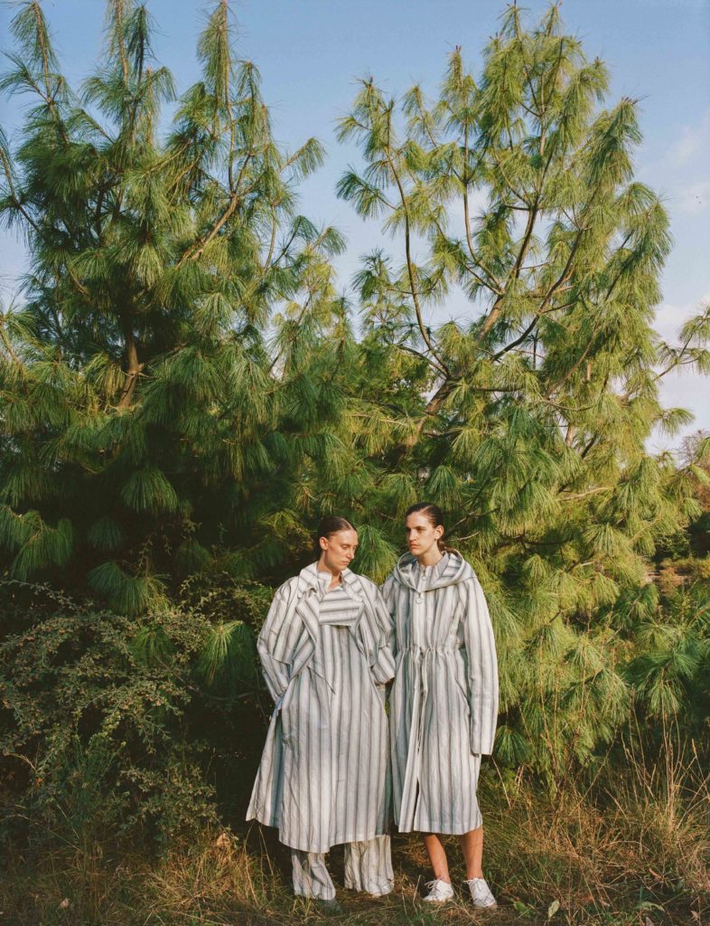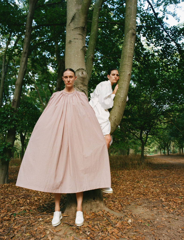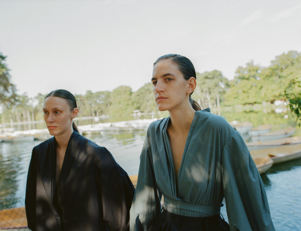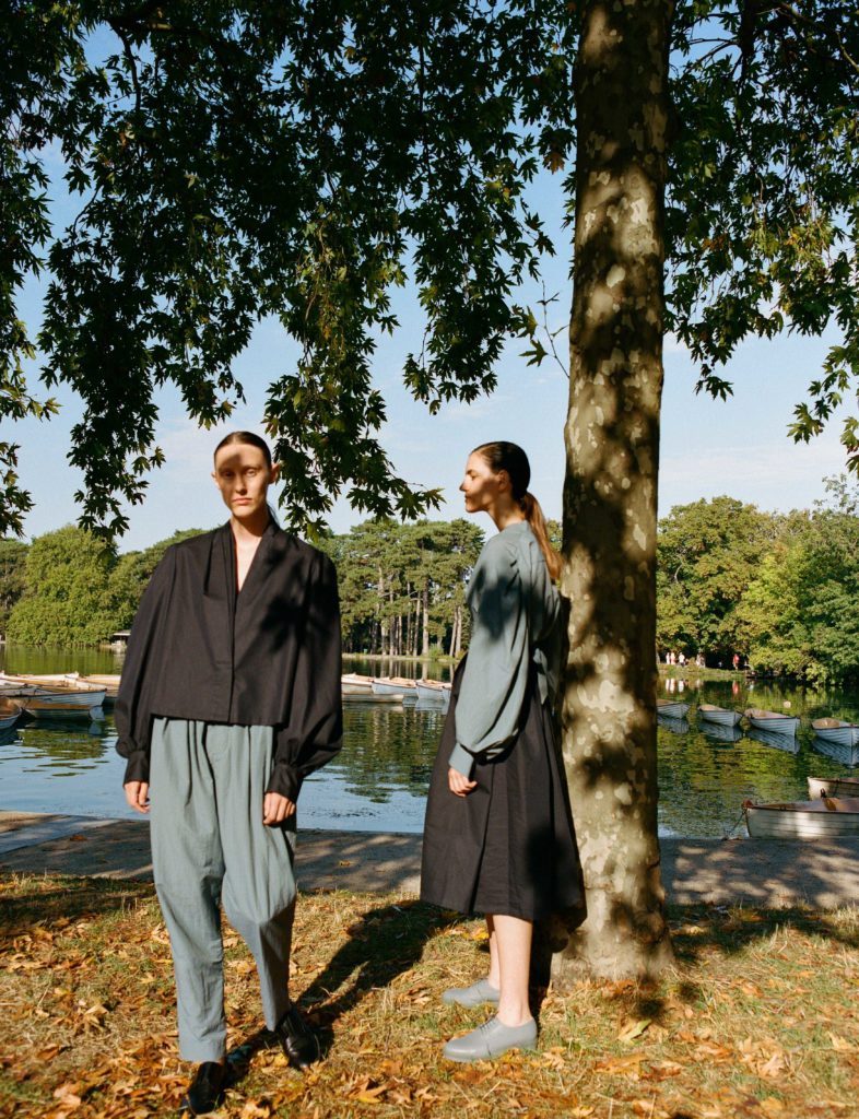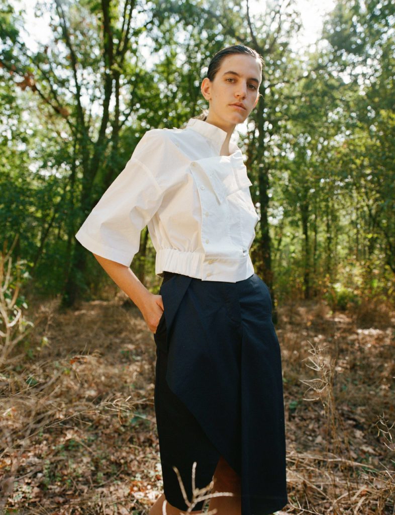 Les formes sont modernes, construites et minimalistes, et comme toujours chez DAWEI tout est dans les détails. La robe-chemise en popeline de coton blanc très pure et sobre a des manches bouffantes qui lui donnent un air plus extravagant. Sur une chemise d’inspiration vintage, l’encolure drapée se transforme en plis géométriques pour un style plus actuel. Les silhouettes sont libres. Des détails d’inspiration militaires se lisent entre les lignes de vêtements à l’allure sage qu’un savant déboutonnage vient bousculer. Des robes aériennes se laissent porter par la brise du renouveau.
