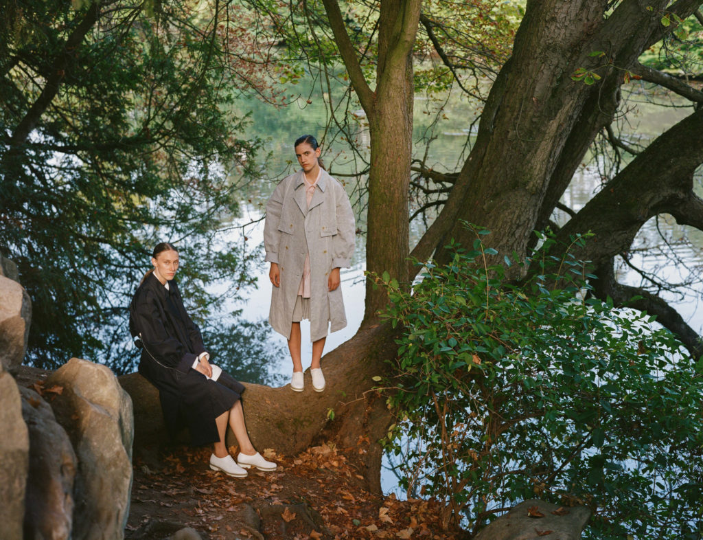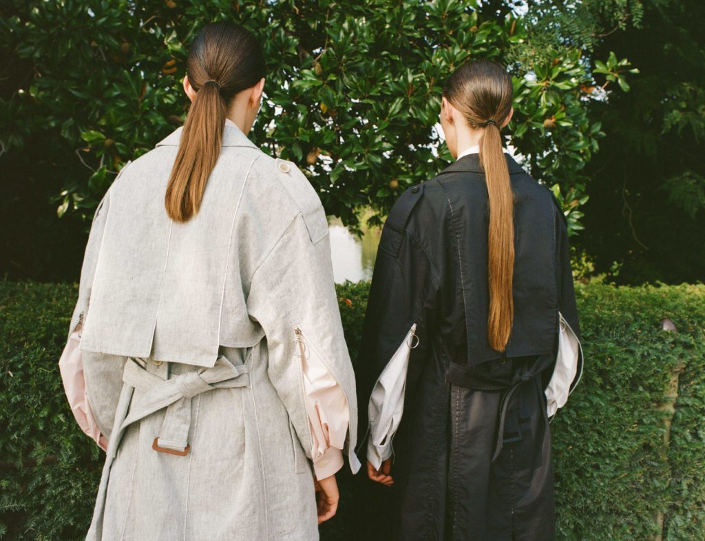 Trench-coat, tailleurs vestes/pantalon, robes, la redécouverte d’un vestiaire « de tous les jours » twisté par des volants asymétriques, changent subtilement la donne. Contraste.