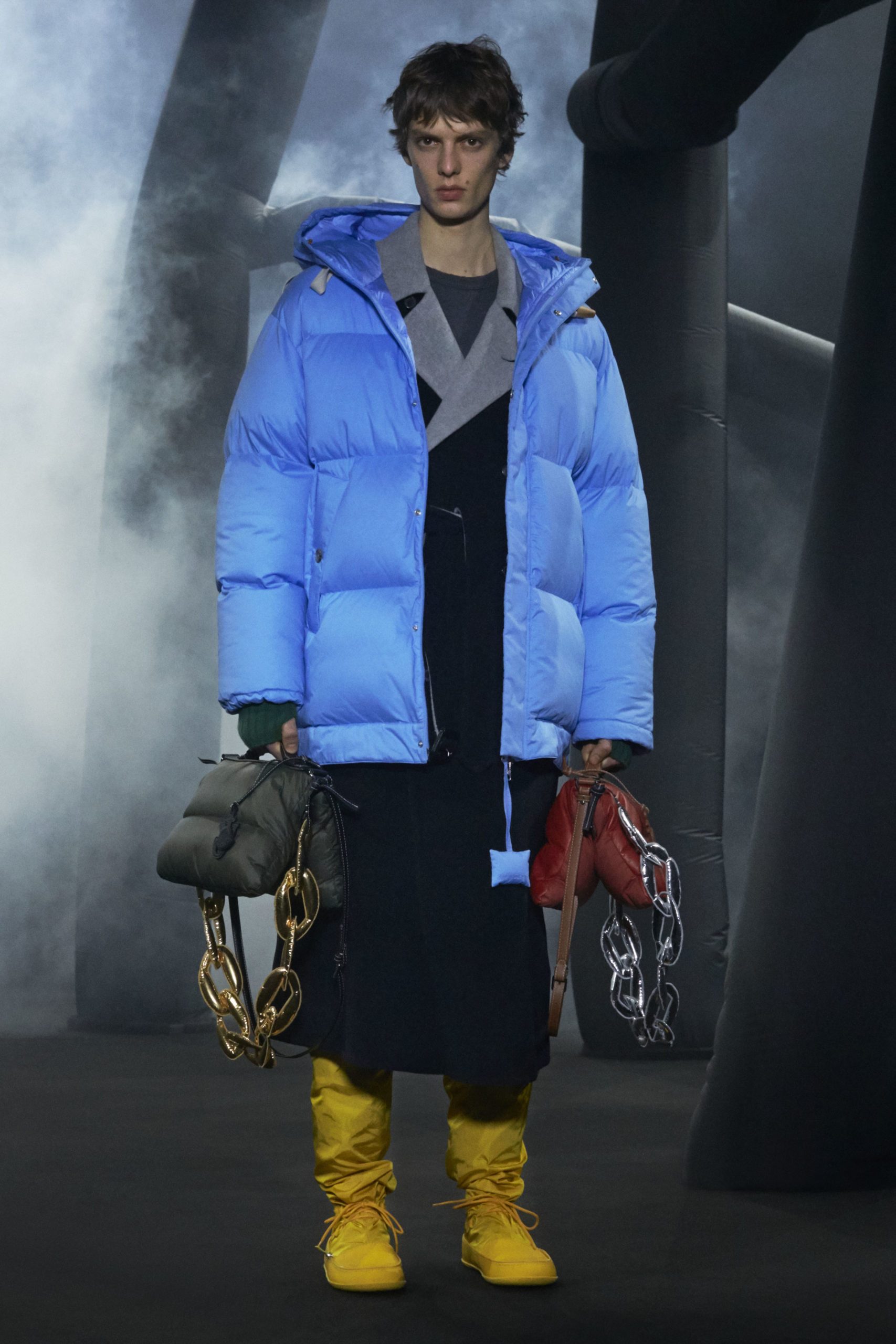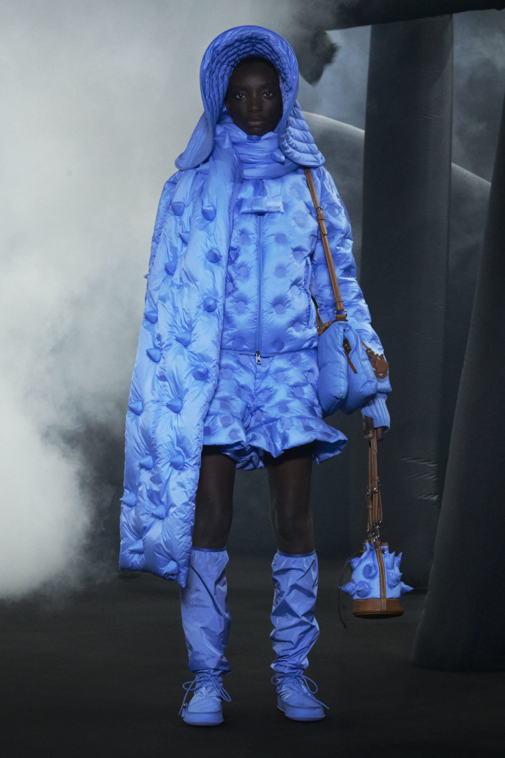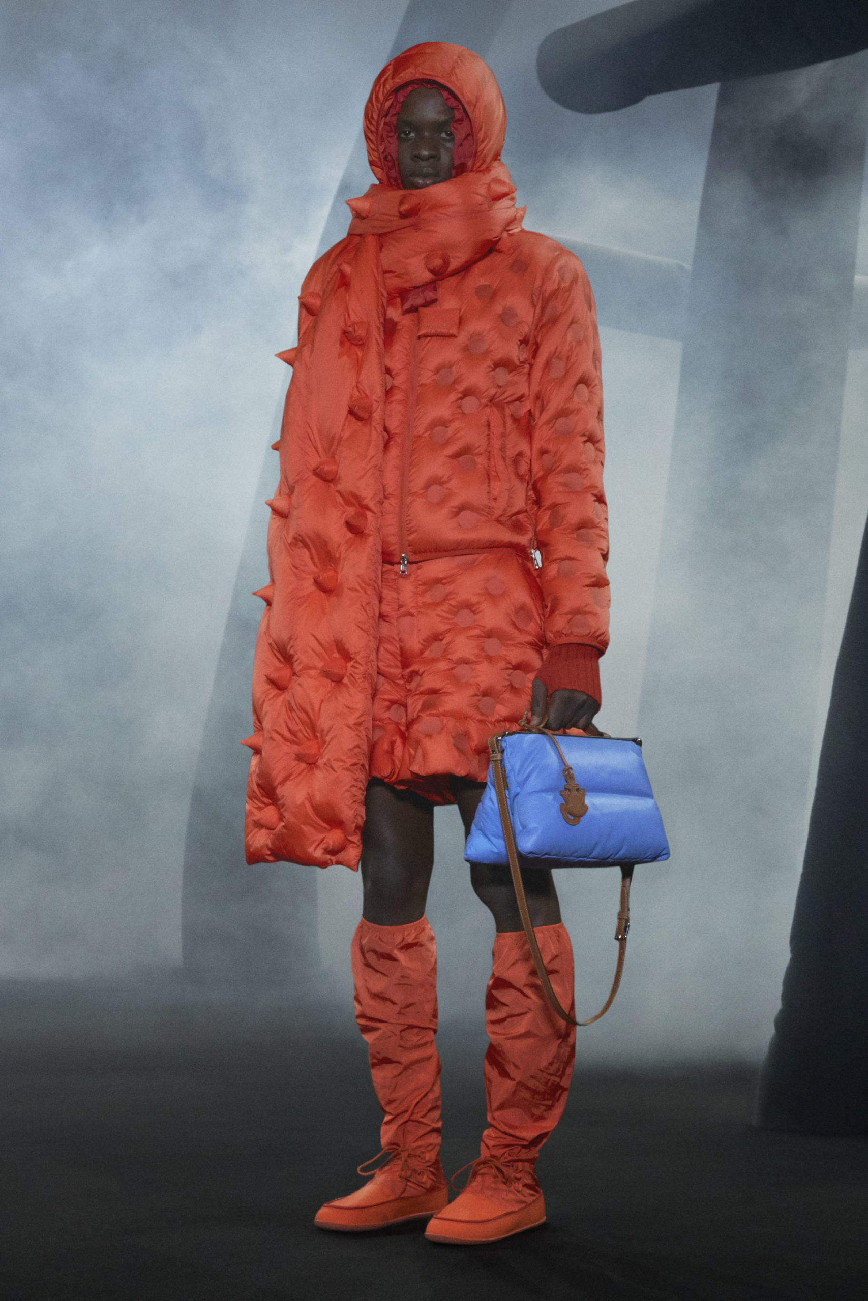 Pour Moncler Genius, Anderson propose une sélection de ses pièces les plus iconiques, reprenant des pièces issues des archives de sa maison, JW Anderson – comme le chapeau Riviera ou le short à volants – Les réinterprétant avec la technique du duvet pour créer une nouvelle approche de ces formes connues. Tout est destiné à être porté indifféremment par les hommes et les femmes : la collection a un esprit extrêmement ludique. Les blousons avec zip rembourré, les écharpes volumineuses rembourrées, les chapeaux à larges bords et les shorts forment les éléments de base pour créer des looks axés sur la couleur et les formes, les motifs sculpturaux tels que les pois en relief et les pointes saillantes ajoutent encore à la tridimensionnalité.