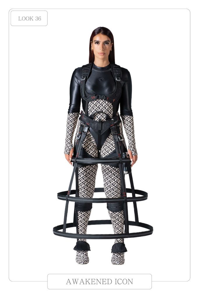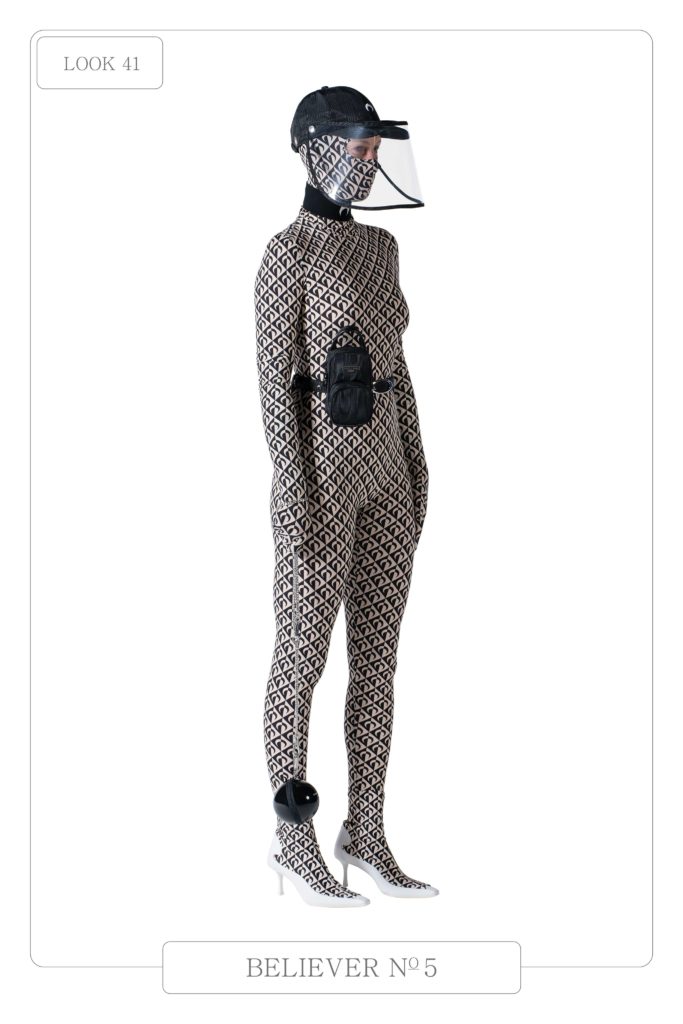 The palette shifts through optical knitwear in kaleidoscopic sapphire and cobalt blues. Sinuous forms are influenced by the organic world, with MARINE SERRE’s classic regenerated denim updated through a laser engraving of the ‘moonfish skin’ pattern, which also appears in recycled jersey fabrics, creating a utopian augmented body. Follows a series of Red Line futuristic pieces, such as shield visor made of regenerated carpets, and the survival harness crinoline that consciously delimits the body space.