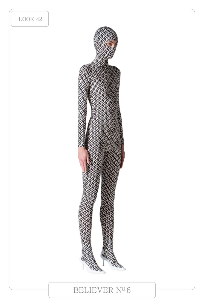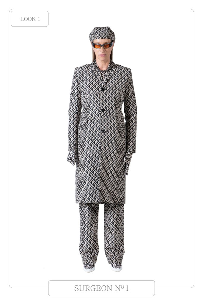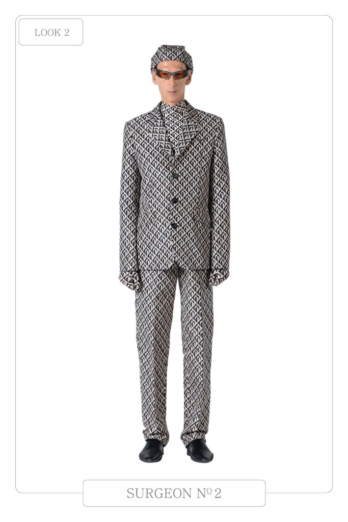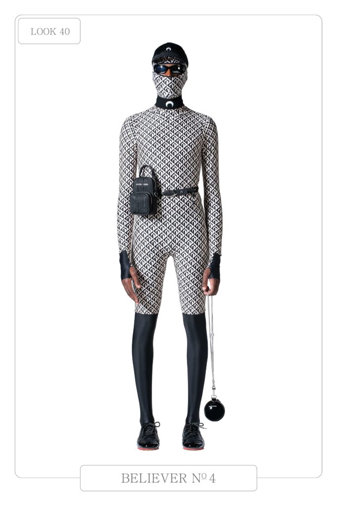 This collection presents MARINE SERRE’s sharp tailoring, boldly announced through a duo-colored ‘moon lozenge’ jacquard weave. Alongside the separates-based suiting range, biodegradable nylon and recycled moire serves as the base for hyper-functional, multi-pocketed utilitarian garments and iconic accessories in a mono- chrome palette. Intimate silhouettes are made of regenerated carpets in terracotta hues. Repurposed tailoring fabrics are granted a contemporary second life through sleek menswear pieces, while fiery red and jet-black athletic garments offer a wardrobe that enables free movement.