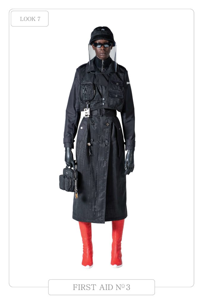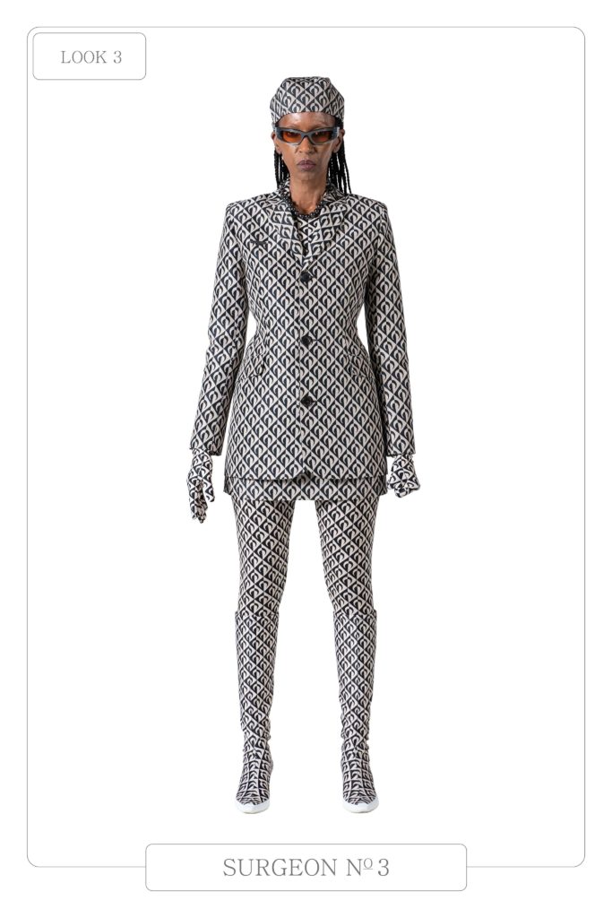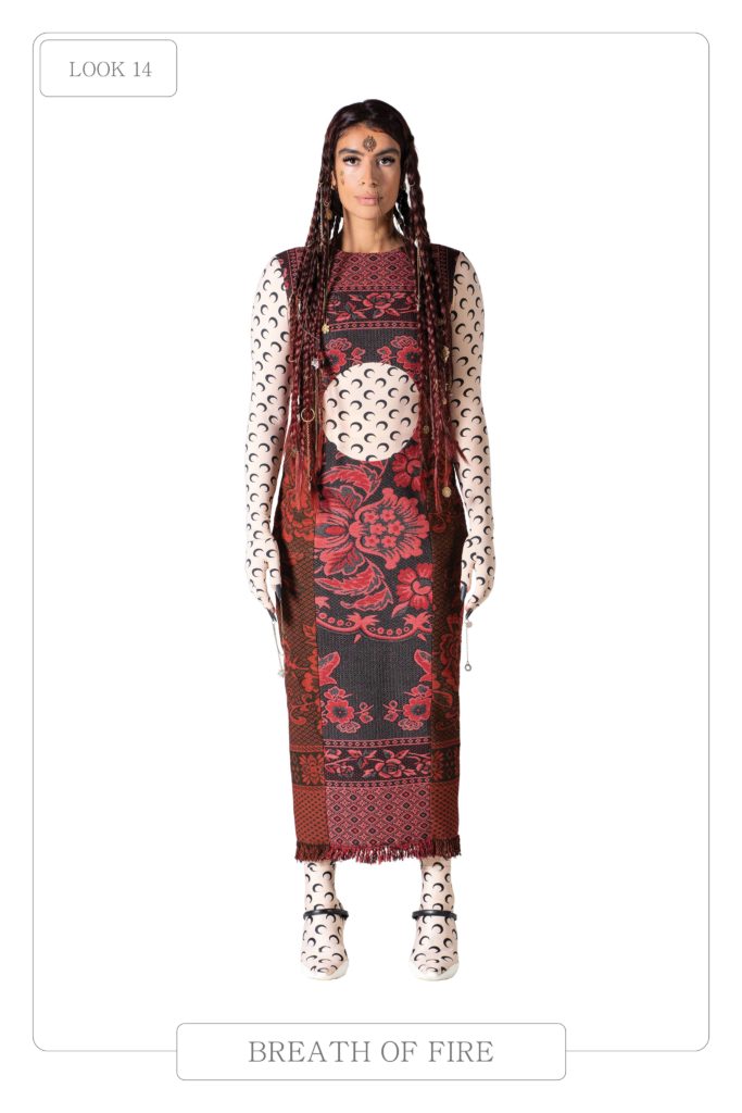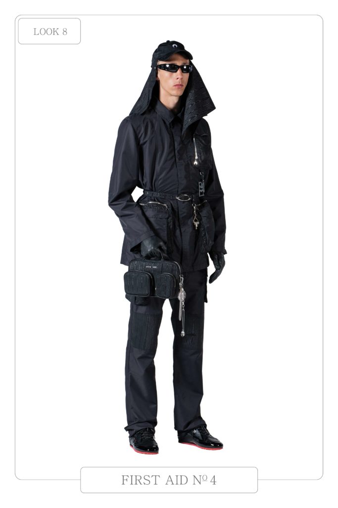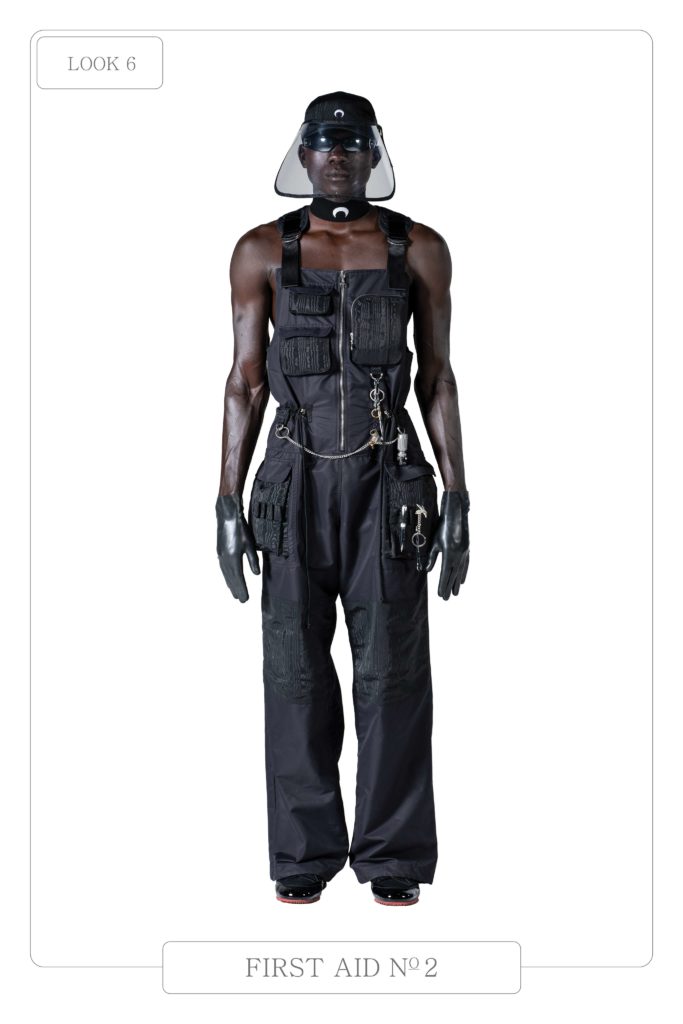 This collection presents MARINE SERRE’s sharp tailoring, boldly announced through a duo-colored ‘moon lozenge’ jacquard weave. Alongside the separates-based suiting range, biodegradable nylon and recycled moire serves as the base for hyper-functional, multi-pocketed utilitarian garments and iconic accessories in a mono- chrome palette. Intimate silhouettes are made of regenerated carpets in terracotta hues. Repurposed tailoring fabrics are granted a contemporary second life through sleek menswear pieces, while fiery red and jet-black athletic garments offer a wardrobe that enables free movement.