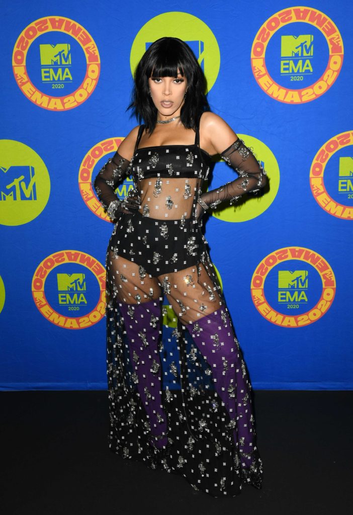 The House of Givenchy is pleased to announce singer Doja Cat wore a Givenchy Spring Summer 2021 outfit, designed by Matthew M. Williams, to the MTV Europe Music Awards 2020 held on November 8th, 2020 in Los Angeles, California. Black long tule 4G embroidered slip A-line dress with crystals embroidery and matching gloves worn with purple viscose long socks and black leather chain pumps with silver studs