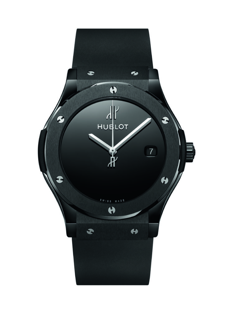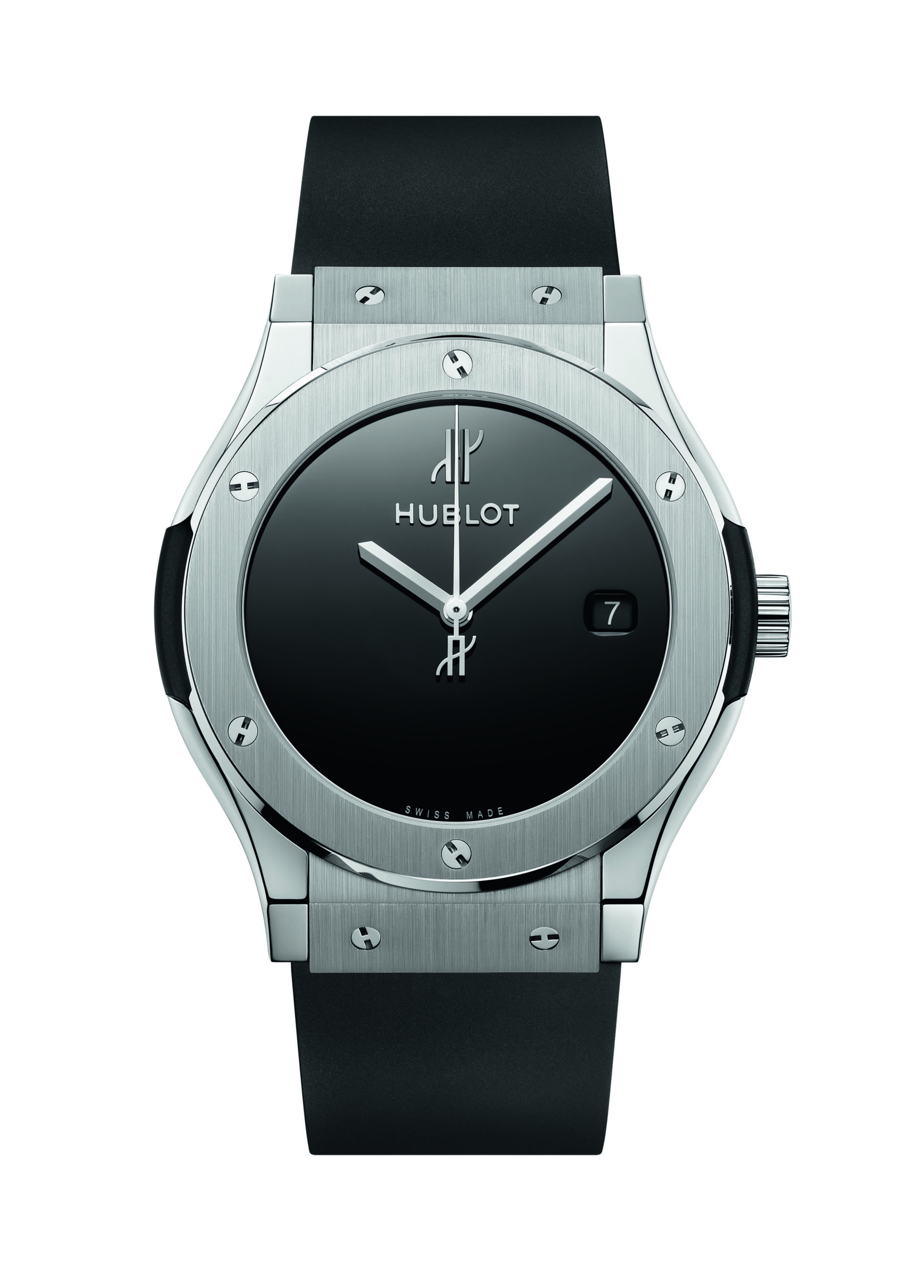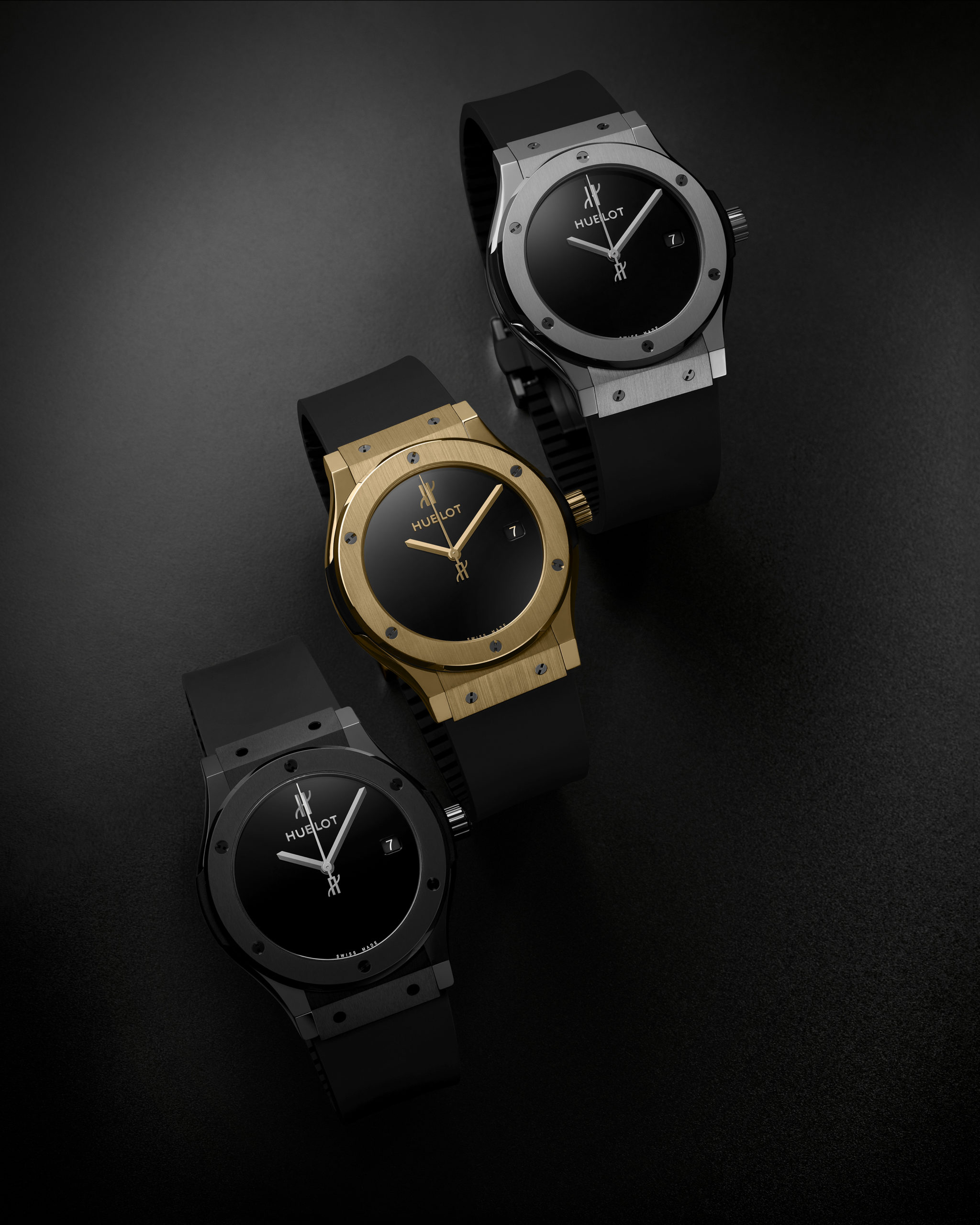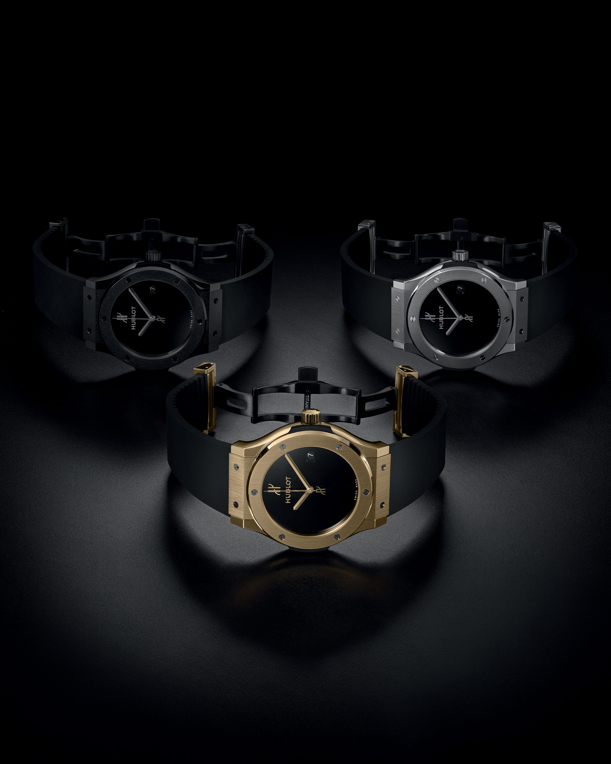 Les nouvelles Classic Fusion expriment l’élégance, le raffinement intemporels de la 1980 Classic Original et la modernité de quarante ans d’exploration et d’innovation sans cesse renouvelées. Le cadran noir laqué poli affiche une ultra sobriété distraite uniquement par la présence des aiguilles facettées, du logo H et Hublot en applique. Le boîtier de 45 mm façonné en or jaune, titane ou céramique noire est traversé par les fameuses vis sur la lunette et dotés d’un fond glace saphir, le tout porté sur l’immuable bracelet en caoutchouc aisément ajustable au poignet et offrant un porté agréable grâce au fermoir triple déployant. Ces détails devenus signature actualisent la première montre Hublot et laissent penser que ces garde-temps traverseront le temps avec autant de caractère.