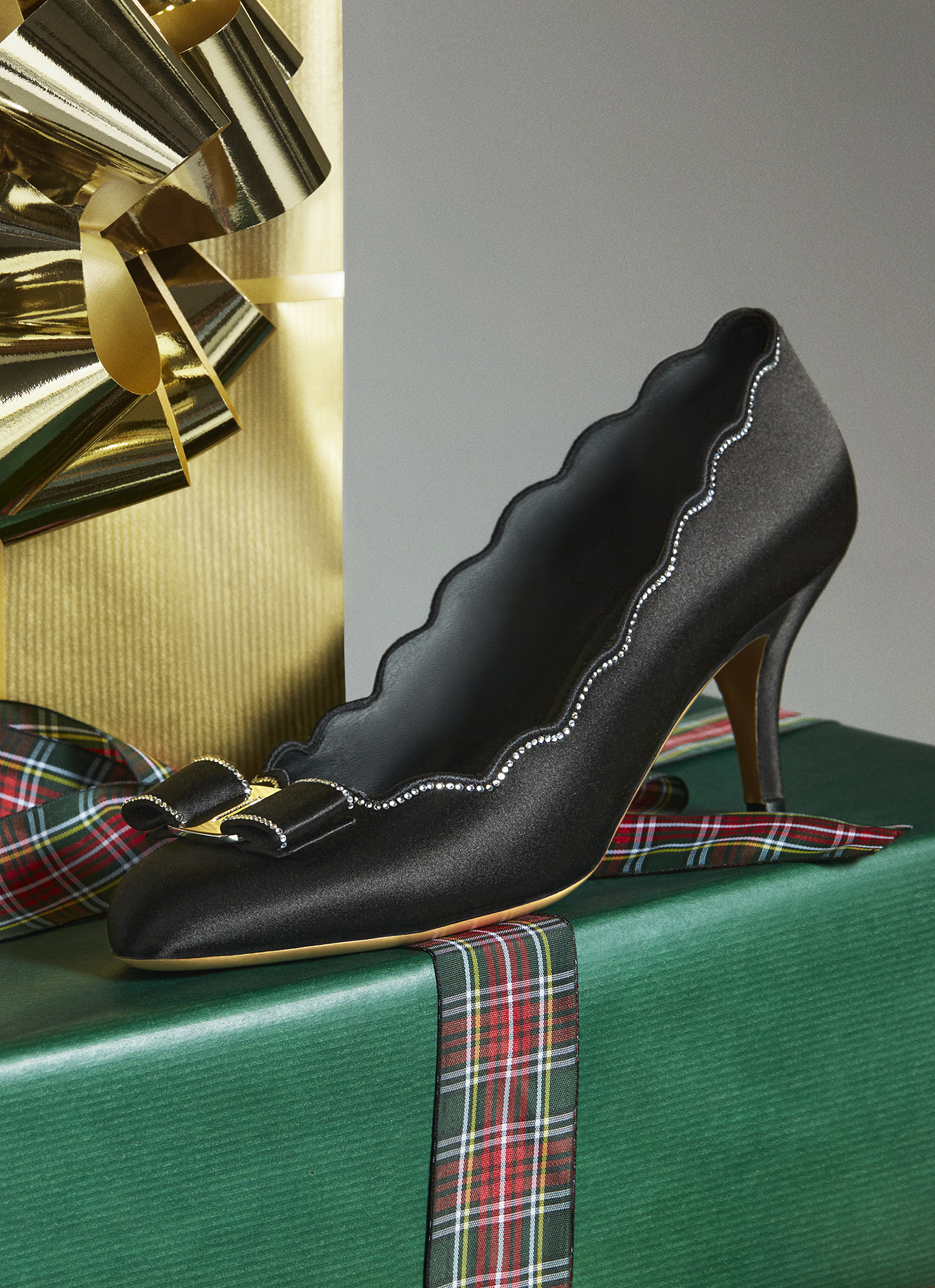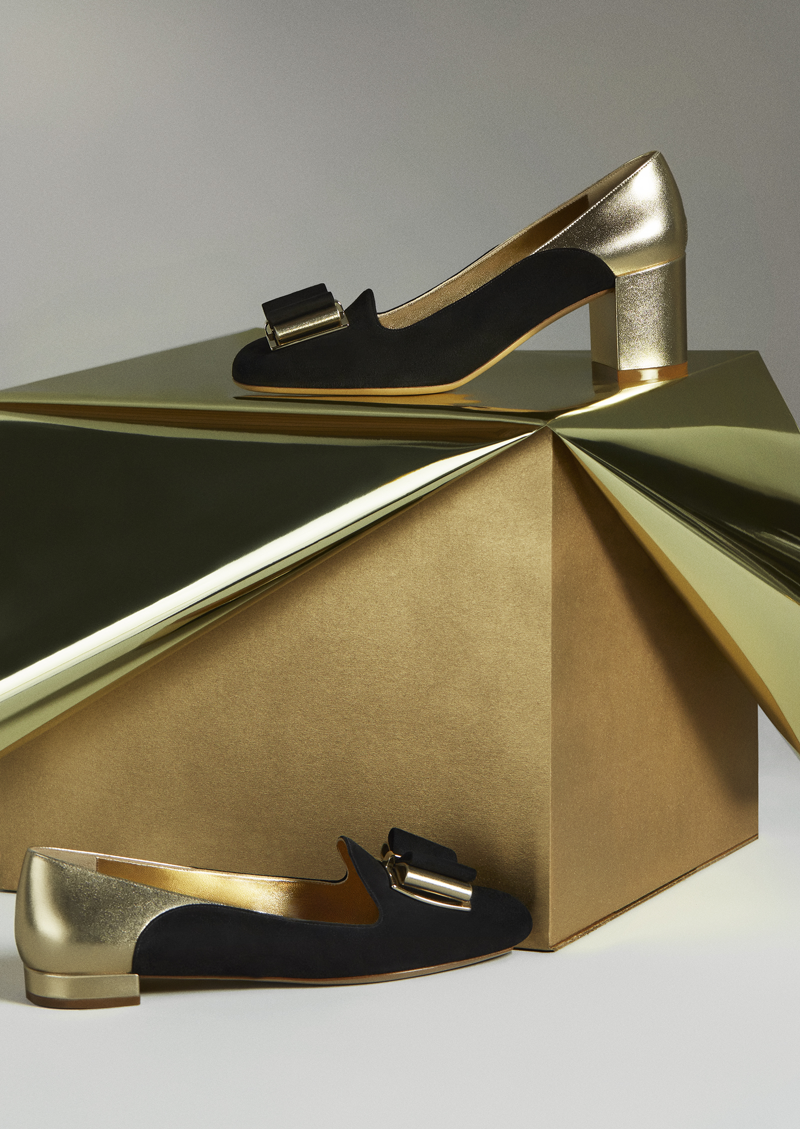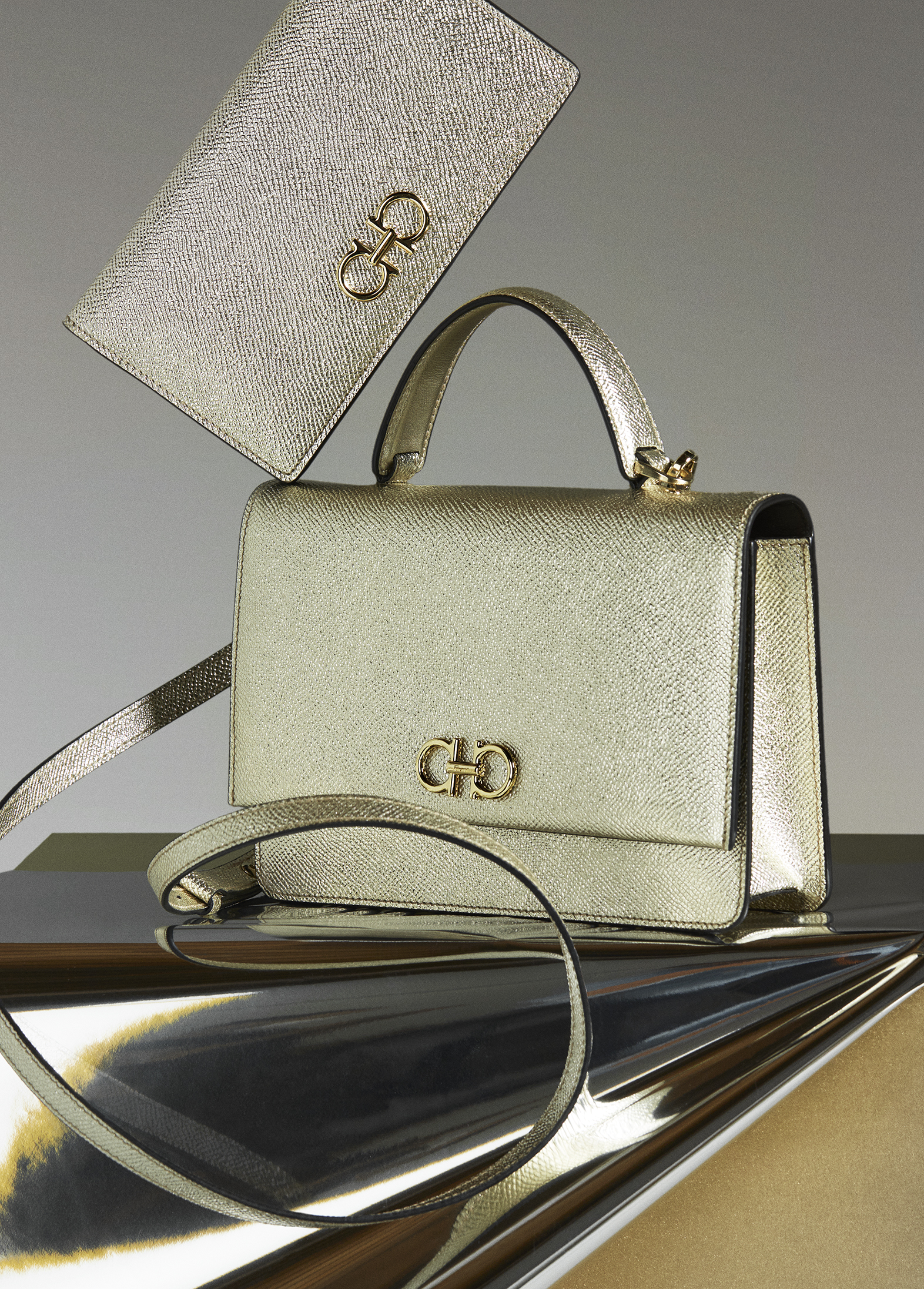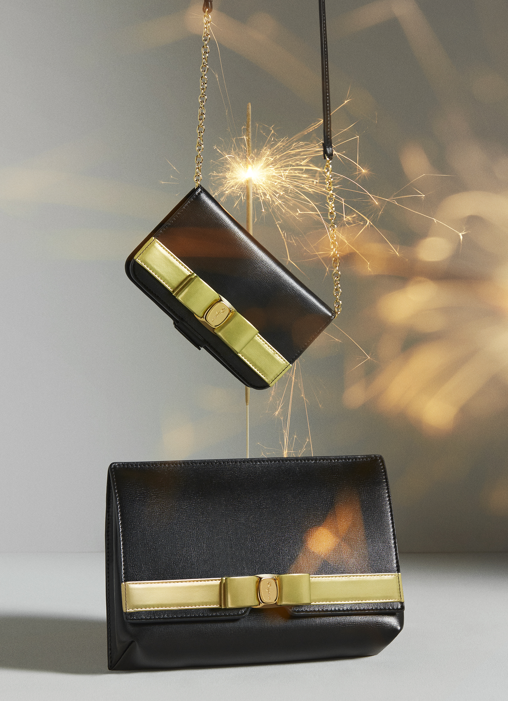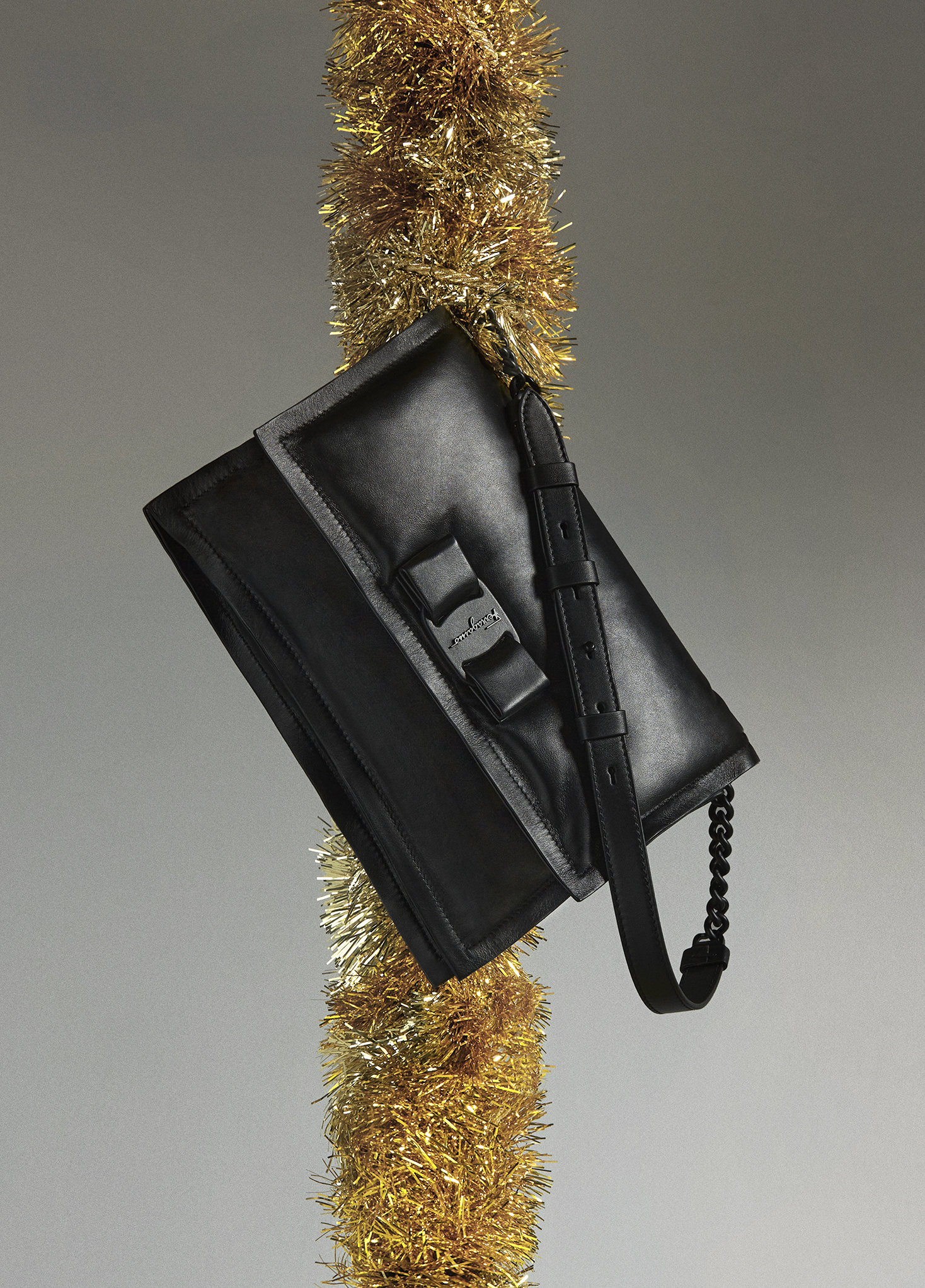 Pour elle La couture moderniste. Tricots métalliques. Robes et jupes en chaîne dorée. Robes en soie martelée et tricot foulard. Souliers Viva à talons moyens et chaussons de ballerines ornés de cristaux Gancini. Sac Studio à motif foulard. Deux modèles de sac Viva Bow, l’un avec un nœud doré sur fond noir, l’autre avec un effet de chaîne dorée pour compléter une sandale Viva assortie. Un nouveau sac Viva Bow rembourré en noir. Des lunettes de soleil Gancini-edge de nouvelle forme. Des boucles d’oreilles Gancini et poignets en cuir ornés de ferrures. Pour lui La couture à double couche. La chemise traditionnelle. Des pièces en tricot et en laine. Ceintures Gancini. Portefeuilles et porte-cartes. Montres, bracelets, lunettes de soleil et baskets Ferragamo. Souliers Tramezza fabriqués à la main. La collection de Fêtes occupera le devant de la scène dans les vitrines des magasins Salvatore Ferragamo et sera présentée dans tous nos canaux numériques et partenaires à travers le monde.