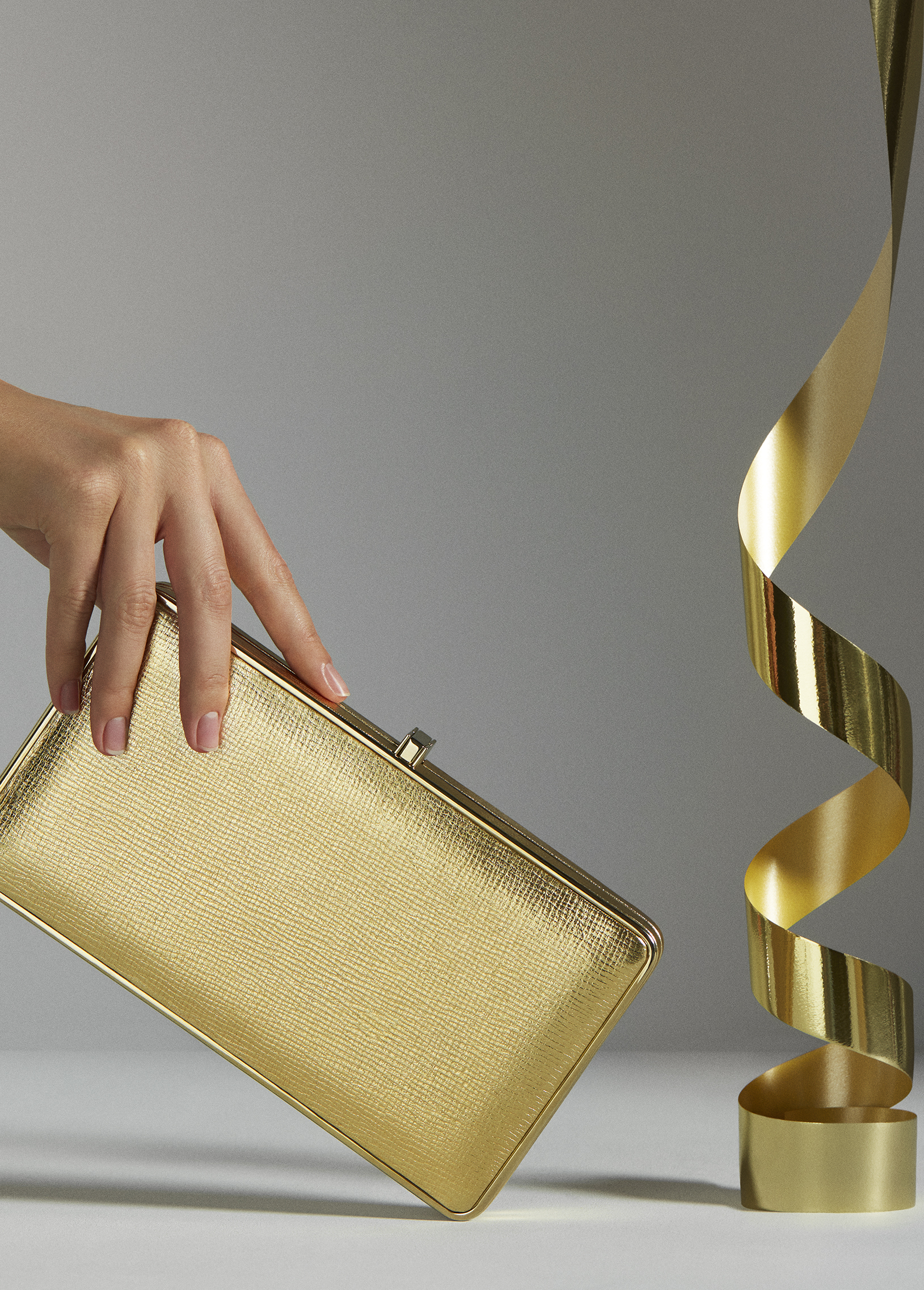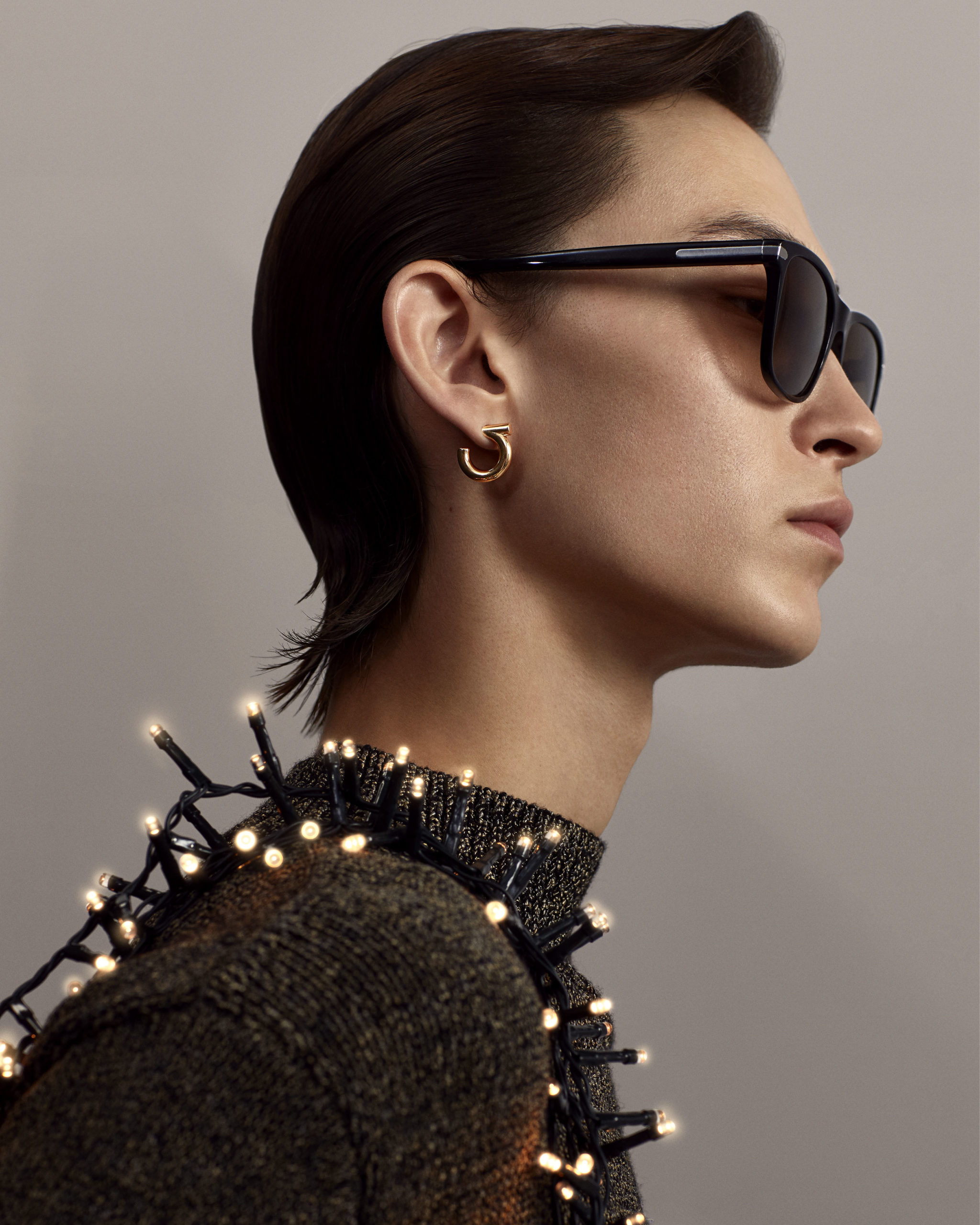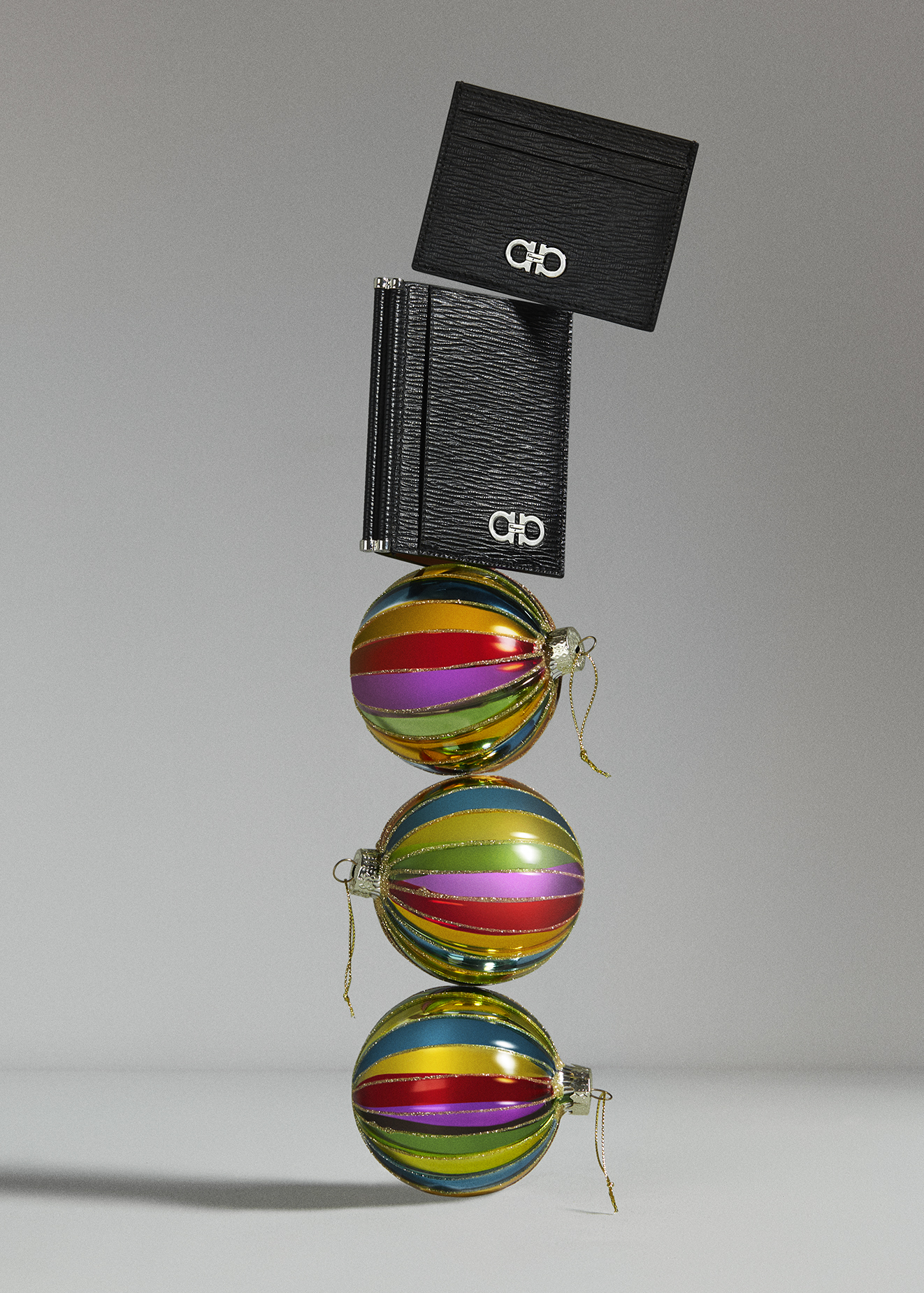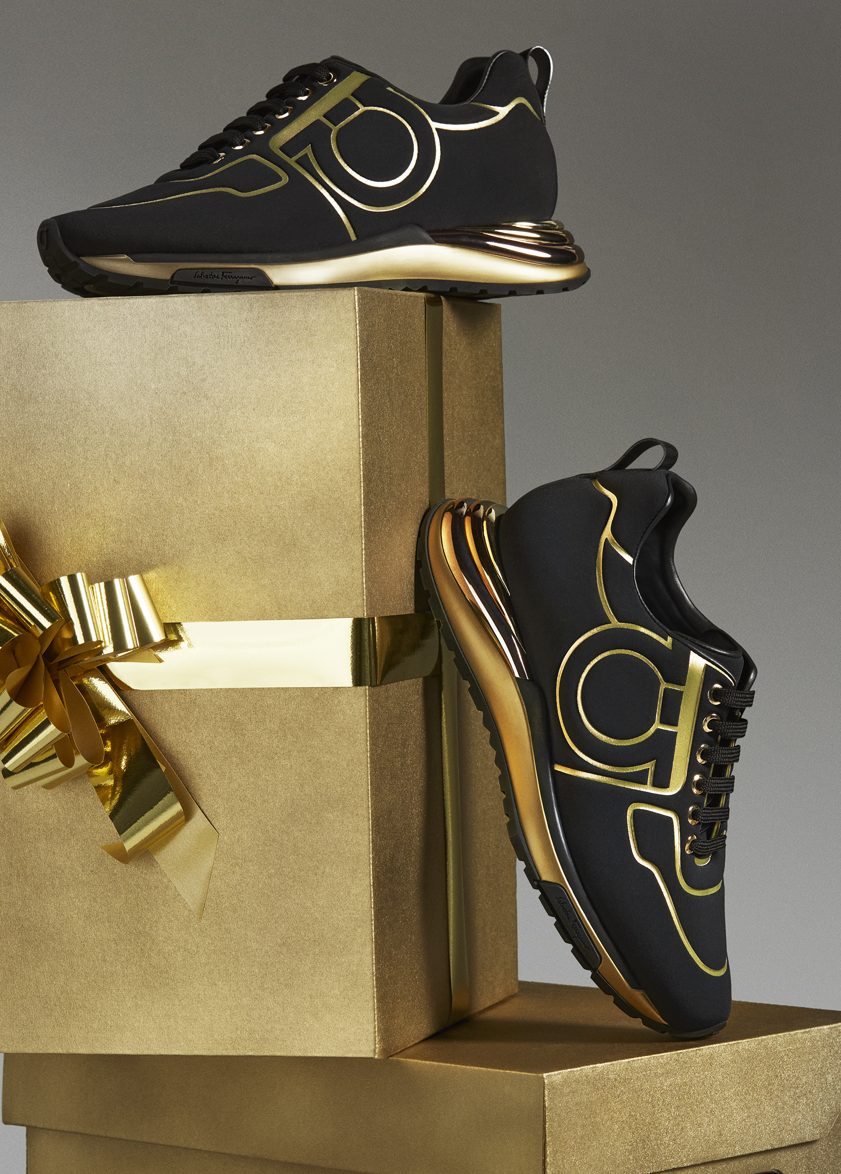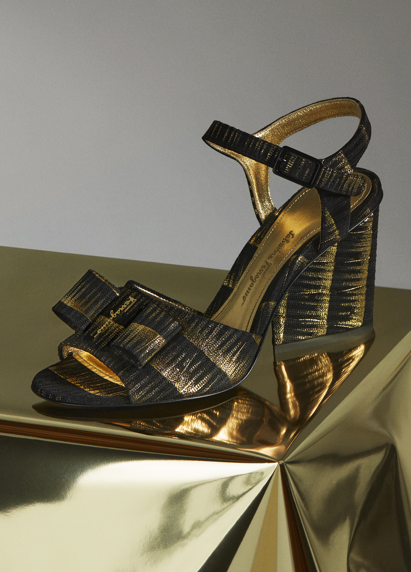 Pour elle La couture moderniste. Tricots métalliques. Robes et jupes en chaîne dorée. Robes en soie martelée et tricot foulard. Souliers Viva à talons moyens et chaussons de ballerines ornés de cristaux Gancini. Sac Studio à motif foulard. Deux modèles de sac Viva Bow, l’un avec un nœud doré sur fond noir, l’autre avec un effet de chaîne dorée pour compléter une sandale Viva assortie. Un nouveau sac Viva Bow rembourré en noir. Des lunettes de soleil Gancini-edge de nouvelle forme. Des boucles d’oreilles Gancini et poignets en cuir ornés de ferrures. Pour lui La couture à double couche. La chemise traditionnelle. Des pièces en tricot et en laine. Ceintures Gancini. Portefeuilles et porte-cartes. Montres, bracelets, lunettes de soleil et baskets Ferragamo. Souliers Tramezza fabriqués à la main. La collection de Fêtes occupera le devant de la scène dans les vitrines des magasins Salvatore Ferragamo et sera présentée dans tous nos canaux numériques et partenaires à travers le monde.