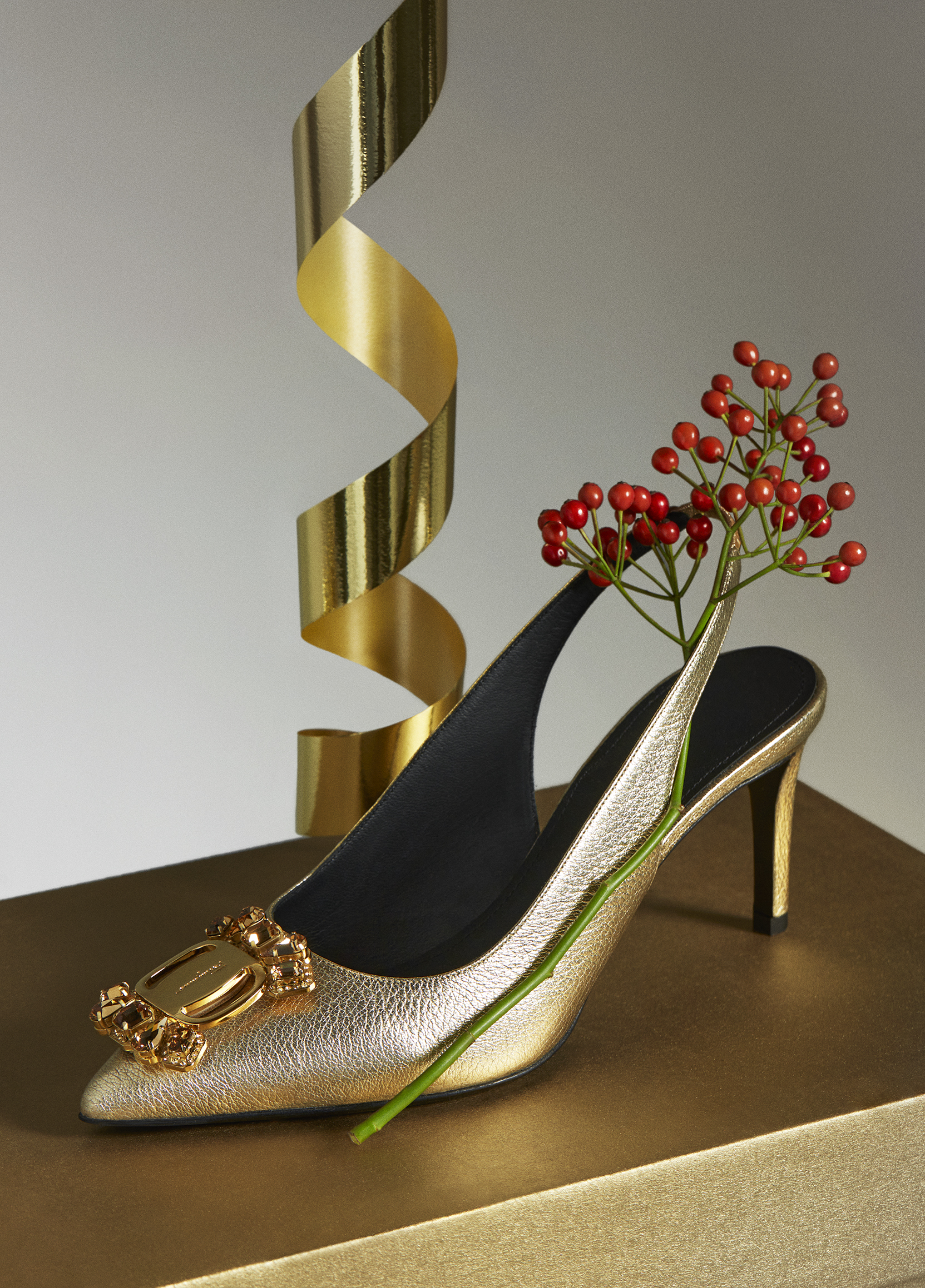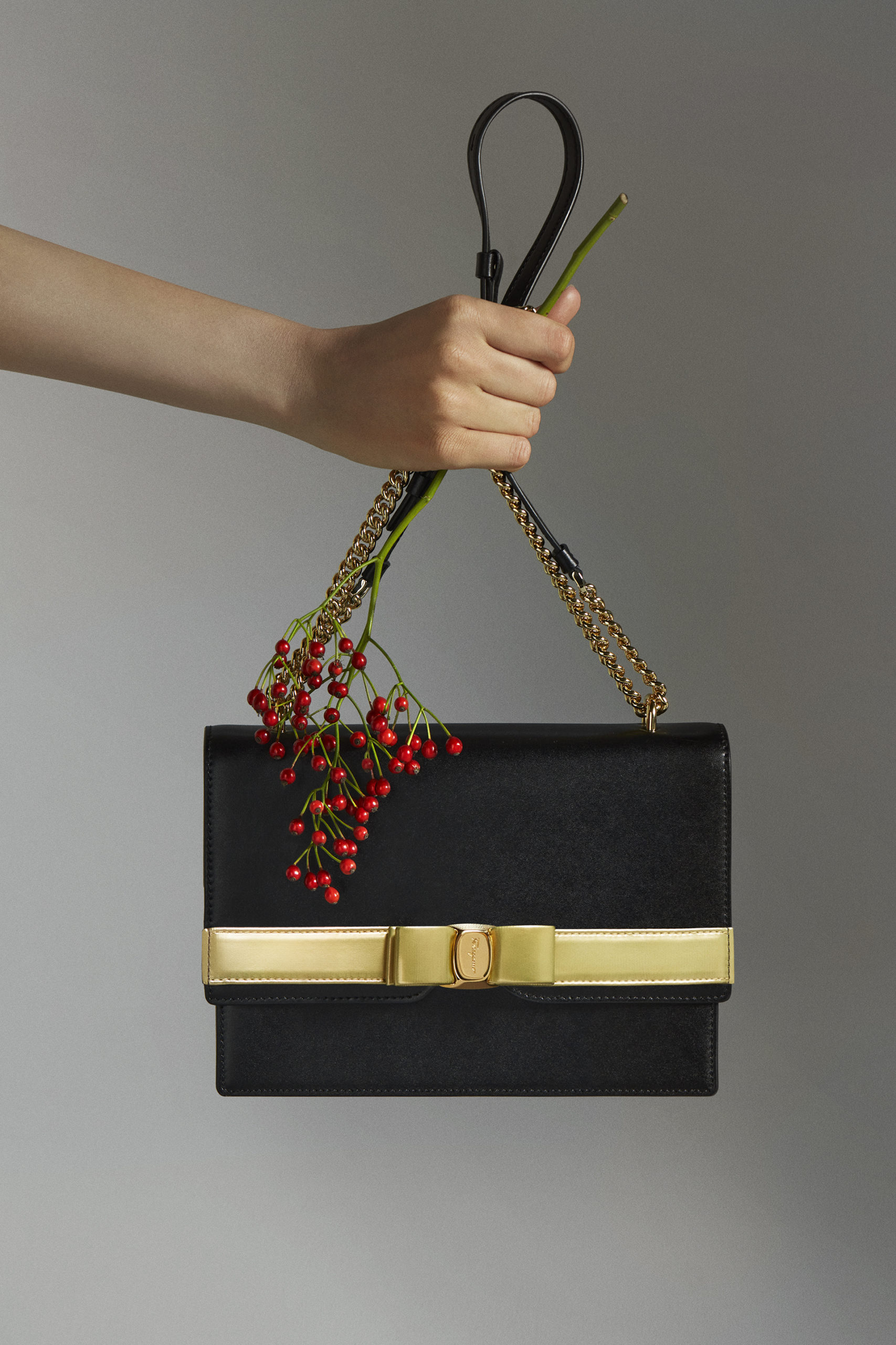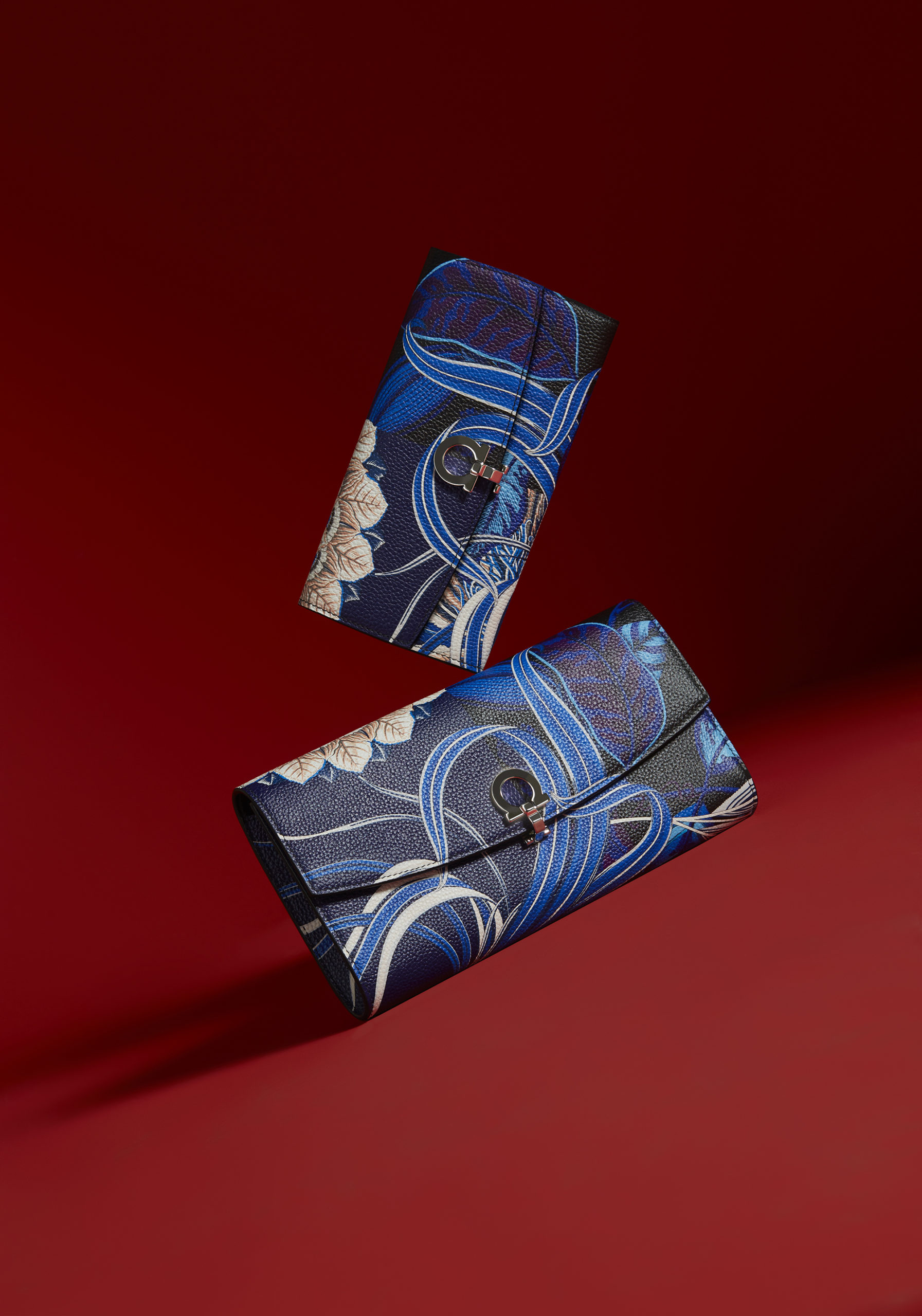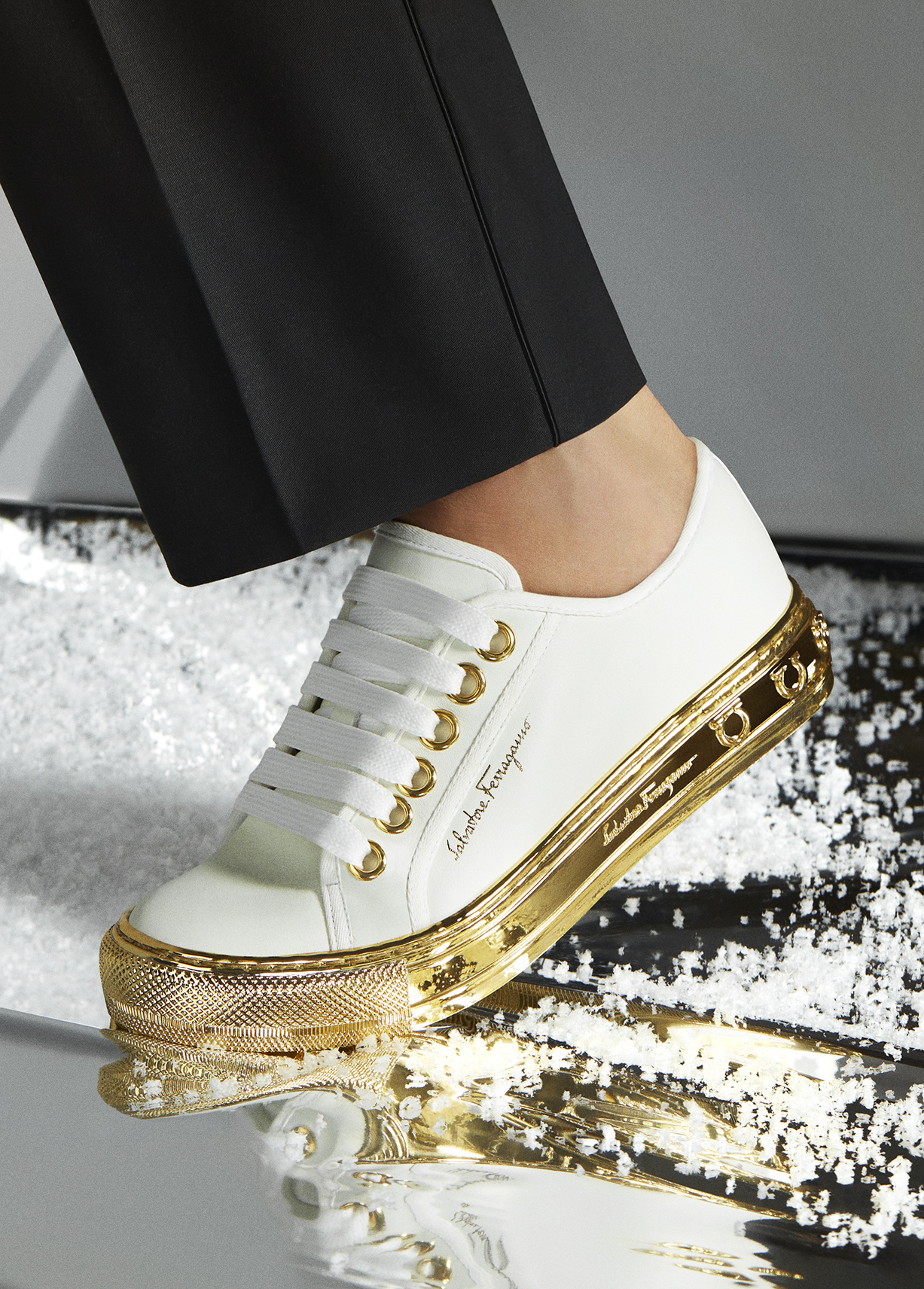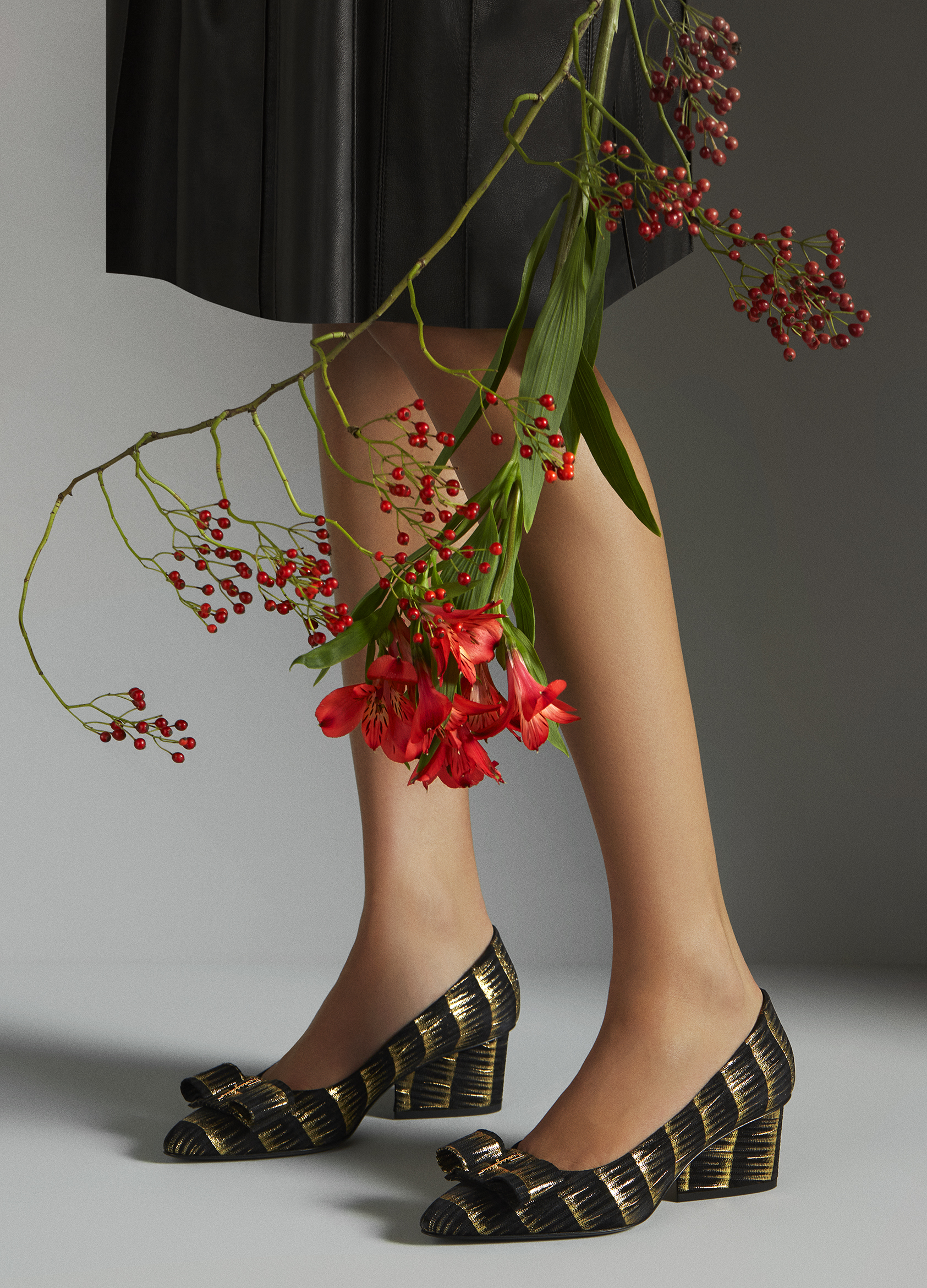 Pour elle La couture moderniste. Tricots métalliques. Robes et jupes en chaîne dorée. Robes en soie martelée et tricot foulard. Souliers Viva à talons moyens et chaussons de ballerines ornés de cristaux Gancini. Sac Studio à motif foulard. Deux modèles de sac Viva Bow, l’un avec un nœud doré sur fond noir, l’autre avec un effet de chaîne dorée pour compléter une sandale Viva assortie. Un nouveau sac Viva Bow rembourré en noir. Des lunettes de soleil Gancini-edge de nouvelle forme. Des boucles d’oreilles Gancini et poignets en cuir ornés de ferrures. Pour lui La couture à double couche. La chemise traditionnelle. Des pièces en tricot et en laine. Ceintures Gancini. Portefeuilles et porte-cartes. Montres, bracelets, lunettes de soleil et baskets Ferragamo. Souliers Tramezza fabriqués à la main. La collection de Fêtes occupera le devant de la scène dans les vitrines des magasins Salvatore Ferragamo et sera présentée dans tous nos canaux numériques et partenaires à travers le monde.