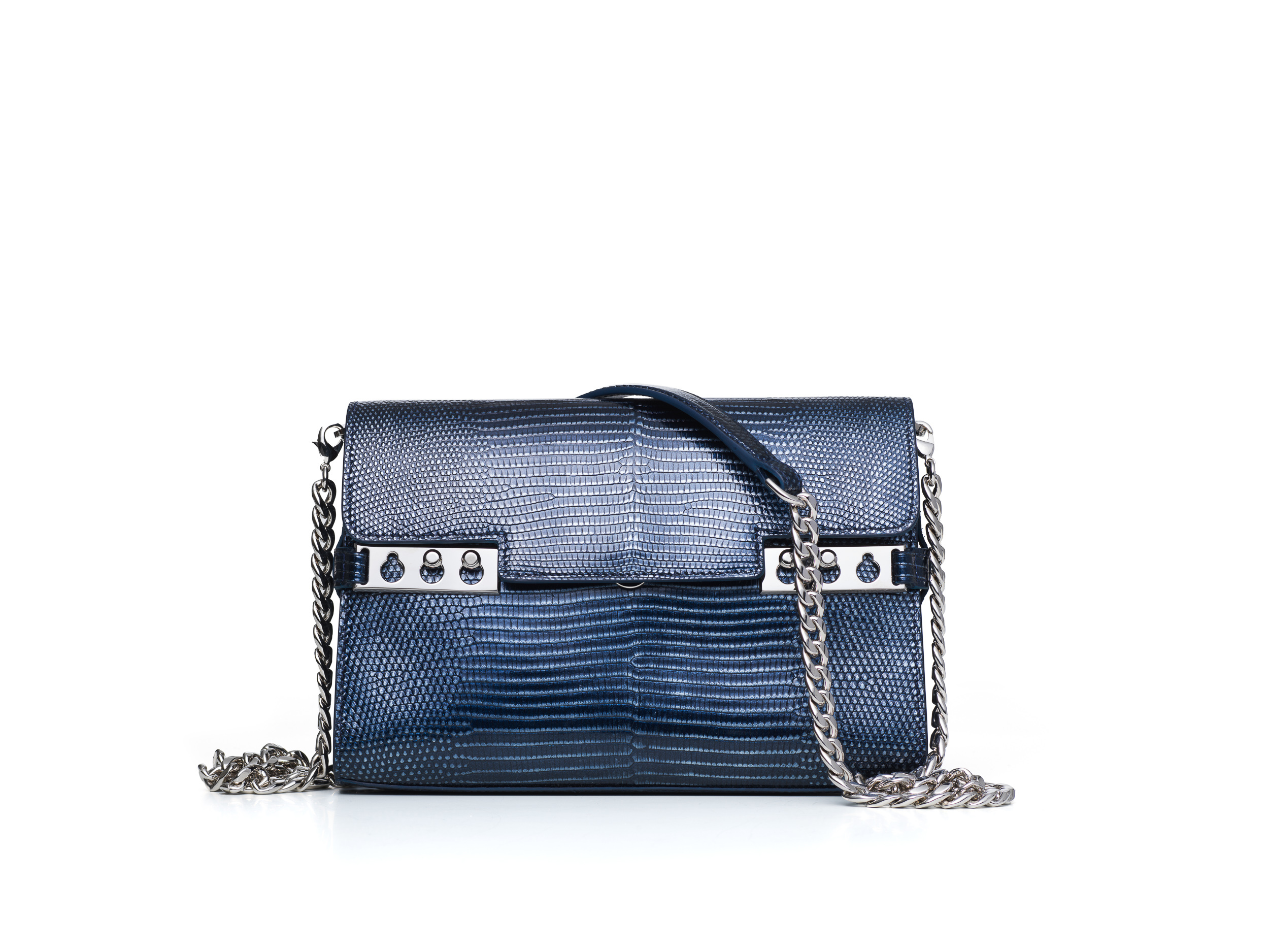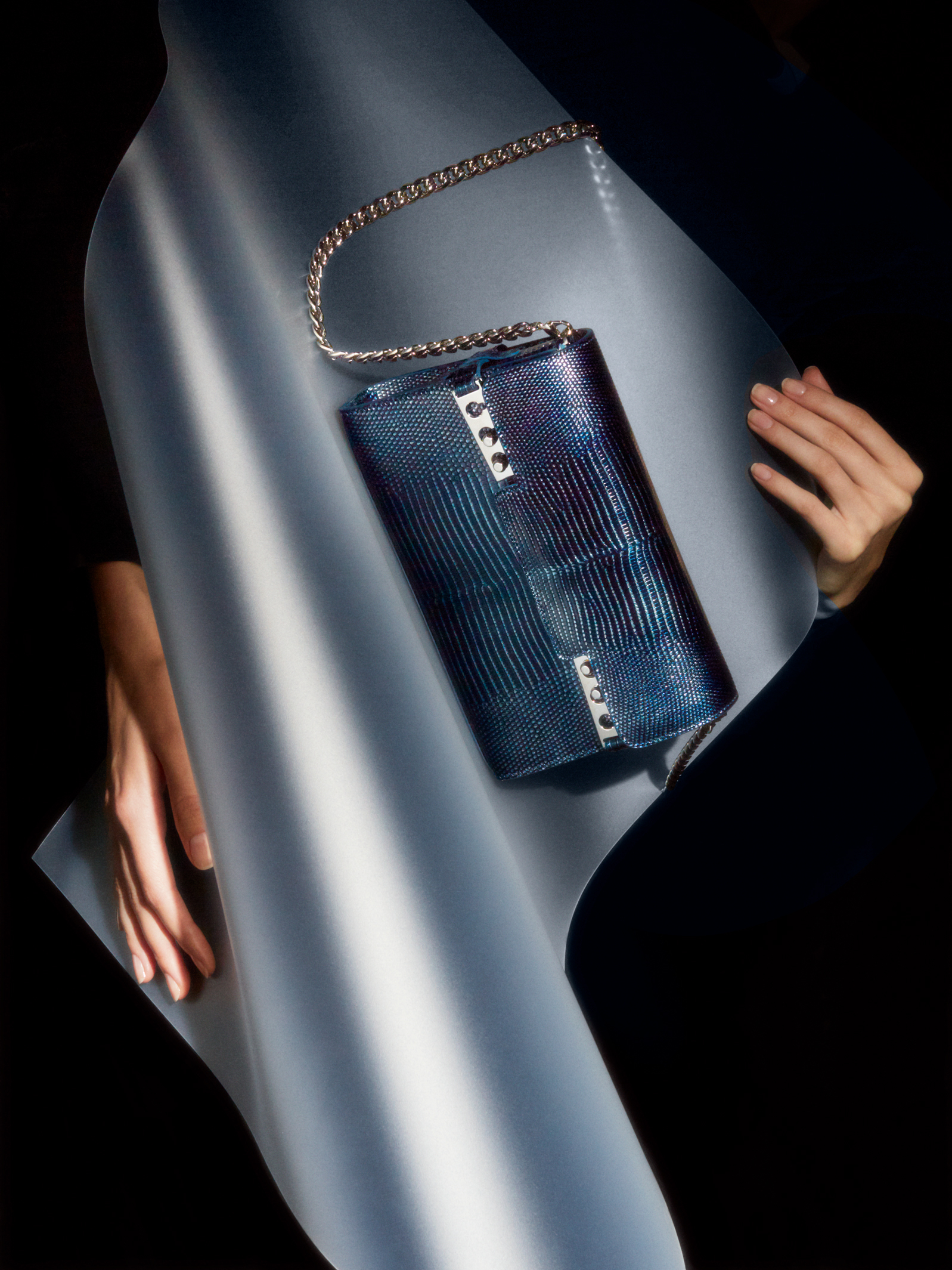 La boucle Moonlight, quant à elle, est parée d’une nuée de petites pierres étincelantes dans les tons bleus et argentés, évoquant une délicate pluie d’étoiles. Celle-ci habille le Brillant Mini Alligator et le Brillant Mini Moonlight, dont le magnifique cuir Box Calf est brodé d’étoiles et de planètes chatoyantes.