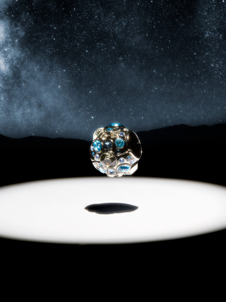 La collection entière est parée de la couleur d’un ciel nocturne profond et subtilement rehaussée d’effets métalliques et de pierres étincelantes formant les astres d’une galaxie.