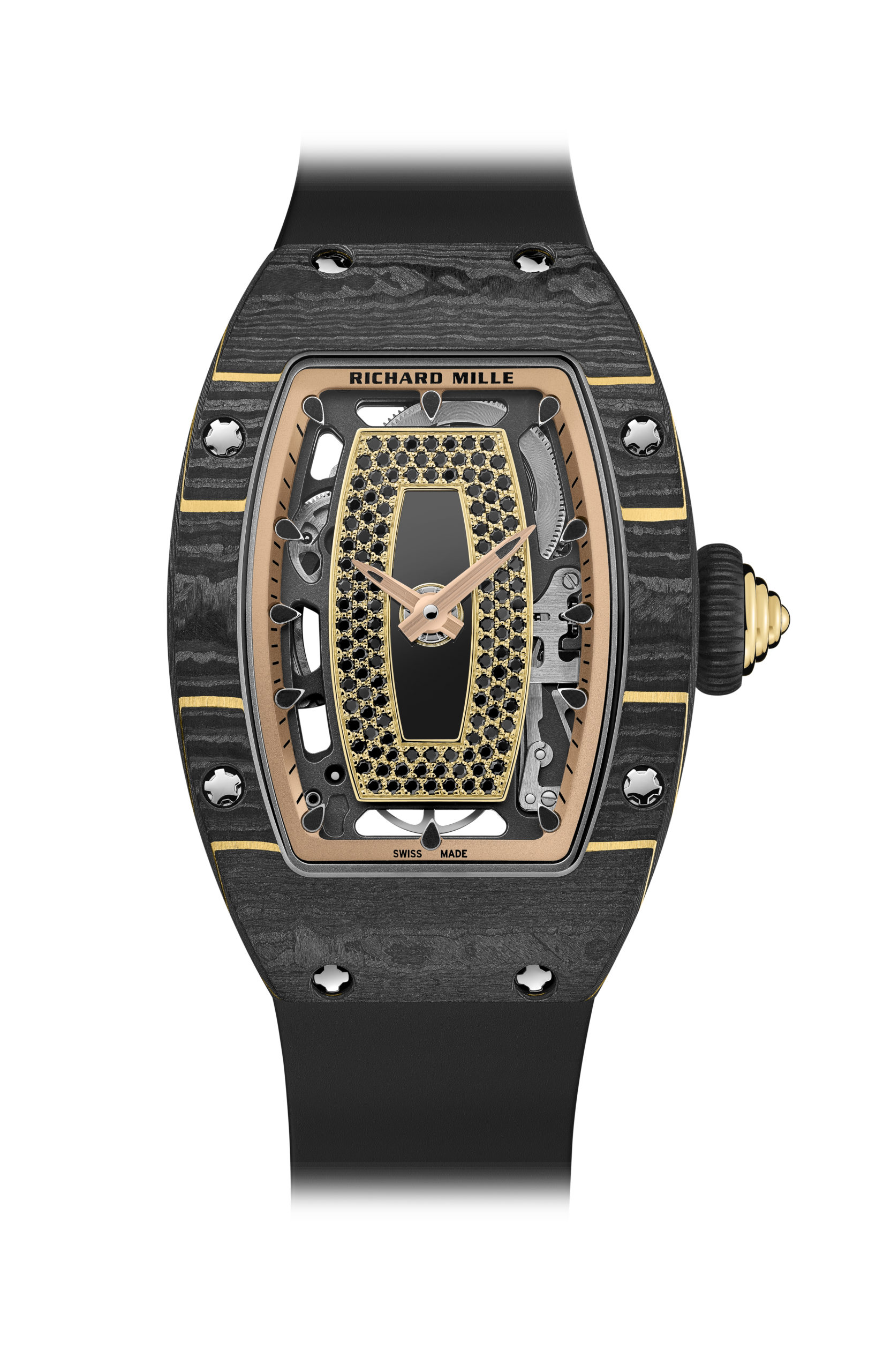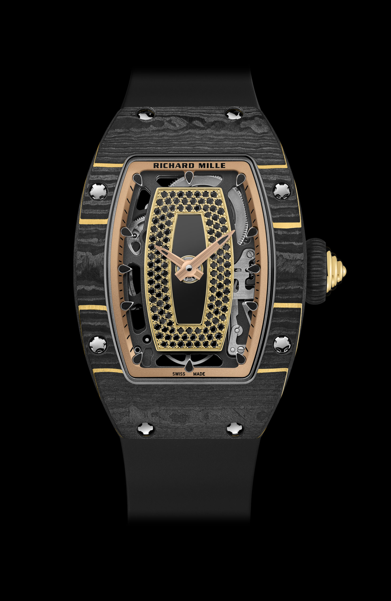 Richard Mille présente, après 4 ans de mise au point, le rendu si singulier de ce matériau exclusif sur deux modèles, pensés et conçus pour les femmes : la RM 07-01, et la RM 037, chacune ayant un cadran serti de saphirs noirs et accueillant en leur centre de l’onyx.
