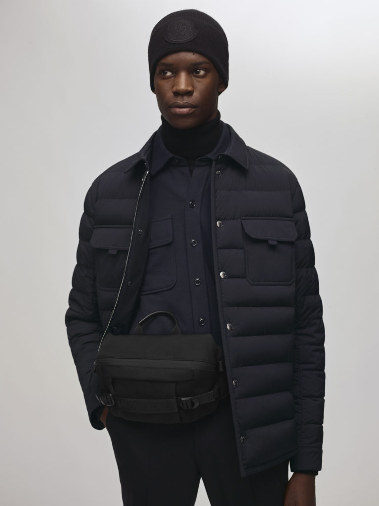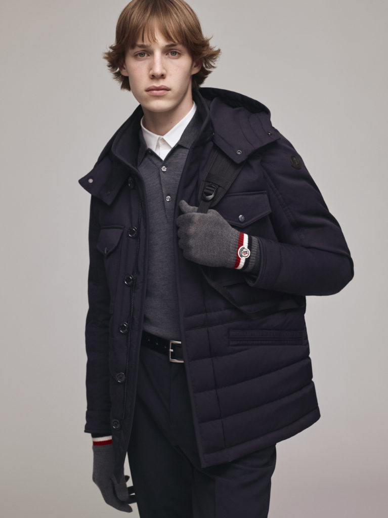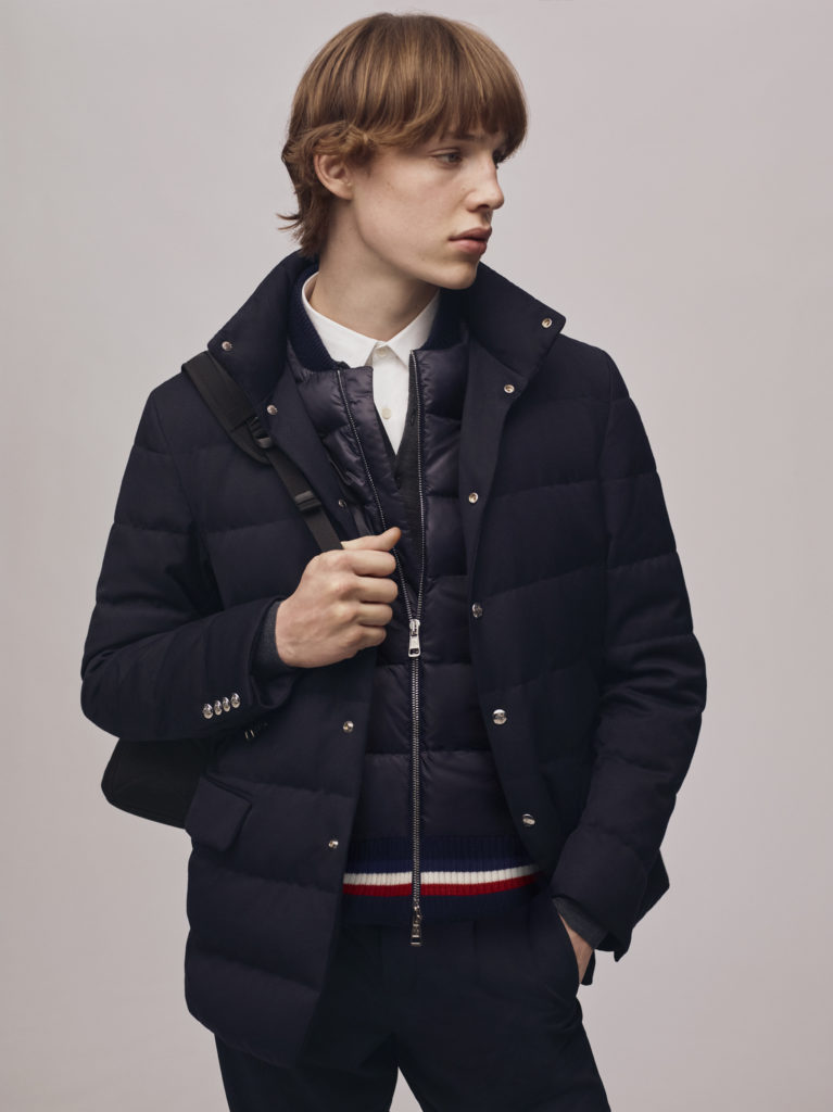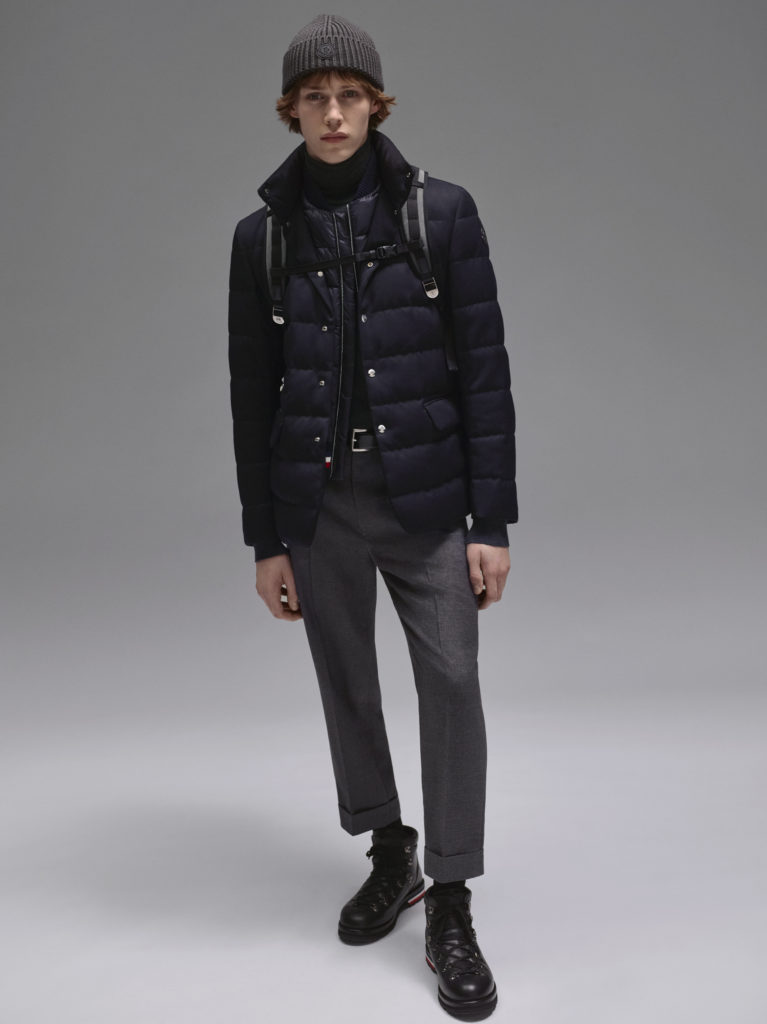 Empruntant les formes formelles du vestiaire masculin classique, réinterprétées dans le nylon et le duvet Moncler : la veste Ferrandier suit les lignes d’un blazer avec col à revers et poches, mais elle est renforcée par un plastron intérieur à col montant pour protéger du froid. La Zumstein présente une esthétique contemporaine, coupée telle une surchemise en nylon avec des boutons-pression lui conférant une allure sophistiquée.