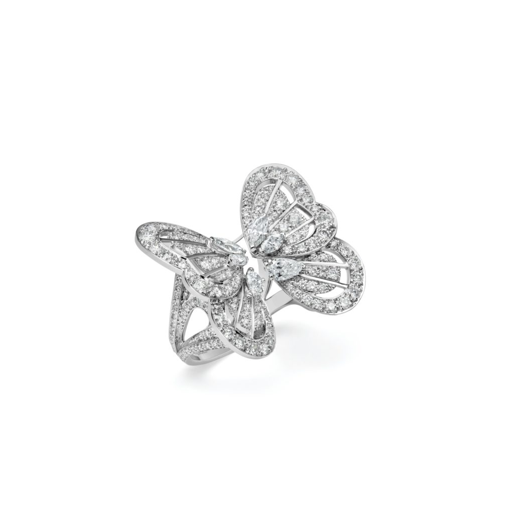 Une pièce d’une beauté remarquable, inspirée de la collection Haute Joaillerie Portraits of Nature by De Beers. Cette bague cocktail capture l’iridescence des ailes d’un papillon grâce à d’étincelants diamants blancs de différentes tailles, pour un poids total d’environ 2,95 carats. Riche en détails, elle présente un élégant design ajouré qui permet à la lumière naturelle de voyager à travers les ailes du papillon, lui donnant ainsi un éclat exceptionnel.