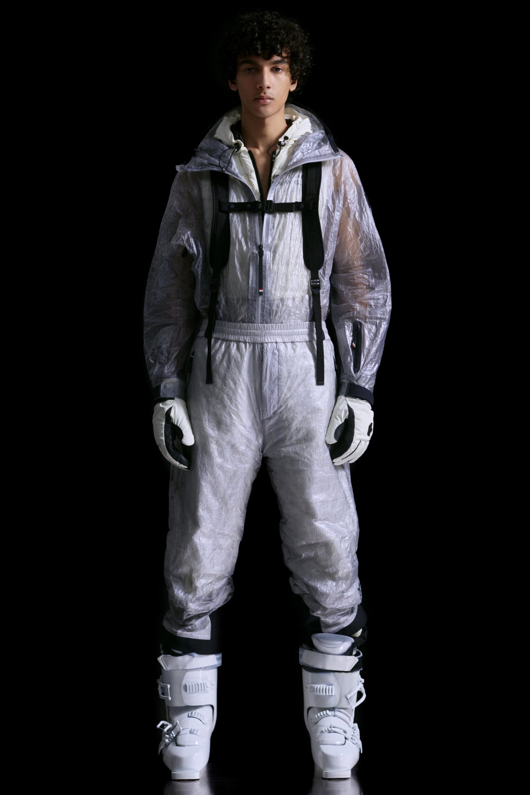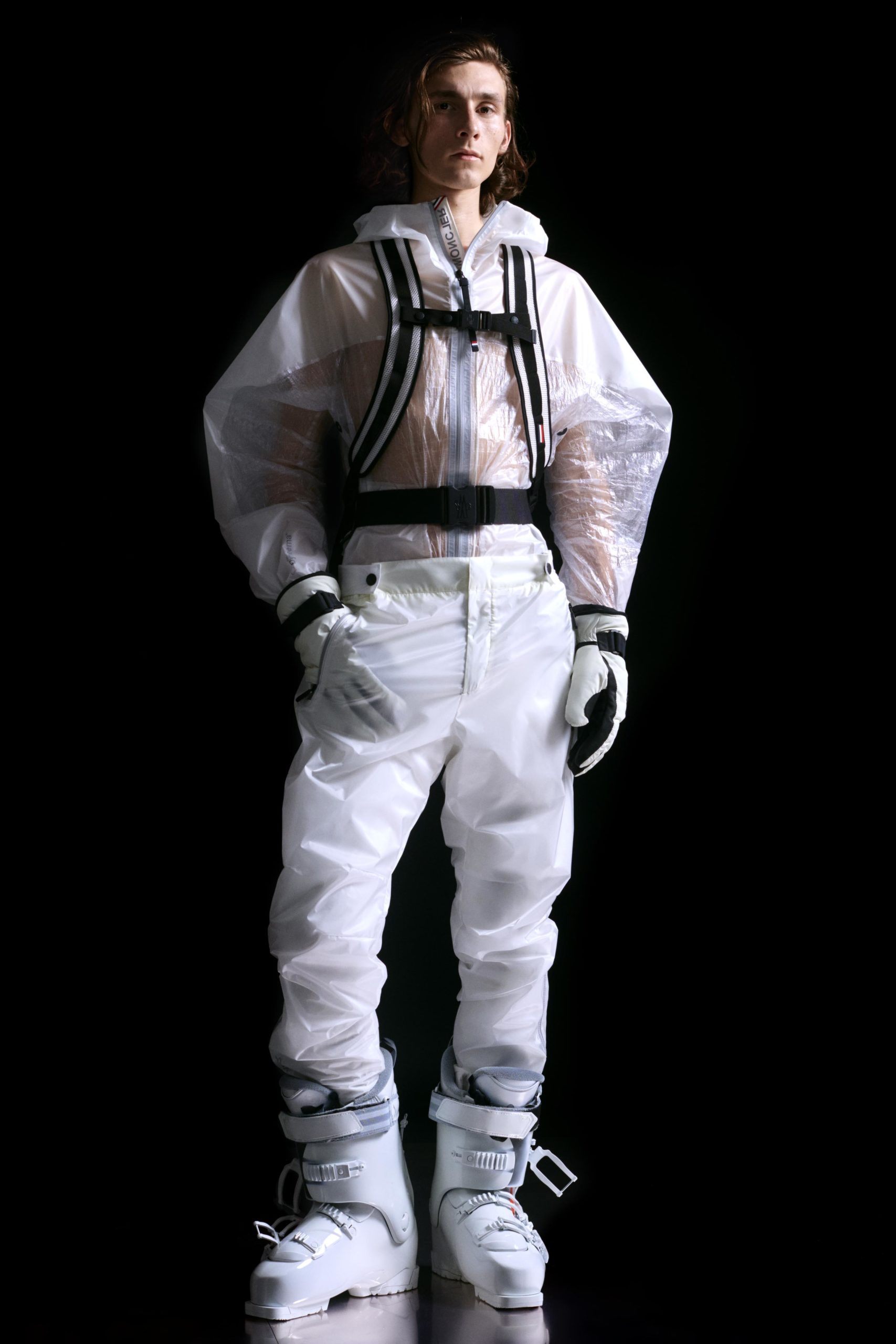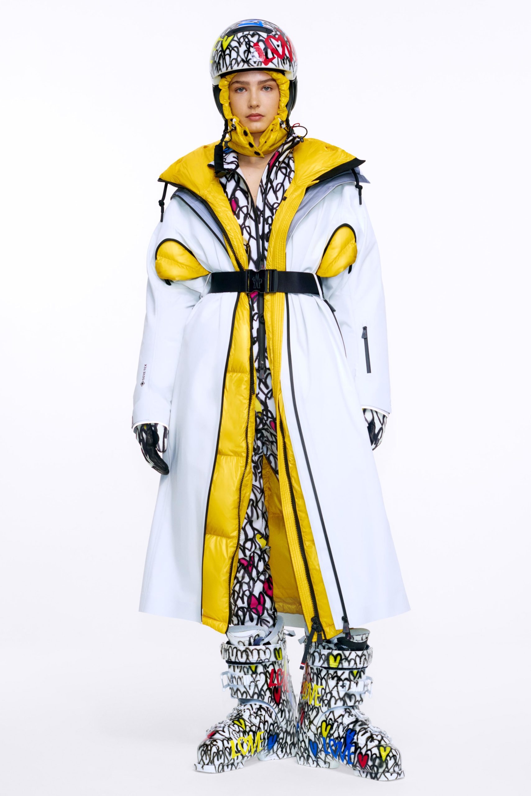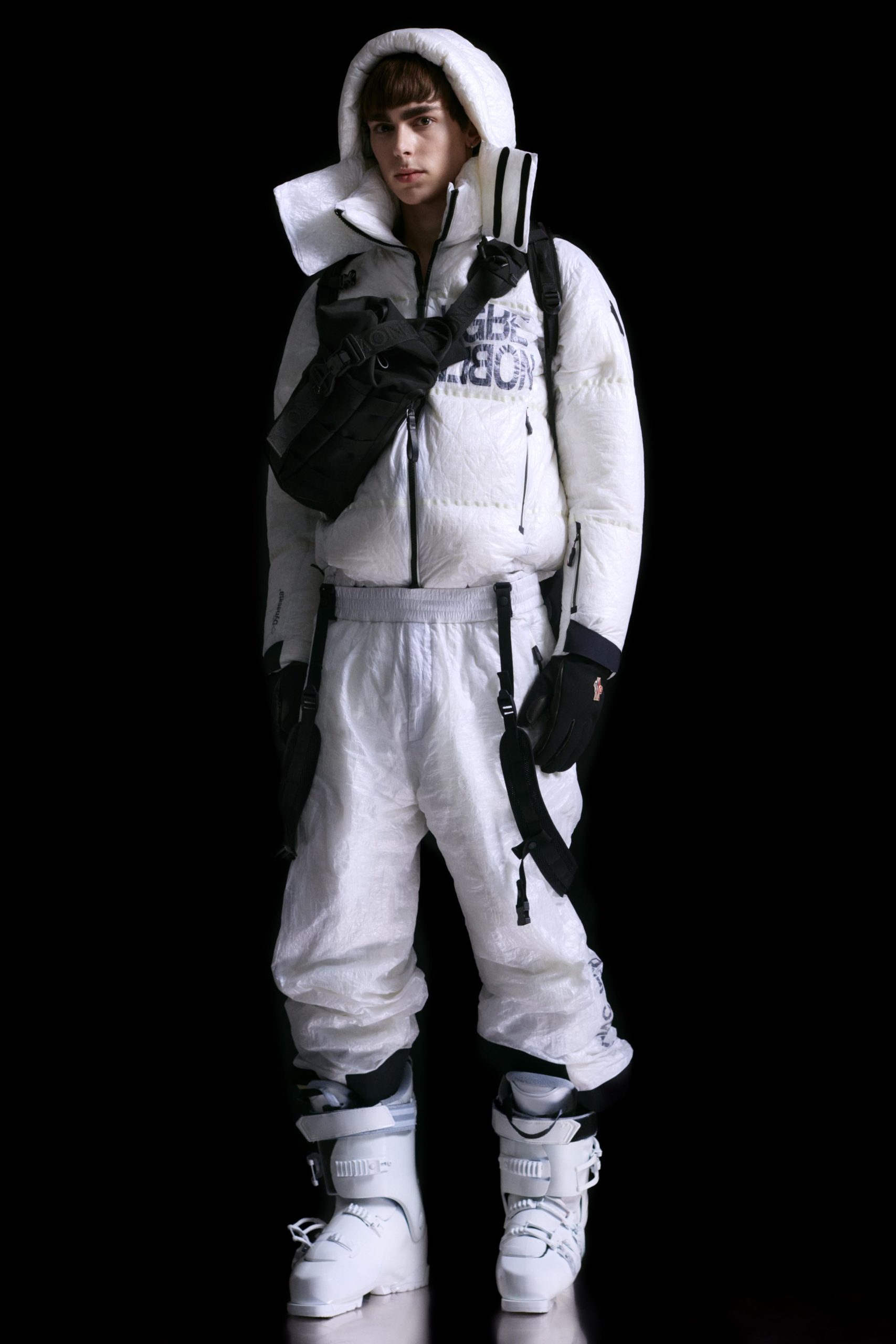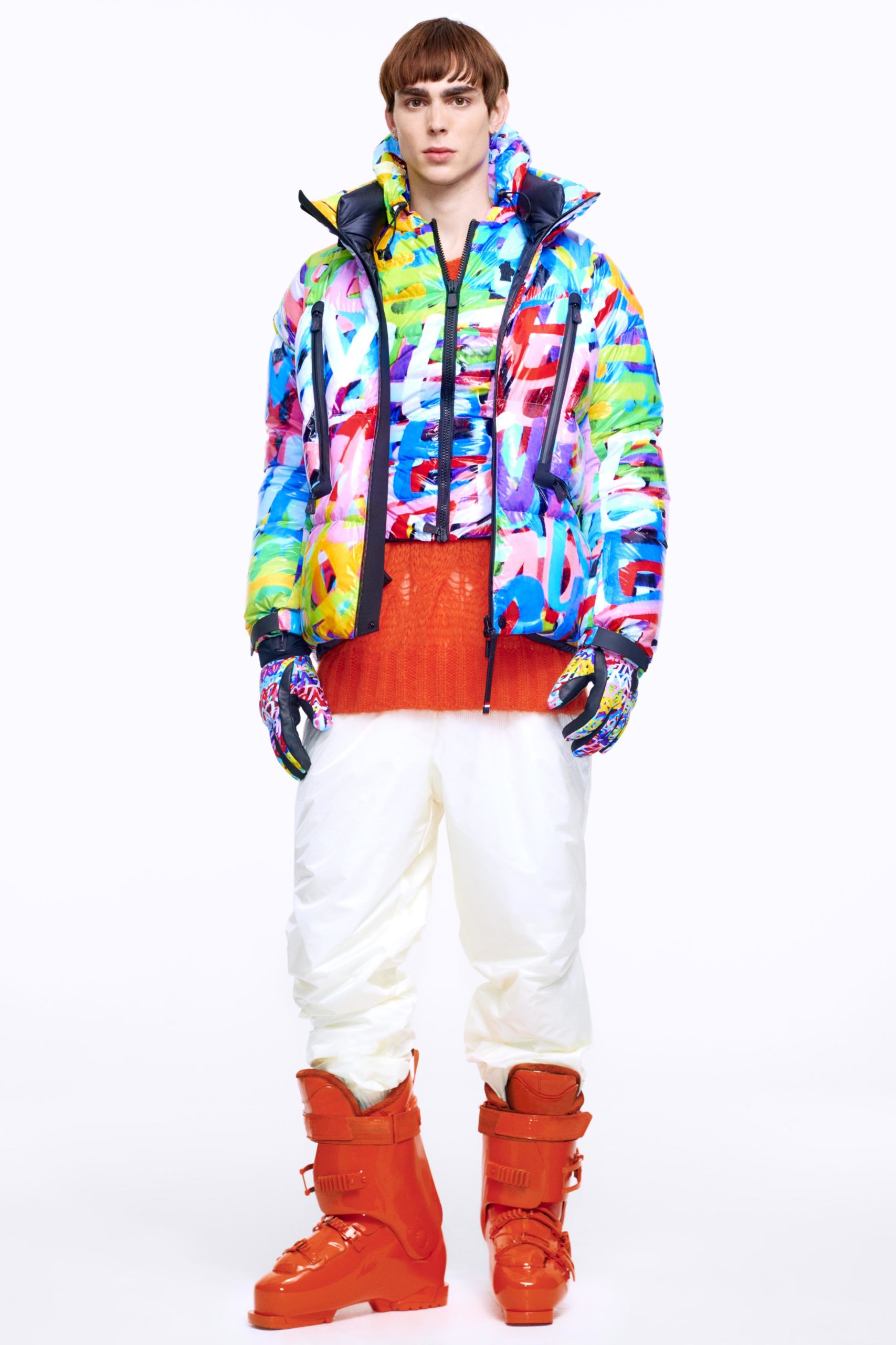 3 Moncler Grenoble, collection faisant partie de Moncler Genius, traduit une vision pionnière de la montagne. Le directeur créatif, Sandro Mandrino, concentre son travail sur le design et la fonctionnalité, mais en y insufflant une mode audacieuse. Il crée une nouvelle variété de vêtements qui, tout en étant conçus pour la pratique intensive du ski avec des constructions innovantes et des tissus technologiques, sont aussi visuellement saisissants et adaptés à la vie hors des pistes. Cette saison, le look se construit autour de la superposition, des couleurs, de la flexibilité et de la polyvalence. On y trouve des salopettes, des doudounes, des bombers, des anoraks, des trenchs et des pull-overs qui se mélangent, s’assortissent, se superposent et s’assemblent avec gaité. Une profusion de graffitis colorés – de coups de pinceau, de logos dessinés au crayon et de formes joyeuses – inonde la surface, renforcée par un mélange de nylons mats et brillants et de mailles douces. Une palette vive comme un l’arc-en-ciel se contraste avec des silhouettes totalement noires ou blanches. On retrouve l’innovation en matière de tissus essentiellement dans les looks blancs, avec deux technologies différentes mais tout aussi innovantes. Le Dyneema®, fibre à la fois la plus robuste et la plus durable au monde, qui est 15 fois plus résistante que l’acier, mais assez légère pour flotter sur l’eau. Et Snow Glow, une membrane photoluminescente qui brille dans le noir après avoir été exposée au soleil ou à une lumière chaude artificielle.