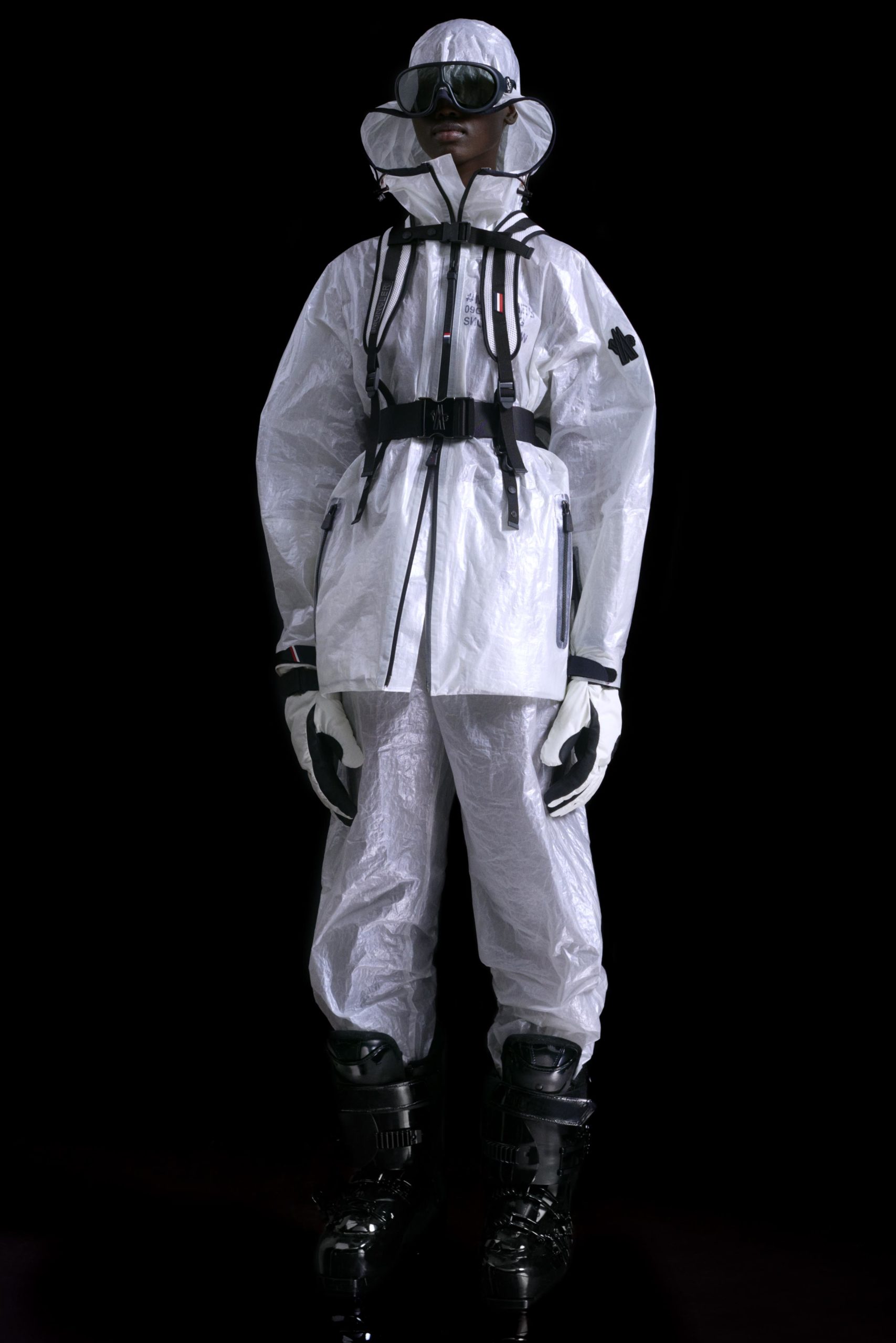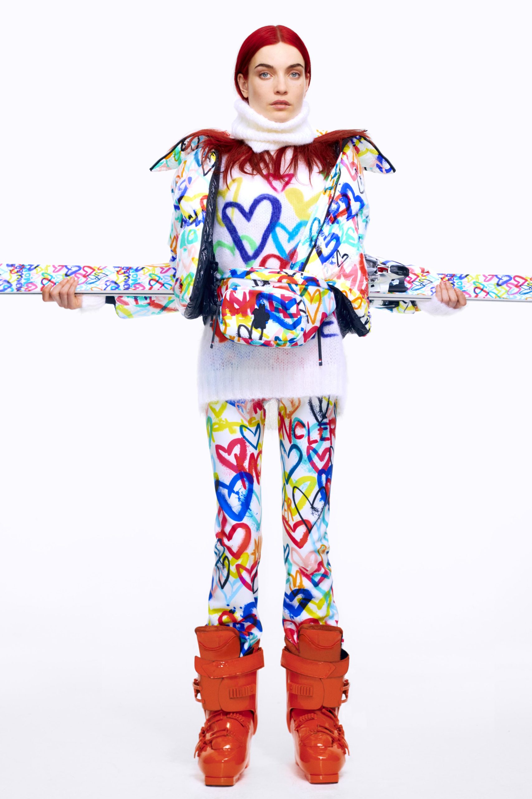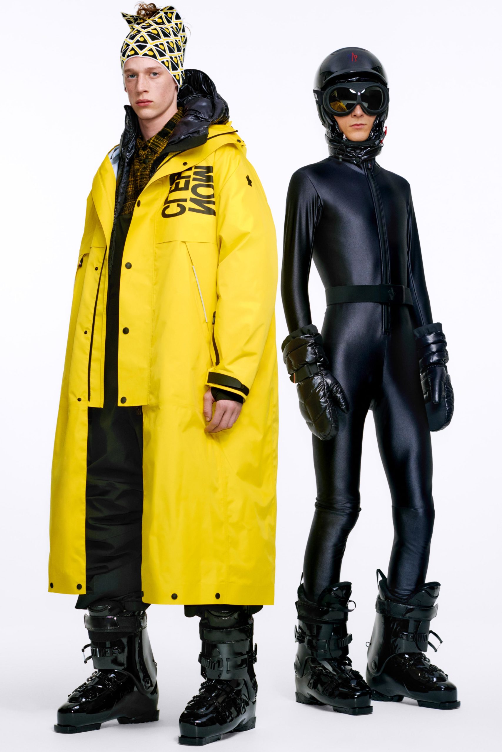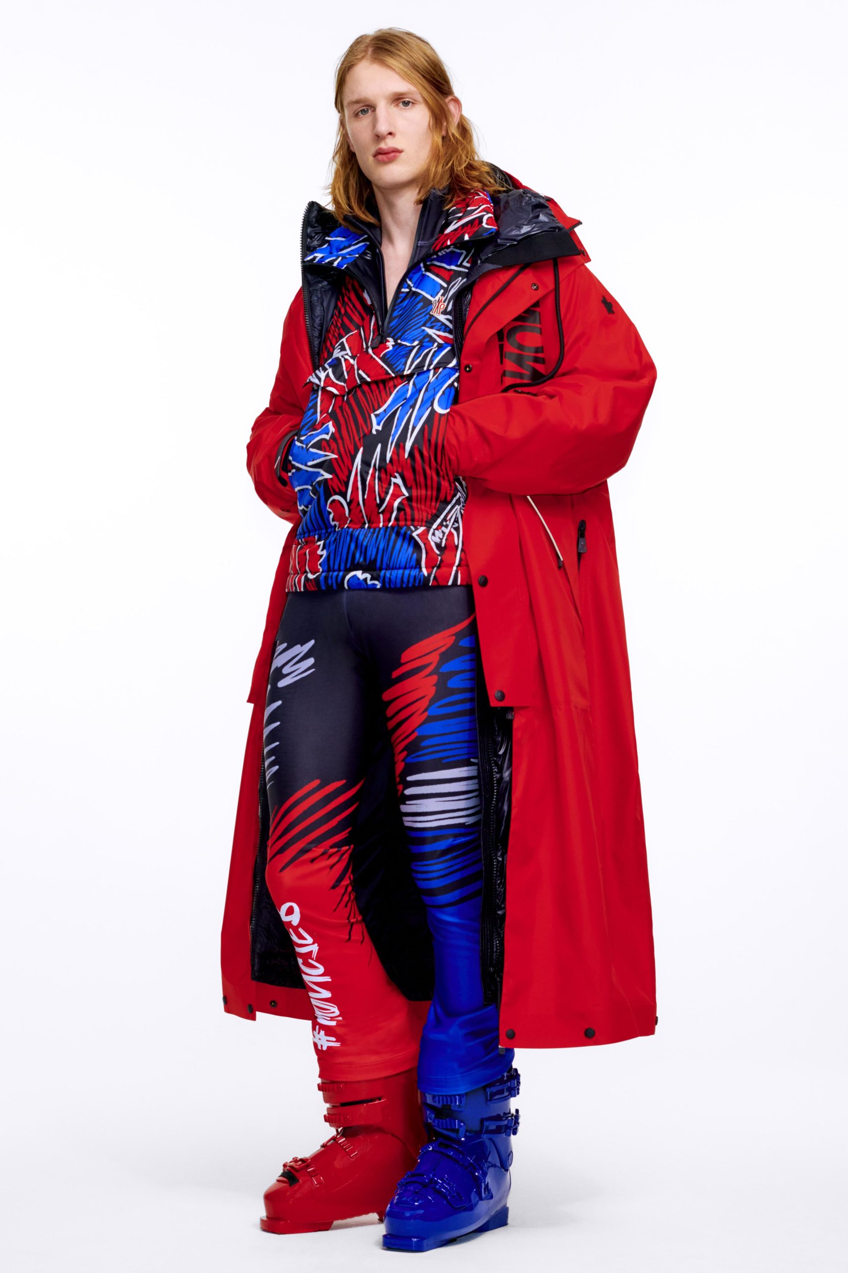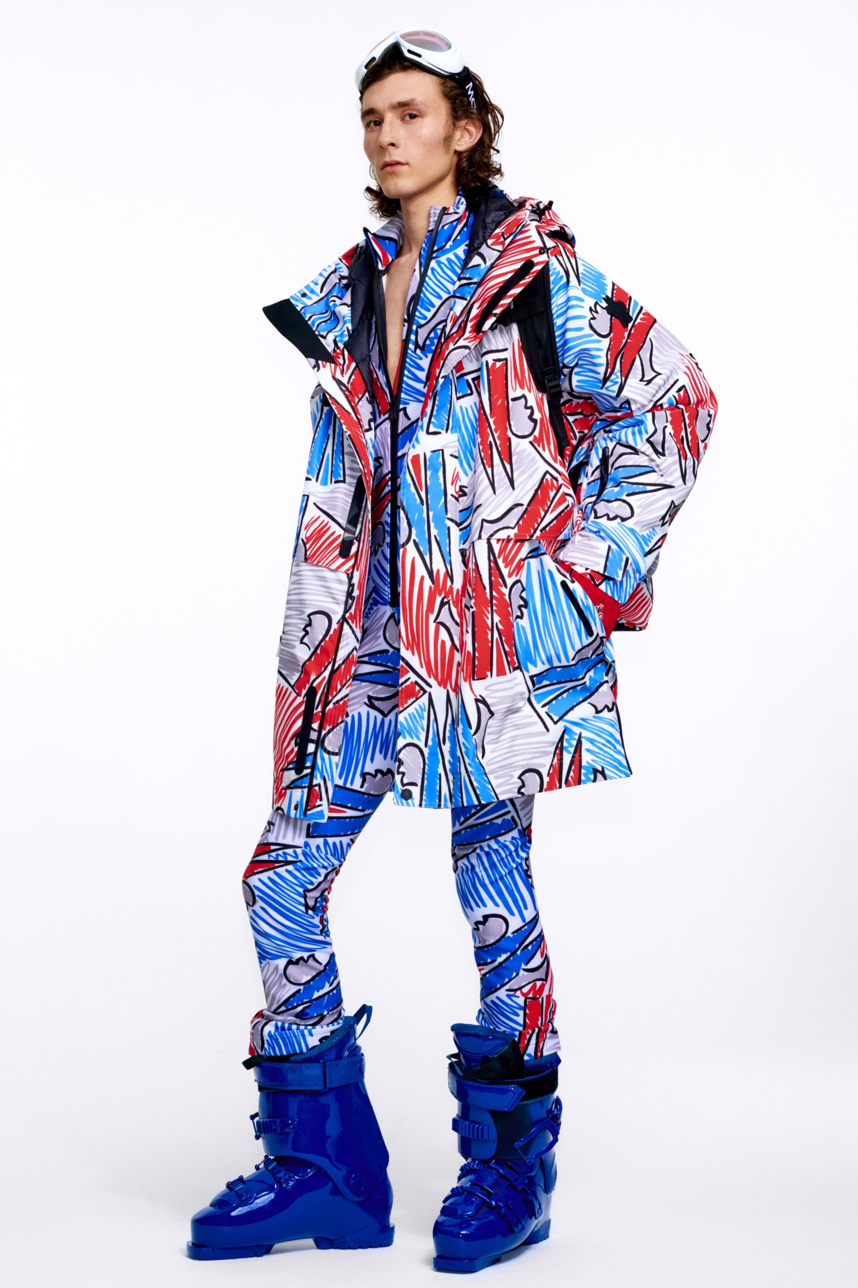 3 Moncler Grenoble, collection faisant partie de Moncler Genius, traduit une vision pionnière de la montagne. Le directeur créatif, Sandro Mandrino, concentre son travail sur le design et la fonctionnalité, mais en y insufflant une mode audacieuse. Il crée une nouvelle variété de vêtements qui, tout en étant conçus pour la pratique intensive du ski avec des constructions innovantes et des tissus technologiques, sont aussi visuellement saisissants et adaptés à la vie hors des pistes. Cette saison, le look se construit autour de la superposition, des couleurs, de la flexibilité et de la polyvalence. On y trouve des salopettes, des doudounes, des bombers, des anoraks, des trenchs et des pull-overs qui se mélangent, s’assortissent, se superposent et s’assemblent avec gaité. Une profusion de graffitis colorés – de coups de pinceau, de logos dessinés au crayon et de formes joyeuses – inonde la surface, renforcée par un mélange de nylons mats et brillants et de mailles douces. Une palette vive comme un l’arc-en-ciel se contraste avec des silhouettes totalement noires ou blanches. On retrouve l’innovation en matière de tissus essentiellement dans les looks blancs, avec deux technologies différentes mais tout aussi innovantes. Le Dyneema®, fibre à la fois la plus robuste et la plus durable au monde, qui est 15 fois plus résistante que l’acier, mais assez légère pour flotter sur l’eau. Et Snow Glow, une membrane photoluminescente qui brille dans le noir après avoir été exposée au soleil ou à une lumière chaude artificielle.