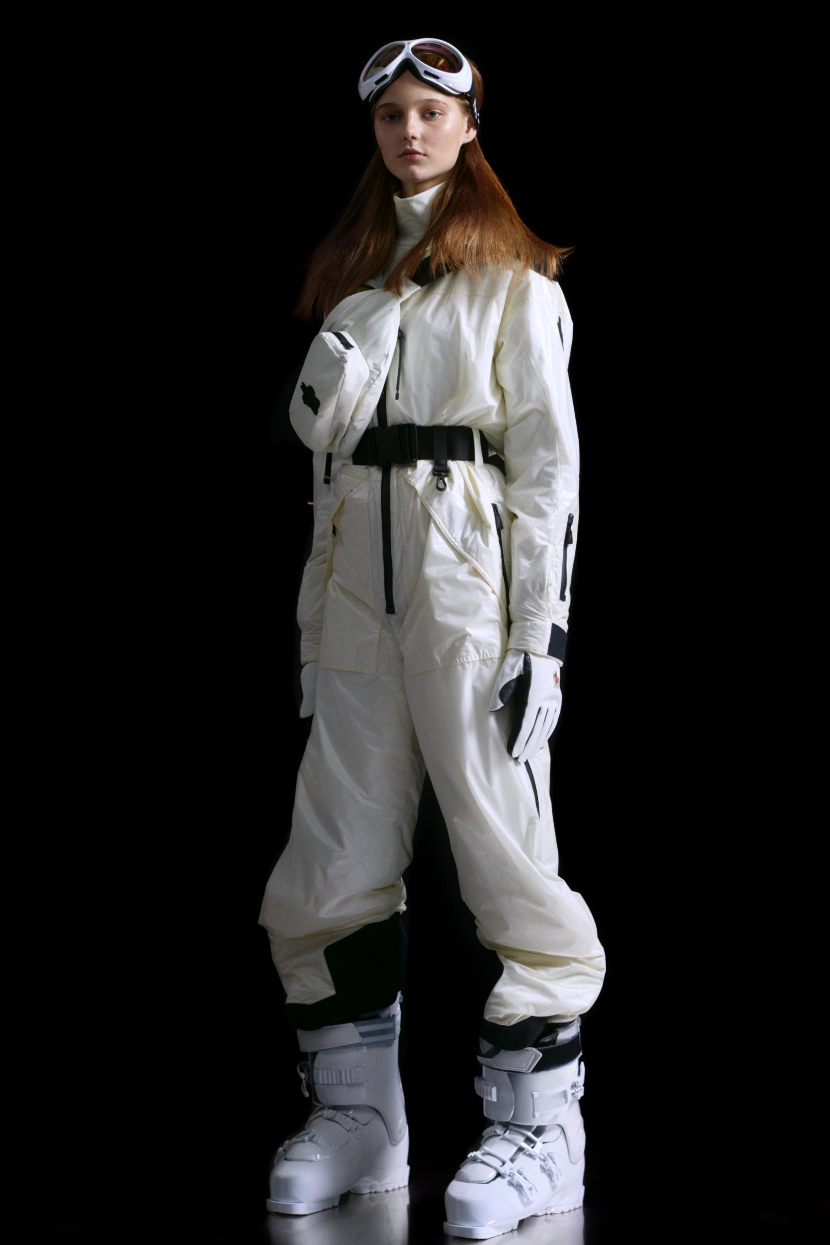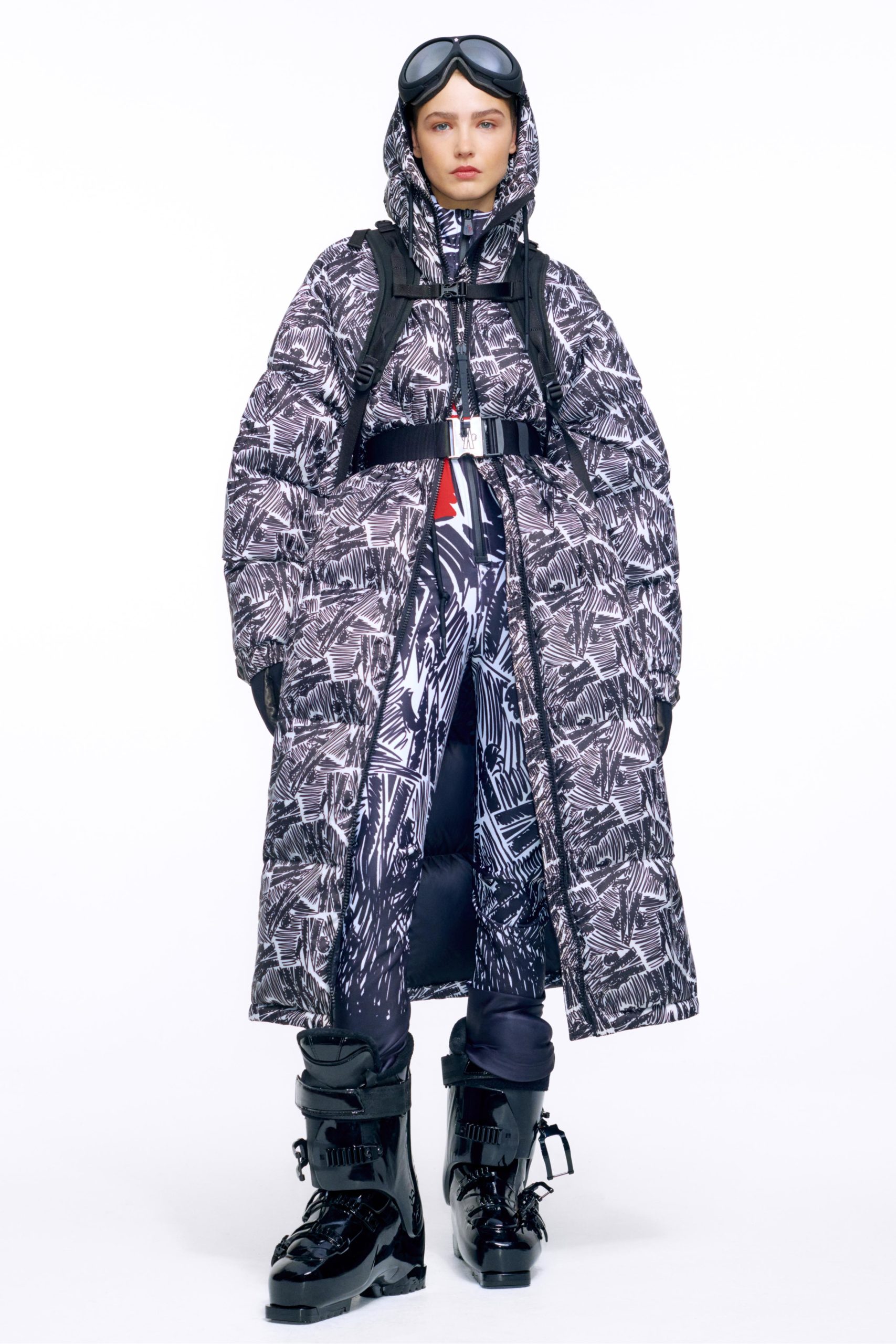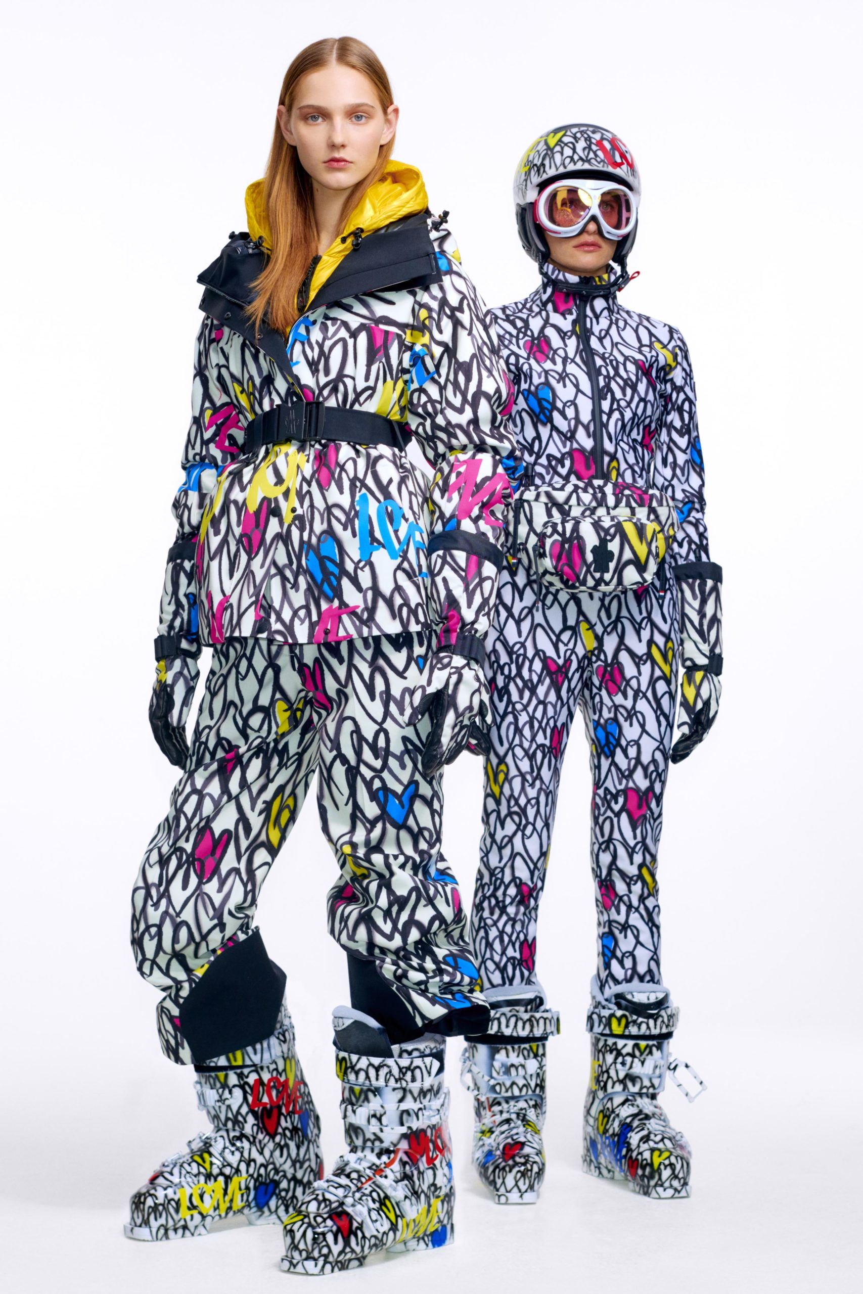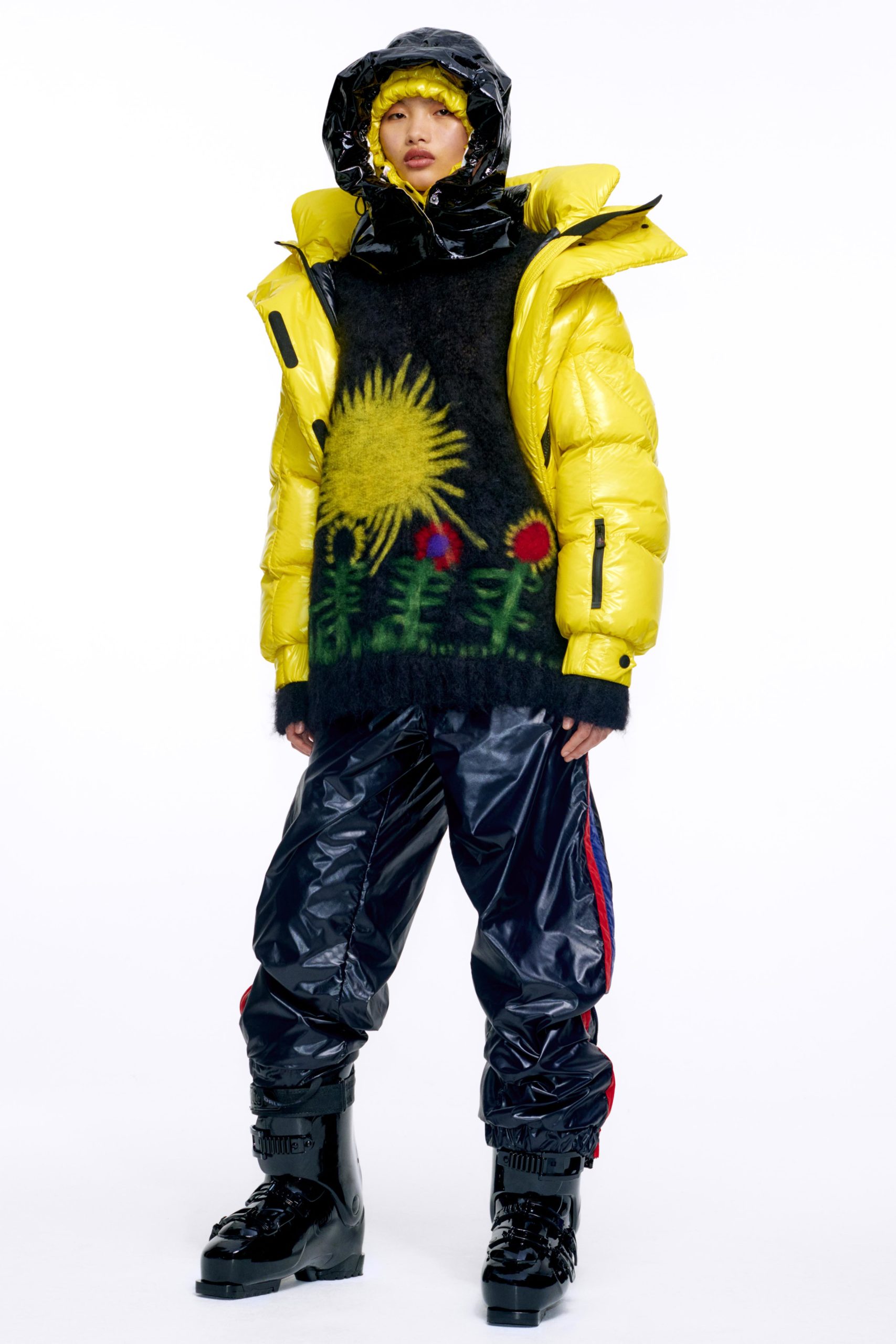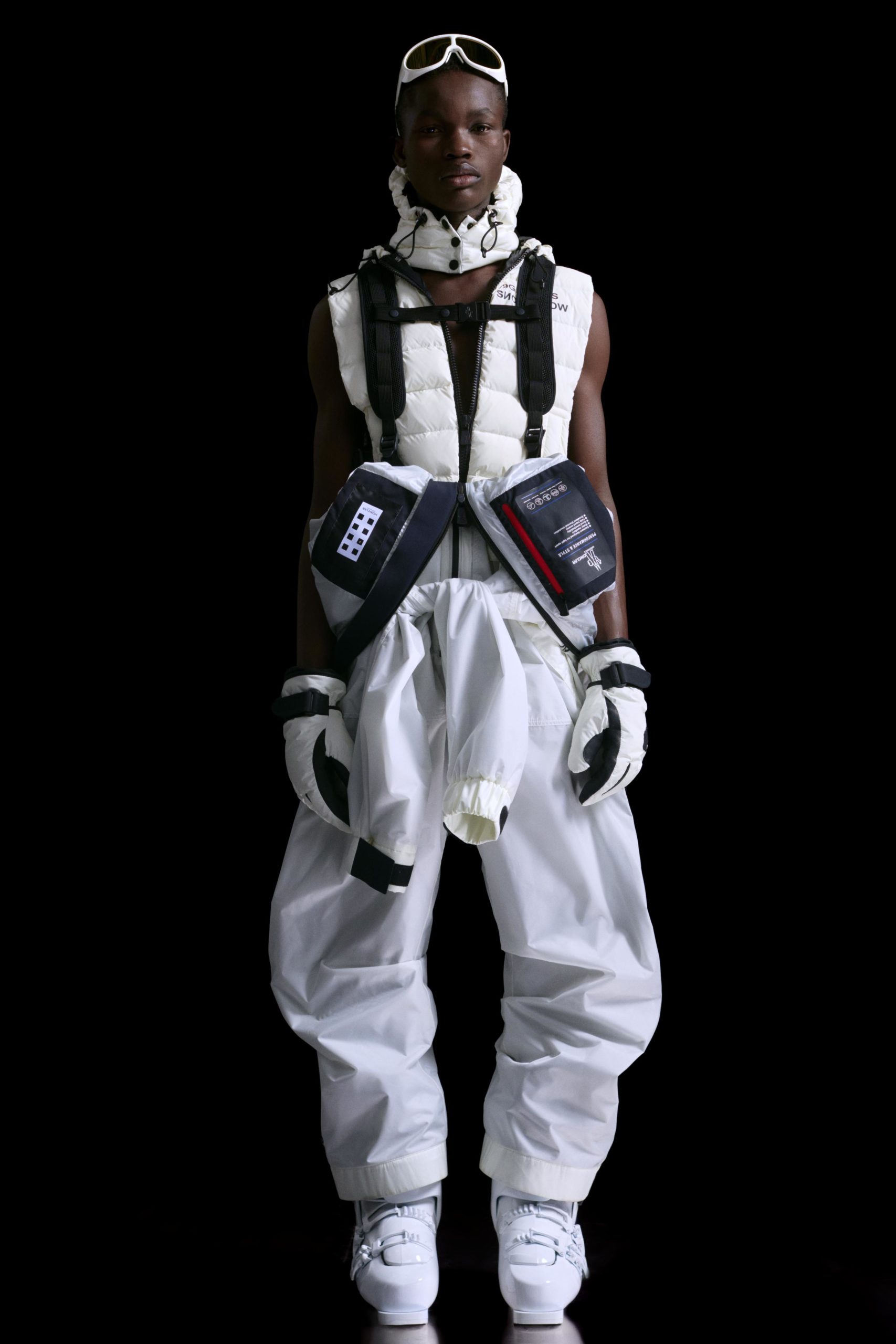 3 Moncler Grenoble, collection faisant partie de Moncler Genius, traduit une vision pionnière de la montagne. Le directeur créatif, Sandro Mandrino, concentre son travail sur le design et la fonctionnalité, mais en y insufflant une mode audacieuse. Il crée une nouvelle variété de vêtements qui, tout en étant conçus pour la pratique intensive du ski avec des constructions innovantes et des tissus technologiques, sont aussi visuellement saisissants et adaptés à la vie hors des pistes. Cette saison, le look se construit autour de la superposition, des couleurs, de la flexibilité et de la polyvalence. On y trouve des salopettes, des doudounes, des bombers, des anoraks, des trenchs et des pull-overs qui se mélangent, s’assortissent, se superposent et s’assemblent avec gaité. Une profusion de graffitis colorés – de coups de pinceau, de logos dessinés au crayon et de formes joyeuses – inonde la surface, renforcée par un mélange de nylons mats et brillants et de mailles douces. Une palette vive comme un l’arc-en-ciel se contraste avec des silhouettes totalement noires ou blanches. On retrouve l’innovation en matière de tissus essentiellement dans les looks blancs, avec deux technologies différentes mais tout aussi innovantes. Le Dyneema®, fibre à la fois la plus robuste et la plus durable au monde, qui est 15 fois plus résistante que l’acier, mais assez légère pour flotter sur l’eau. Et Snow Glow, une membrane photoluminescente qui brille dans le noir après avoir été exposée au soleil ou à une lumière chaude artificielle.
