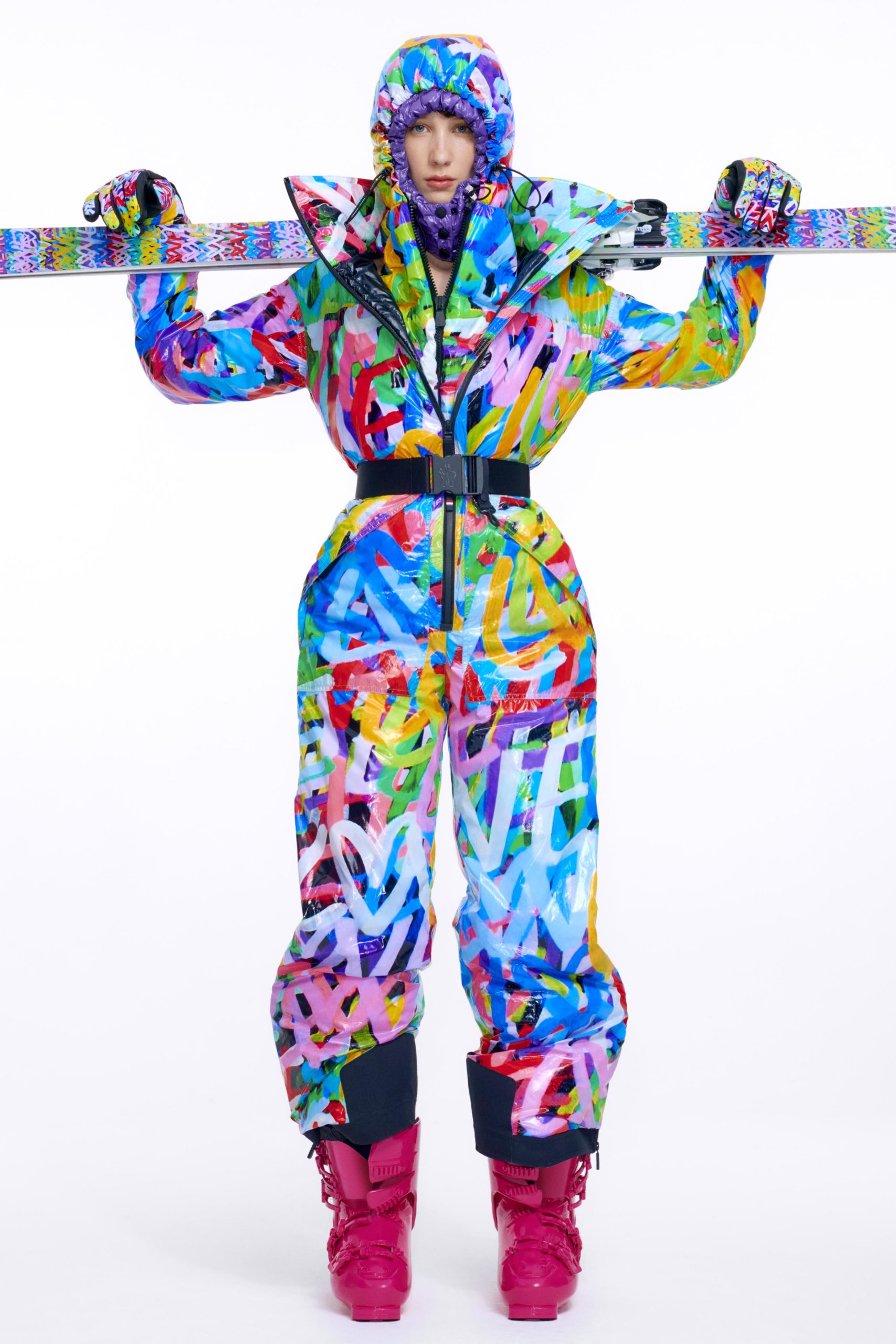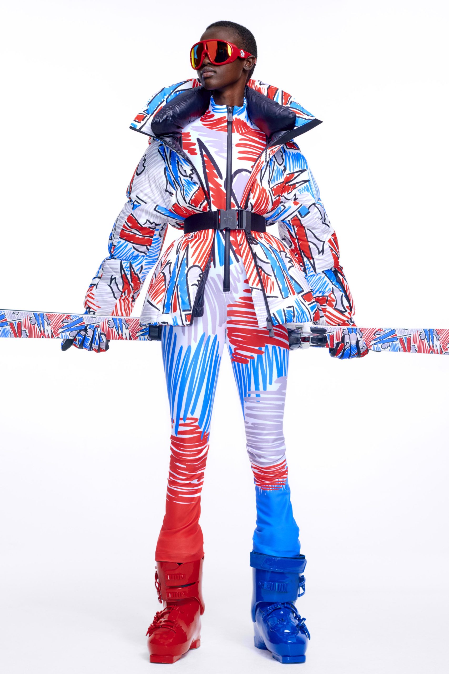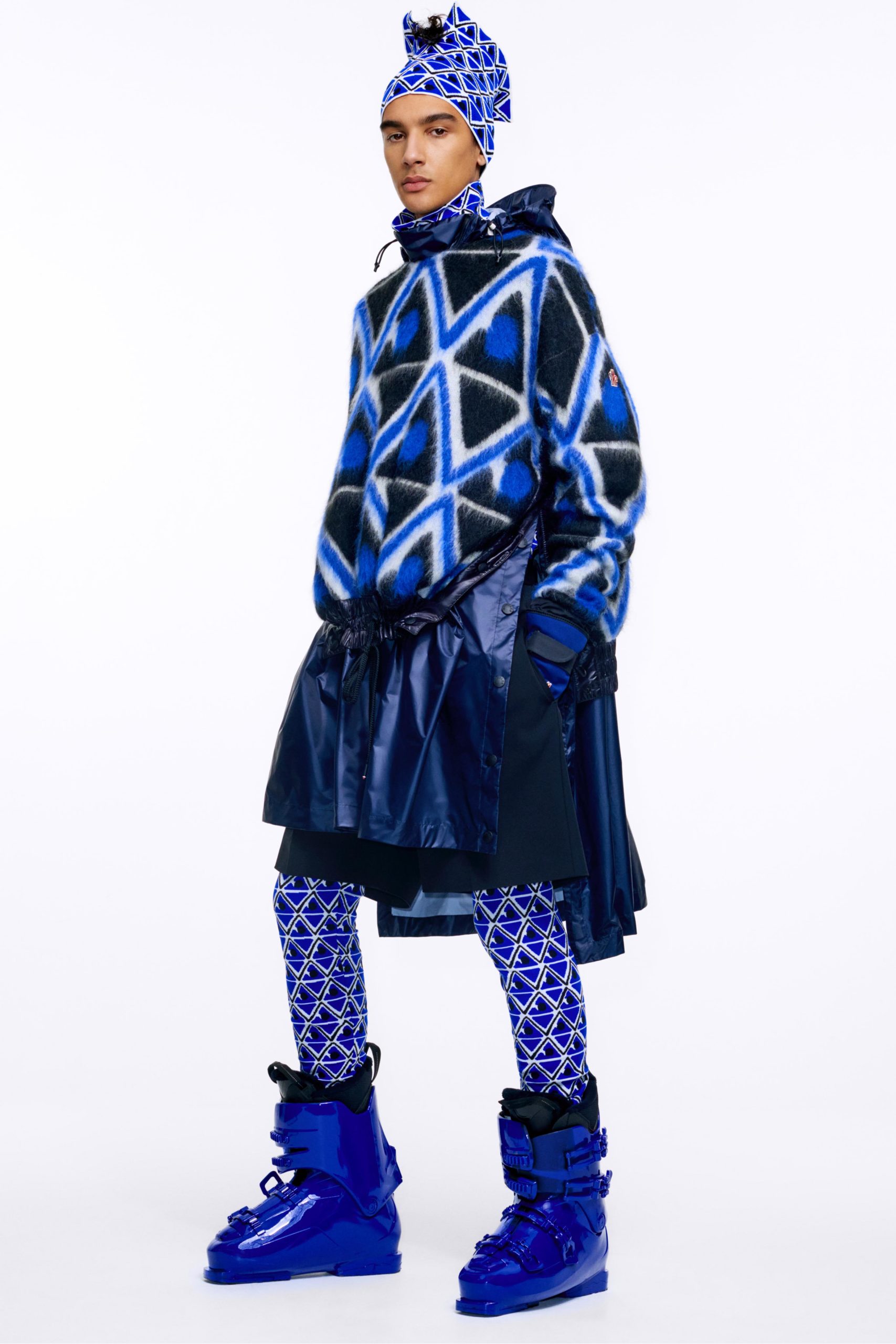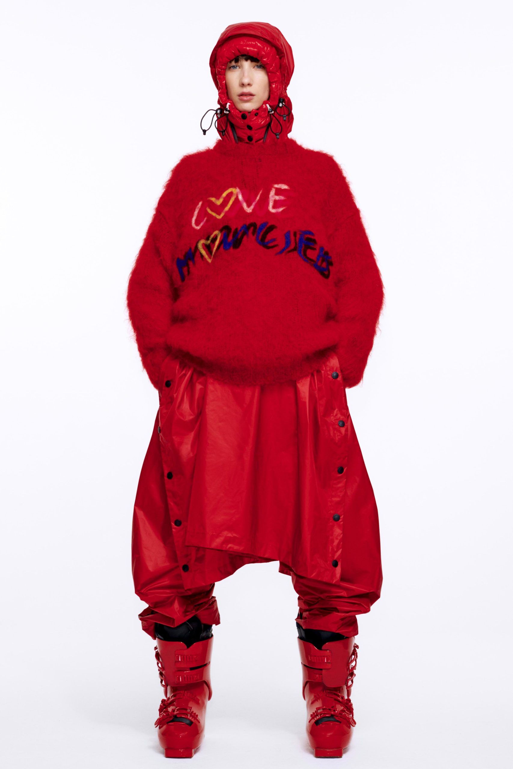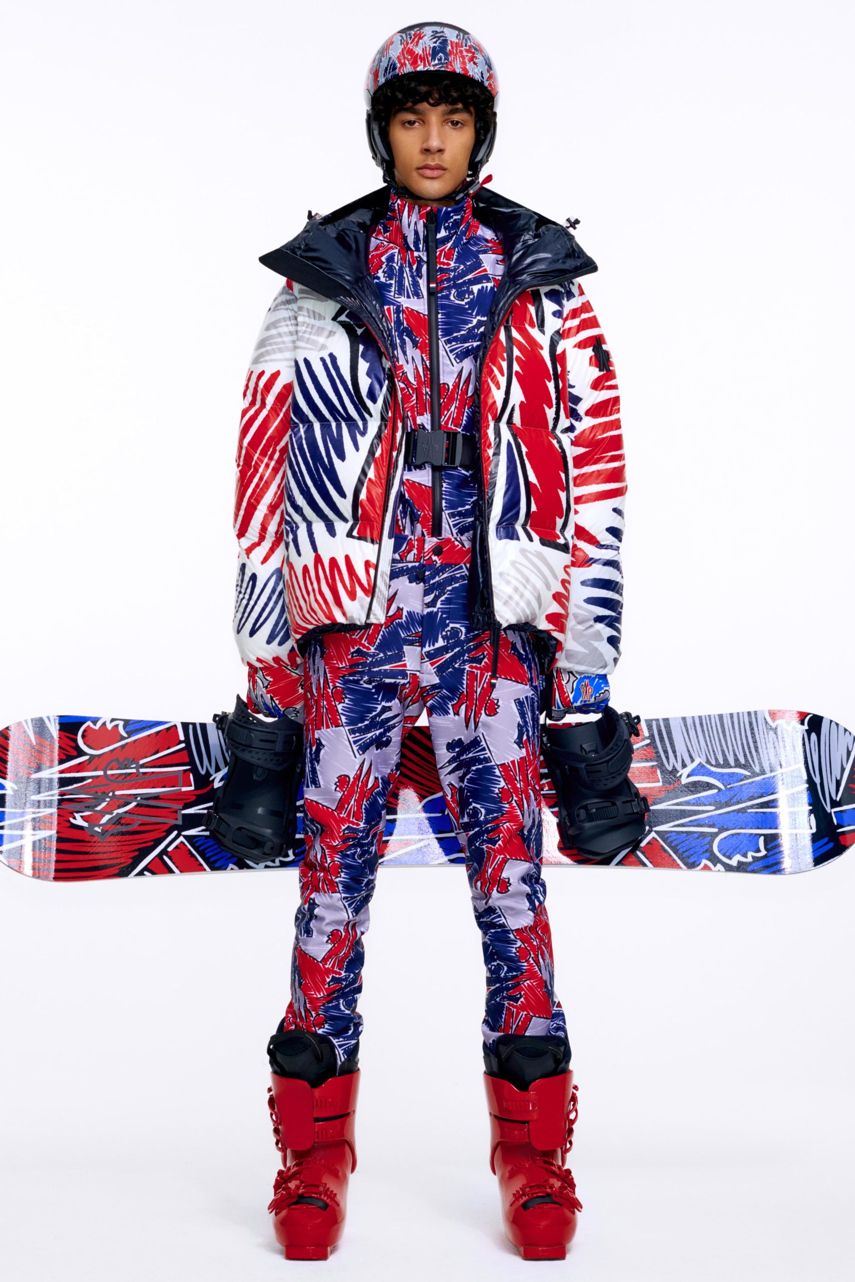 3 Moncler Grenoble, collection faisant partie de Moncler Genius, traduit une vision pionnière de la montagne. Le directeur créatif, Sandro Mandrino, concentre son travail sur le design et la fonctionnalité, mais en y insufflant une mode audacieuse. Il crée une nouvelle variété de vêtements qui, tout en étant conçus pour la pratique intensive du ski avec des constructions innovantes et des tissus technologiques, sont aussi visuellement saisissants et adaptés à la vie hors des pistes. Cette saison, le look se construit autour de la superposition, des couleurs, de la flexibilité et de la polyvalence. On y trouve des salopettes, des doudounes, des bombers, des anoraks, des trenchs et des pull-overs qui se mélangent, s’assortissent, se superposent et s’assemblent avec gaité. Une profusion de graffitis colorés – de coups de pinceau, de logos dessinés au crayon et de formes joyeuses – inonde la surface, renforcée par un mélange de nylons mats et brillants et de mailles douces. Une palette vive comme un l’arc-en-ciel se contraste avec des silhouettes totalement noires ou blanches. On retrouve l’innovation en matière de tissus essentiellement dans les looks blancs, avec deux technologies différentes mais tout aussi innovantes. Le Dyneema®, fibre à la fois la plus robuste et la plus durable au monde, qui est 15 fois plus résistante que l’acier, mais assez légère pour flotter sur l’eau. Et Snow Glow, une membrane photoluminescente qui brille dans le noir après avoir été exposée au soleil ou à une lumière chaude artificielle.