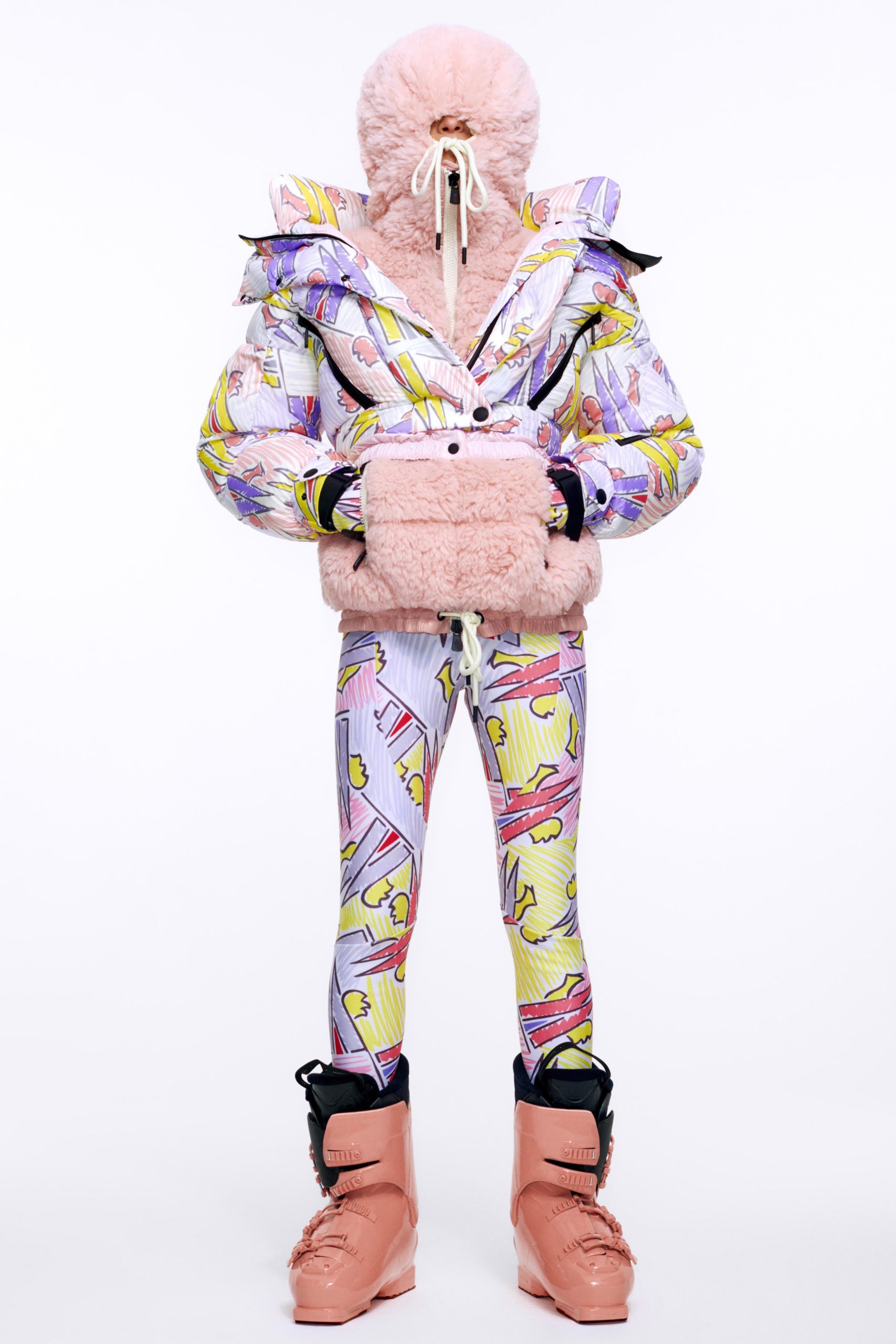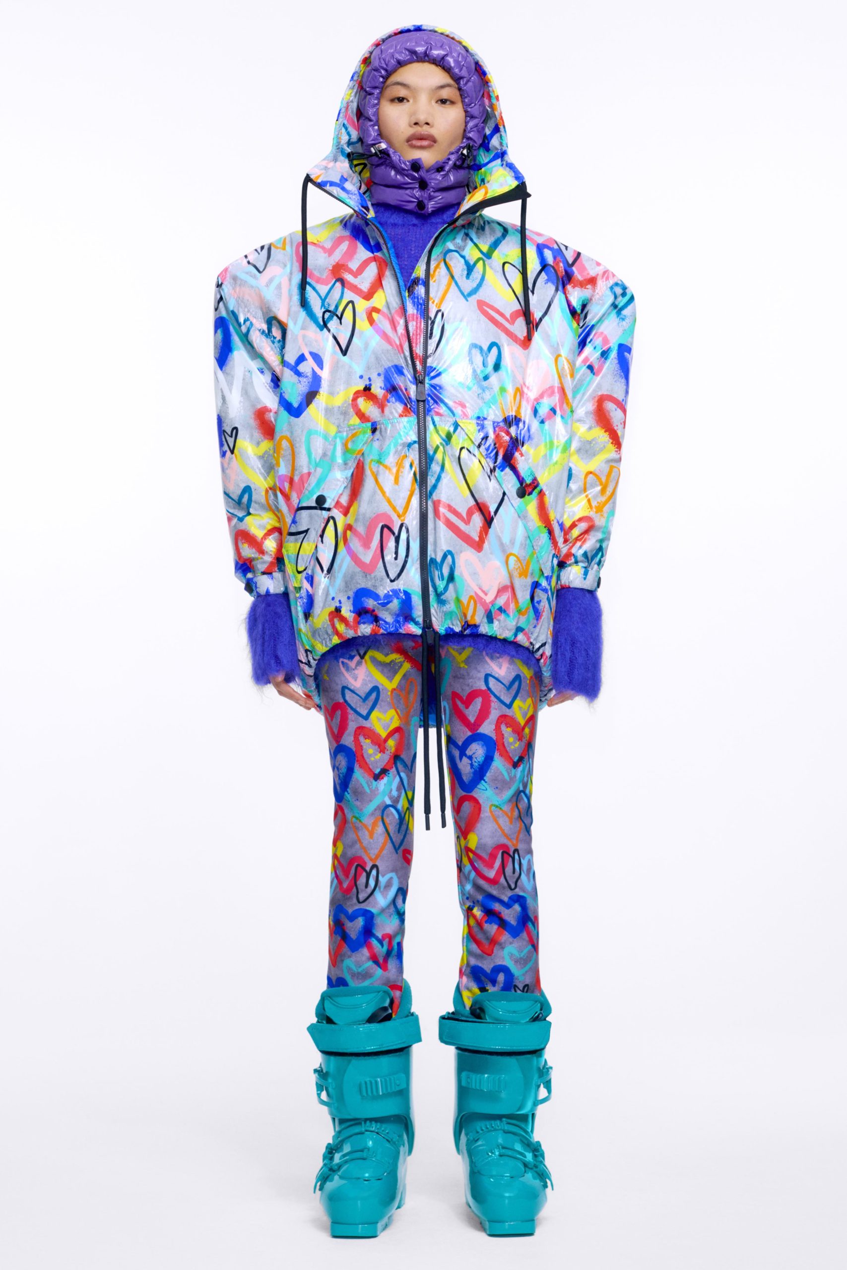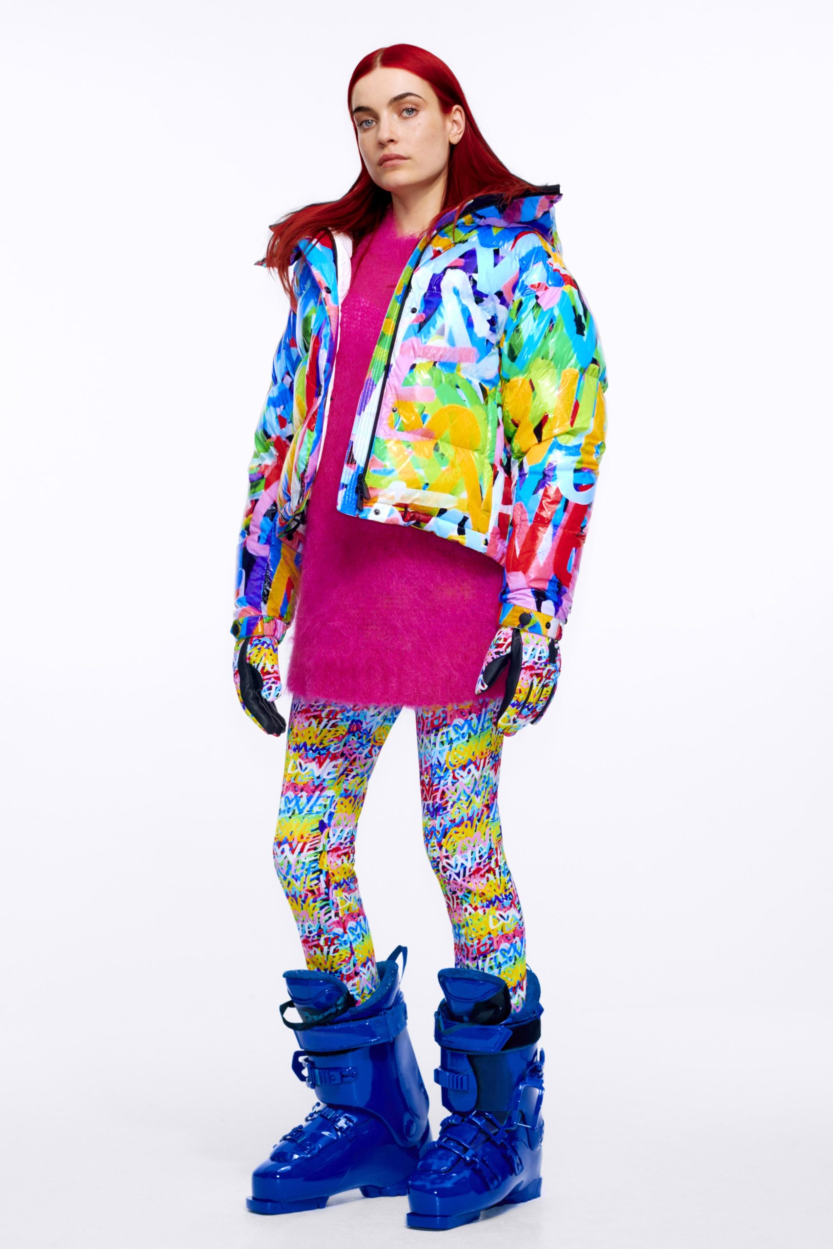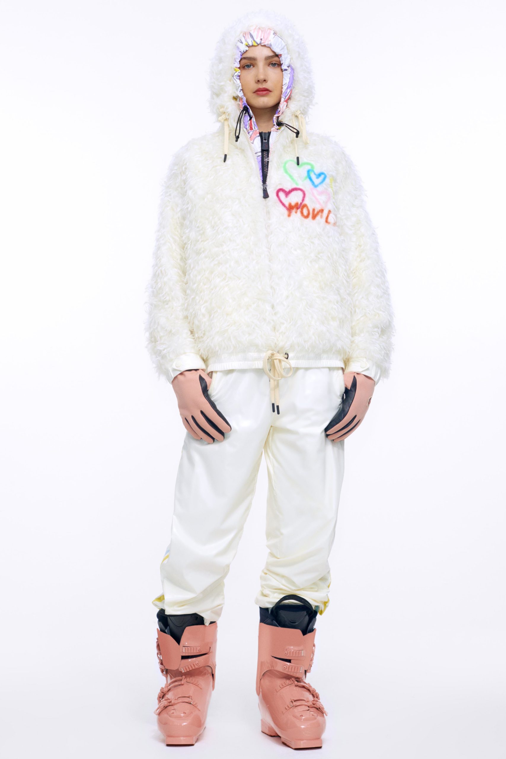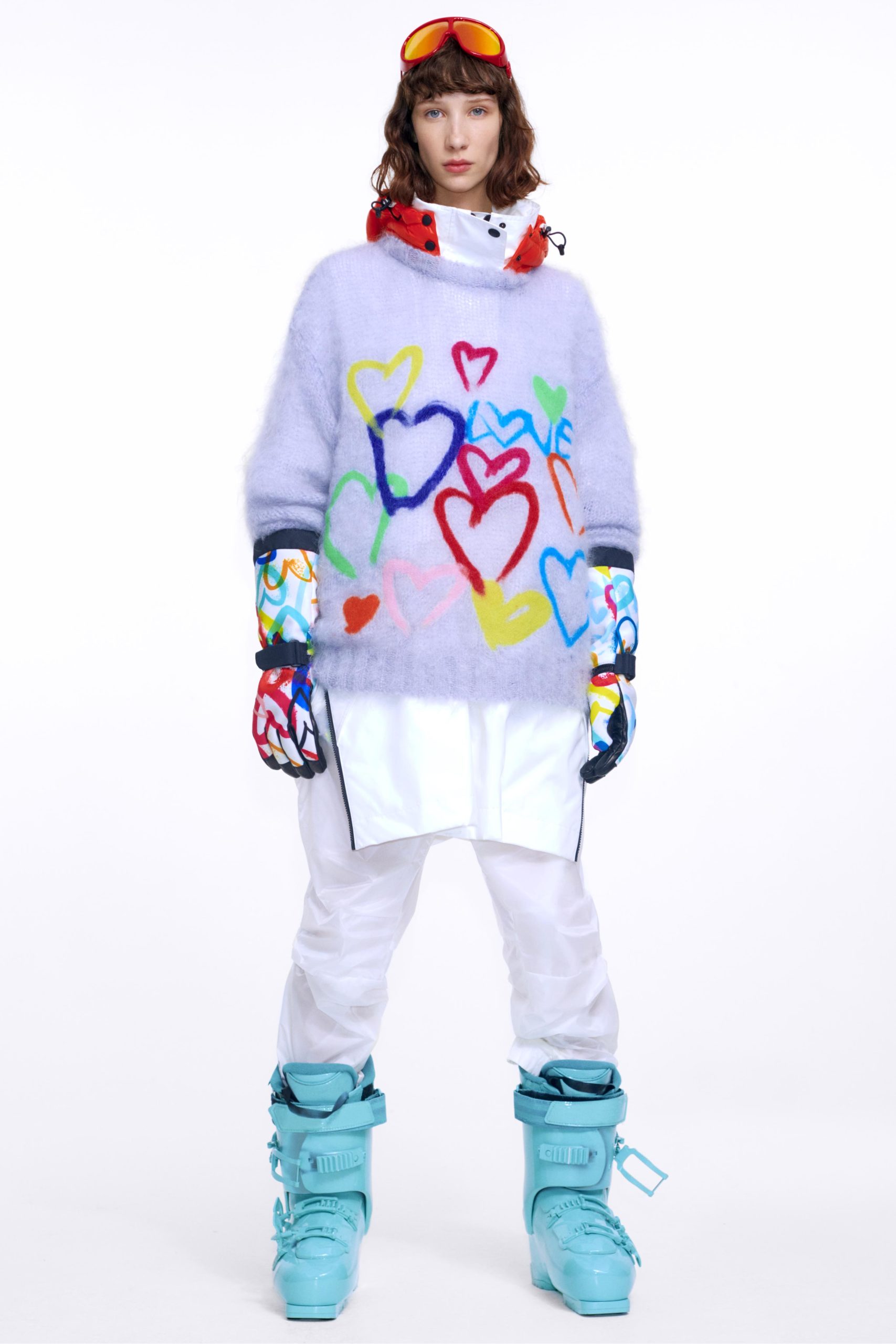3 Moncler Grenoble, collection faisant partie de Moncler Genius, traduit une vision pionnière de la montagne. Le directeur créatif, Sandro Mandrino, concentre son travail sur le design et la fonctionnalité, mais en y insufflant une mode audacieuse. Il crée une nouvelle variété de vêtements qui, tout en étant conçus pour la pratique intensive du ski avec des constructions innovantes et des tissus technologiques, sont aussi visuellement saisissants et adaptés à la vie hors des pistes. Cette saison, le look se construit autour de la superposition, des couleurs, de la flexibilité et de la polyvalence. On y trouve des salopettes, des doudounes, des bombers, des anoraks, des trenchs et des pull-overs qui se mélangent, s’assortissent, se superposent et s’assemblent avec gaité. Une profusion de graffitis colorés – de coups de pinceau, de logos dessinés au crayon et de formes joyeuses – inonde la surface, renforcée par un mélange de nylons mats et brillants et de mailles douces. Une palette vive comme un l’arc-en-ciel se contraste avec des silhouettes totalement noires ou blanches. On retrouve l’innovation en matière de tissus essentiellement dans les looks blancs, avec deux technologies différentes mais tout aussi innovantes. Le Dyneema®, fibre à la fois la plus robuste et la plus durable au monde, qui est 15 fois plus résistante que l’acier, mais assez légère pour flotter sur l’eau. Et Snow Glow, une membrane photoluminescente qui brille dans le noir après avoir été exposée au soleil ou à une lumière chaude artificielle.