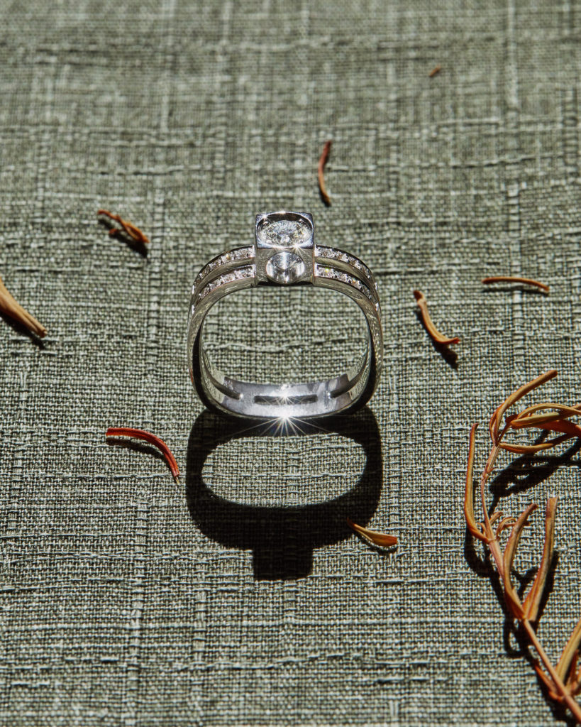 Avec sa dernière création qui sonne comme une déclaration, la collection Le Cube Diamant s’étoffe d’une bague à corps carré épousant pour la vie le doigt de celle qui la porte. Entouré de deux rubans étincelants, un diamant comme sublimé qui confère un caractère d’éternité à ce jour si particulier. A associer aux créations de notre sélection mariage.