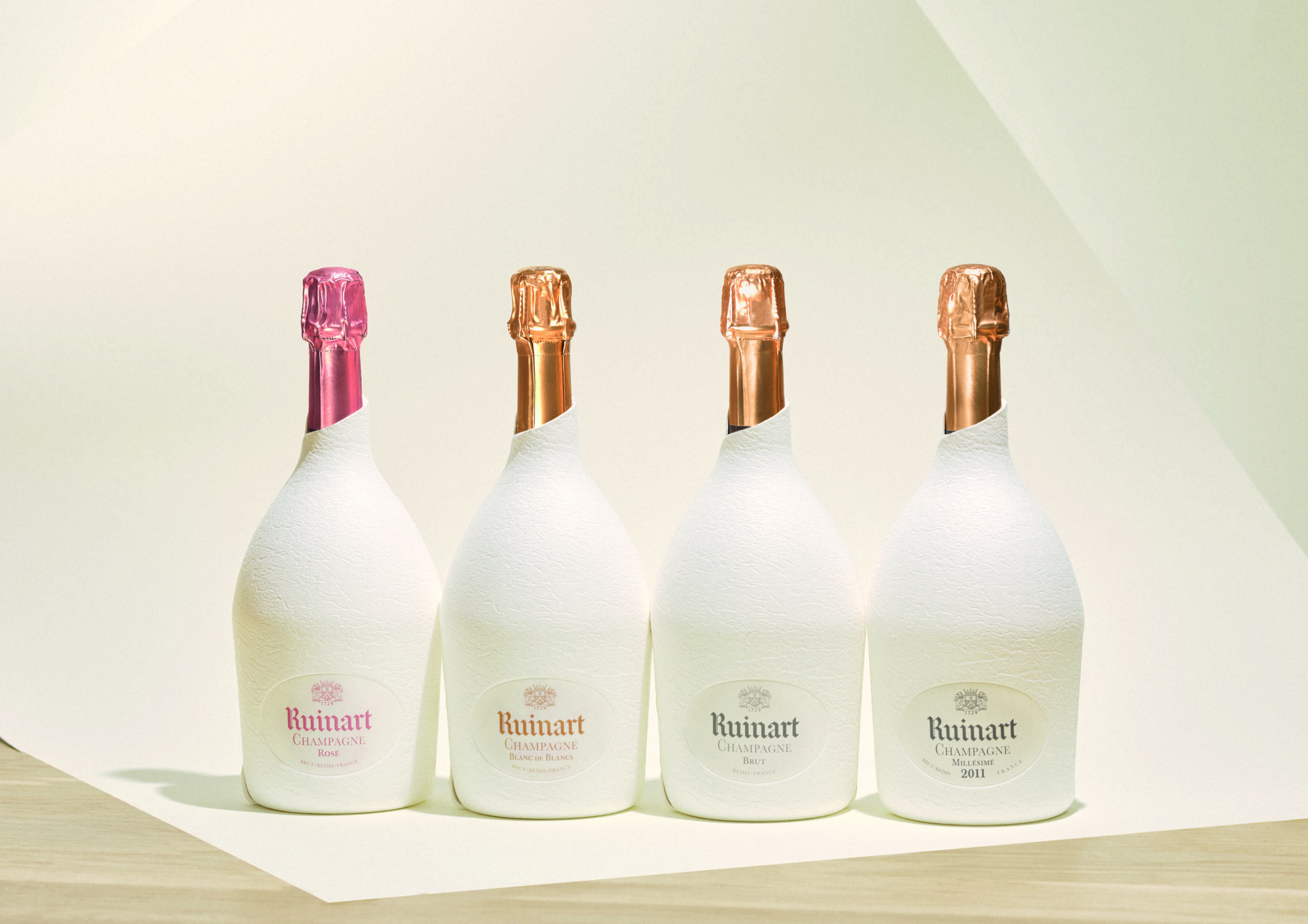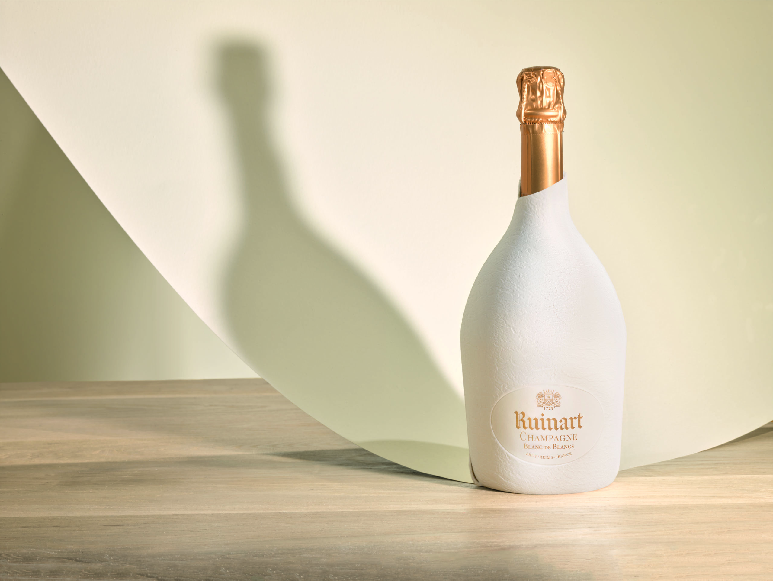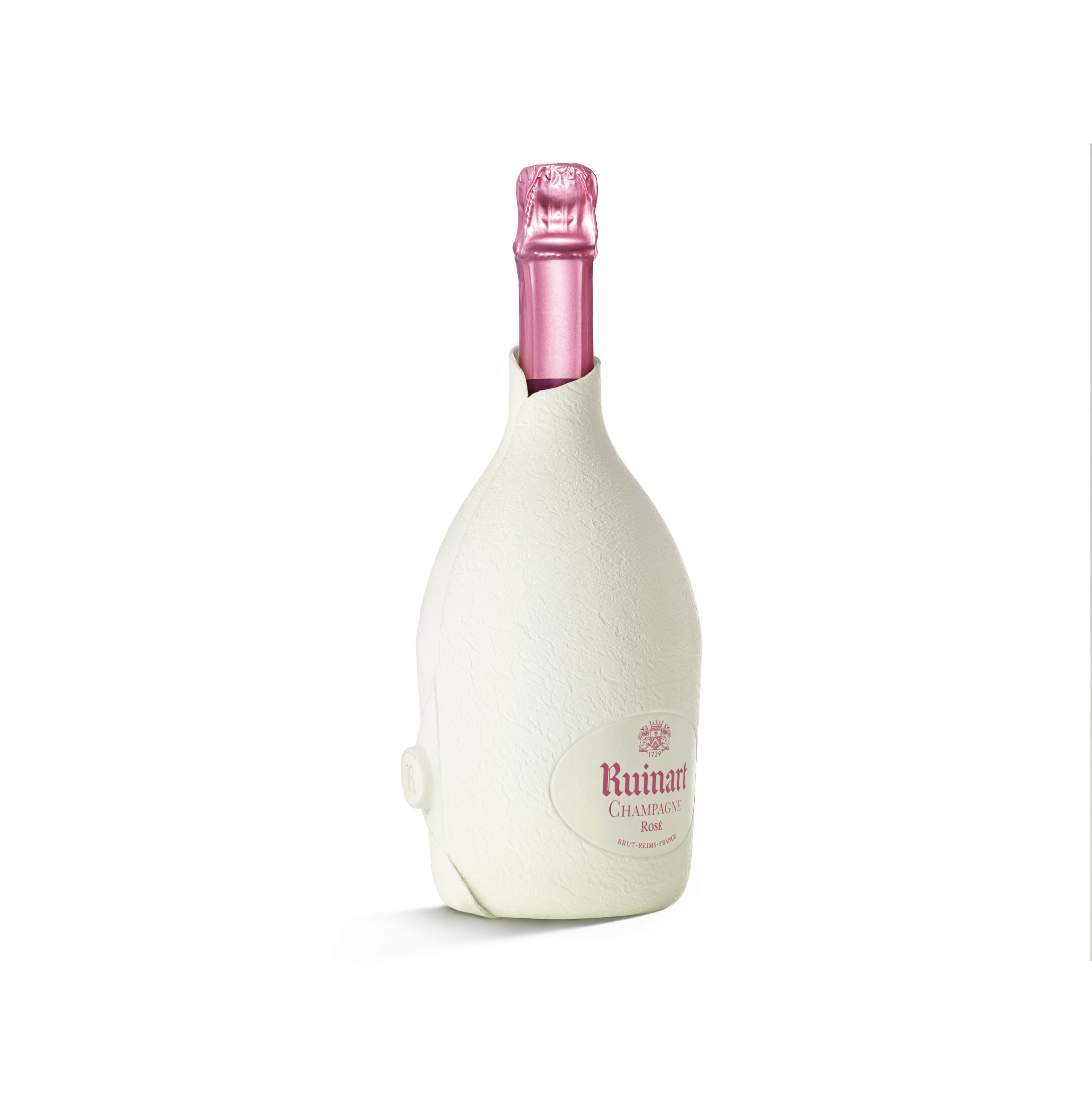 Au total, 7 prototypes furent nécessaires pour mettre au point cette coque en pulpe de papier qui épouse les contours de la bouteille, l’embellit et préserve le goût Ruinart. L’étui seconde peau est réalisé entièrement en papier, est 100 % recyclable, 9 fois plus léger que la précédente génération de coffrets.