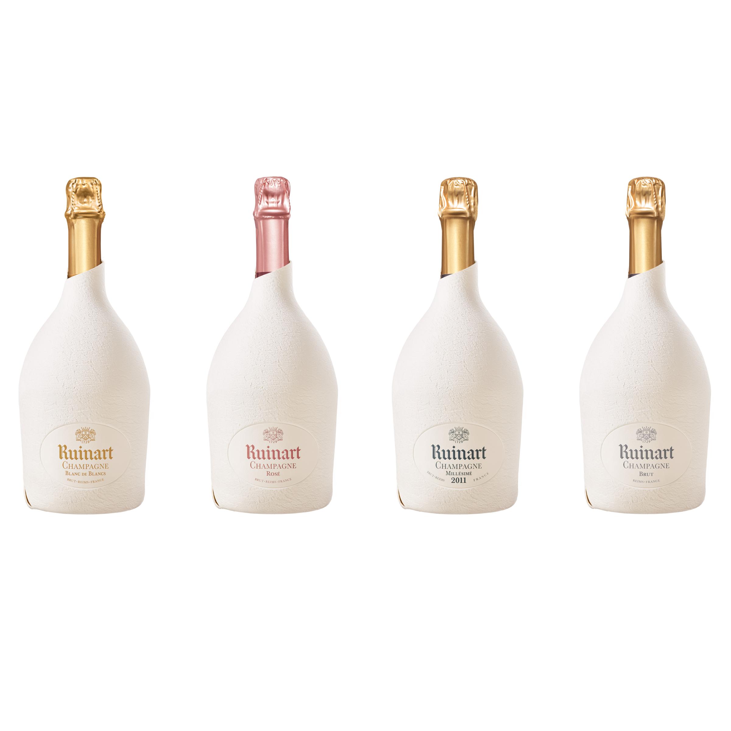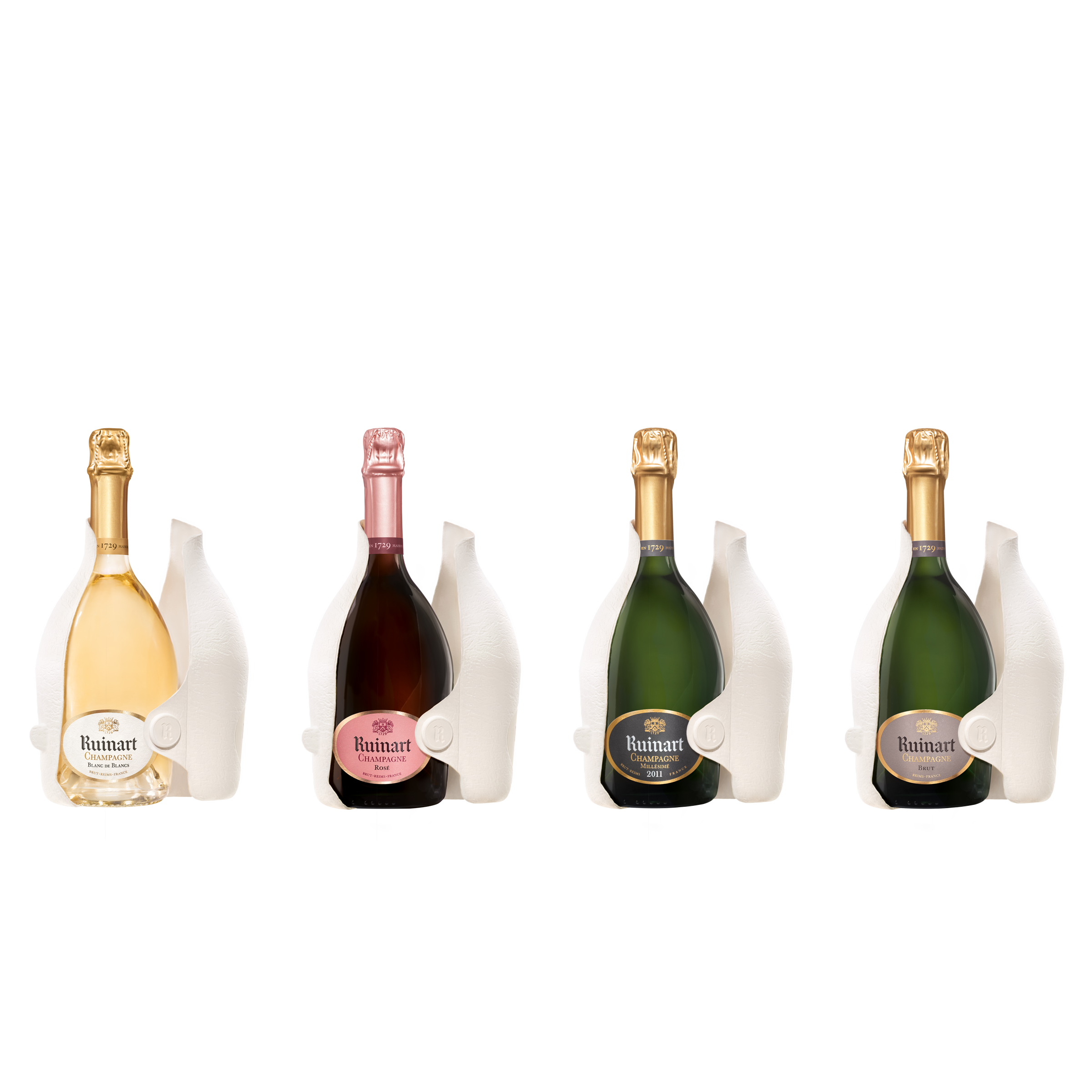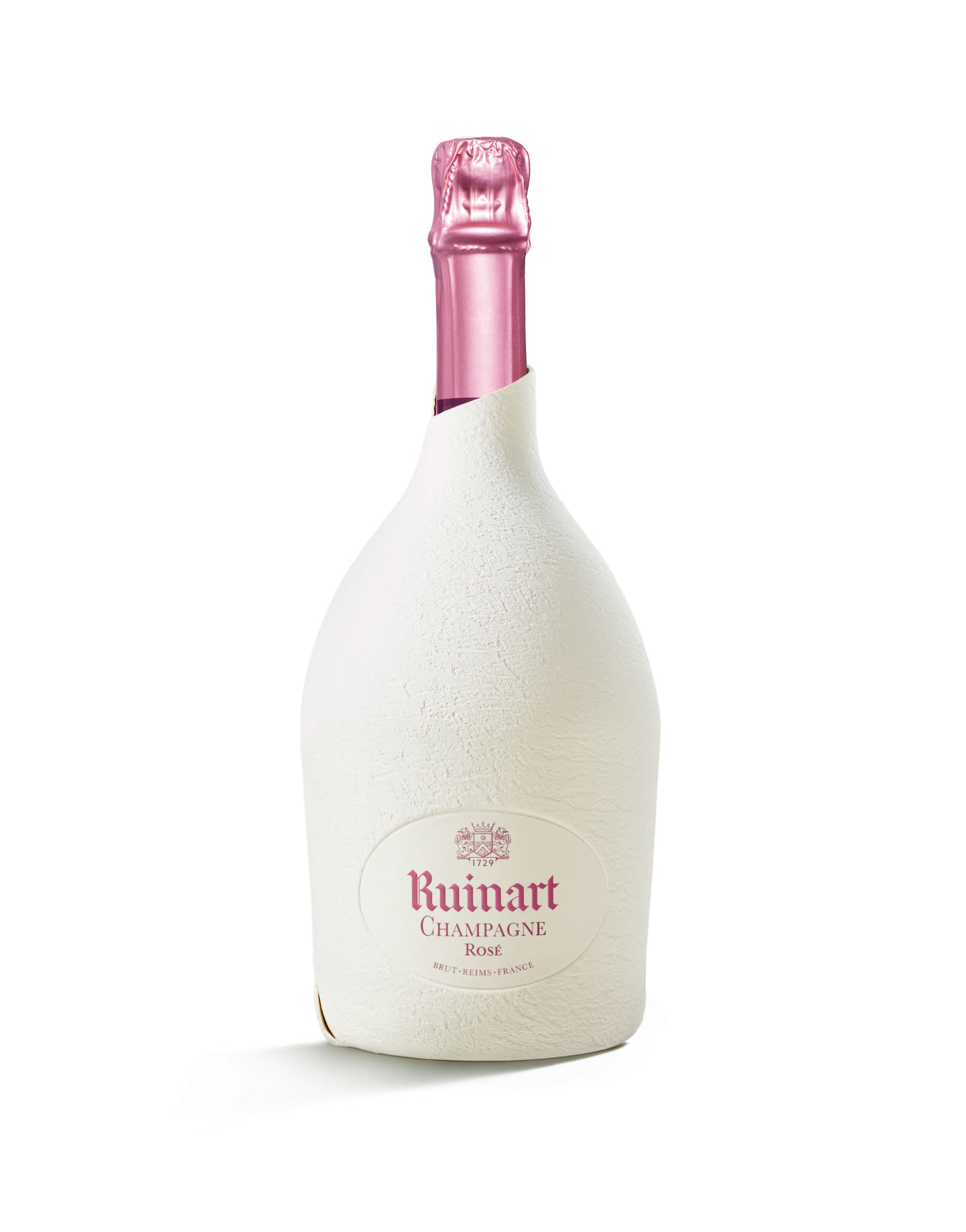 Au total, 7 prototypes furent nécessaires pour mettre au point cette coque en pulpe de papier qui épouse les contours de la bouteille, l’embellit et préserve le goût Ruinart. L’étui seconde peau est réalisé entièrement en papier, est 100 % recyclable, 9 fois plus léger que la précédente génération de coffrets.