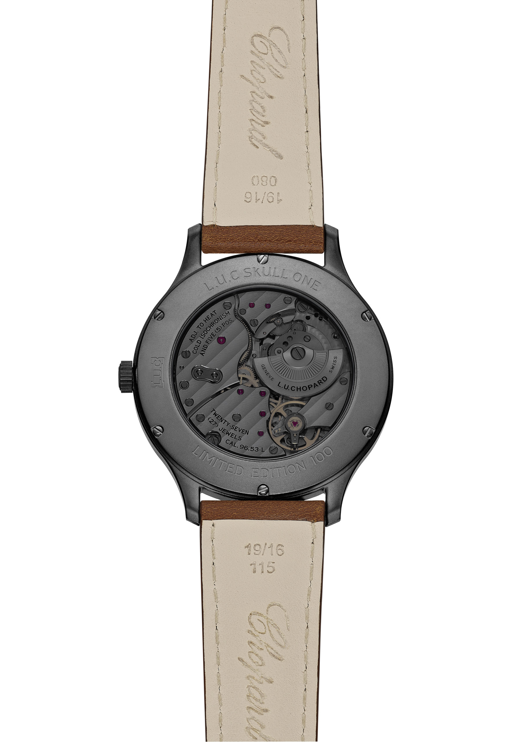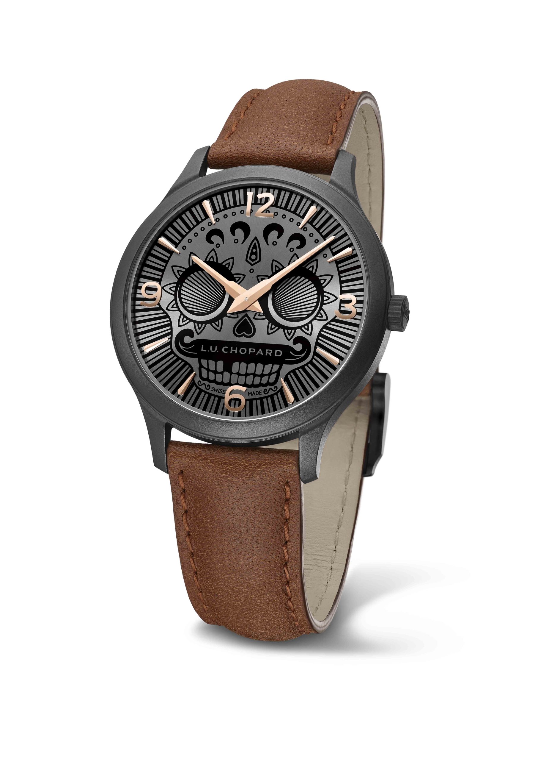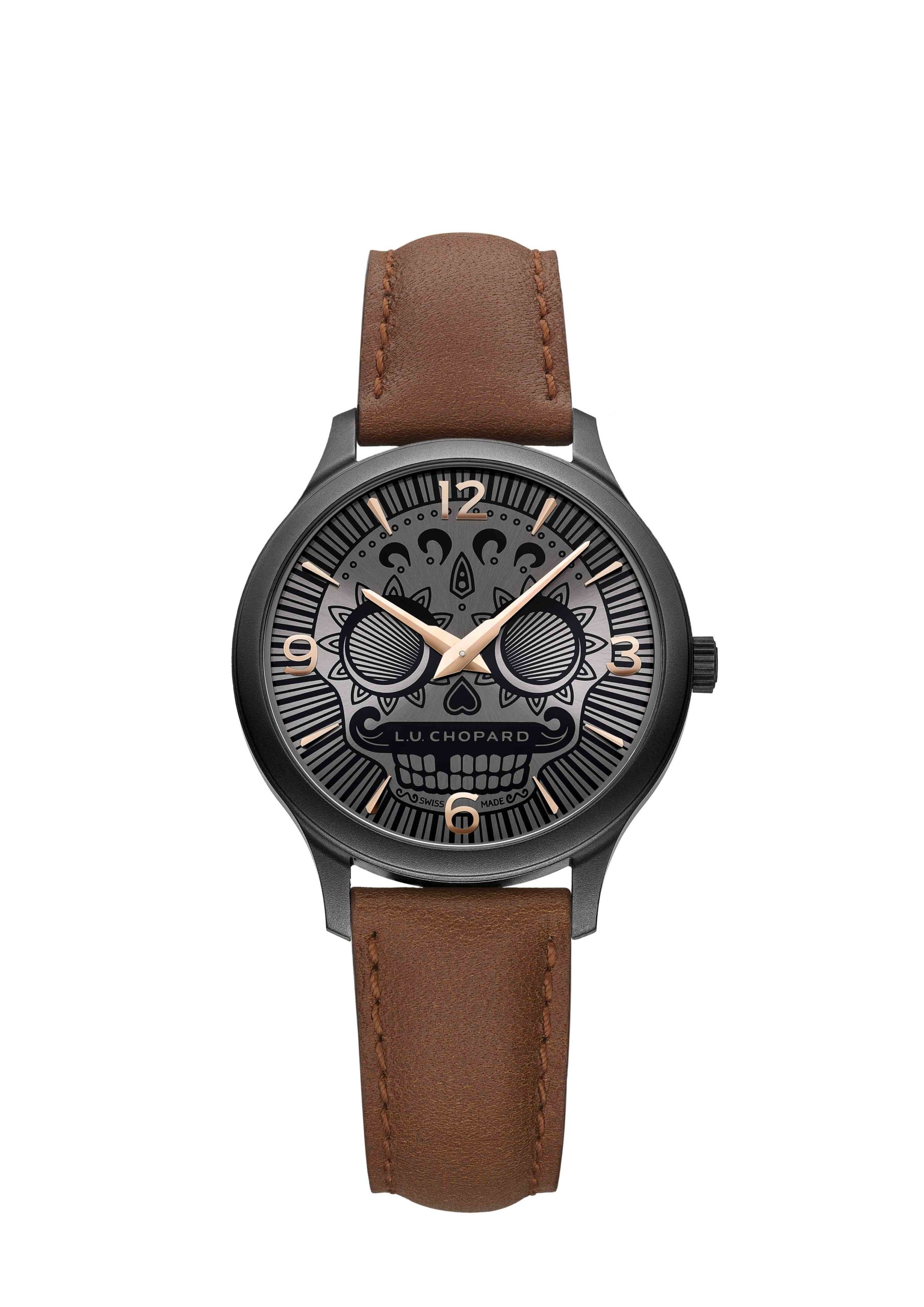 la L.U.C Skull One présente un boîtier de 40 mm en acier inoxydable DLC microbillé et un bracelet en cuir de veau brun.