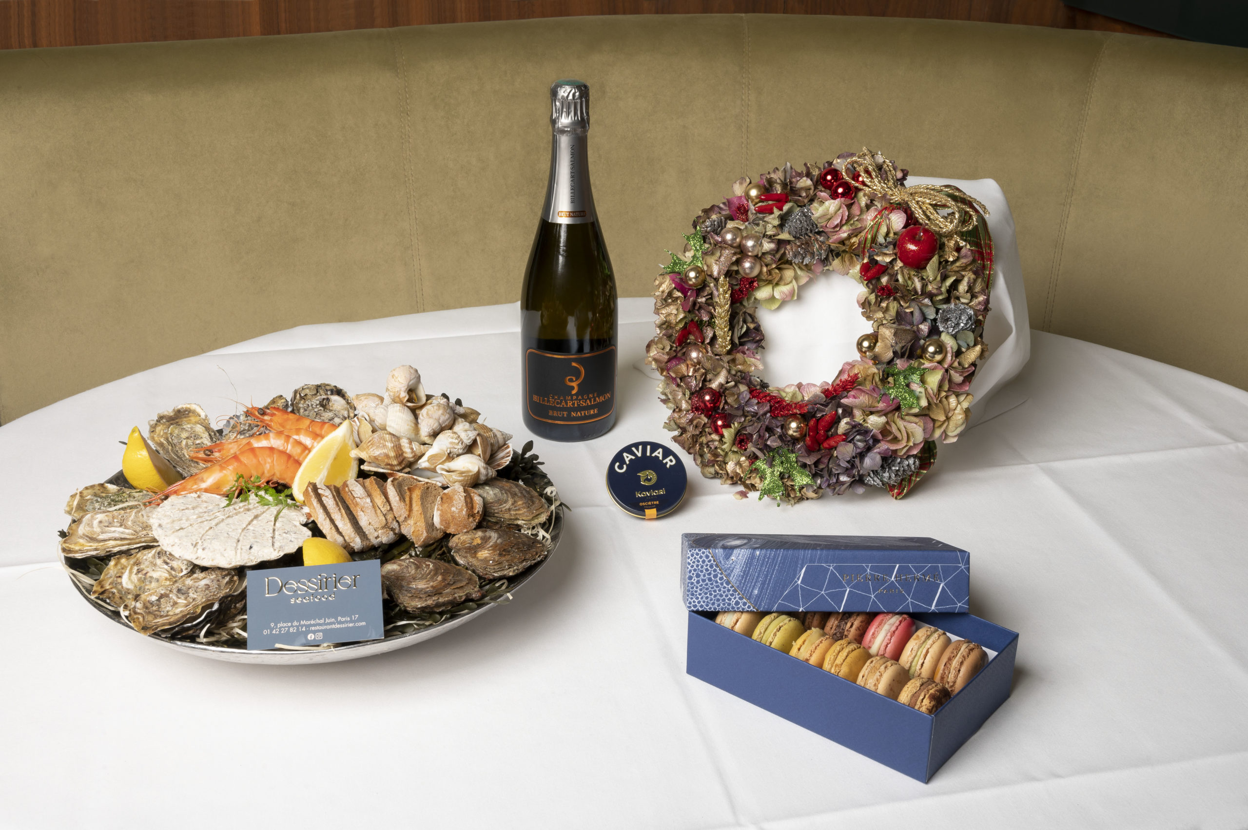Ce coffret comprend un plateau de fruits de mer du restaurant emblématique Dessirier, une bouteille de champagne Brut Nature Billecart-Salmon, un coffret de macarons de Pierre Hermé, une boîte de caviar osciètre Kaviari et une création florale de la Maison Lachaume, le tout à prix doux.