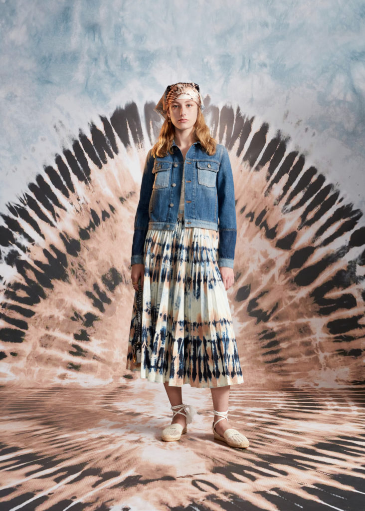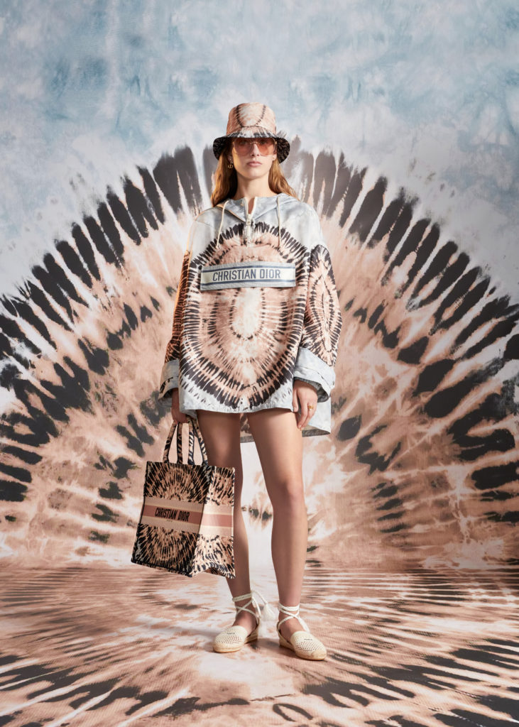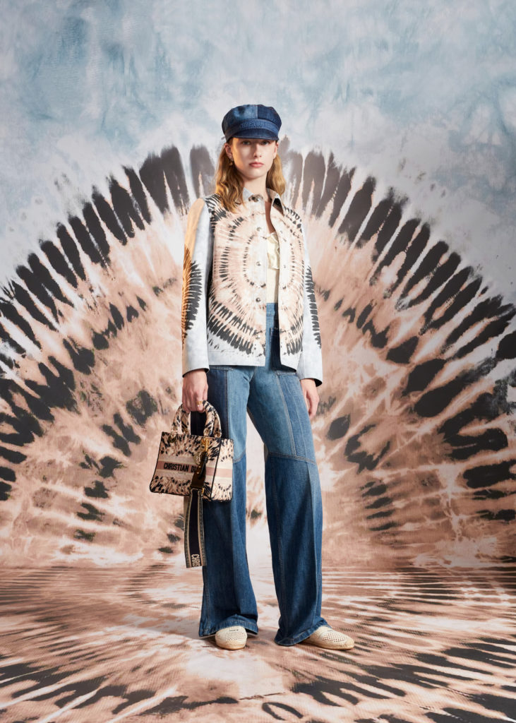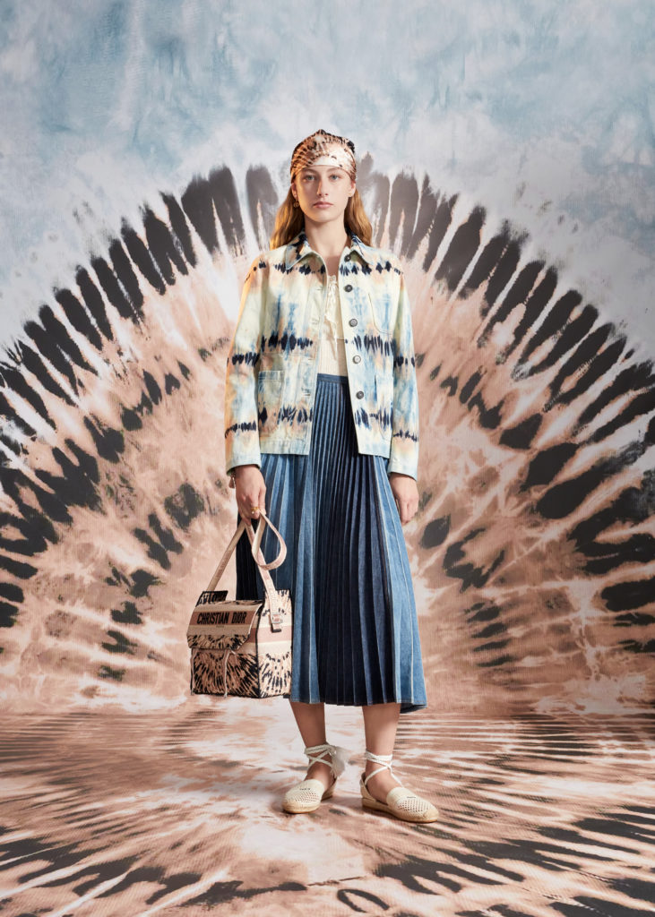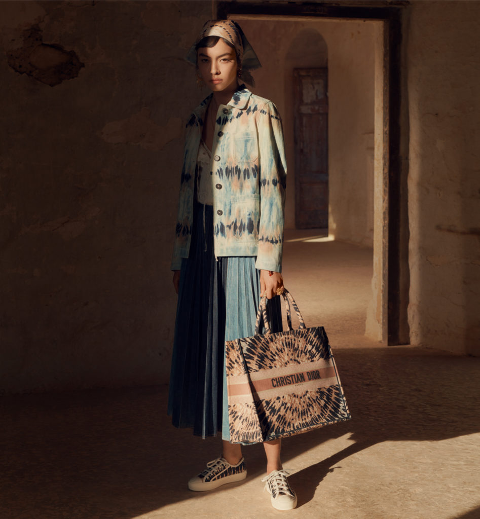 Hommage à la beauté et aux artisanats inestimables des Pouilles, terre de cœur de Maria Grazia Chiuri, la collection croisière 2021 célèbre les codes de Dior et les motifs chers à la Directrice Artistique, à l’instar du Tie & Dior. Témoignage d’un savoir-faire d’excellence, cette précieuse technique de teinture colore des jupes longues, des chemises fluides, un pantalon évasé et son top assorti, dans une palette de nuances délicates variant du rose pâle au bleu ciel, des notes douces soulignées par la profondeur du noir. Ces dessins hypnotiques se déploient également sur des foulards et les sacs iconiques Lady Dior et Dior Book Tote, magnifiés par une broderie de coton tridimensionnelle ou un revêtement en denim délavé, autant d’effets de matières irrésistibles. Fruits d’une recherche et d’une expérimentation sans cesse réinventées, ces tissus au rendu surprenant et unique sont devenus un emblème de la Maison.