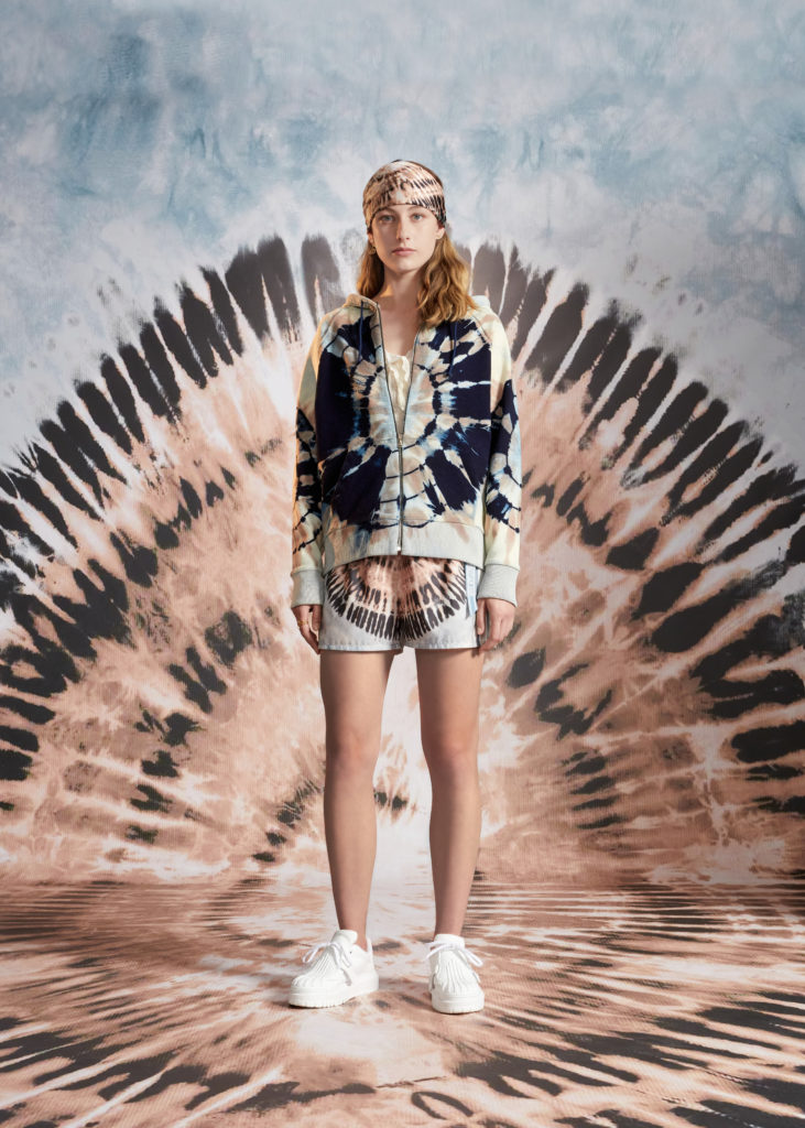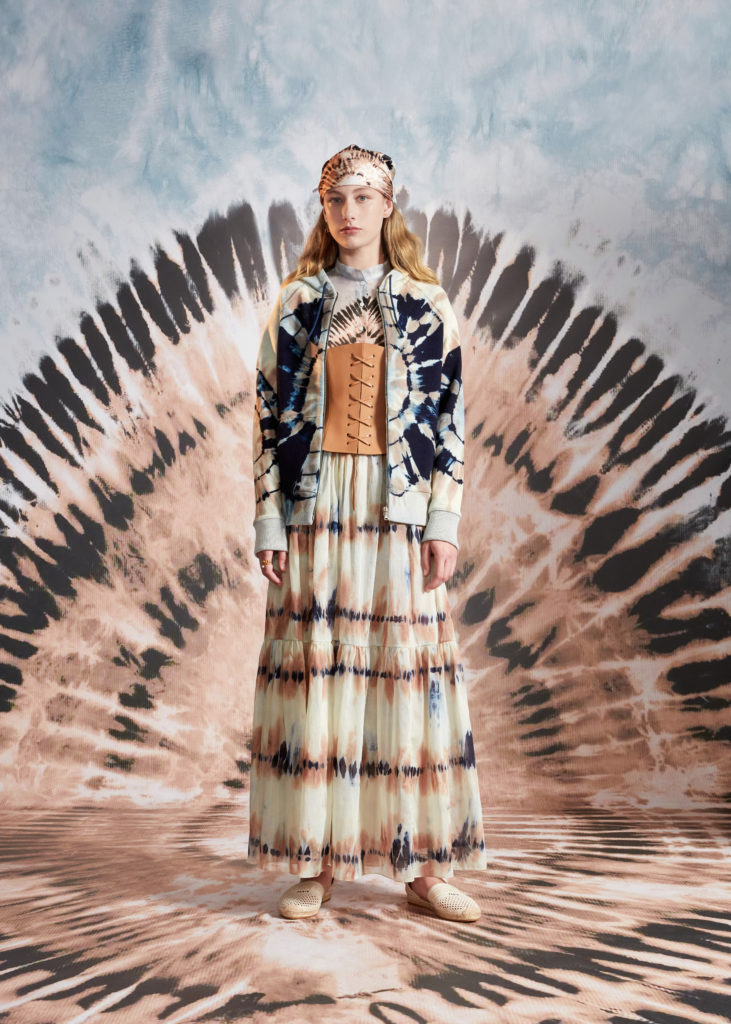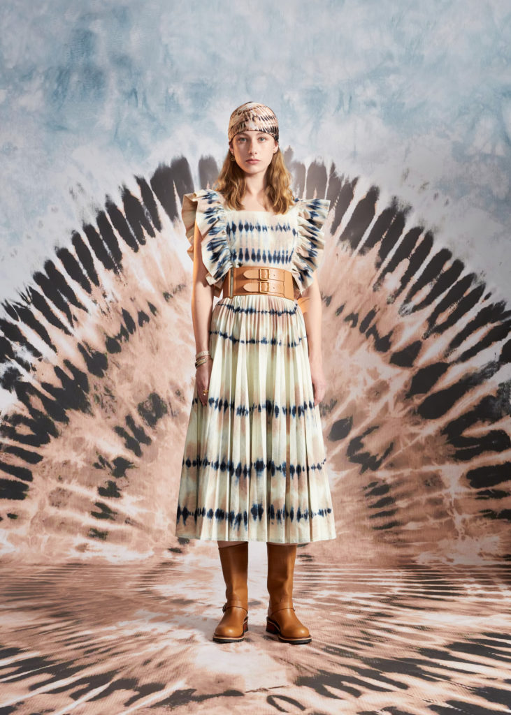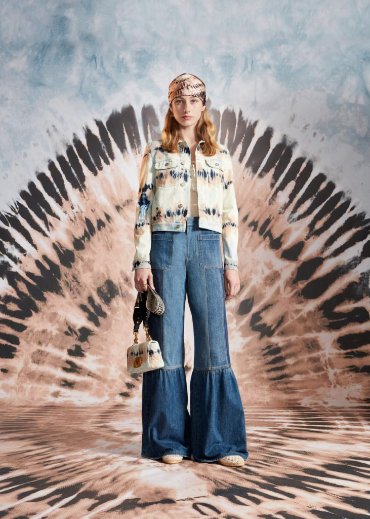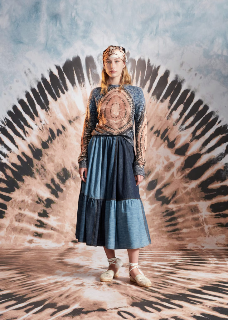 Hommage à la beauté et aux artisanats inestimables des Pouilles, terre de cœur de Maria Grazia Chiuri, la collection croisière 2021 célèbre les codes de Dior et les motifs chers à la Directrice Artistique, à l’instar du Tie & Dior. Témoignage d’un savoir-faire d’excellence, cette précieuse technique de teinture colore des jupes longues, des chemises fluides, un pantalon évasé et son top assorti, dans une palette de nuances délicates variant du rose pâle au bleu ciel, des notes douces soulignées par la profondeur du noir. Ces dessins hypnotiques se déploient également sur des foulards et les sacs iconiques Lady Dior et Dior Book Tote, magnifiés par une broderie de coton tridimensionnelle ou un revêtement en denim délavé, autant d’effets de matières irrésistibles. Fruits d’une recherche et d’une expérimentation sans cesse réinventées, ces tissus au rendu surprenant et unique sont devenus un emblème de la Maison.