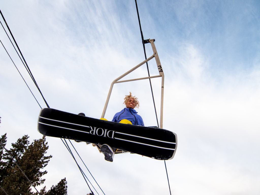 Kailand Morris wore a Dior Men Ski Capsule collection purple Dior and Descente technical canvas hooded parka, yellow Dior and Descente technical canvas ski pants, Dior snow lace-up ankle boots and a navy blue Dior Oblique and AK SKI snowboard.