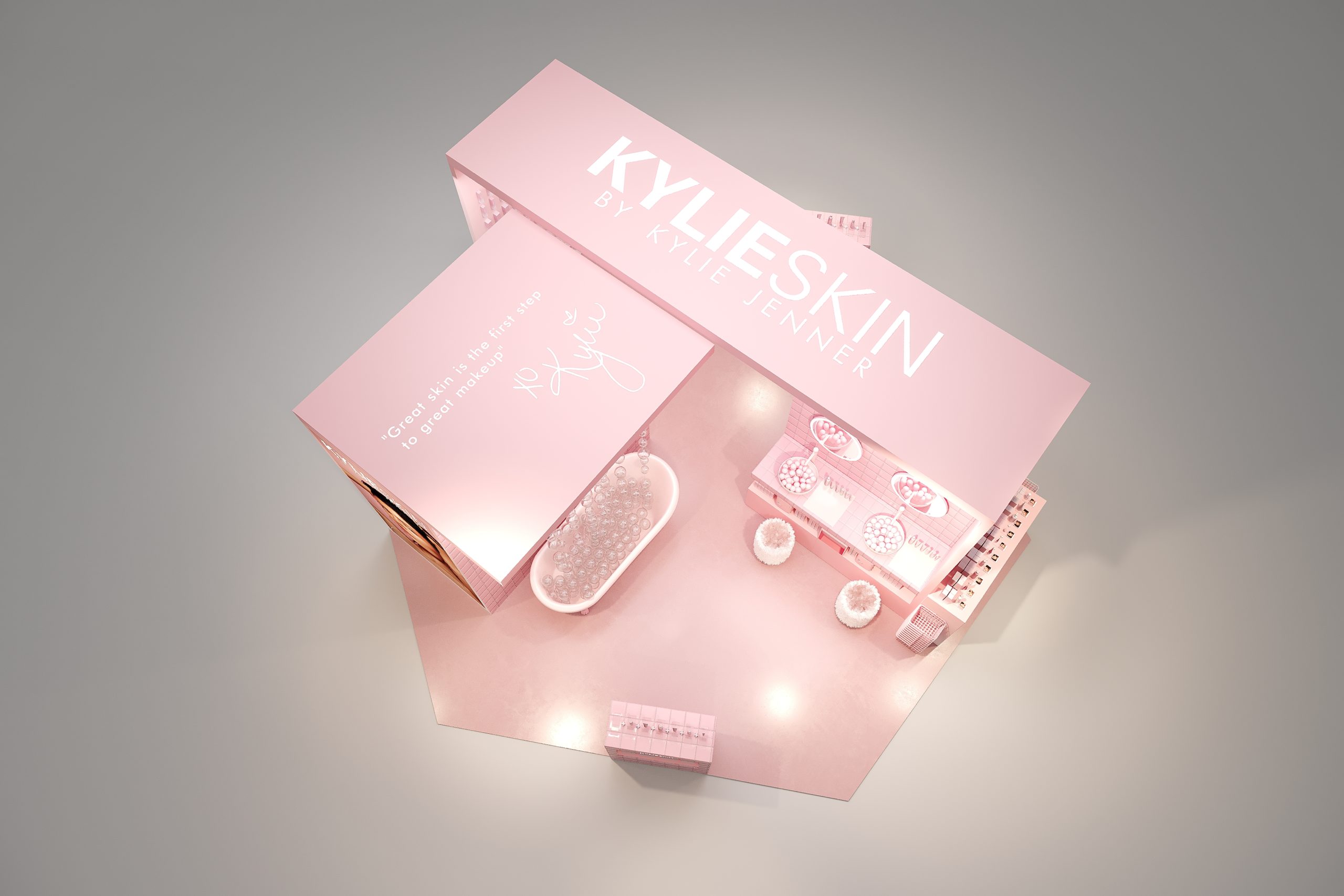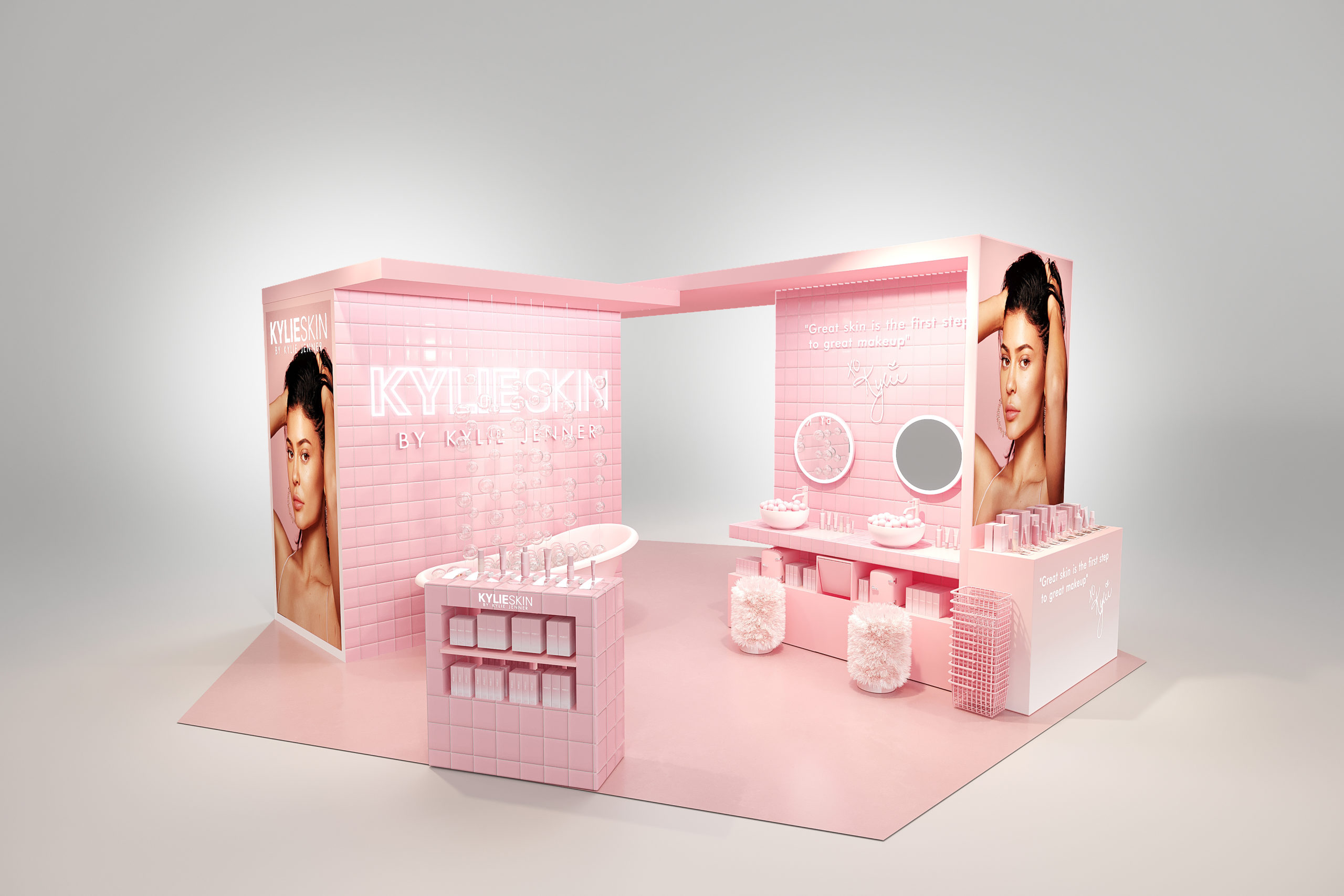 Les Galeries Lafayette Champs-Elysées accueillent Kylie Skin le temps d’un pop-up store immersif. Du 25 janvier au 16 février 2021, les visiteurs peuvent découvrir une reproduction de la salle de bain de Kylie, placée au cœur de l’Atrium du grand magasin. Cet espace met en avant les sept produits indispensables de la routine soin visage by Kylie : une crème pour le contour des yeux, un exfoliant à la noix, un lait tonique à la vanille, une crème hydratante, un nettoyant mousse, un sérum à la vitamine C, un masque hydratant visage ; ainsi que deux soins pour le corps à la noix de coco : un lait et un gommage.