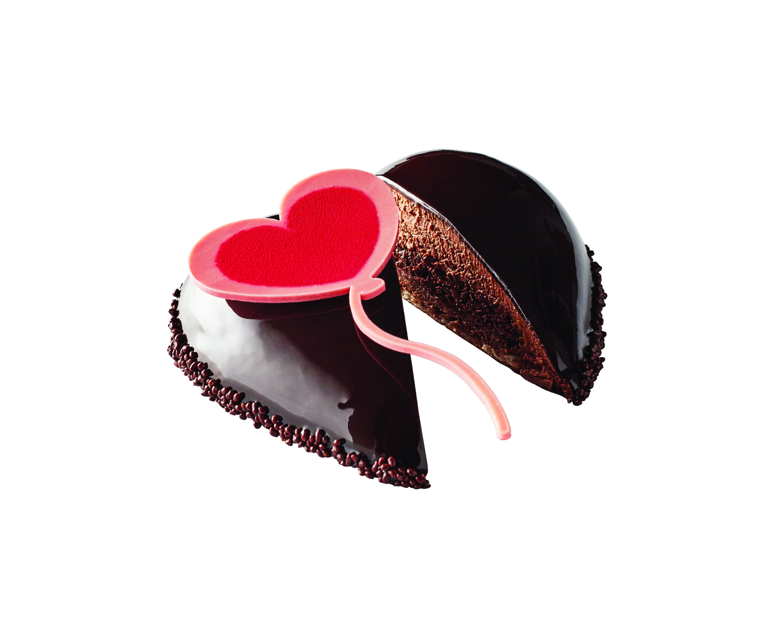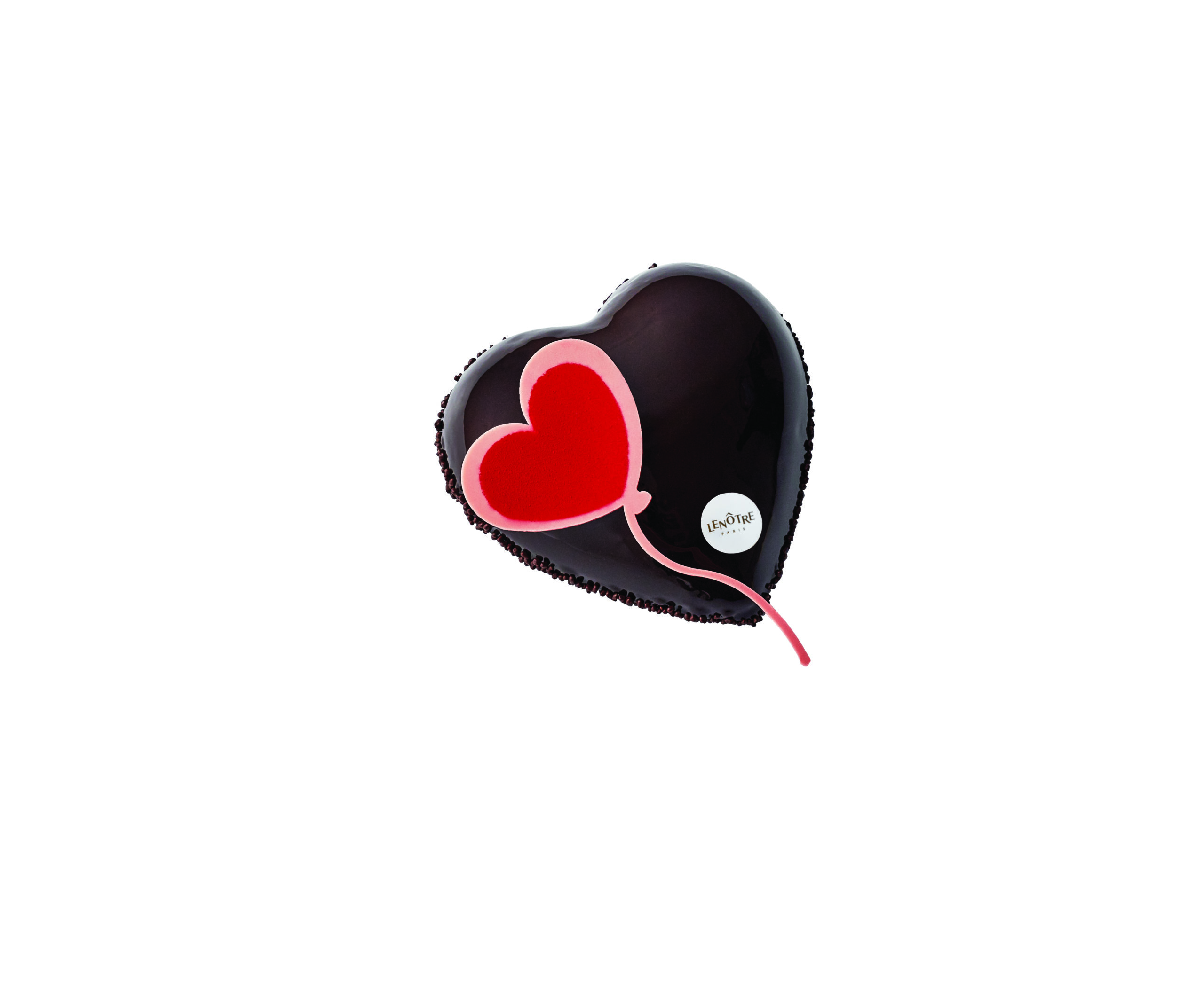 Une base de biscuit joconde à la poudre d’amande et de feuilletine croustillante au chocolat. Le cœur léger est fondant tel un biscuit cacao imbibé de sirop cacaoté et une touche de caramel-passion vient créer la surprise. L’entremets est enrobé de mousse au chocolat noir issu des fèves du Ghana, Sao Tomé et Tanzanie et le tout est recouvert d’un glaçage chocolat. Enfin, des flocons chocolatés viennent embrasser les bords de la base du cœur. Pour terminer en beauté, un ballon cœur en chocolat blanc vient joliment orner cette douceur.