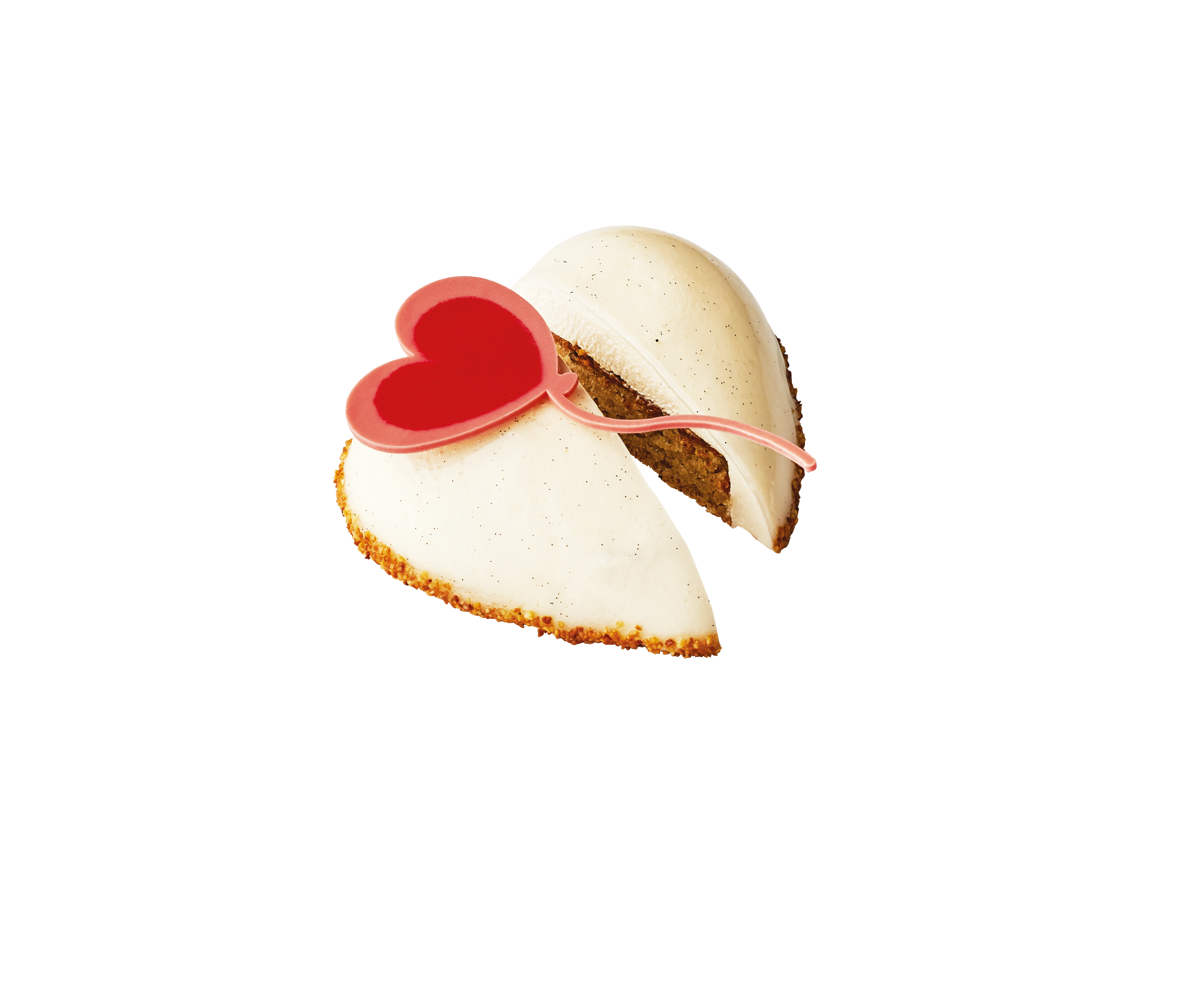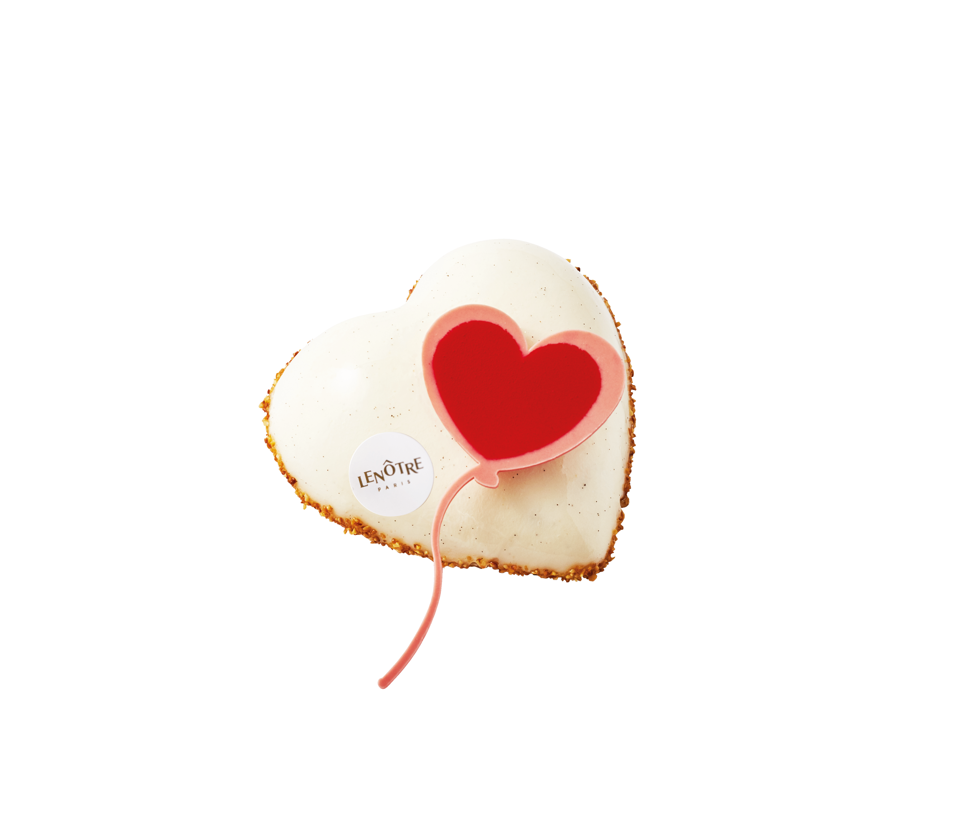Sur une base moelleuse de biscuit Valencia à l’amande se dépose une fine couche de praliné et de pâte noisette. Le cœur léger est composé d’un mousse panna cotta vanille Bourbon de Madagascar et le tout est recouvert d’un glaçage délicat de graines de vanille. Enfin des éclats d’amandes caramélisées viennent enlacer les bords de la base du cœur. Pour terminer en beauté́ un ballon cœur en chocolat blanc vient joliment orner cette douceur.