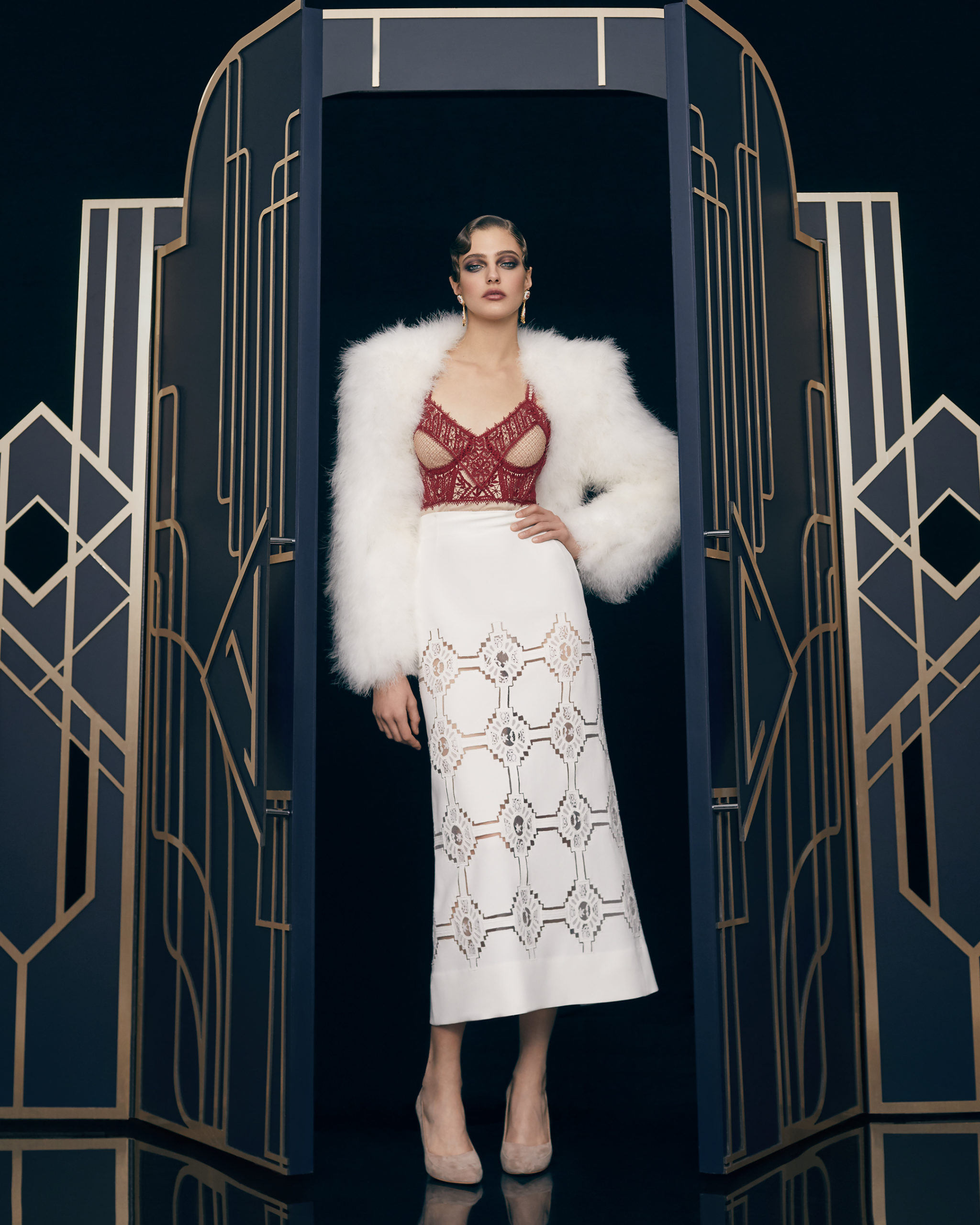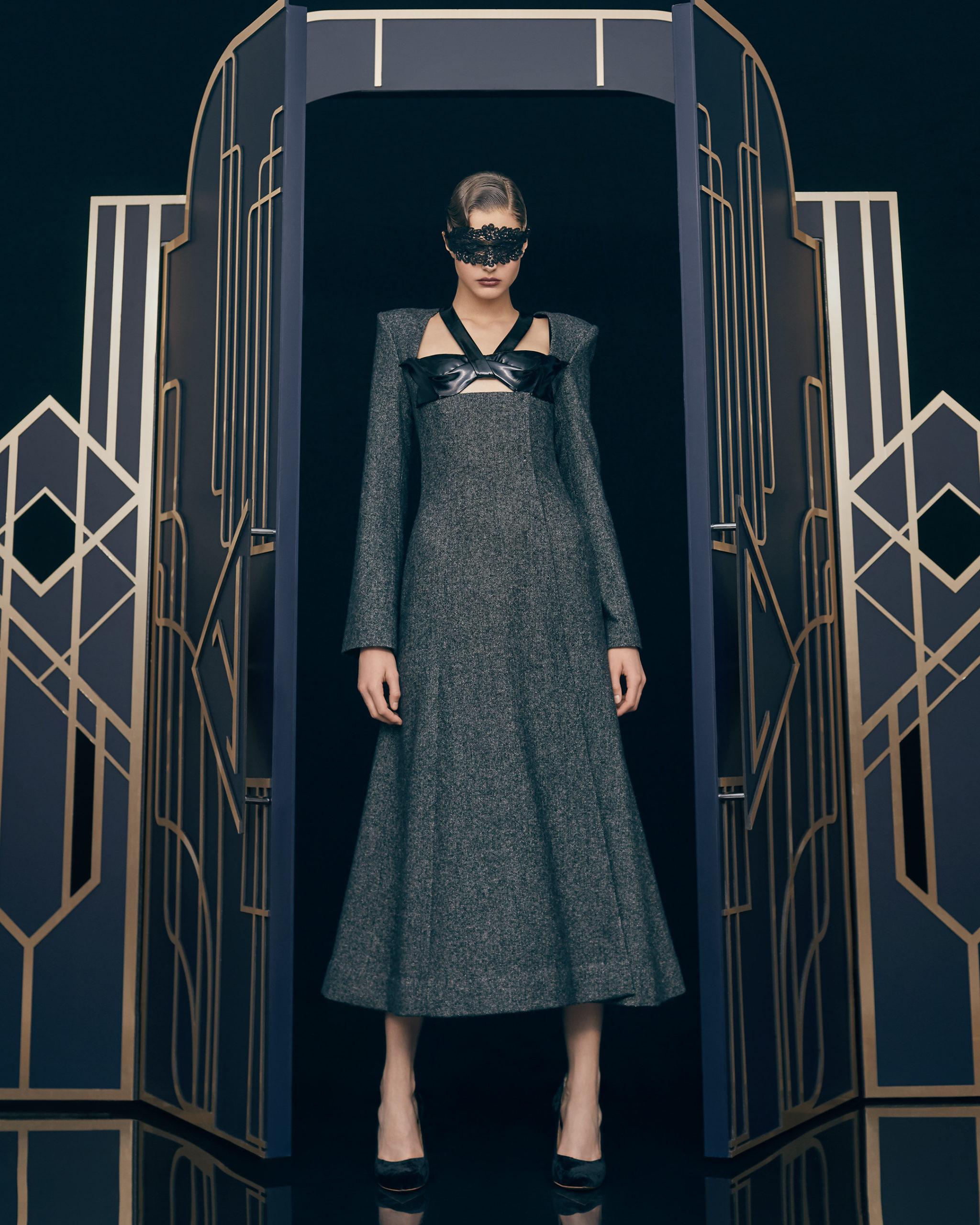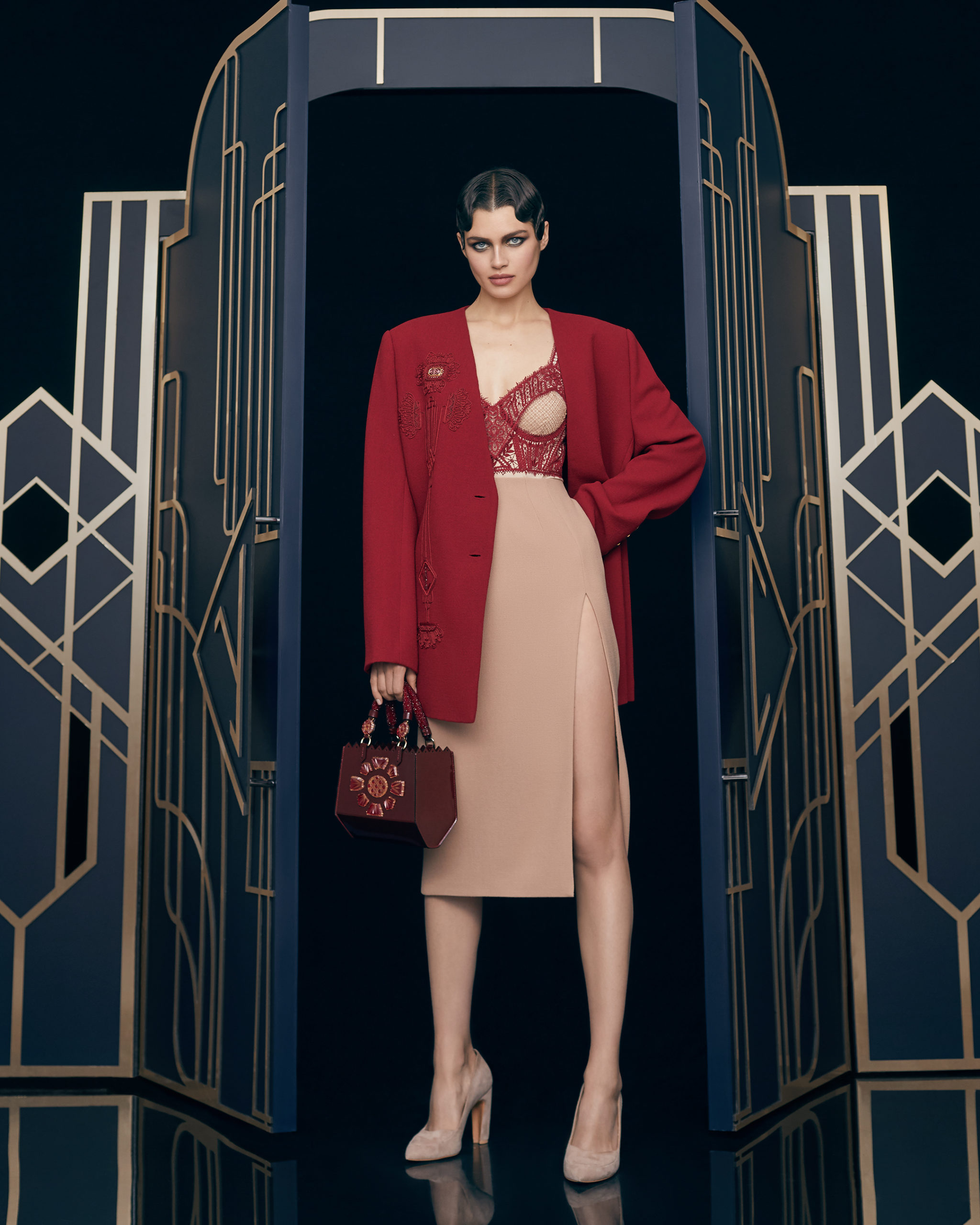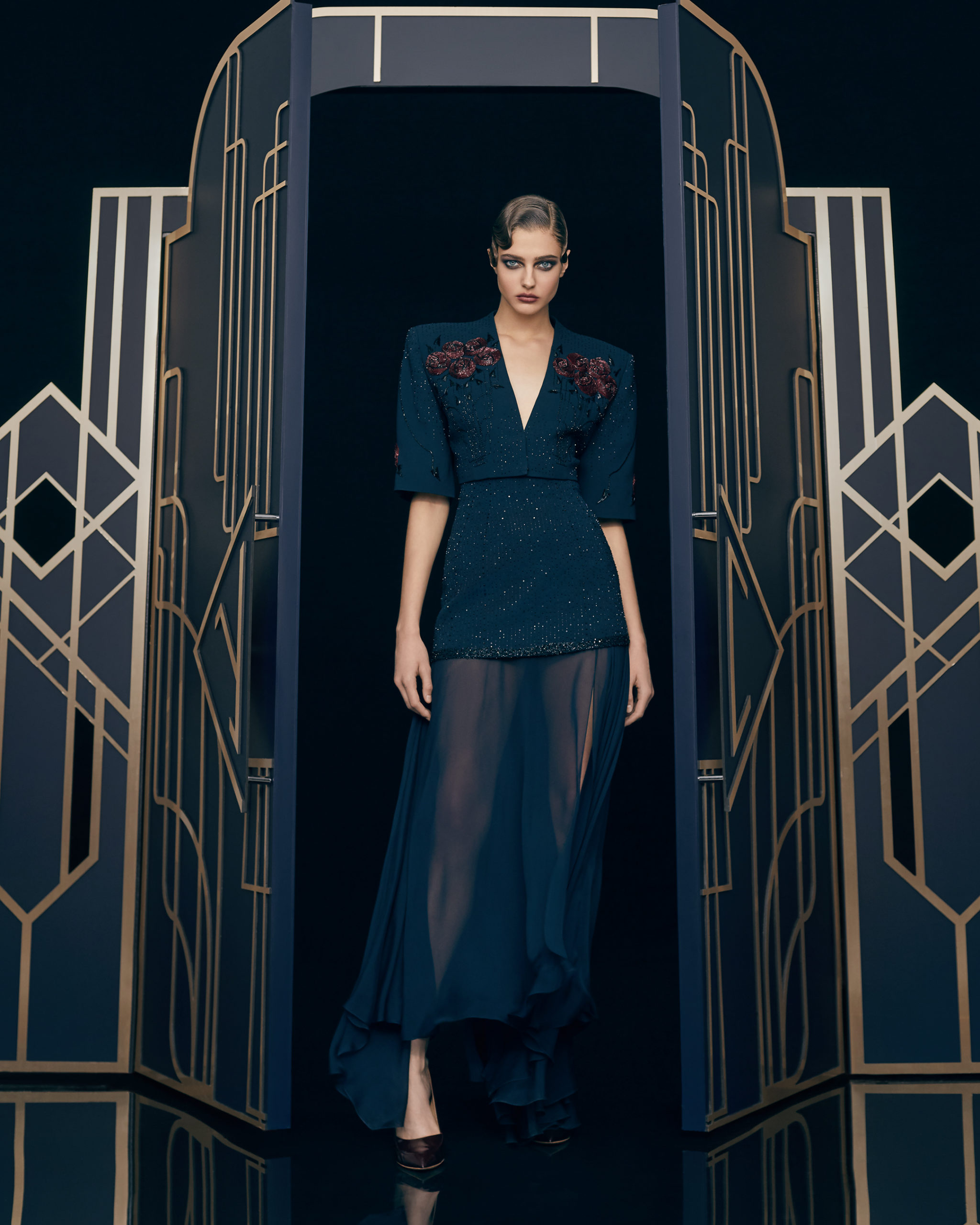Other legendary names of the 1920s share this season’s moodboard with Vera Kholodnaya: namely, the sculptor Demétre Chiparus with his dancing ladies, and the artist Roman Tyrtov—better known under the pseudonym Erte—whose graphic artworks for Vogue and Harper’s Bazaar embody the spirit of his time. Here are also architecture, interior décor, urban landmarks, and sculptures: New York’s Empire State Building, the Lenin Library in Moscow, Vera Mukhina’s sculpture “The Worker and the Kolkhoz Woman,” Moscow’s “Aeroport” metro station, and others.