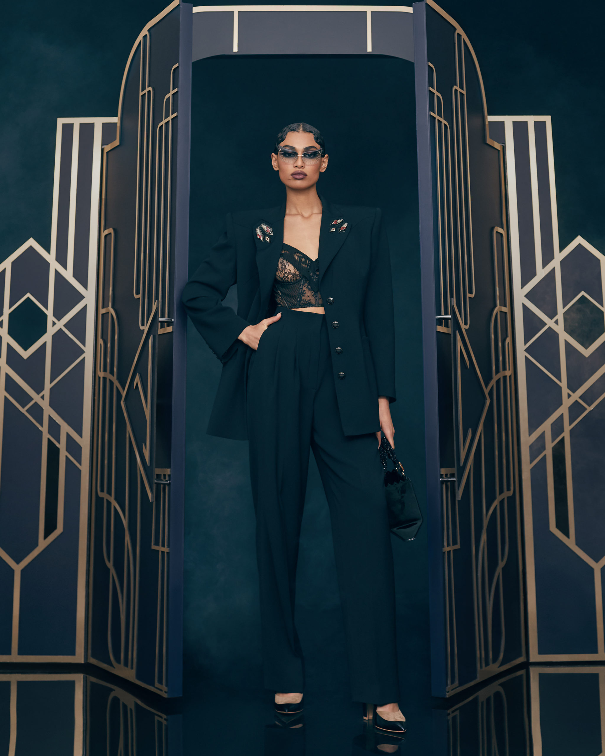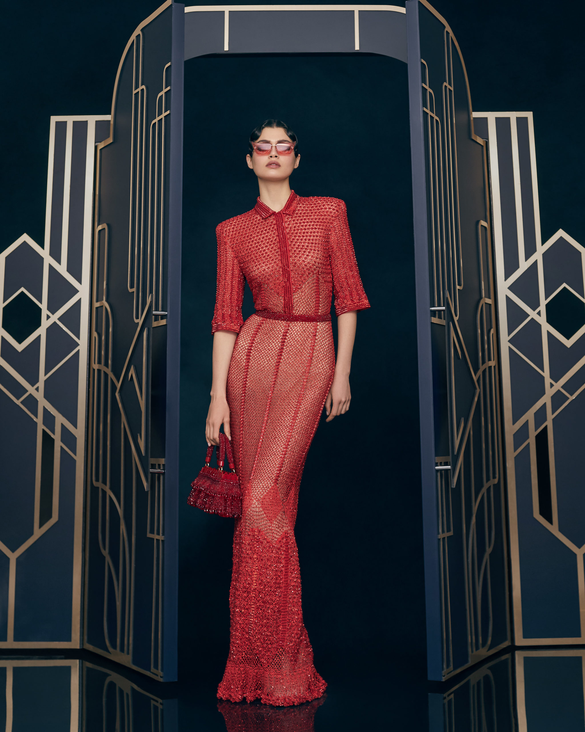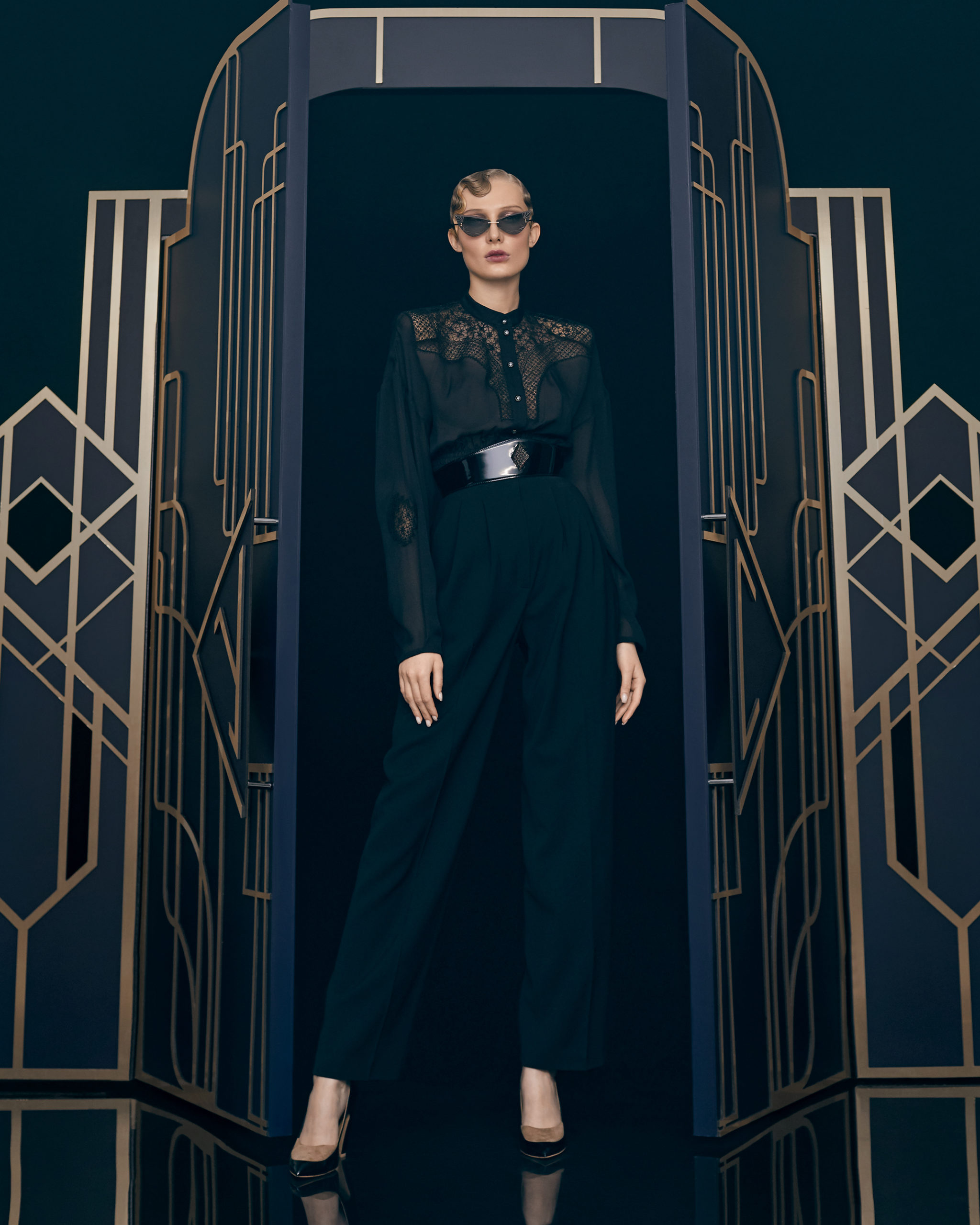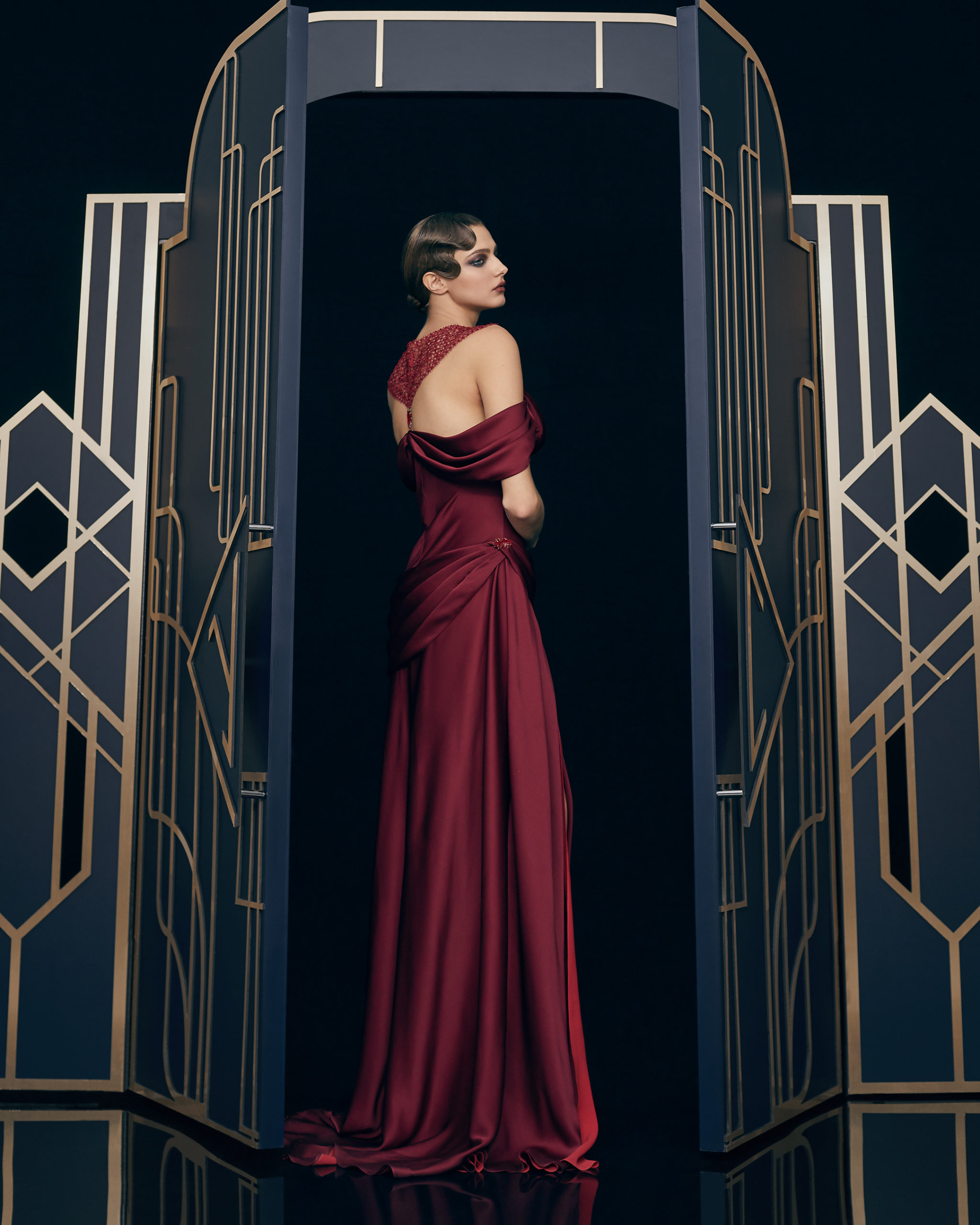 Other legendary names of the 1920s share this season’s moodboard with Vera Kholodnaya: namely, the sculptor Demétre Chiparus with his dancing ladies, and the artist Roman Tyrtov—better known under the pseudonym Erte—whose graphic artworks for Vogue and Harper’s Bazaar embody the spirit of his time. Here are also architecture, interior décor, urban landmarks, and sculptures: New York’s Empire State Building, the Lenin Library in Moscow, Vera Mukhina’s sculpture “The Worker and the Kolkhoz Woman,” Moscow’s “Aeroport” metro station, and others.