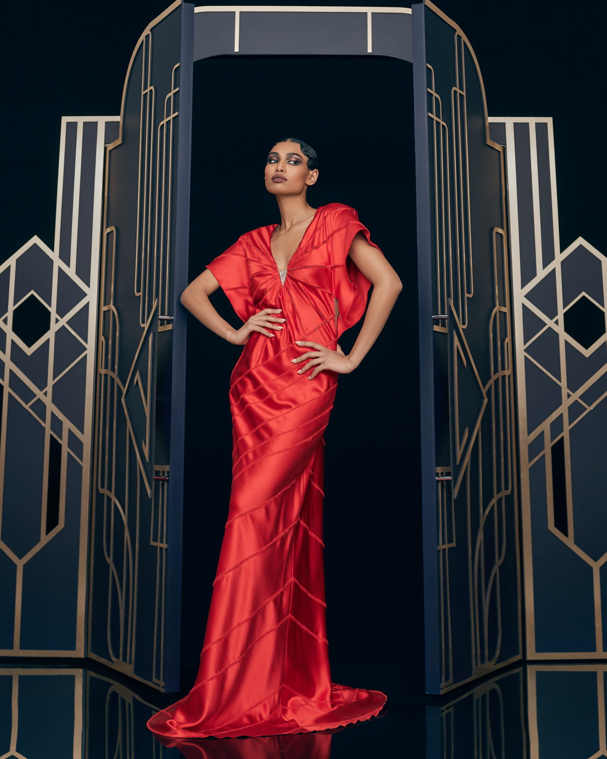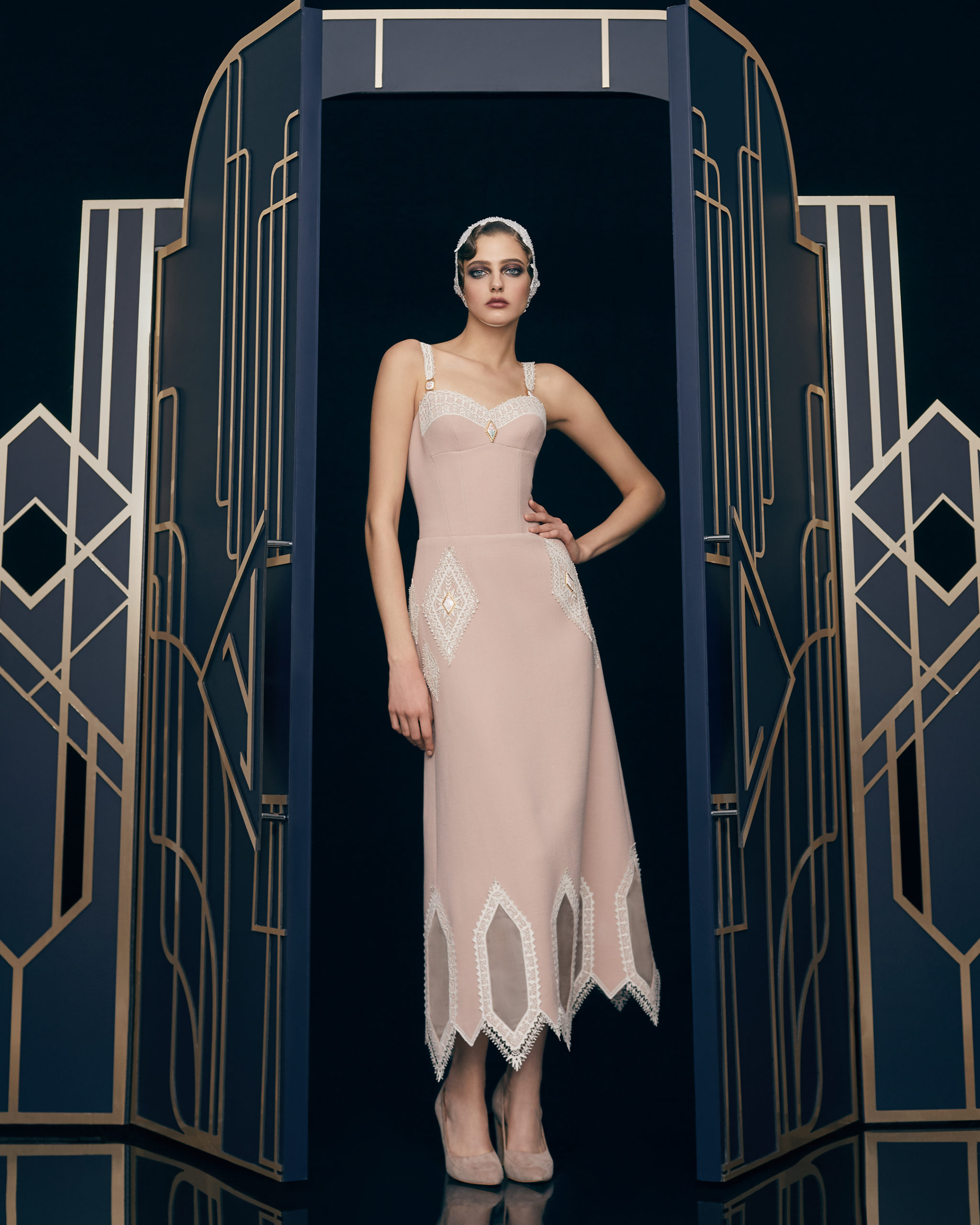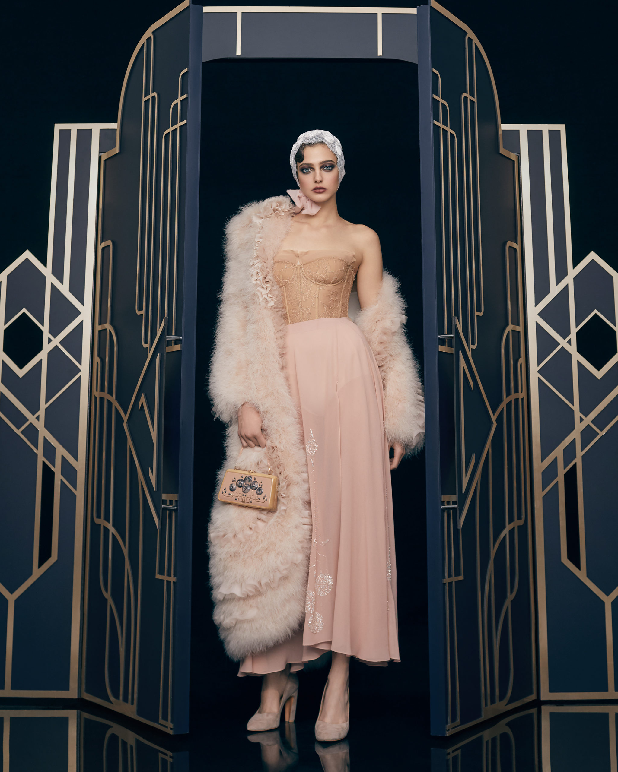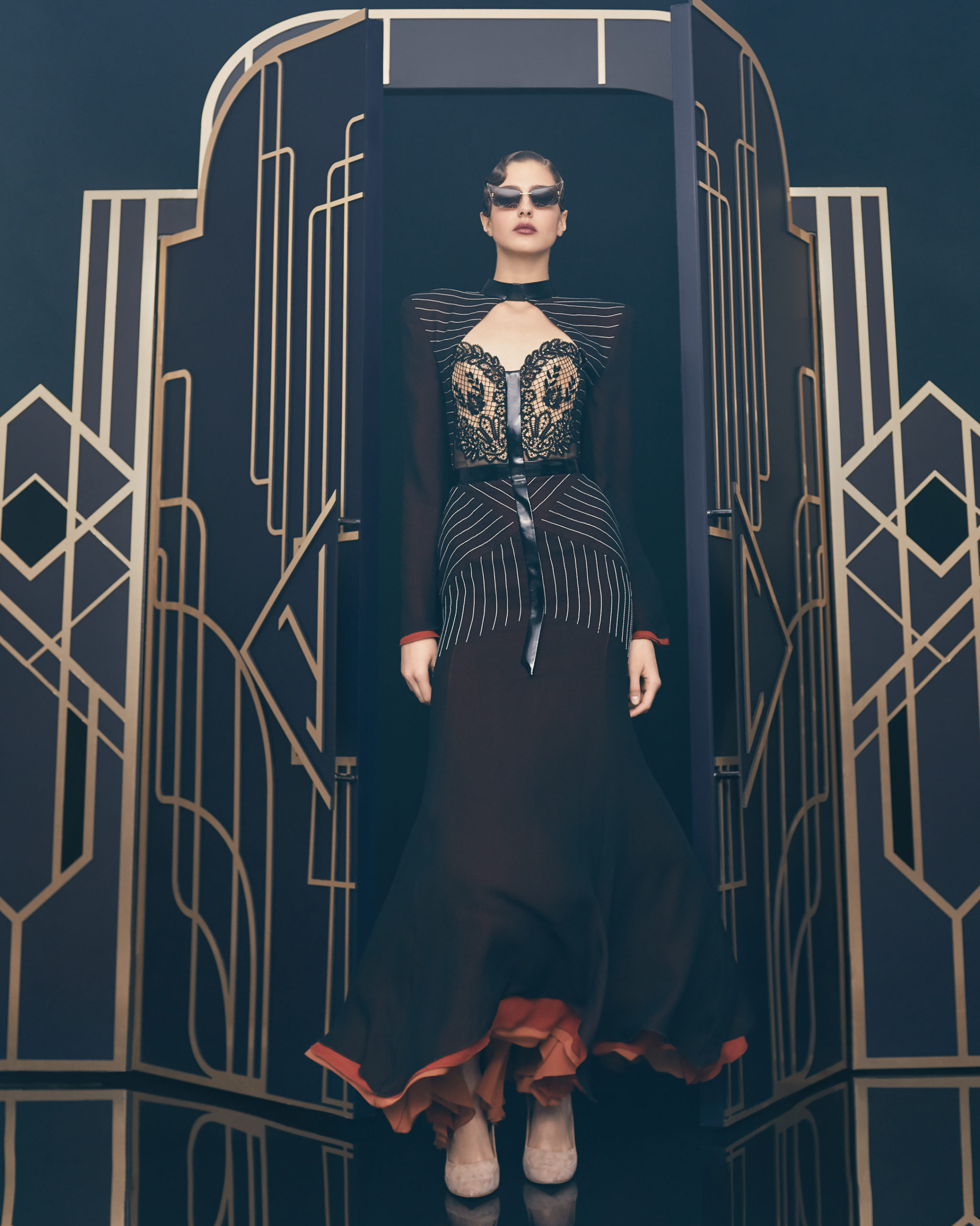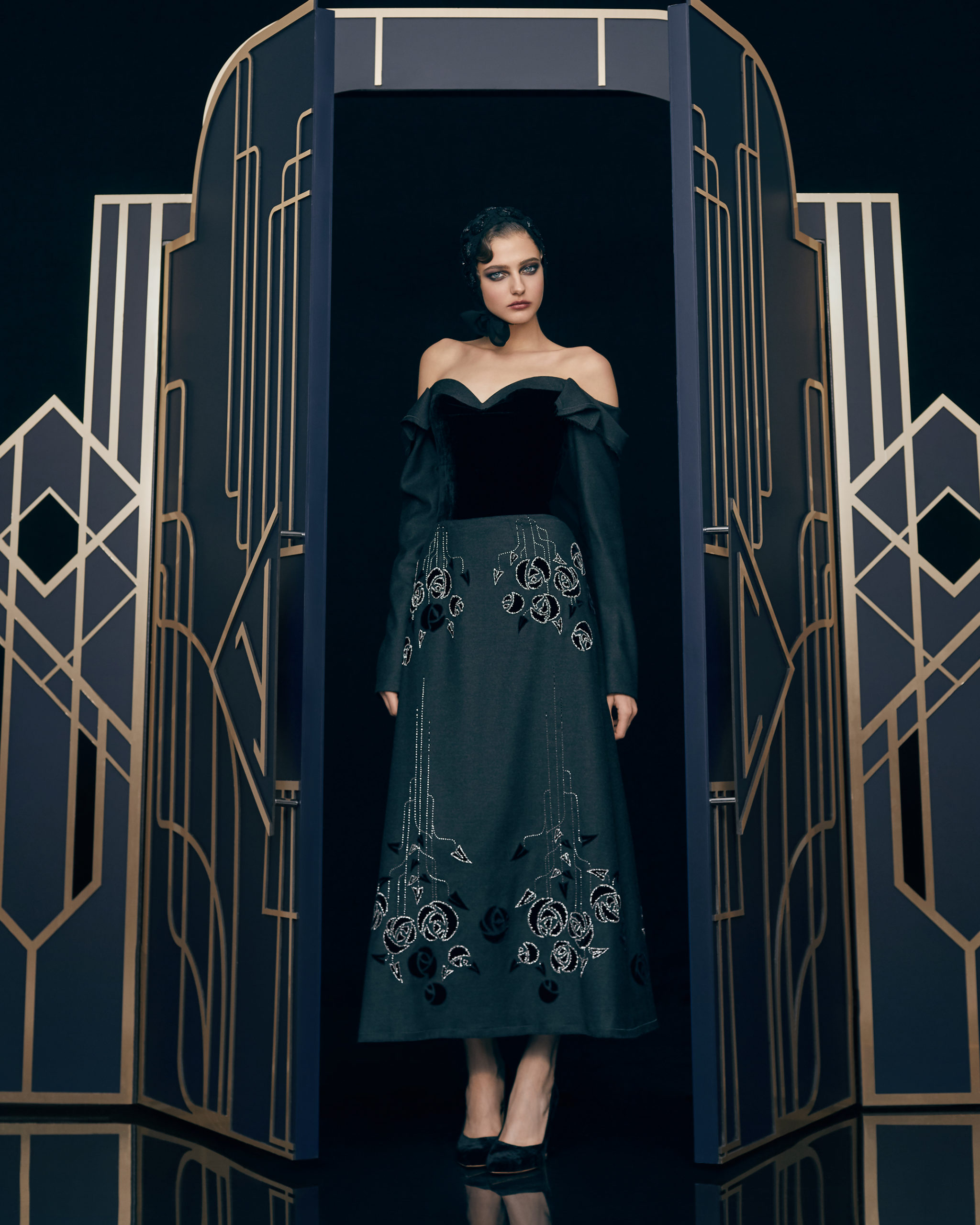 Other legendary names of the 1920s share this season’s moodboard with Vera Kholodnaya: namely, the sculptor Demétre Chiparus with his dancing ladies, and the artist Roman Tyrtov—better known under the pseudonym Erte—whose graphic artworks for Vogue and Harper’s Bazaar embody the spirit of his time. Here are also architecture, interior décor, urban landmarks, and sculptures: New York’s Empire State Building, the Lenin Library in Moscow, Vera Mukhina’s sculpture “The Worker and the Kolkhoz Woman,” Moscow’s “Aeroport” metro station, and others.
