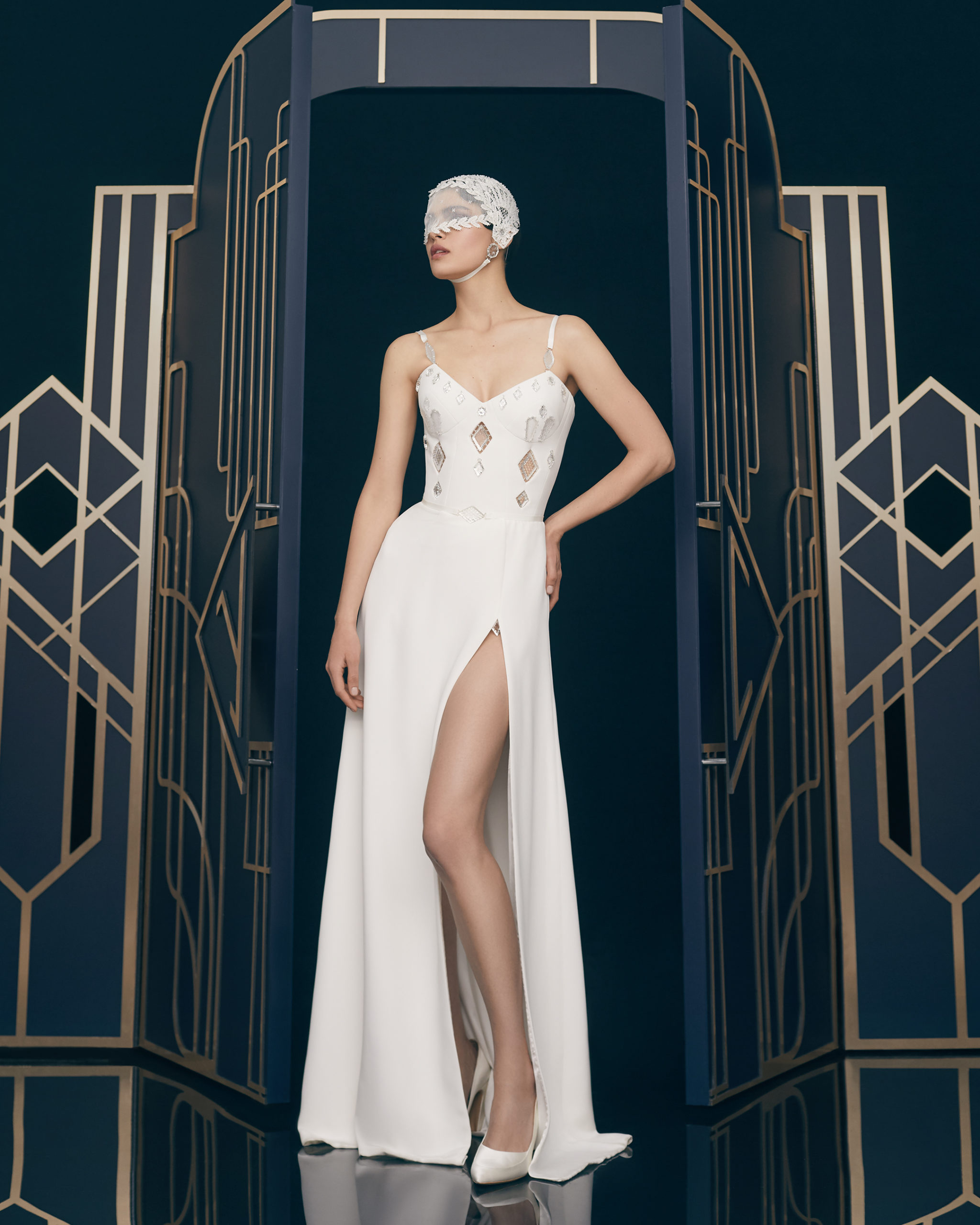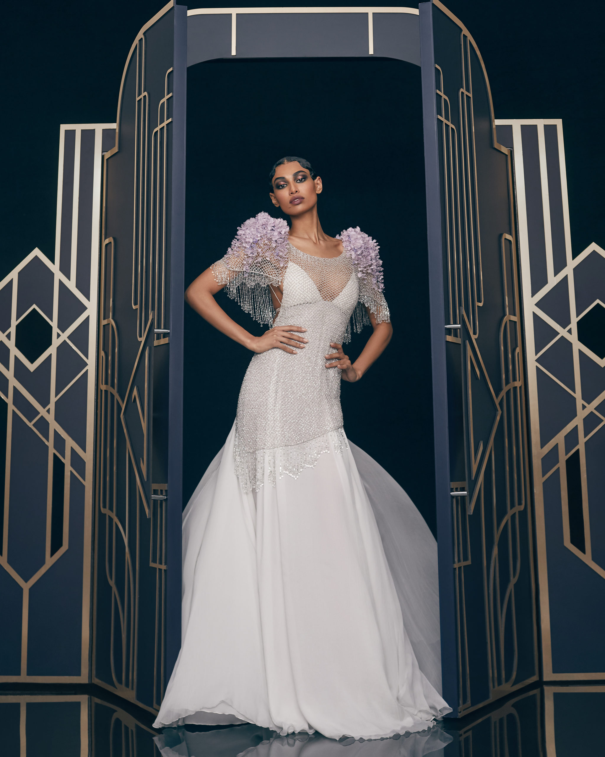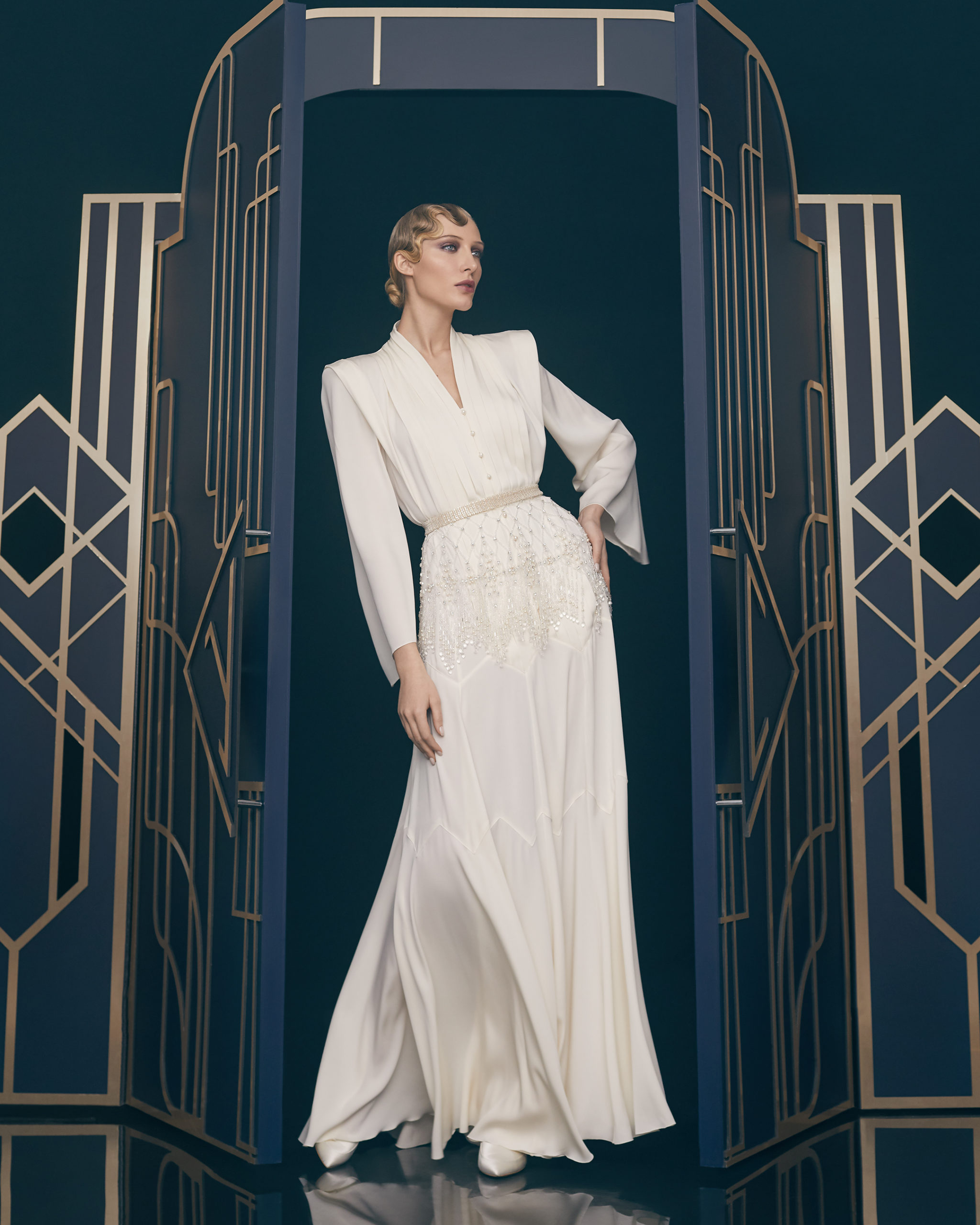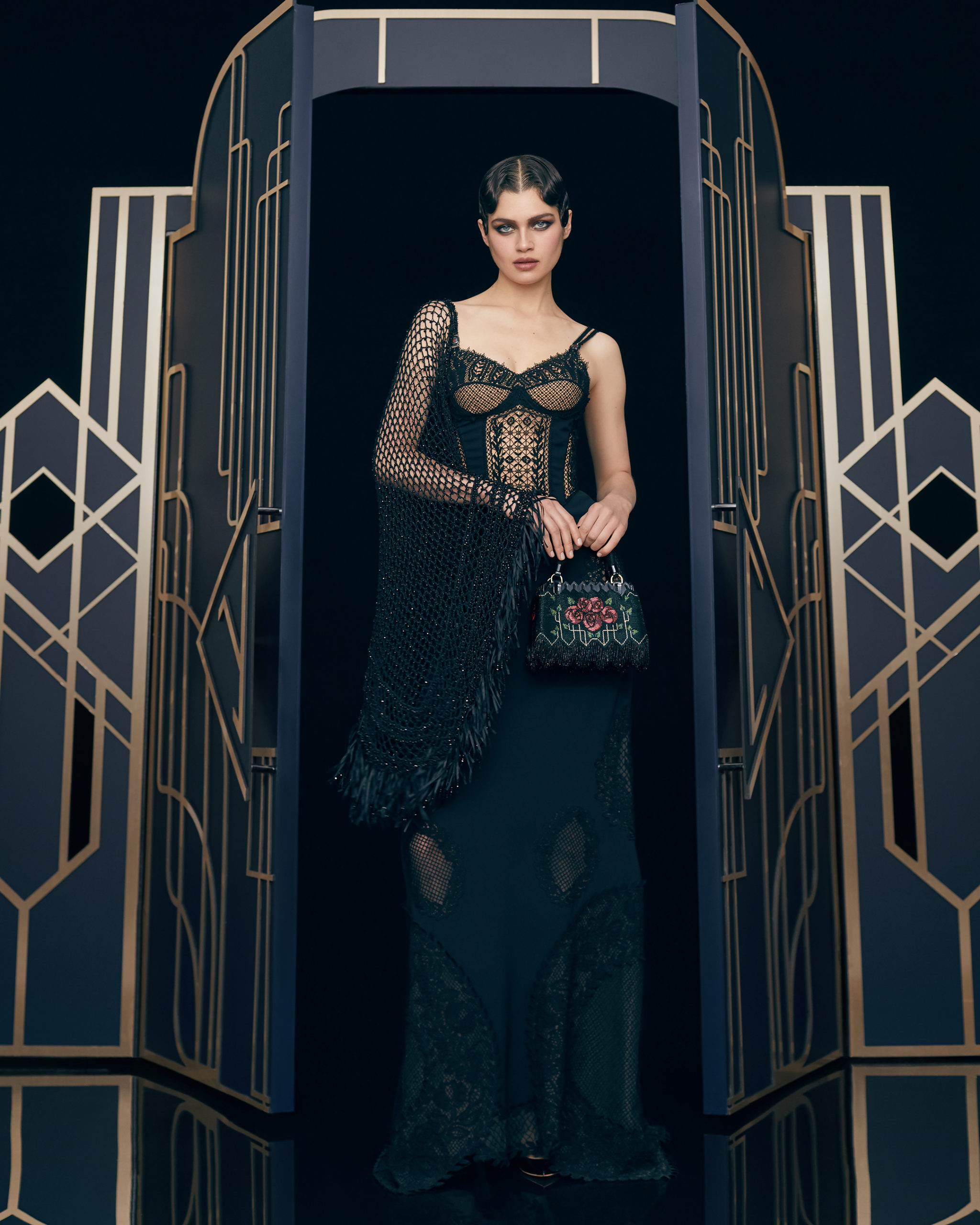 Other legendary names of the 1920s share this season’s moodboard with Vera Kholodnaya: namely, the sculptor Demétre Chiparus with his dancing ladies, and the artist Roman Tyrtov—better known under the pseudonym Erte—whose graphic artworks for Vogue and Harper’s Bazaar embody the spirit of his time. Here are also architecture, interior décor, urban landmarks, and sculptures: New York’s Empire State Building, the Lenin Library in Moscow, Vera Mukhina’s sculpture “The Worker and the Kolkhoz Woman,” Moscow’s “Aeroport” metro station, and others.