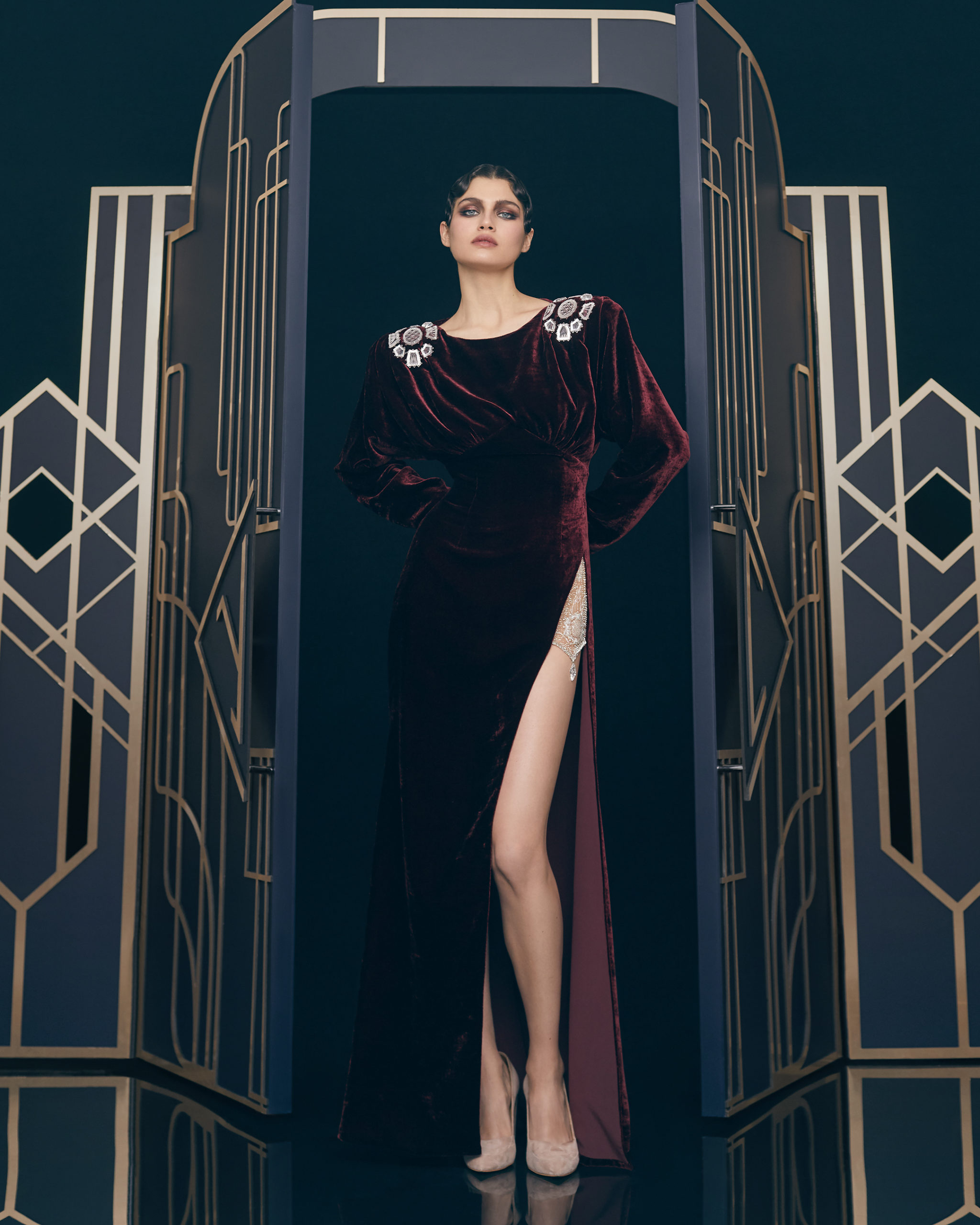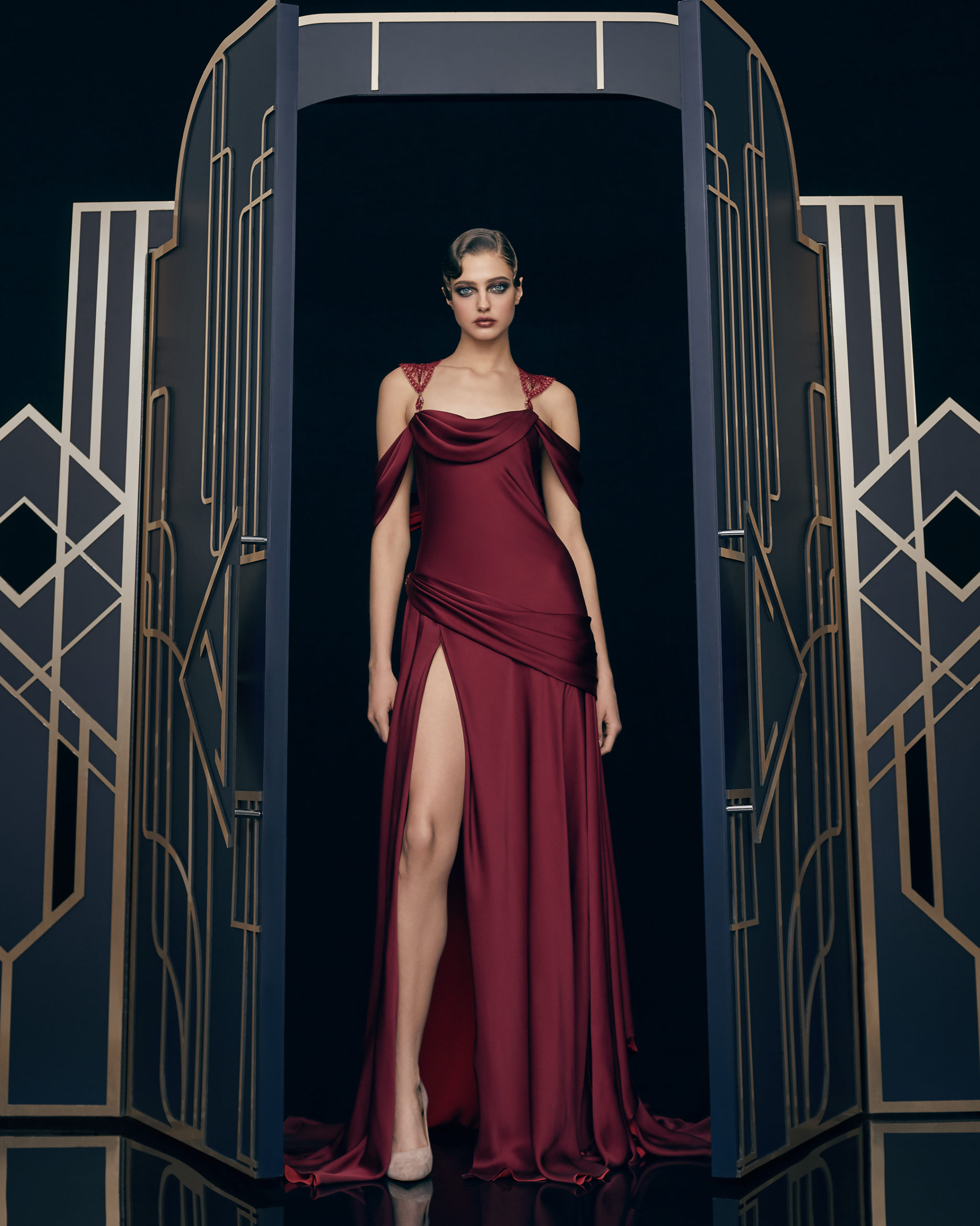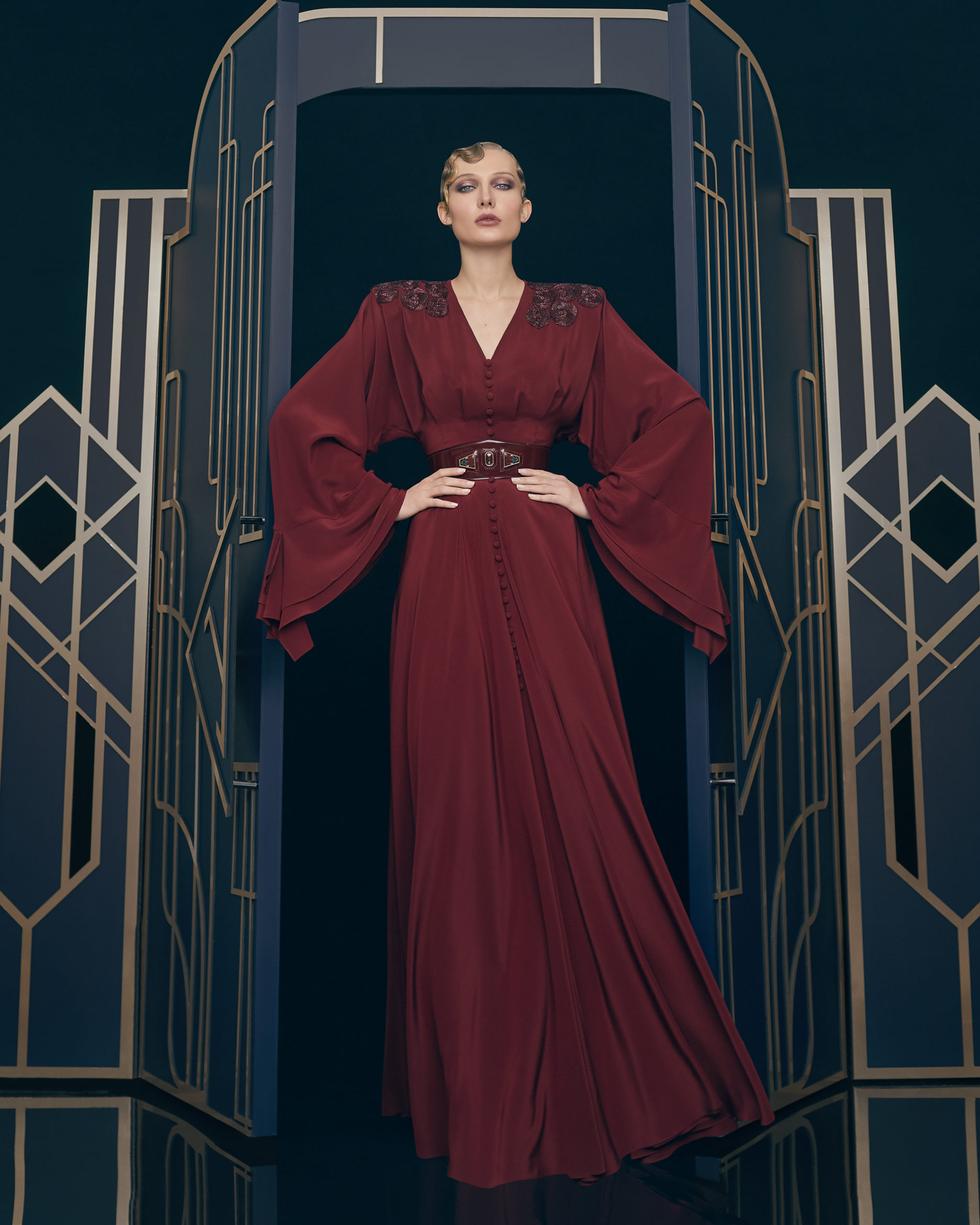 Colors and fabrics: precious fabrics such as silk, chiffon, cady, velvet crepe, wool, and cashmere are featured in burgundy, blue and crimson colors, together with classical black and white combinations and subdued shades: dusty rose, beige, and grey.