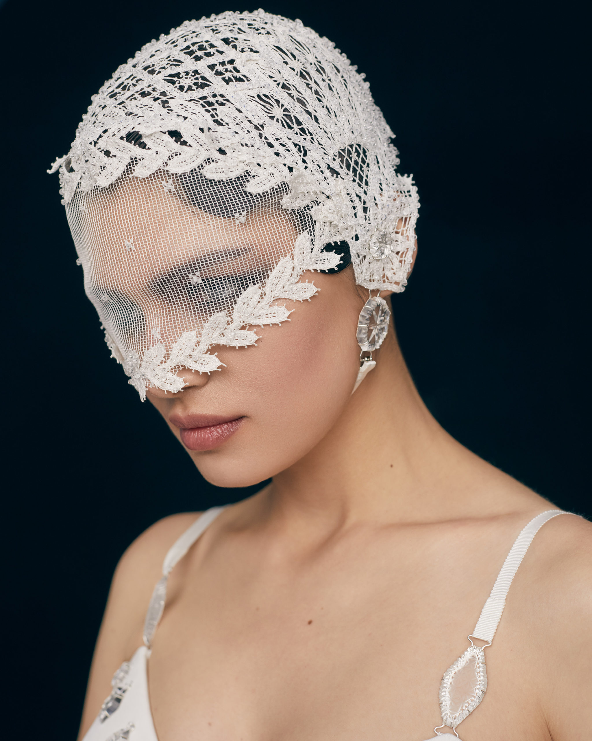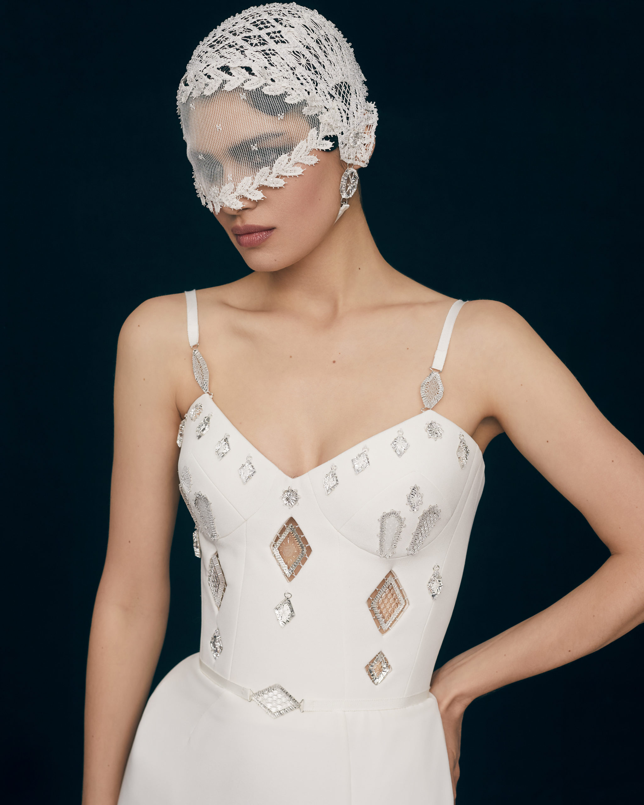 The accessory line is presented with a wide range of items: from headpieces and face masks embroidered with Yelets laces and decorated with crystals, Carl Zeiss lens with author’s ornaments on it, to the variety of belts with crystal elements, hand craved wood clutches, fully embroidered beaded bags, and, of course, high heels.