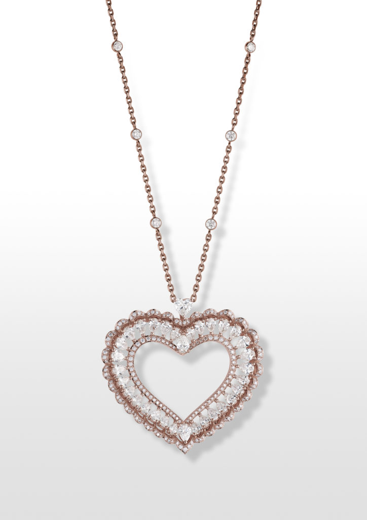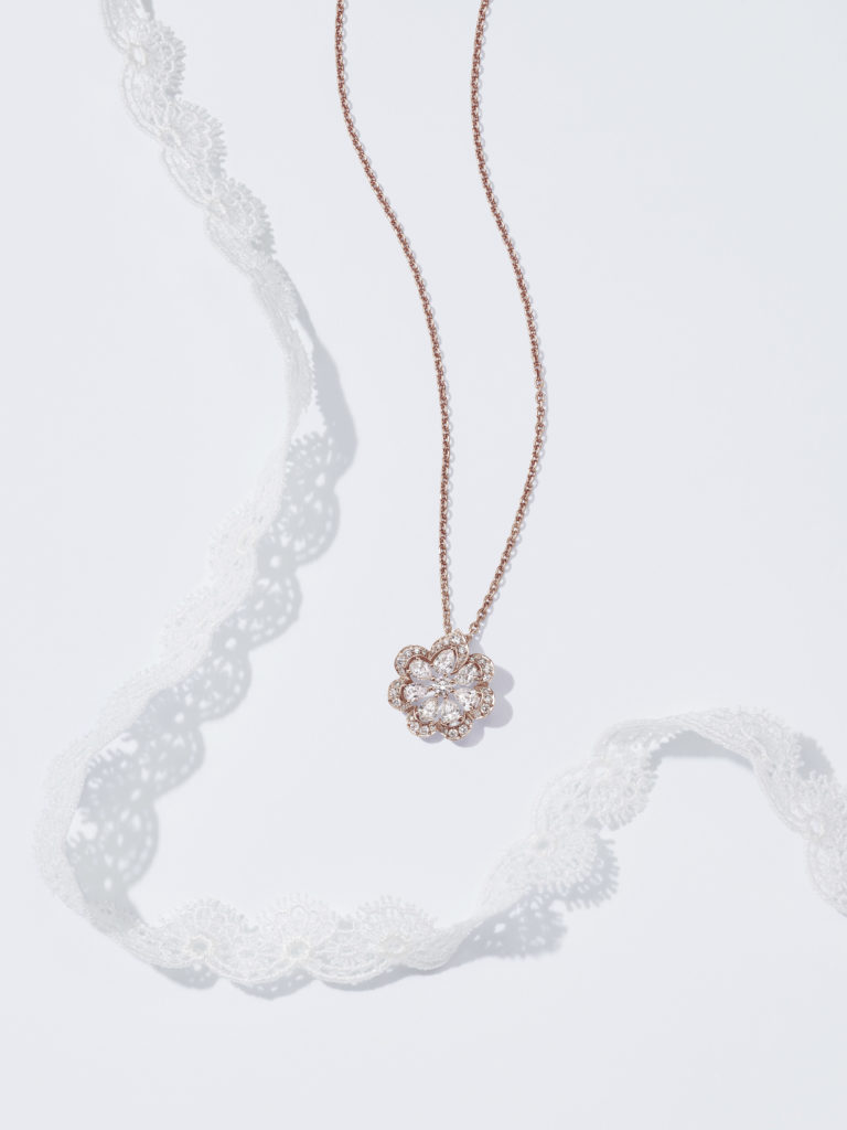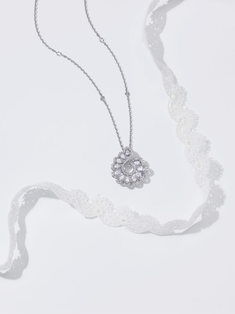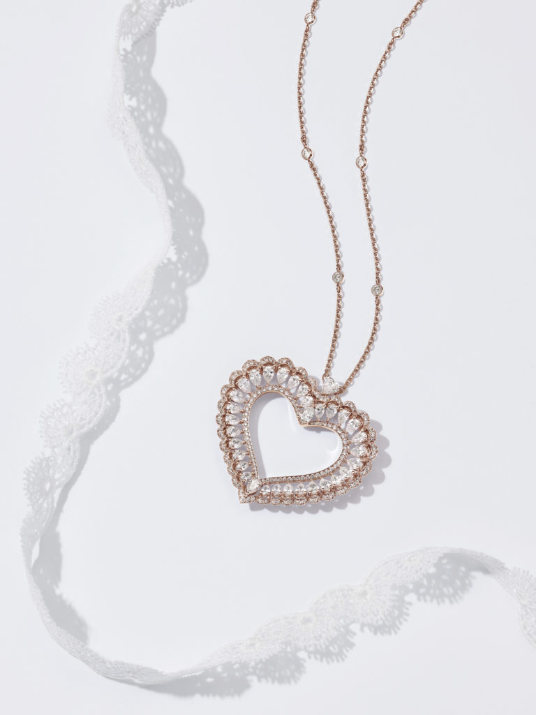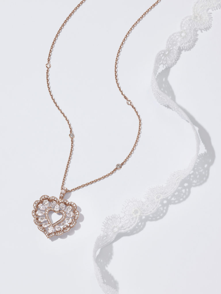 Leurs motifs font écho aux motifs floraux, aux arabesques, aux ondoiements et aux bords festonnés des fines dentelles d’autrefois. Le motif central de la collection Precious Lace – une volute rythmée et ondulante en or sertie de diamants, entourant une ligne déroulante de diamants taille poire – est maintenant miniaturisé à travers quatre dessins. Le premier, en « Vague », avec ses proportions évoquant les rouleaux d’écume se formant sur la mer, se décline en une paire de boucles d’oreilles, un pendentif et une bague. Le motif de fleur stylisée, appelé « Mini-Froufrou », avec ses bordures festonnées et ses pétales de diamant taille poire sur un fond ajouré, est travaillé en bague, en boucles d’oreilles, en pendentif et en un bracelet jonc. Un fleuron semi-circulaire de style similaire devient un pendentif et une chaîne de cou, des boucles d’oreilles et une bague dits « Nuage ». Enfin, Chopard offre à son iconique pendentif « Cœur » le traitement Precious Lace, dans deux choix de taille.