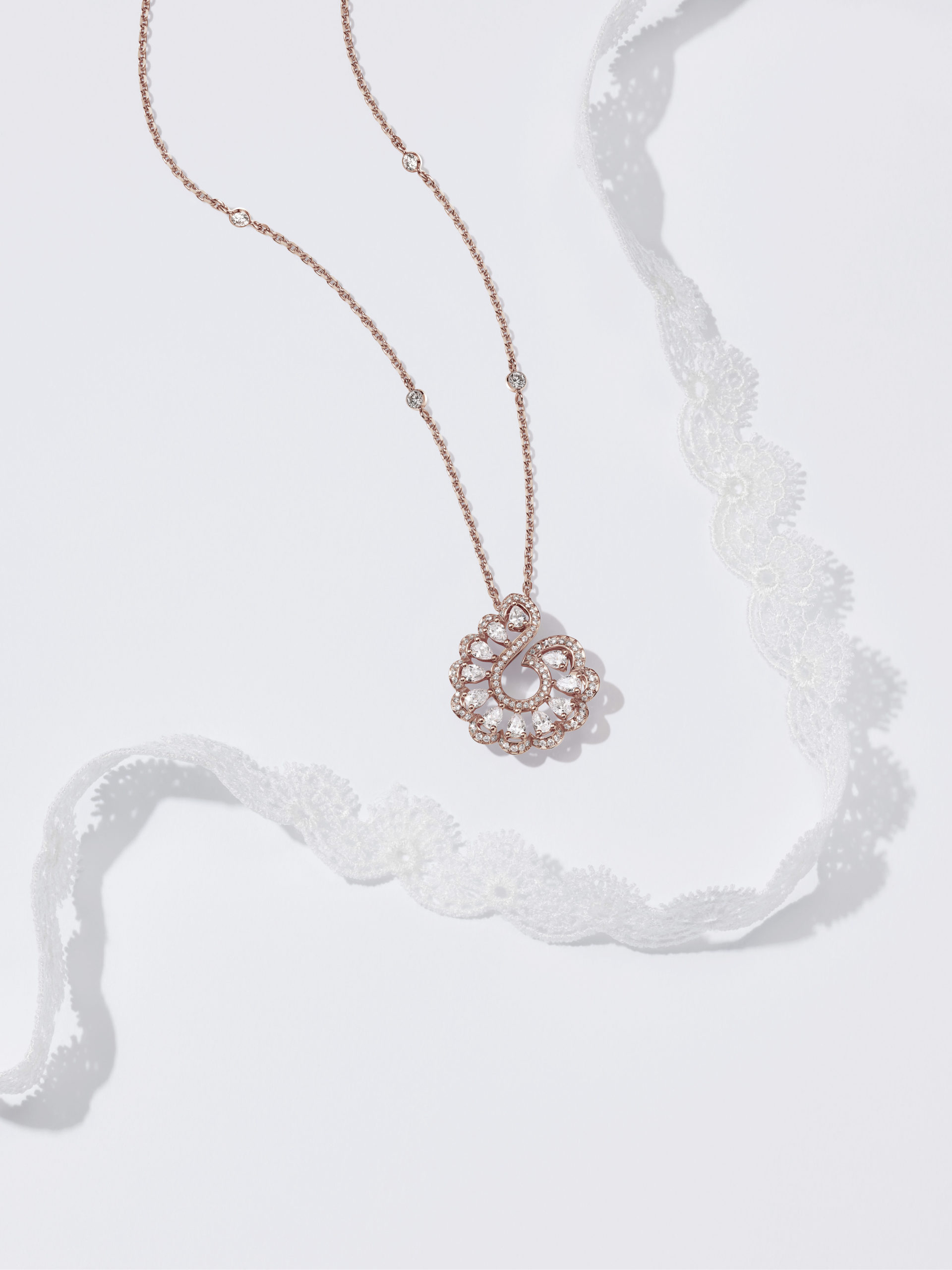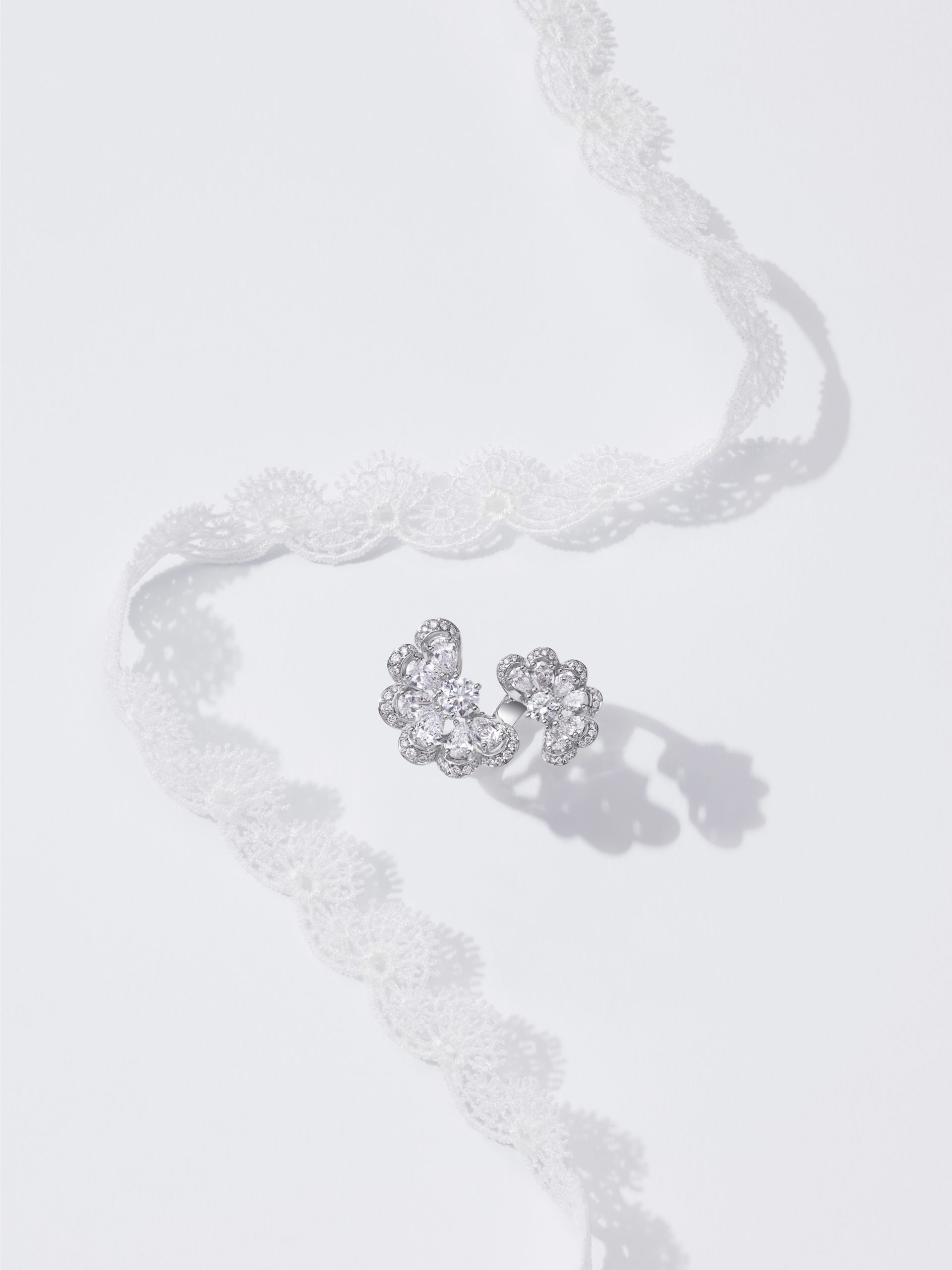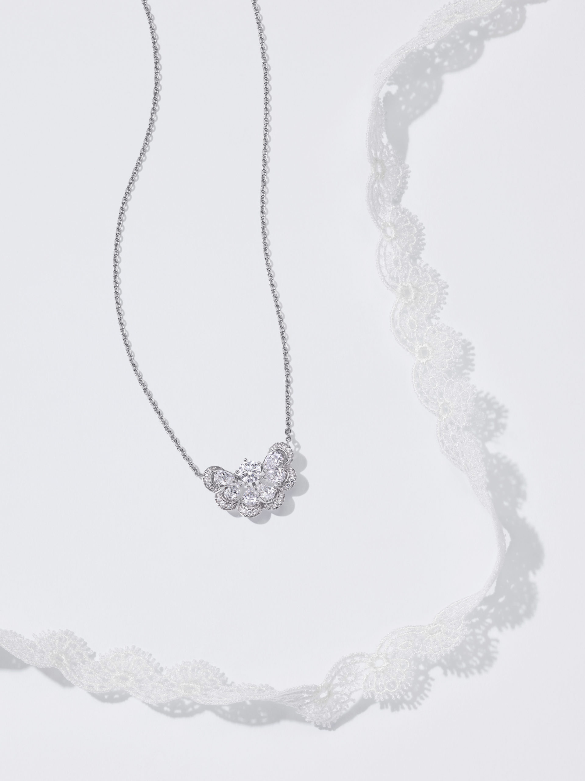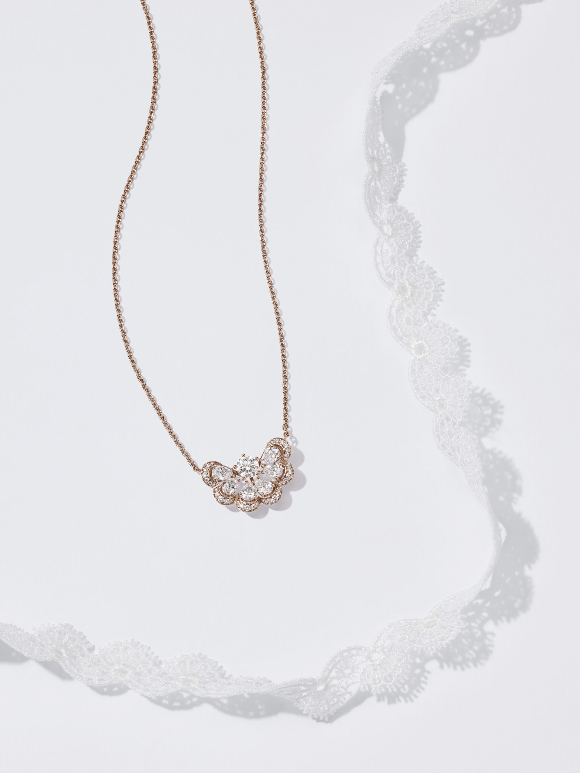 Leurs motifs font écho aux motifs floraux, aux arabesques, aux ondoiements et aux bords festonnés des fines dentelles d’autrefois. Le motif central de la collection Precious Lace – une volute rythmée et ondulante en or sertie de diamants, entourant une ligne déroulante de diamants taille poire – est maintenant miniaturisé à travers quatre dessins. Le premier, en « Vague », avec ses proportions évoquant les rouleaux d’écume se formant sur la mer, se décline en une paire de boucles d’oreilles, un pendentif et une bague. Le motif de fleur stylisée, appelé « Mini-Froufrou », avec ses bordures festonnées et ses pétales de diamant taille poire sur un fond ajouré, est travaillé en bague, en boucles d’oreilles, en pendentif et en un bracelet jonc. Un fleuron semi-circulaire de style similaire devient un pendentif et une chaîne de cou, des boucles d’oreilles et une bague dits « Nuage ». Enfin, Chopard offre à son iconique pendentif « Cœur » le traitement Precious Lace, dans deux choix de taille.