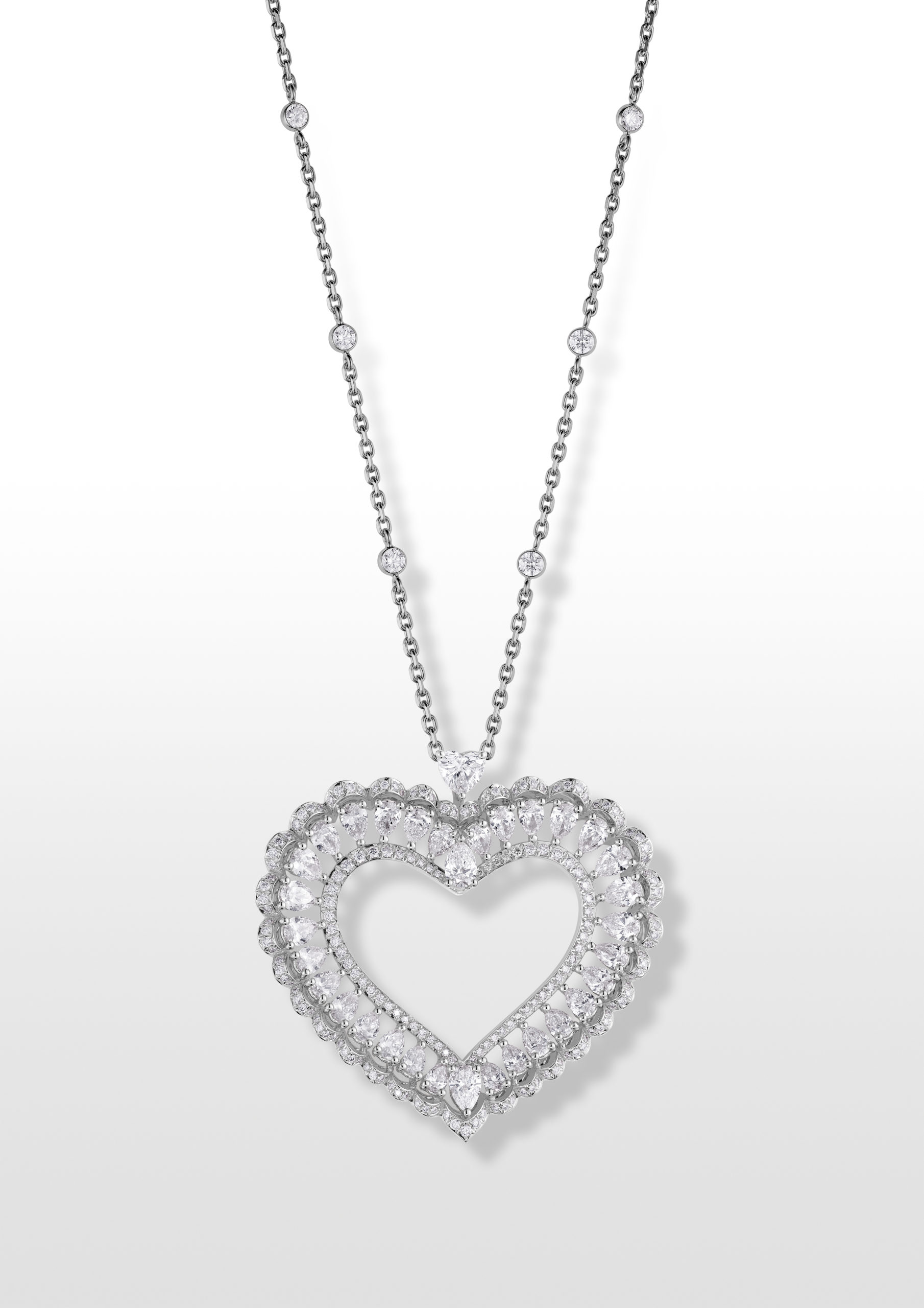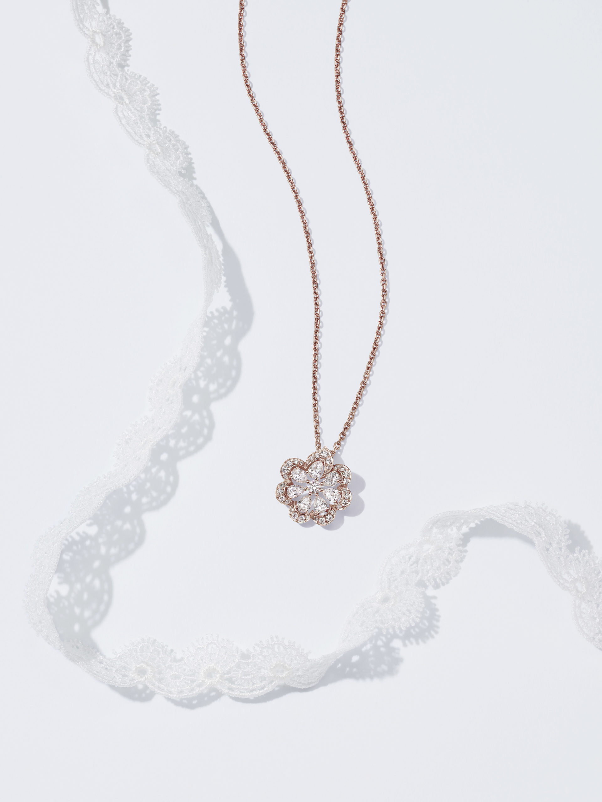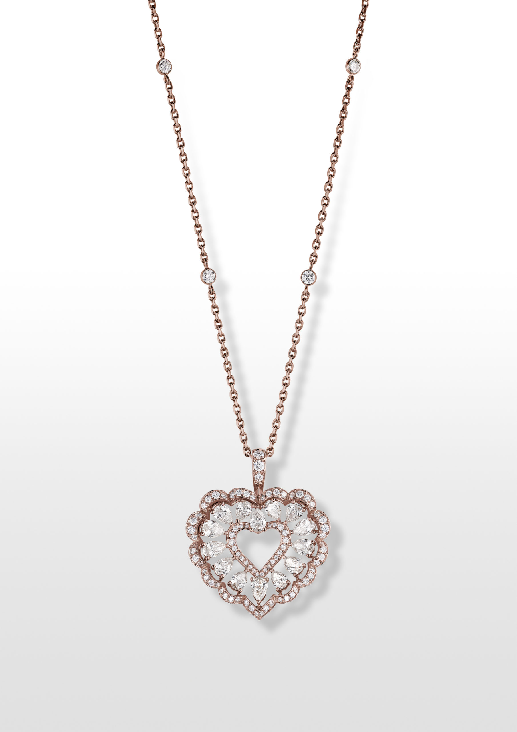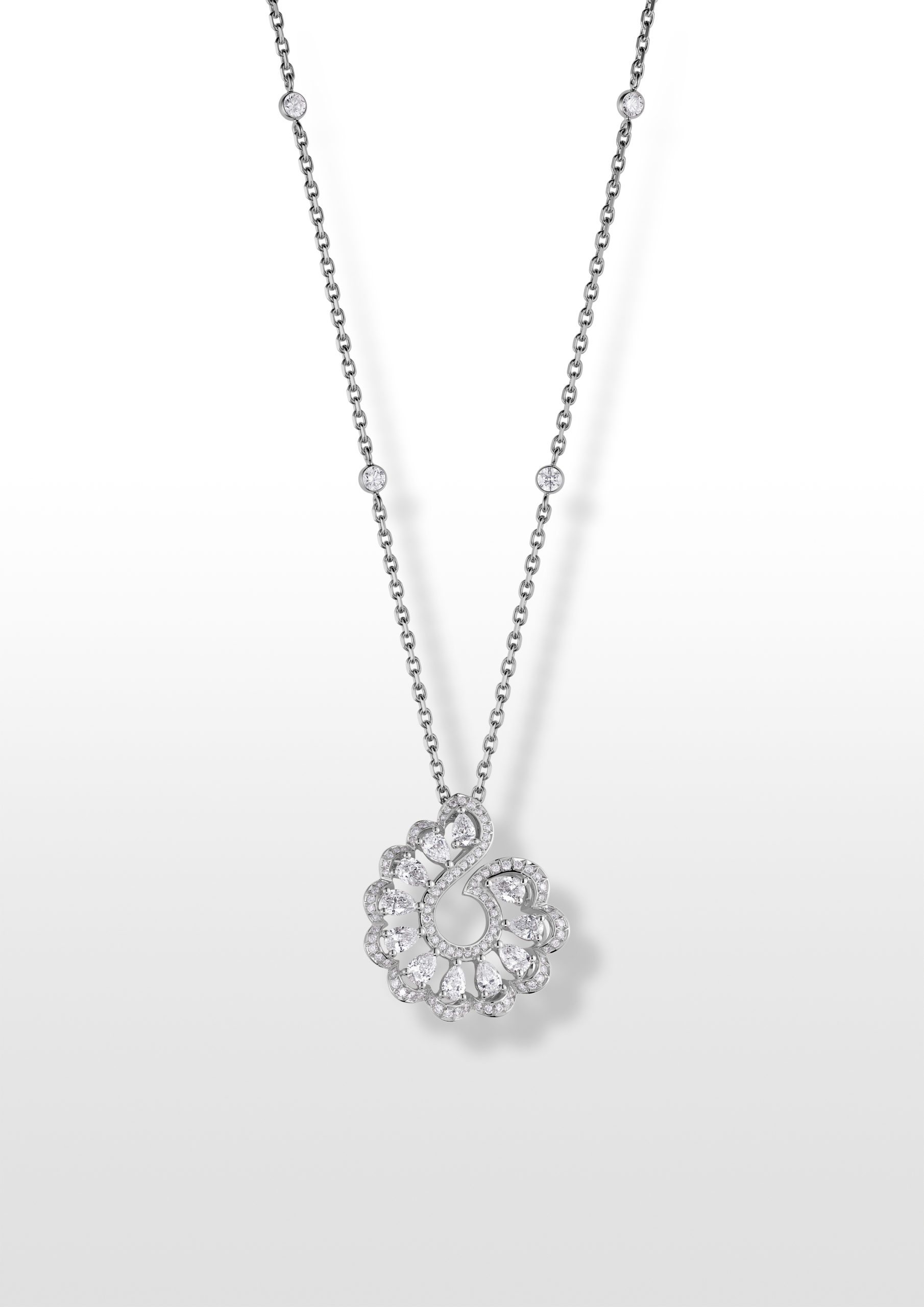 Leurs motifs font écho aux motifs floraux, aux arabesques, aux ondoiements et aux bords festonnés des fines dentelles d’autrefois. Le motif central de la collection Precious Lace – une volute rythmée et ondulante en or sertie de diamants, entourant une ligne déroulante de diamants taille poire – est maintenant miniaturisé à travers quatre dessins. Le premier, en « Vague », avec ses proportions évoquant les rouleaux d’écume se formant sur la mer, se décline en une paire de boucles d’oreilles, un pendentif et une bague. Le motif de fleur stylisée, appelé « Mini-Froufrou », avec ses bordures festonnées et ses pétales de diamant taille poire sur un fond ajouré, est travaillé en bague, en boucles d’oreilles, en pendentif et en un bracelet jonc. Un fleuron semi-circulaire de style similaire devient un pendentif et une chaîne de cou, des boucles d’oreilles et une bague dits « Nuage ». Enfin, Chopard offre à son iconique pendentif « Cœur » le traitement Precious Lace, dans deux choix de taille.
