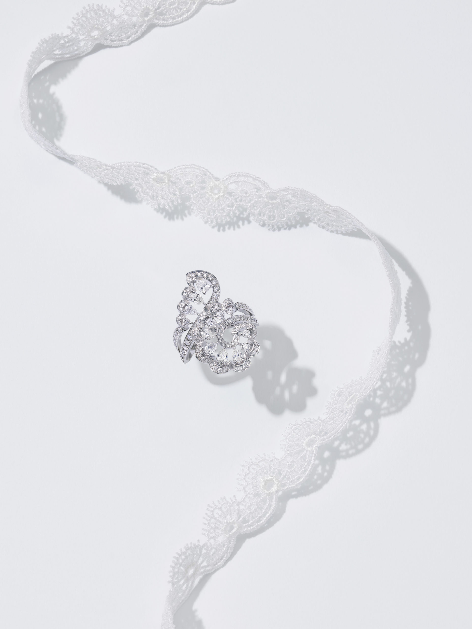 Tout comme la collection joue avec la lumière et la légèreté du diamant, avec la forme et l’espace, le thème lui-même joue avec les concepts de préciosité, et avec la fusion entre pierres précieuses et tissu, entre Haute Joaillerie et Haute Couture. C’est au XVIe siècle à Venise que s’est perfectionné l’art de la dentelle, rayonnant ensuite à travers toute l’Europe jusqu’en Belgique, en France, en Espagne et en Angleterre, y puisant çà et là des caractéristiques et des styles différents. La dentelle, si méticuleusement et habilement façonnée à la main, était appréciée comme un riche ornement, agrémentant les cols, les poignets, les casquettes et les volants portés par les familles royales et la noblesse. Elle était ainsi considérée comme un bien très précieux, en particulier par les grands souverains de la Renaissance, dont Elizabeth Ière. Tout comme les bijoux et les pierres précieuses, la dentelle est ainsi devenue un symbole de pouvoir.