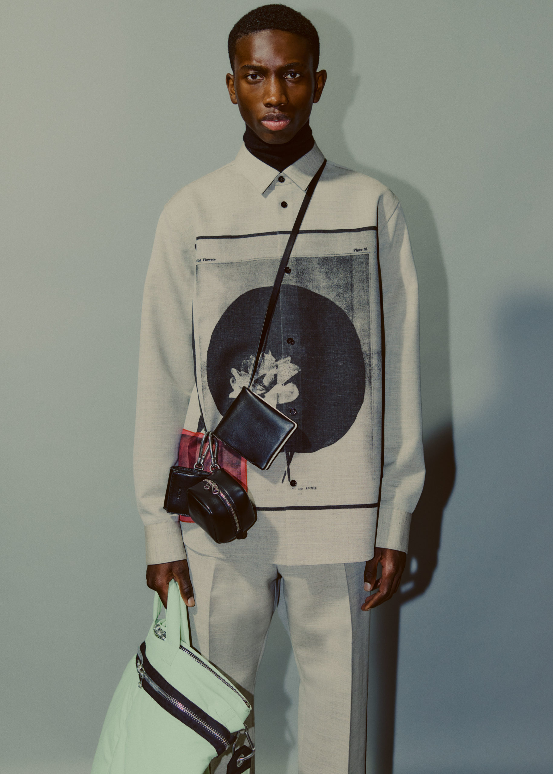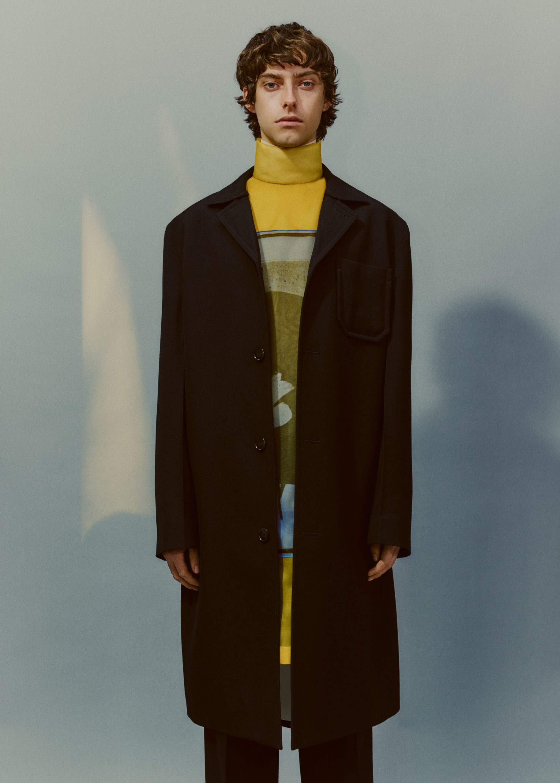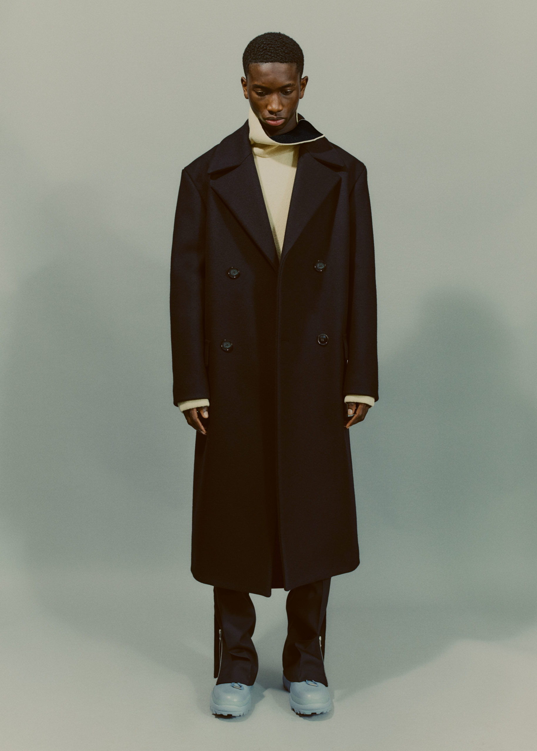 Collages and assemblages. In Rauschenberg’s vocabulary, ‘combines’. The idea of mixing materials, which Rauschenberg gained through his experience in his first year at the legendary Black Mountain College, under the guidance of Josef Albers. This idea is often at the root of design: finding the correct balance and vibration between two different materials, colors, or techniques, and was the initial starting point for the Fall/Winter 2021 collection. Mixed materials take the form of organza panels applied to sharp Japanese wool or cotton poplin overshirts, chunky knit collars attached to wool coats, and heavy metal hardware cutting through tailoring, shirting, footwear, and accessories.