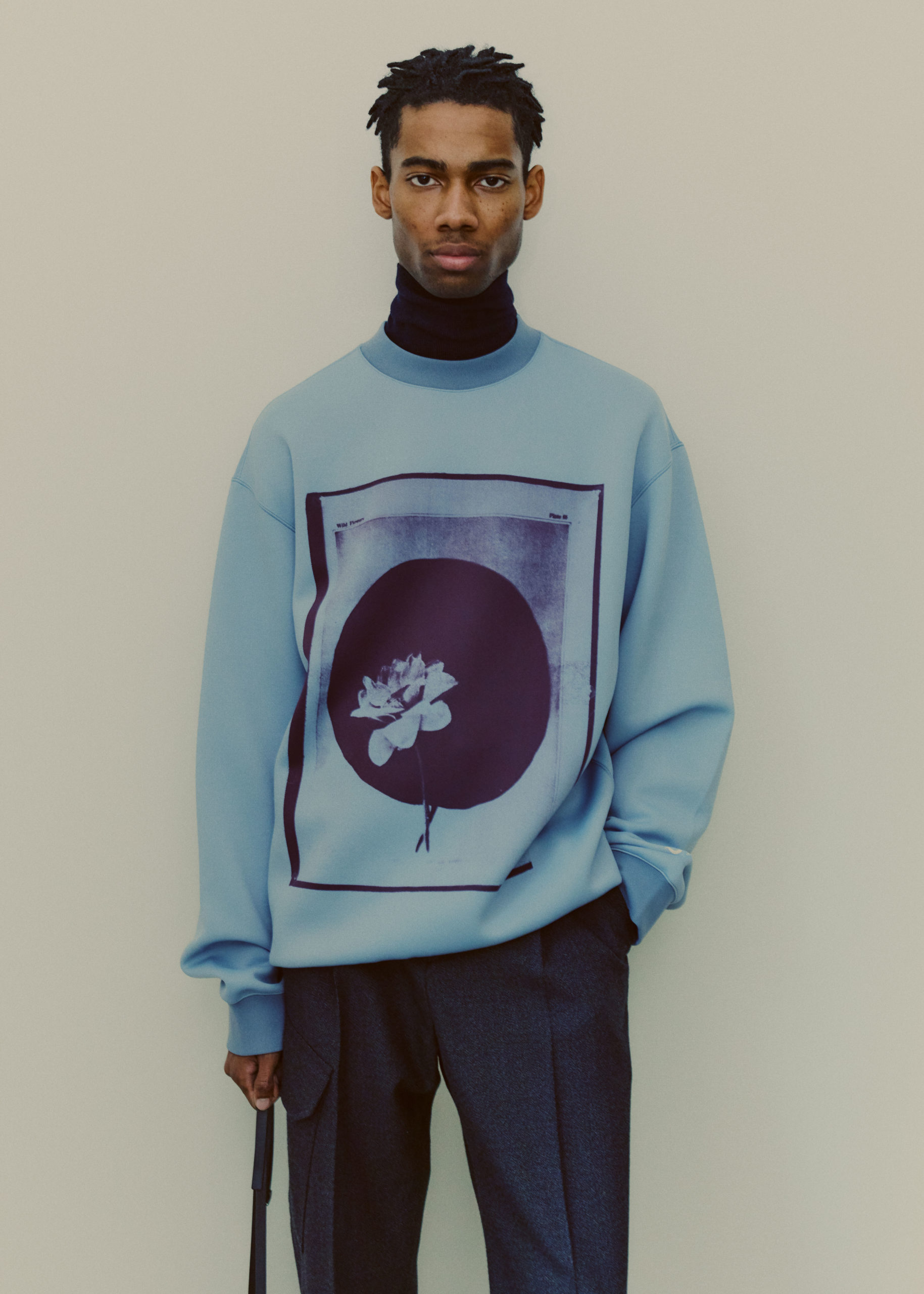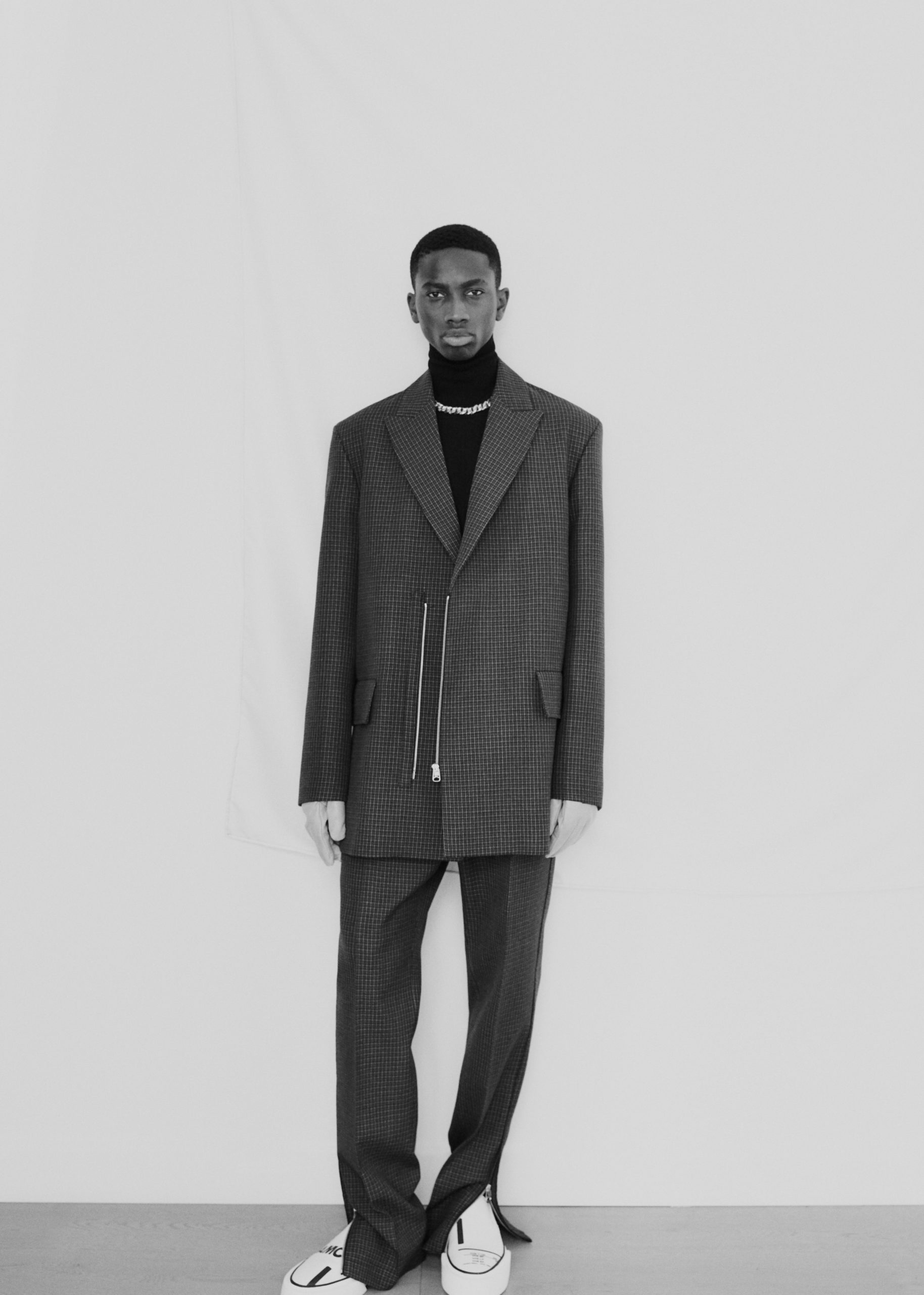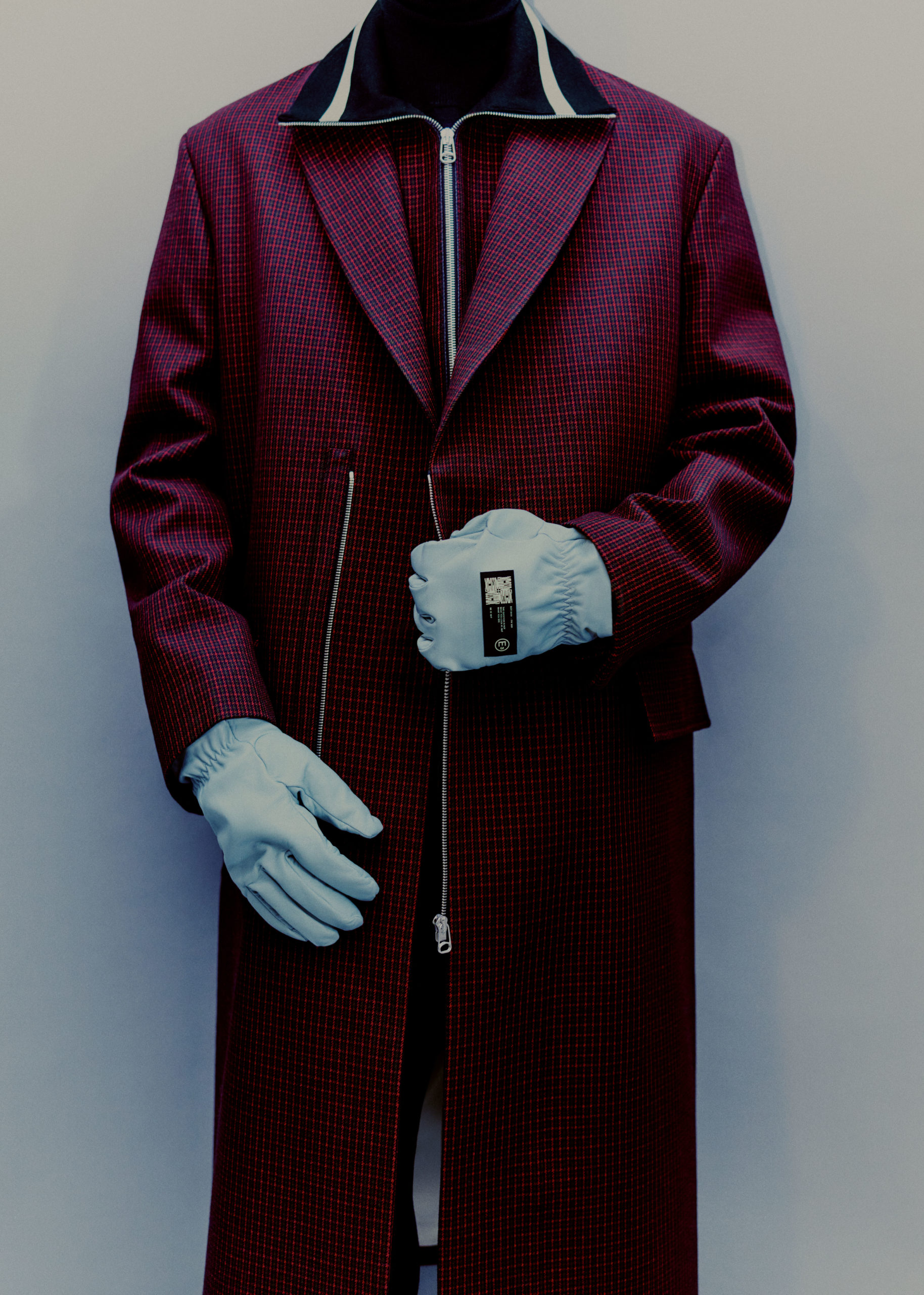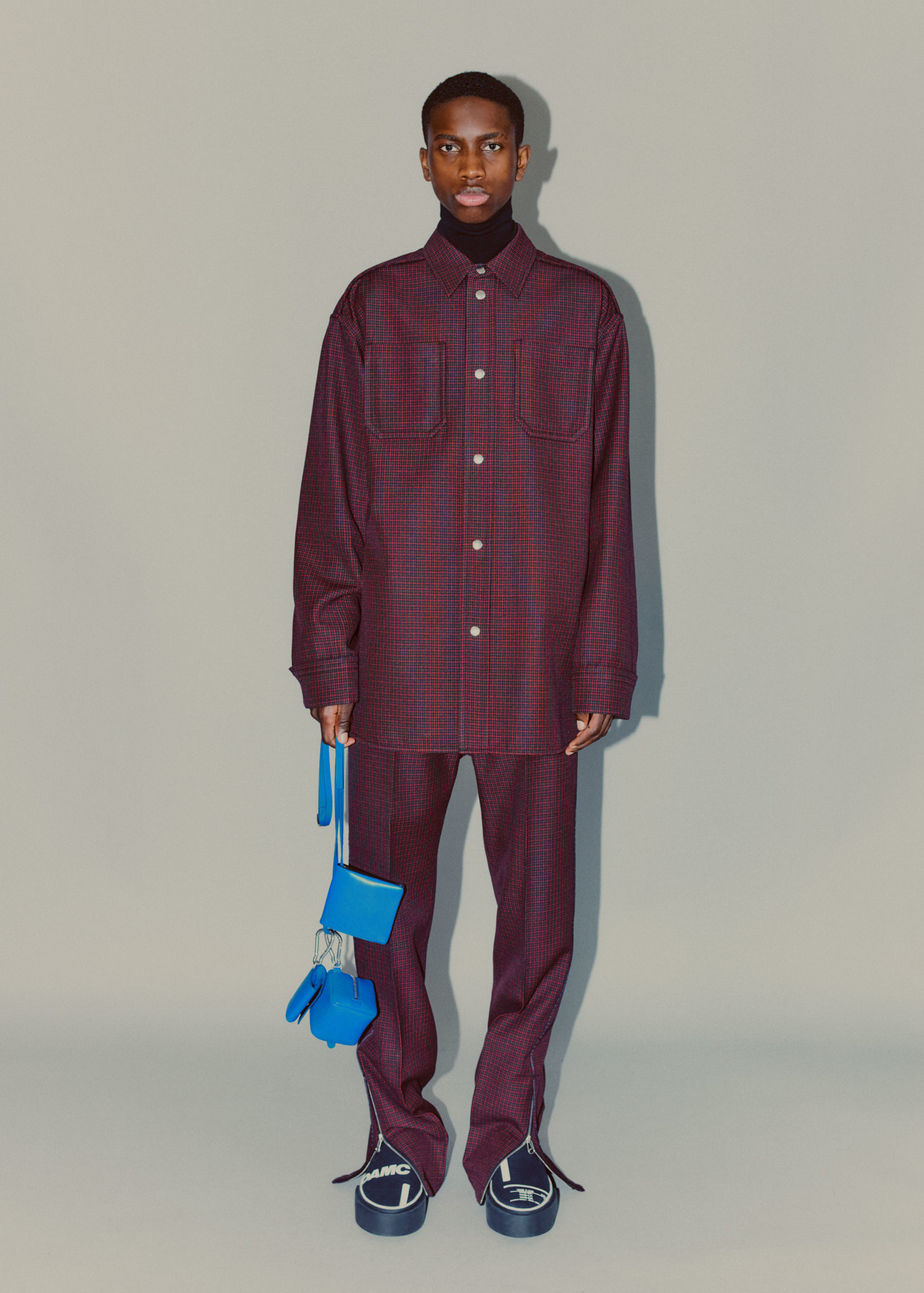 Collages and assemblages. In Rauschenberg’s vocabulary, ‘combines’. The idea of mixing materials, which Rauschenberg gained through his experience in his first year at the legendary Black Mountain College, under the guidance of Josef Albers. This idea is often at the root of design: finding the correct balance and vibration between two different materials, colors, or techniques, and was the initial starting point for the Fall/Winter 2021 collection. Mixed materials take the form of organza panels applied to sharp Japanese wool or cotton poplin overshirts, chunky knit collars attached to wool coats, and heavy metal hardware cutting through tailoring, shirting, footwear, and accessories.