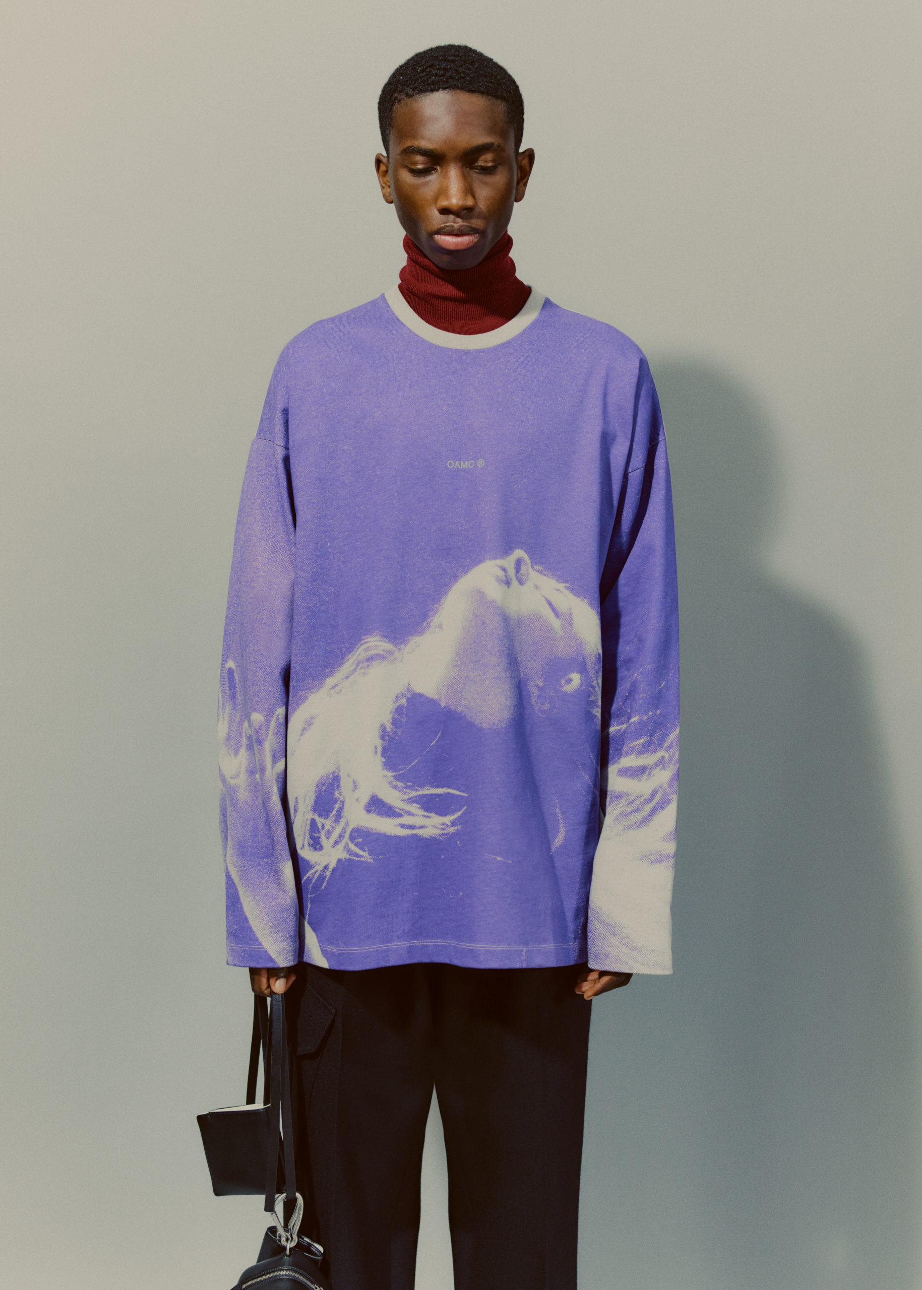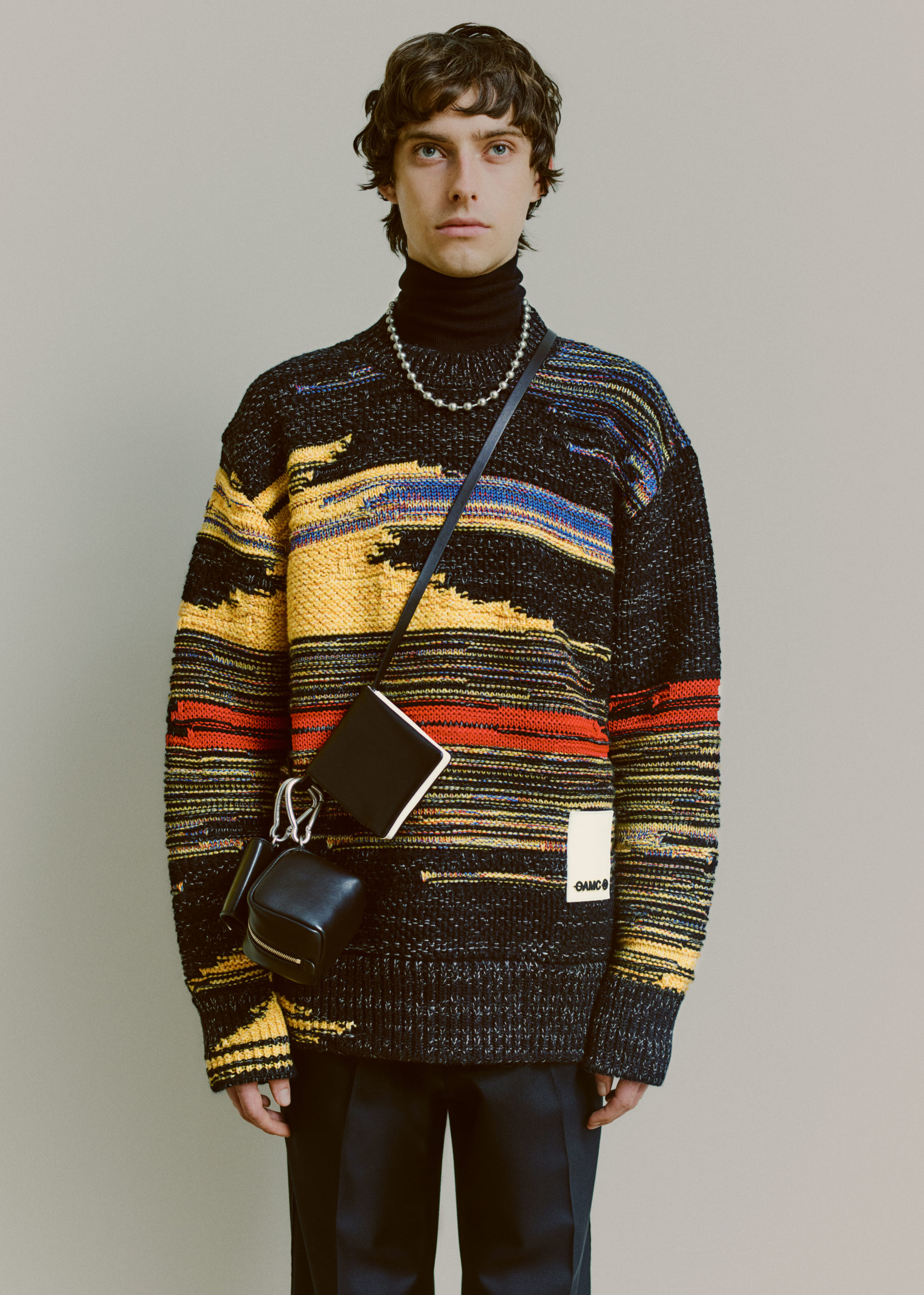 Accessories reflect both the collage approach as well as transparency. Gloves are mixed material and industrial, bags and cross-body small leather goods are supple and inflated, with hard metal detailing, and necklaces are strong link metal chains intricately woven with utility cords. Continuing the collaboration with Adidas, OAMC has designed the Type O-9, featuring the Bounce outsole and sculpted transparent TPU upper pieces that envelop the shoe, revealing the high-pile suede and leather panelling underneath. Utility boots are flooded in color, featuring custom tinted Vibram outsoles.