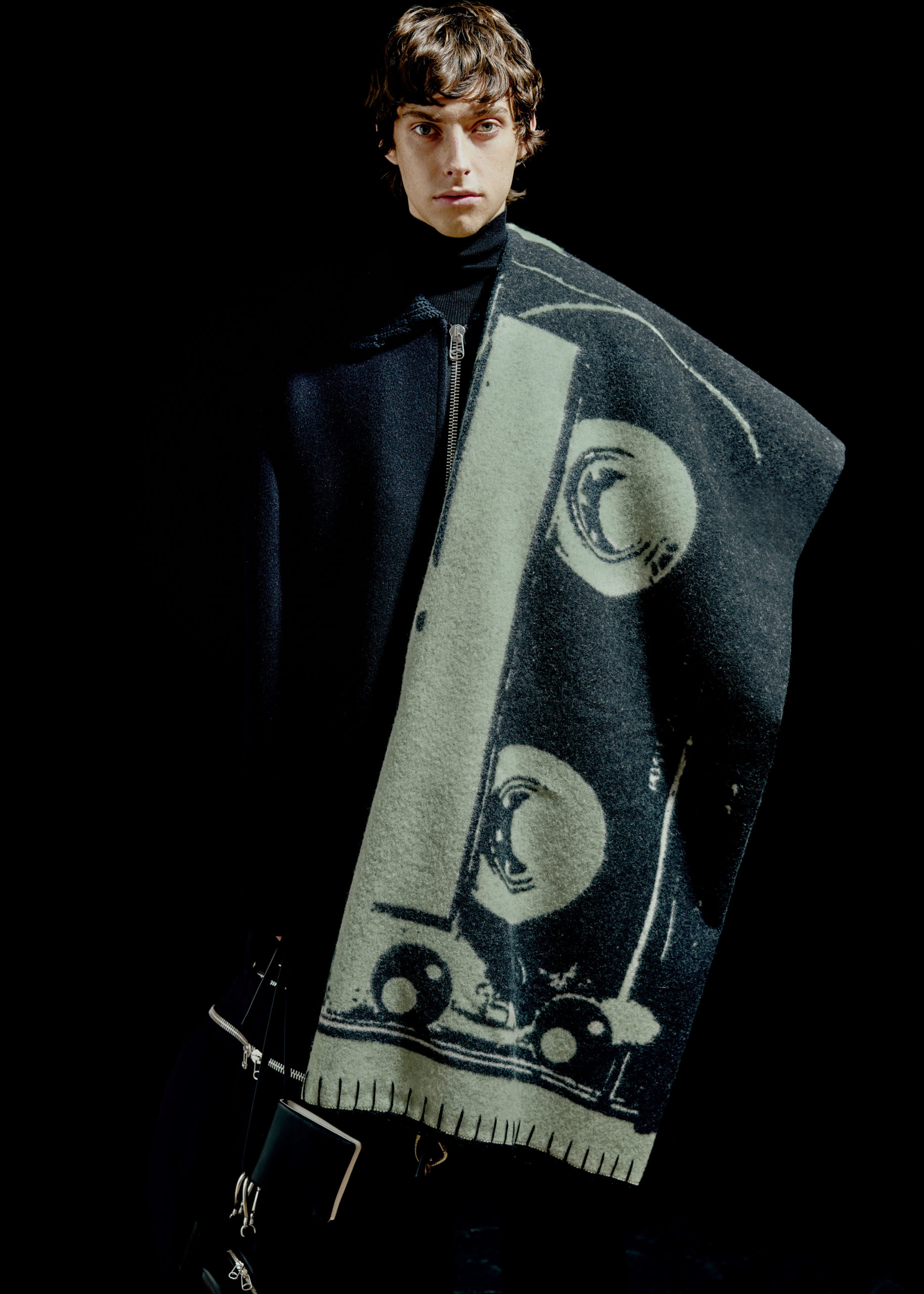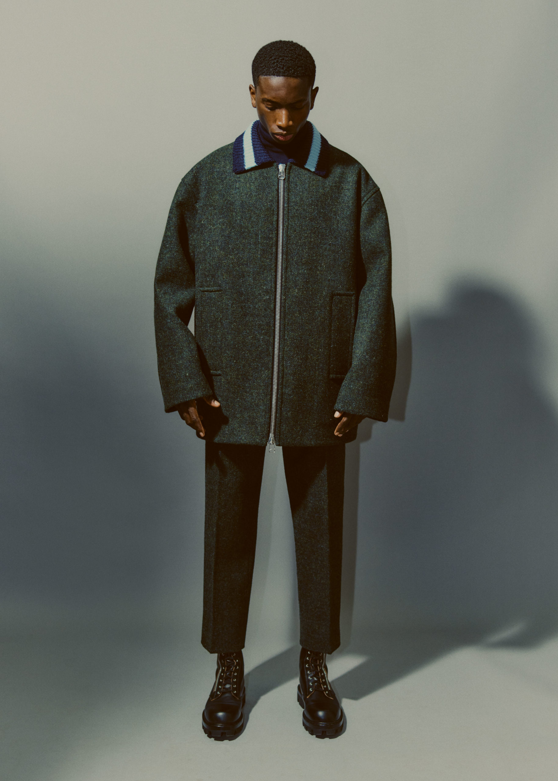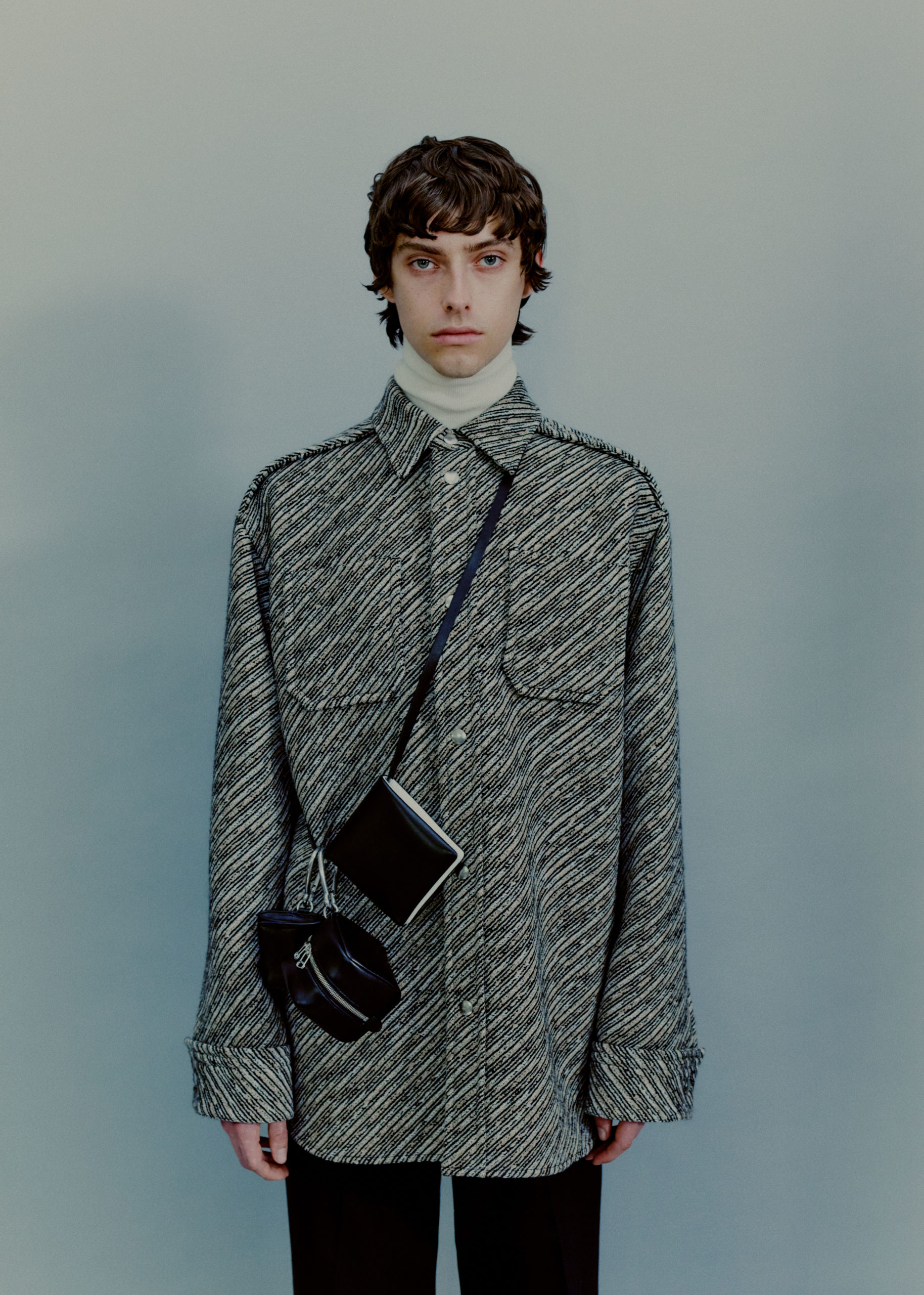 However, beyond the simple opposition of materials, the study evolved into mixing ideas and feelings, a reflection of the place and time we find ourselves in now. Elevated materials utilized in more relaxed shapes, such as track suits and cozy inflated pieces, leather jackets and trousers with elastics and coulisse adjustments, roomy jacquard wool overshirts, and double-faced Shetland and viscose/nylon flared collar knits. Garments that can both be worn during long stints at home, or in transit (when possible). The underlying feeling being one that reflects an attitude that even if we are required to remain in place, we still appreciate and desire well made, beautiful things.