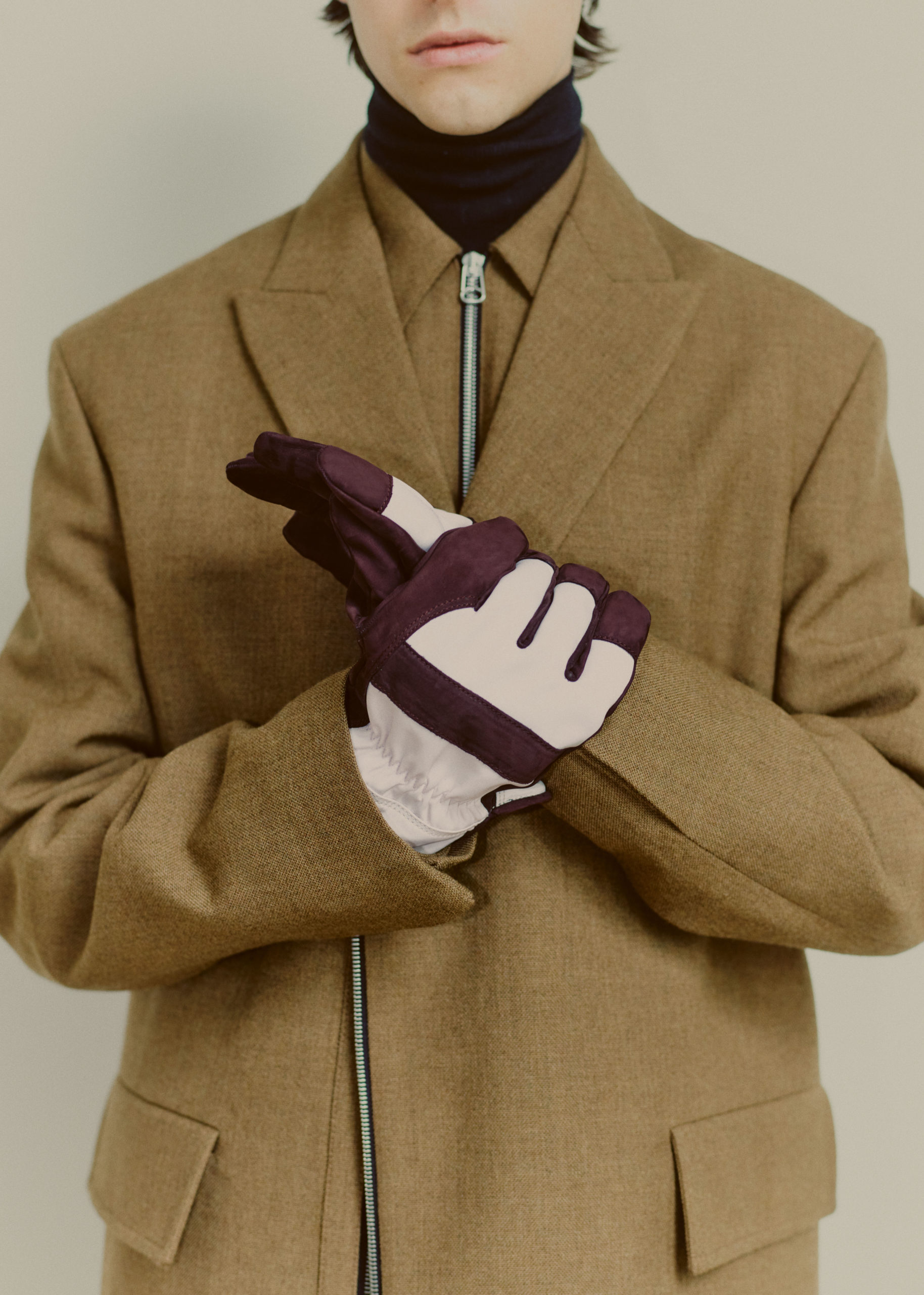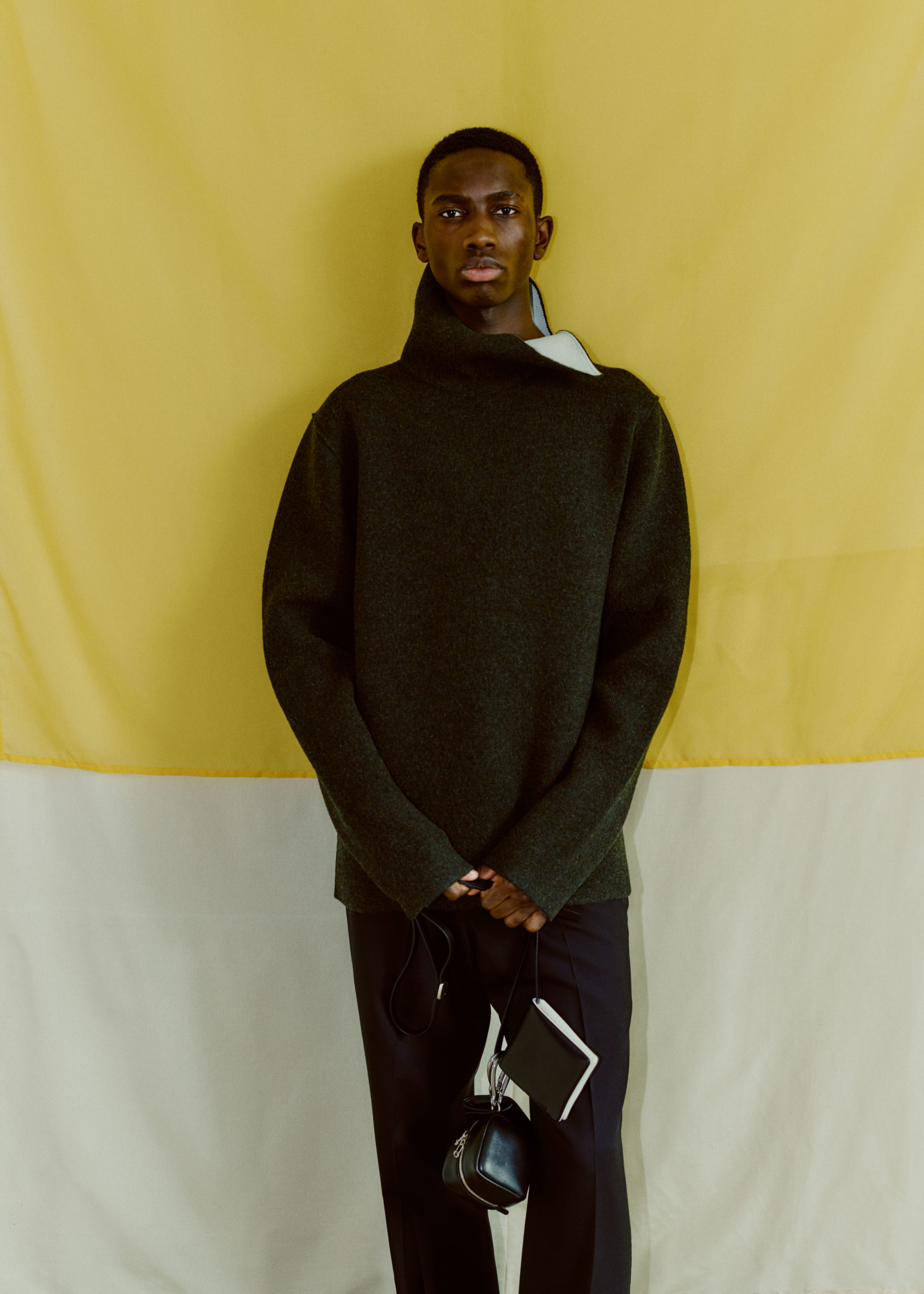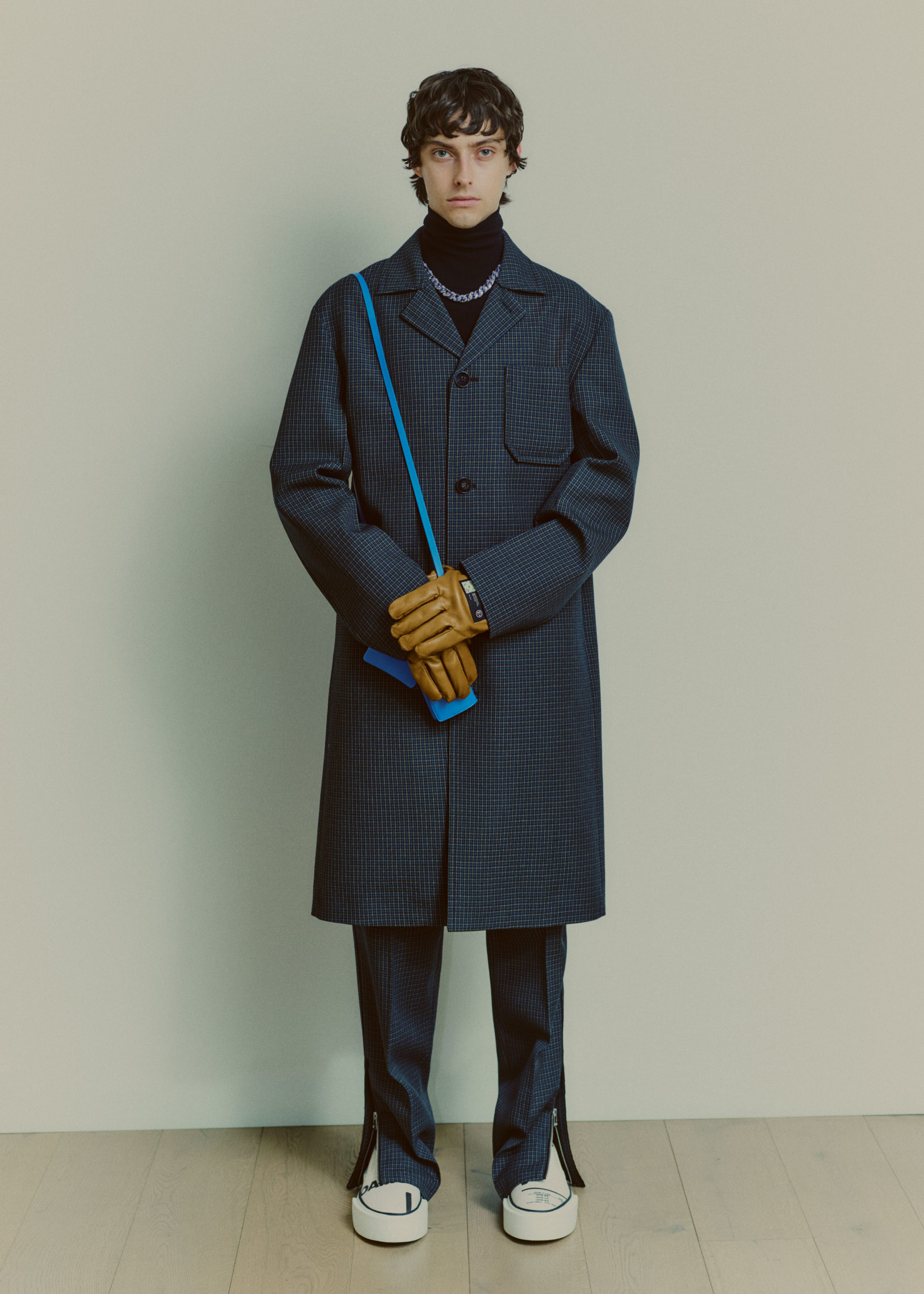 However, beyond the simple opposition of materials, the study evolved into mixing ideas and feelings, a reflection of the place and time we find ourselves in now. Elevated materials utilized in more relaxed shapes, such as track suits and cozy inflated pieces, leather jackets and trousers with elastics and coulisse adjustments, roomy jacquard wool overshirts, and double-faced Shetland and viscose/nylon flared collar knits. Garments that can both be worn during long stints at home, or in transit (when possible). The underlying feeling being one that reflects an attitude that even if we are required to remain in place, we still appreciate and desire well made, beautiful things.