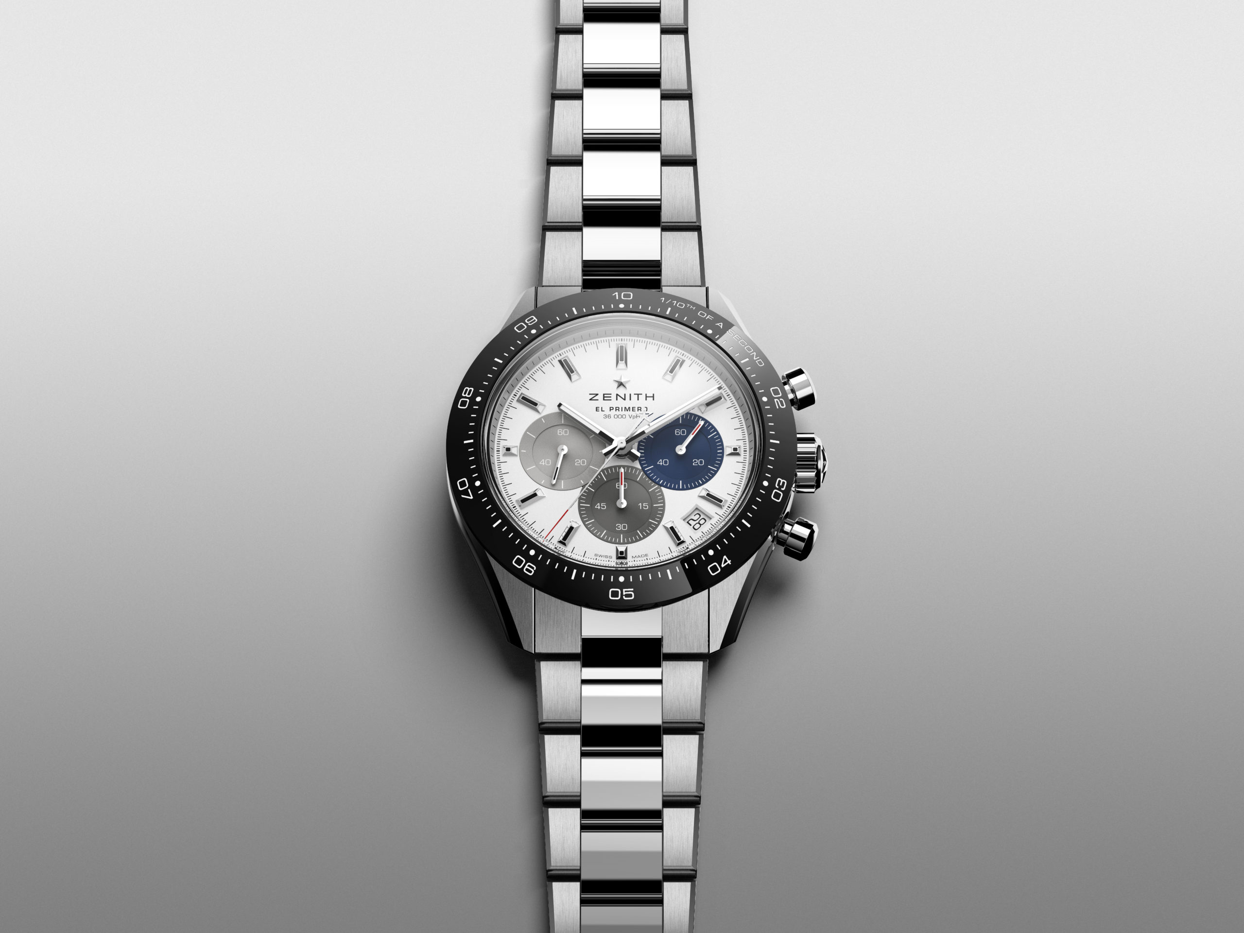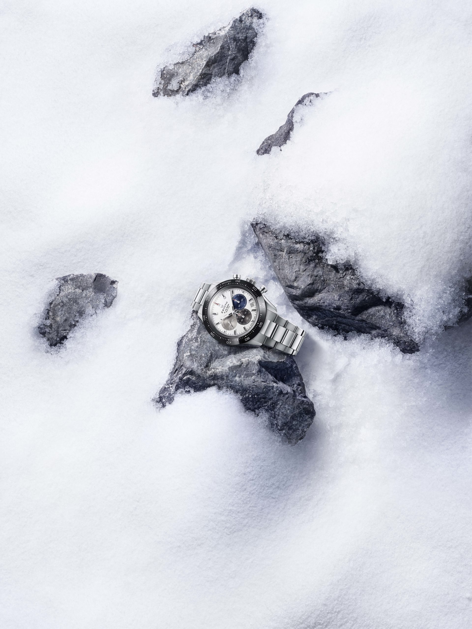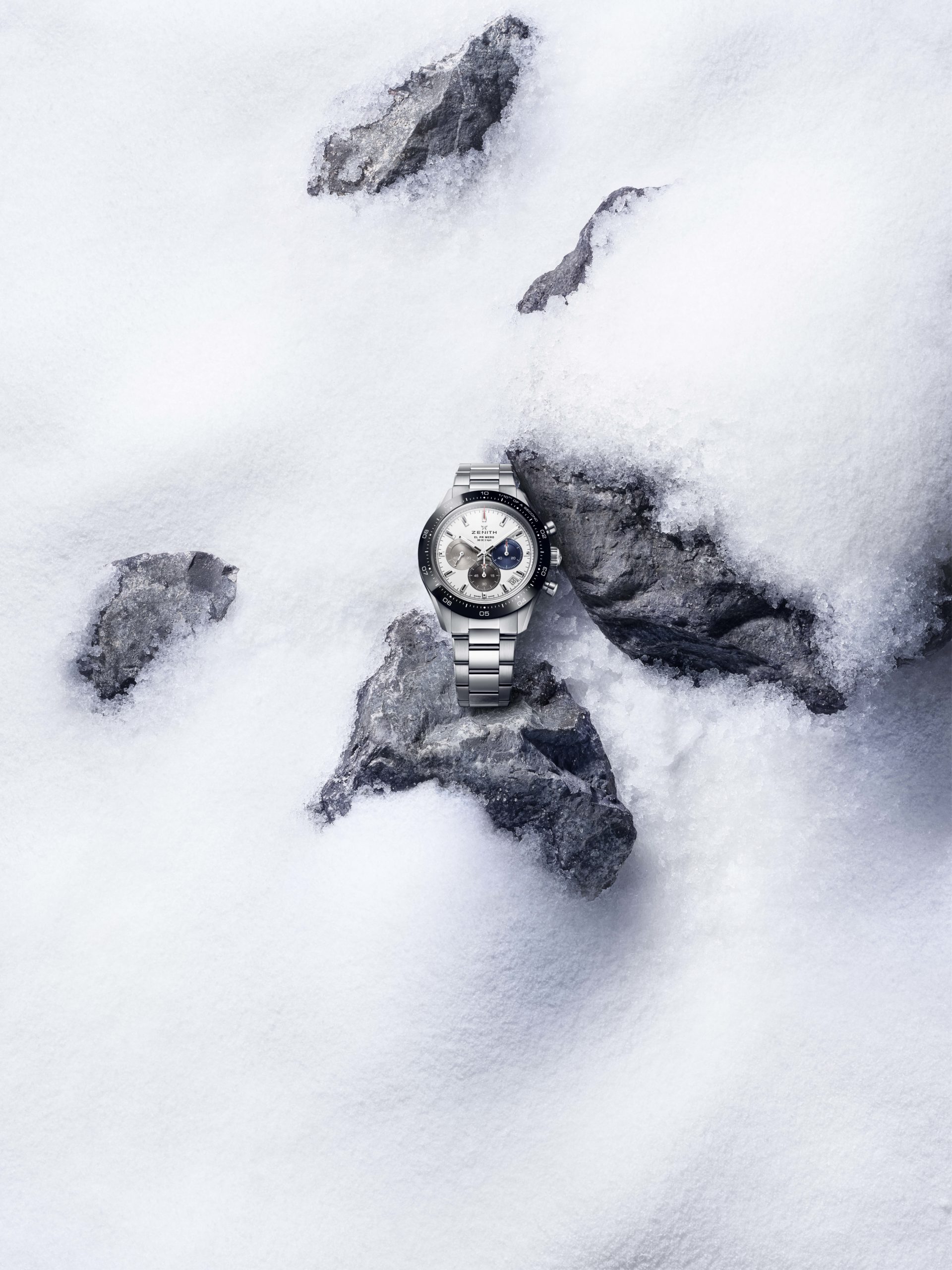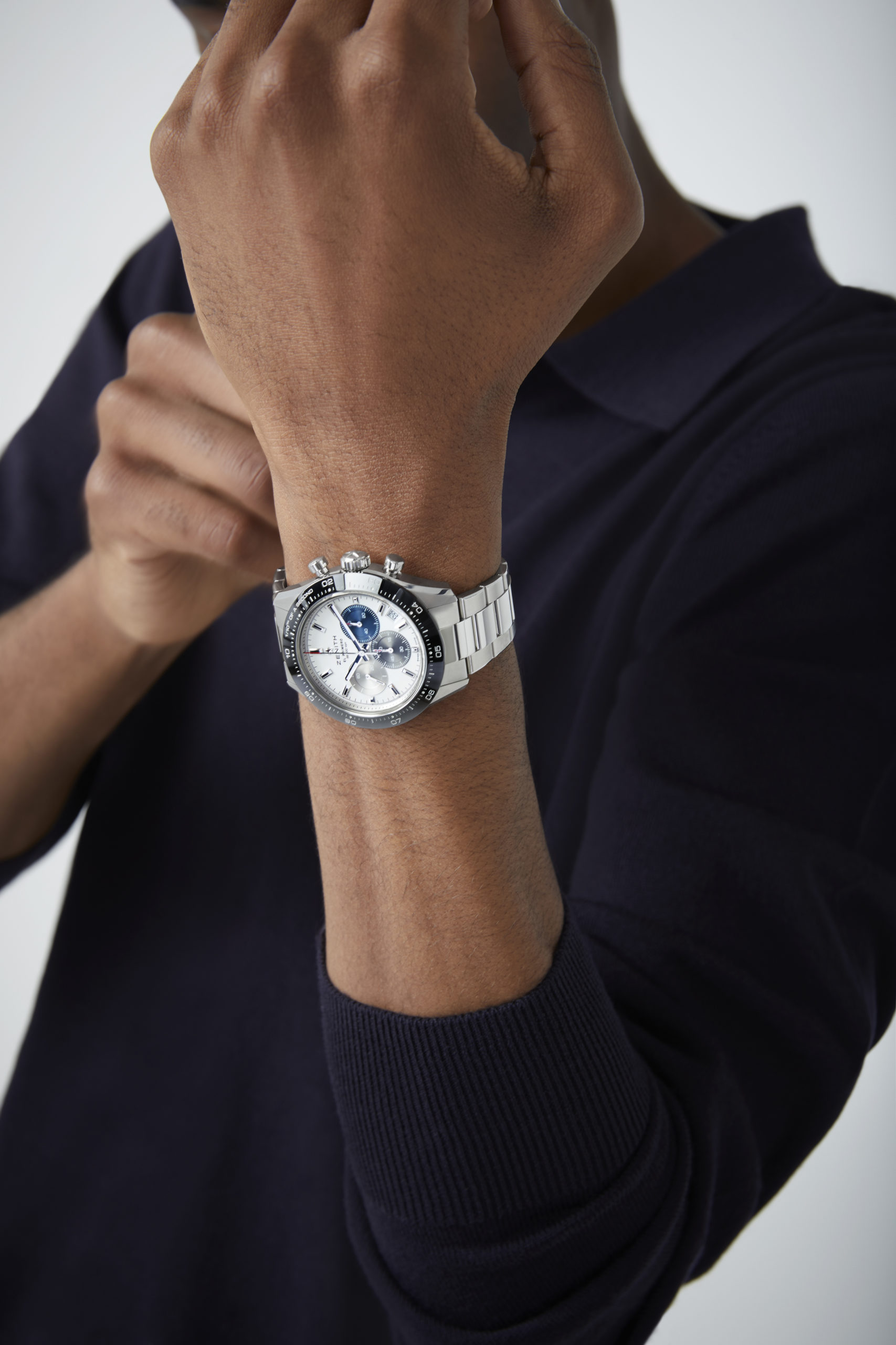 La toute dernière collection Chronomaster Sport marque le début d’une nouvelle ère pour la quintessence du chronographe sport-chic Zenith. Repoussant une fois de plus les limites de la précision dans le domaine de la haute fréquence, la Chronomaster Sport représente le point culminant du patrimoine inégalé de Zenith en matière de chronographes automatiques. Elle allie l’esprit de l’El Primero A386 et la forme de la Chronomaster De Luca aux performances dans le domaine de la haute fréquence réalisées par le calibre El Primero depuis plus de 50 ans. Tout cela dans un chronographe sportif qui ne ressemble à aucun autre – tant par sa forme que par son fond. La Chronomaster Sport se décline en deux variantes. Que le cadran soit noir ou blanc, tous deux portent la signature El Primero : des compteurs chronographes tricolores en bleu, anthracite et gris clair, tout comme la A386 de 1969. Chacun des compteurs est gradué jusqu’à 60 pour une lecture intuitive et instantanée du chronographe. En accord avec l’esthétique moderne et intemporelle de ce chronographe exceptionnel, la Chronomaster Sport est proposée sur un bracelet acier intégré, similaire à ceux conçus par Gay Frères, qui a fourni de nombreux bracelets métalliques à Zenith par le passé. Un bracelet en caoutchouc texturé à effet cordura avec boucle déployante en acier est également disponible en option.
