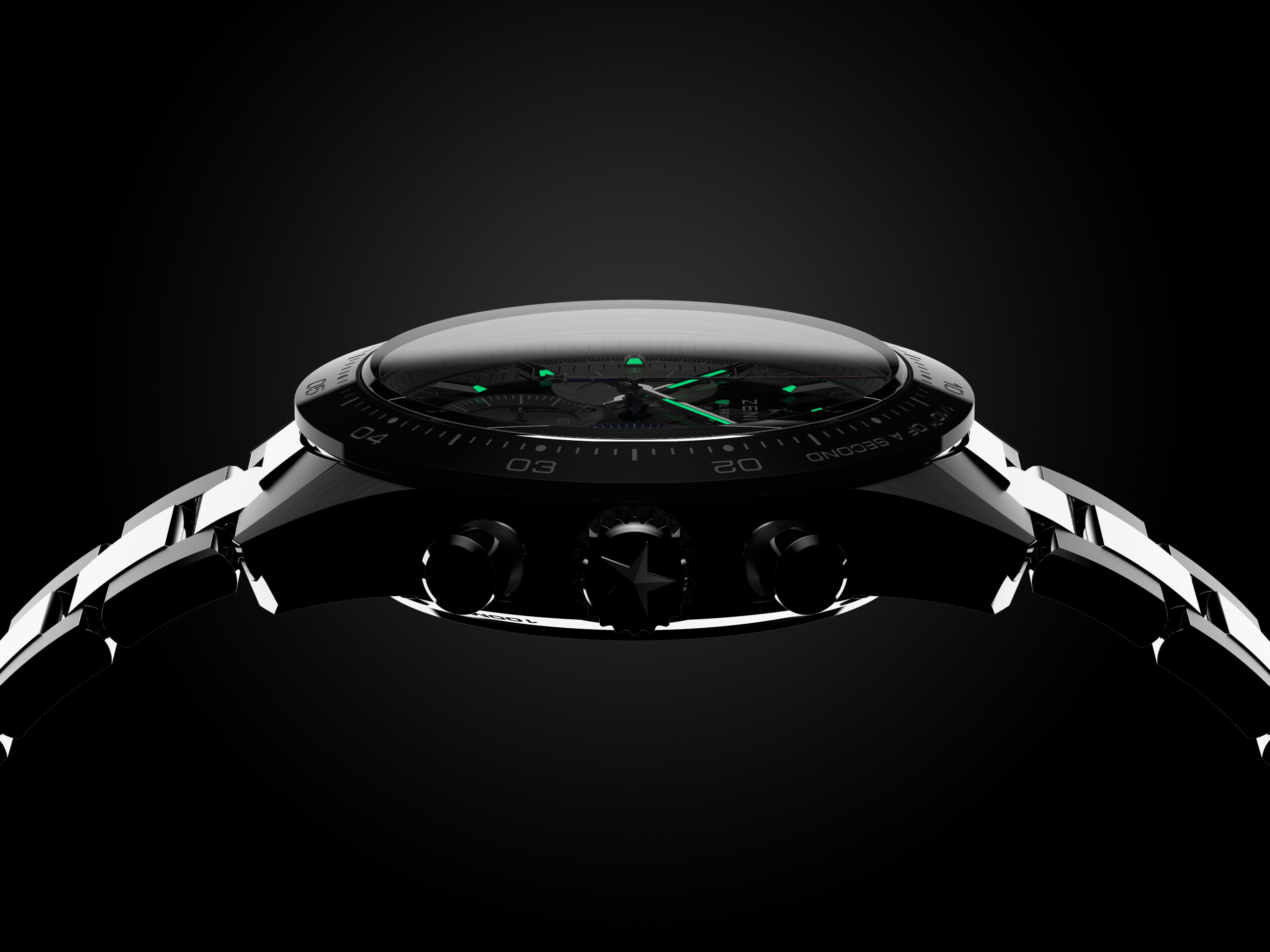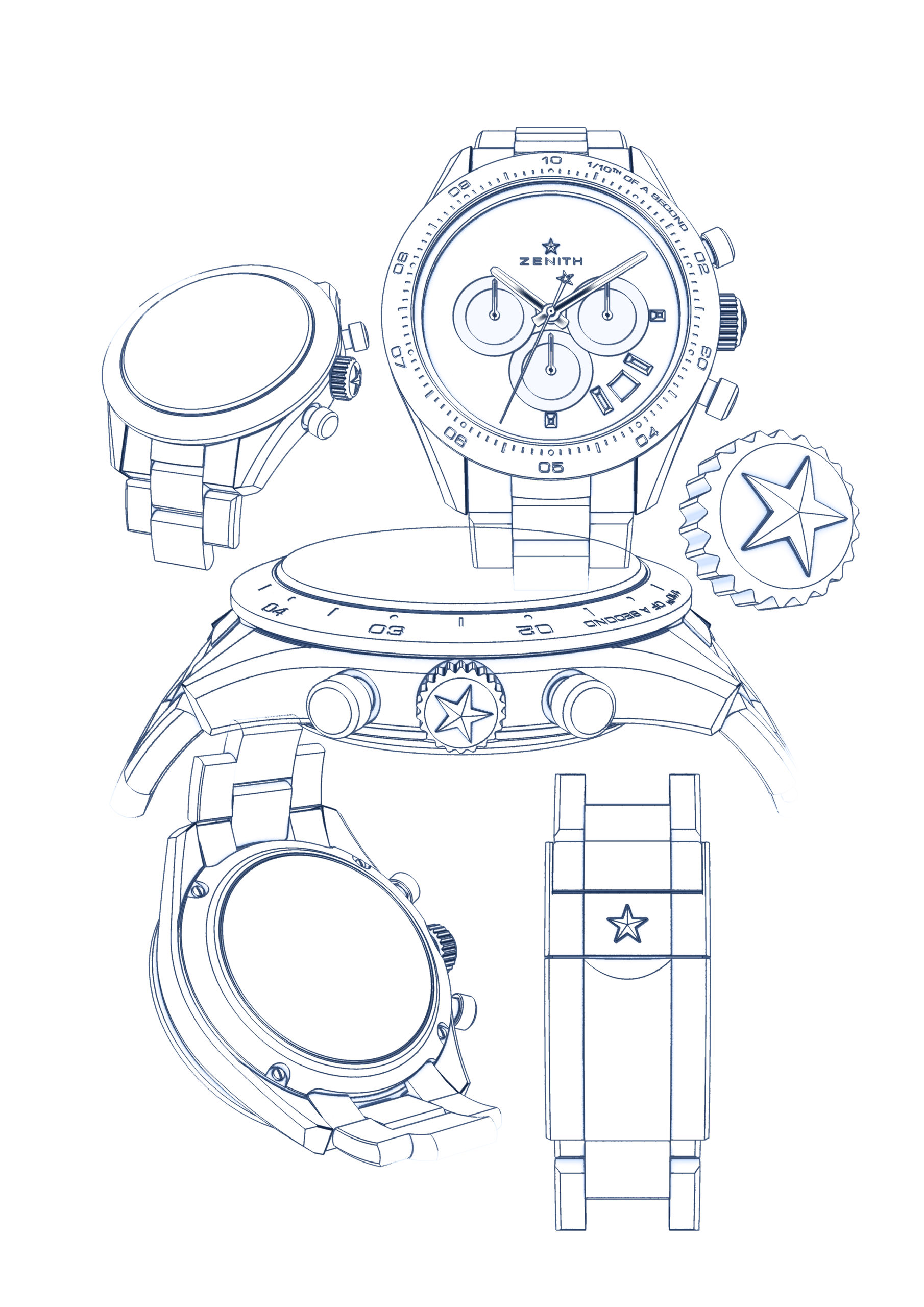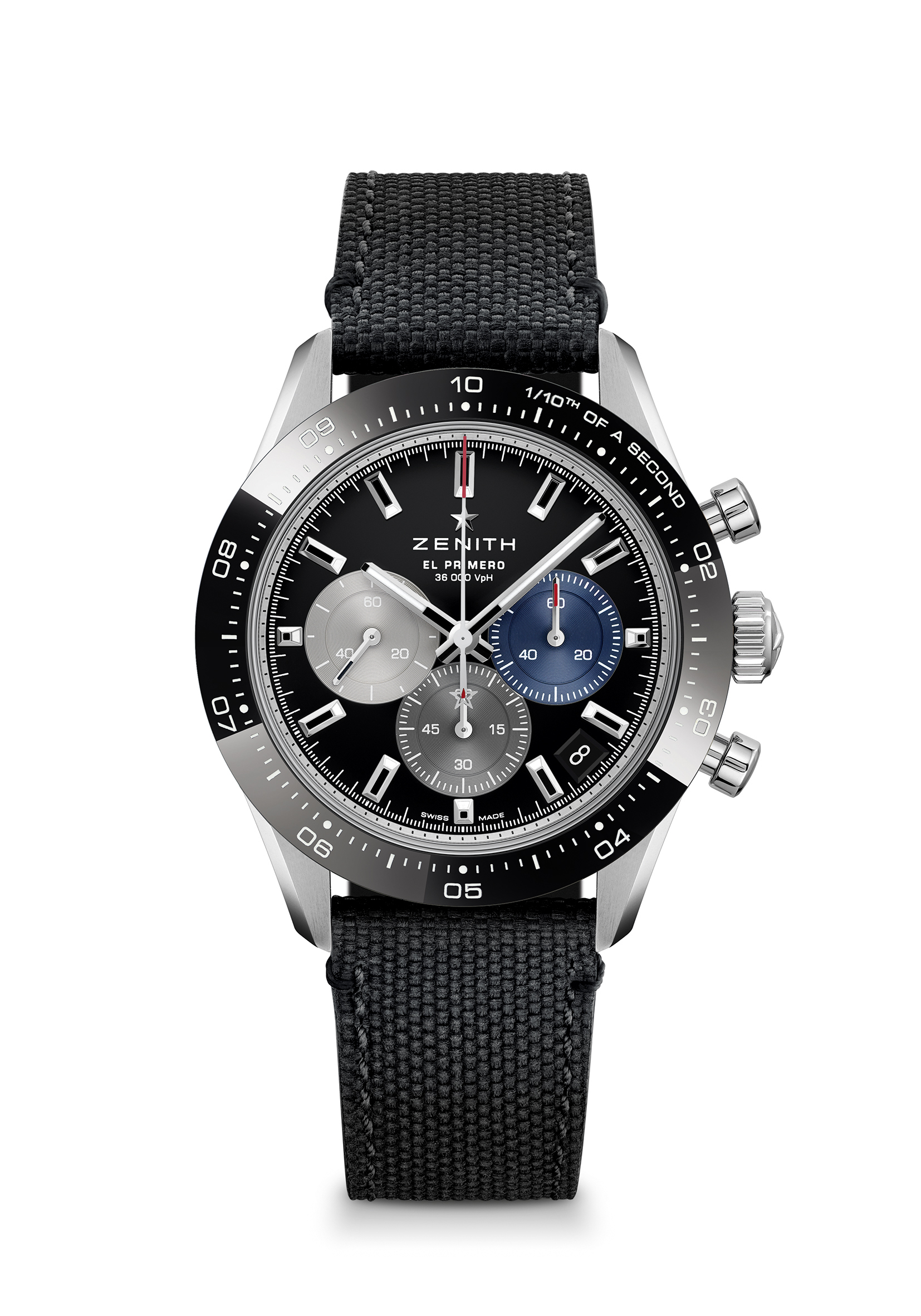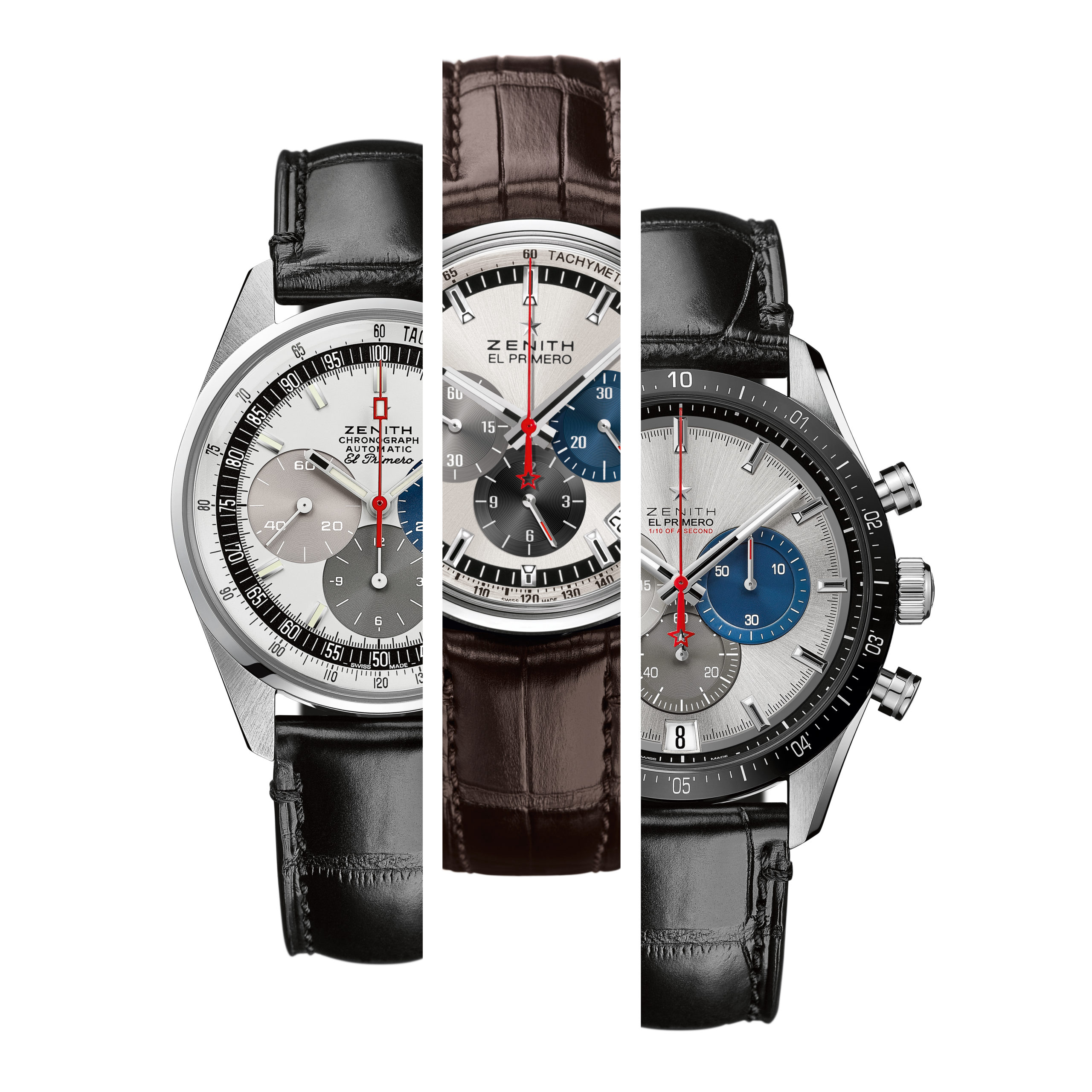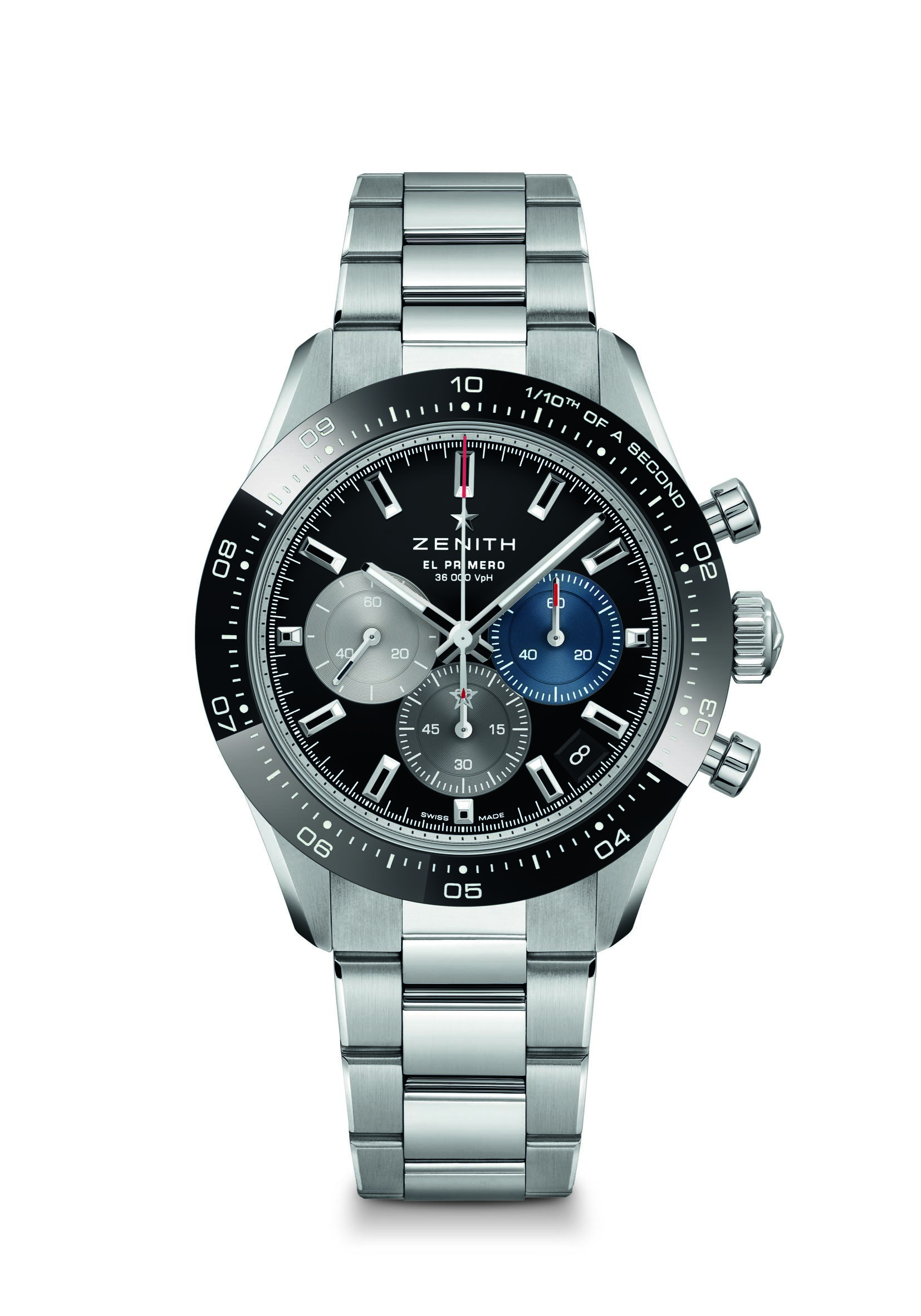 La toute dernière collection Chronomaster Sport marque le début d’une nouvelle ère pour la quintessence du chronographe sport-chic Zenith. Repoussant une fois de plus les limites de la précision dans le domaine de la haute fréquence, la Chronomaster Sport représente le point culminant du patrimoine inégalé de Zenith en matière de chronographes automatiques. Elle allie l’esprit de l’El Primero A386 et la forme de la Chronomaster De Luca aux performances dans le domaine de la haute fréquence réalisées par le calibre El Primero depuis plus de 50 ans. Tout cela dans un chronographe sportif qui ne ressemble à aucun autre – tant par sa forme que par son fond. La Chronomaster Sport se décline en deux variantes. Que le cadran soit noir ou blanc, tous deux portent la signature El Primero : des compteurs chronographes tricolores en bleu, anthracite et gris clair, tout comme la A386 de 1969. Chacun des compteurs est gradué jusqu’à 60 pour une lecture intuitive et instantanée du chronographe. En accord avec l’esthétique moderne et intemporelle de ce chronographe exceptionnel, la Chronomaster Sport est proposée sur un bracelet acier intégré, similaire à ceux conçus par Gay Frères, qui a fourni de nombreux bracelets métalliques à Zenith par le passé. Un bracelet en caoutchouc texturé à effet cordura avec boucle déployante en acier est également disponible en option.